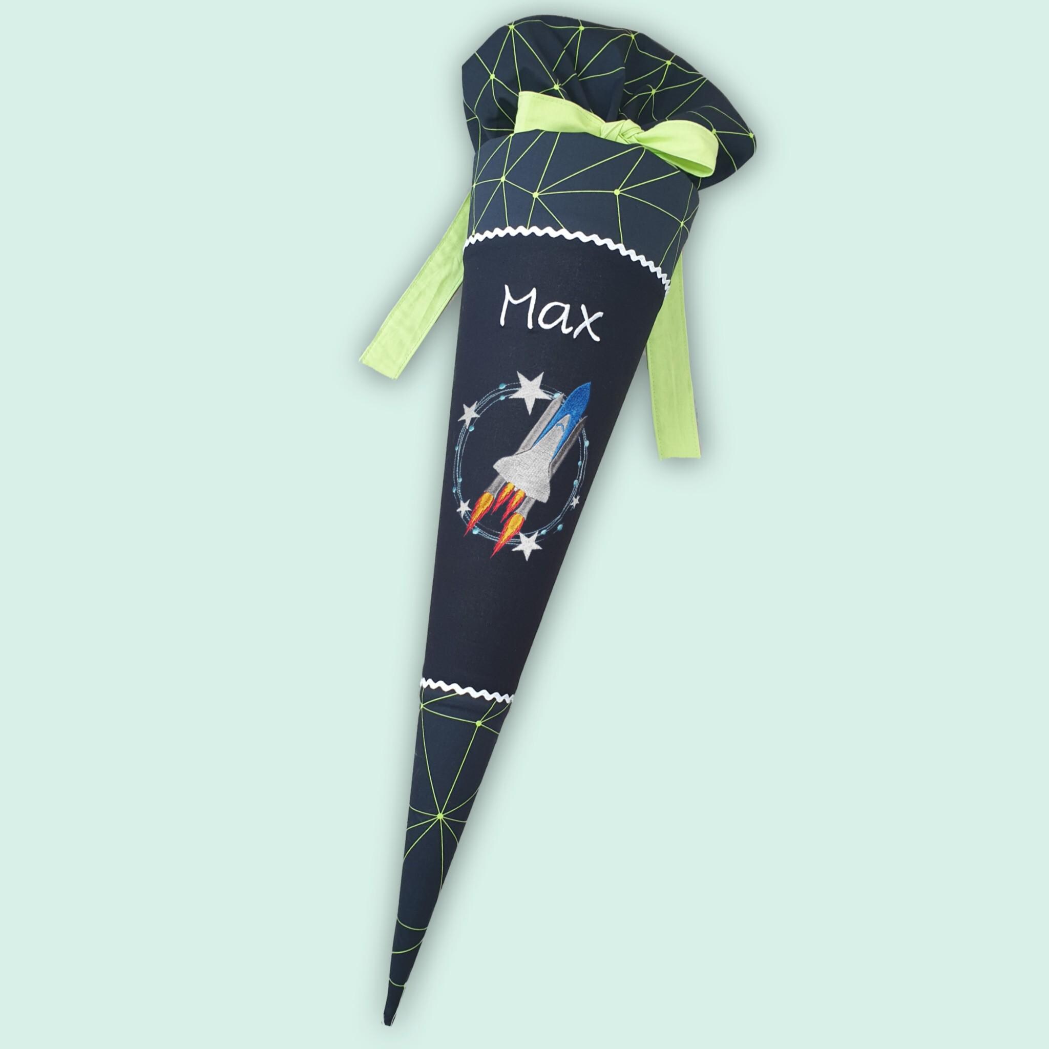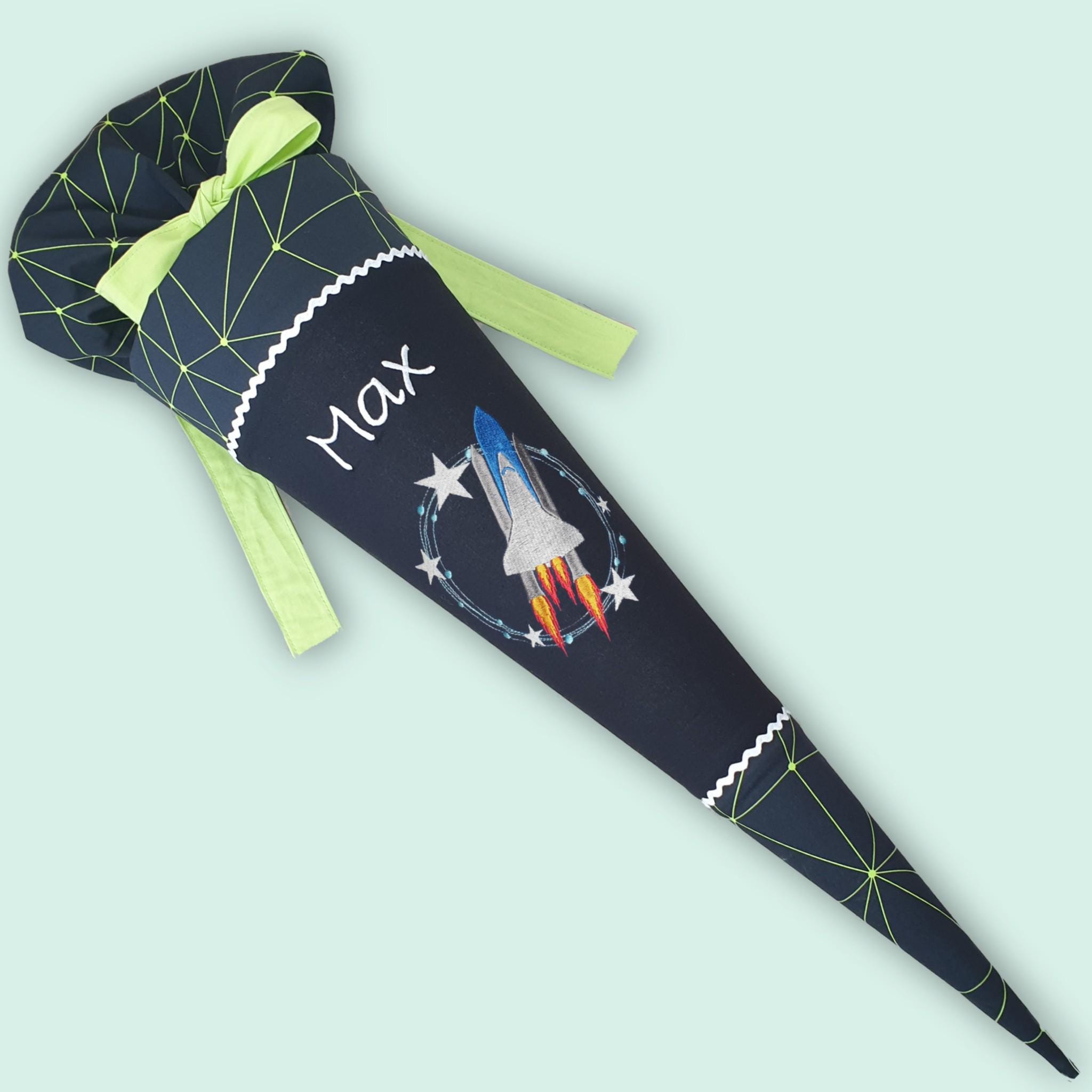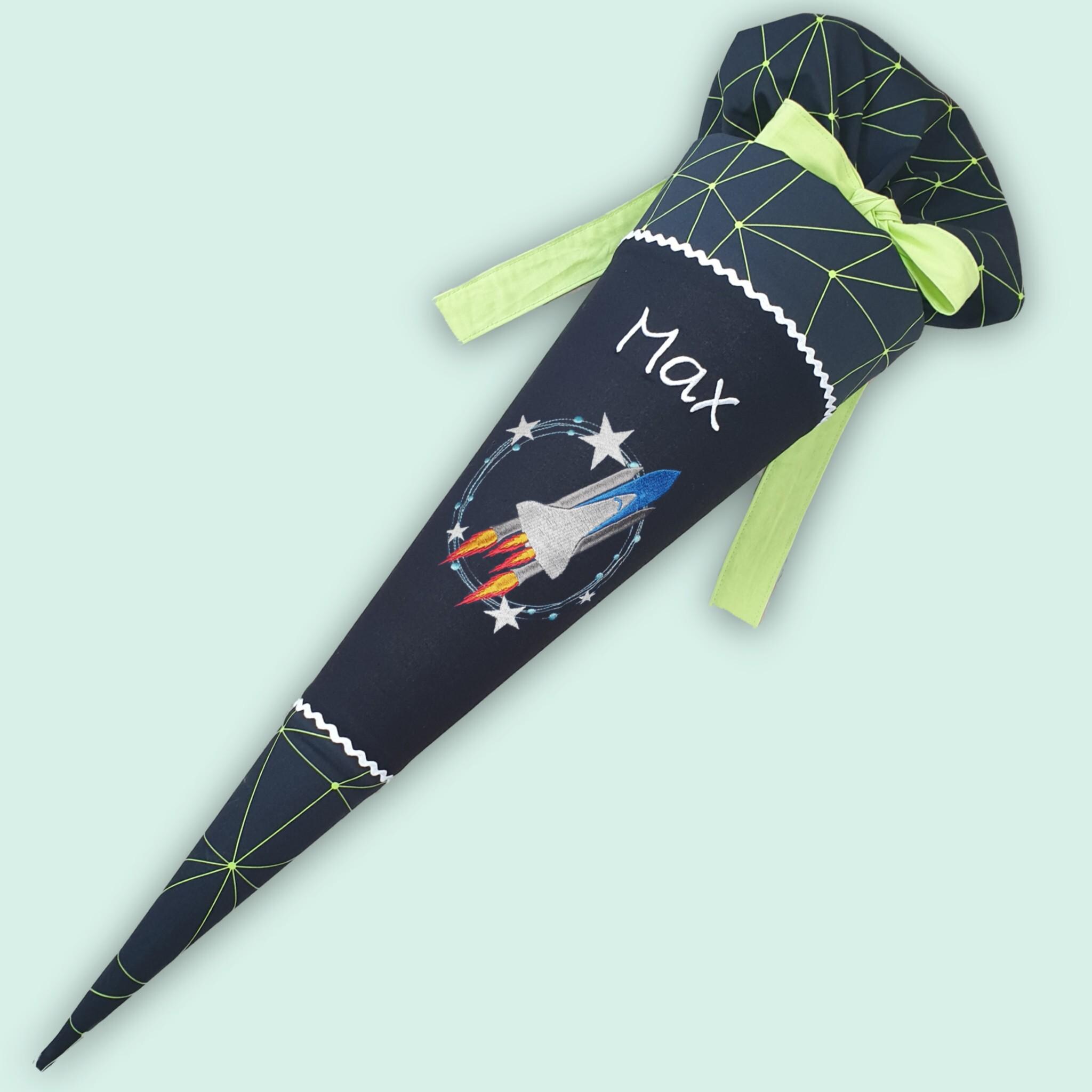 Schultüte mit Rakete und Namen farblich auf den Cybär Race Schulranzen abgestimmt.