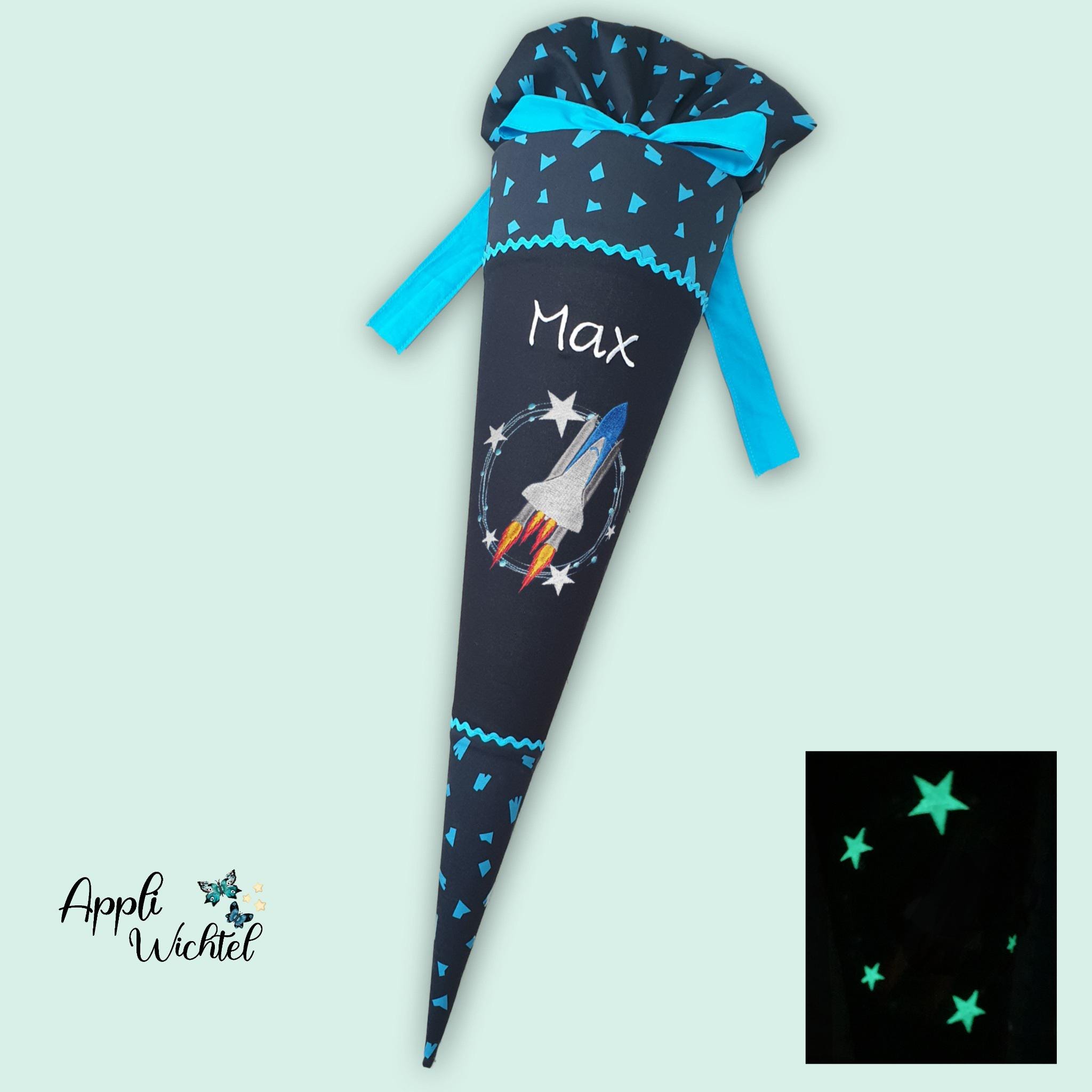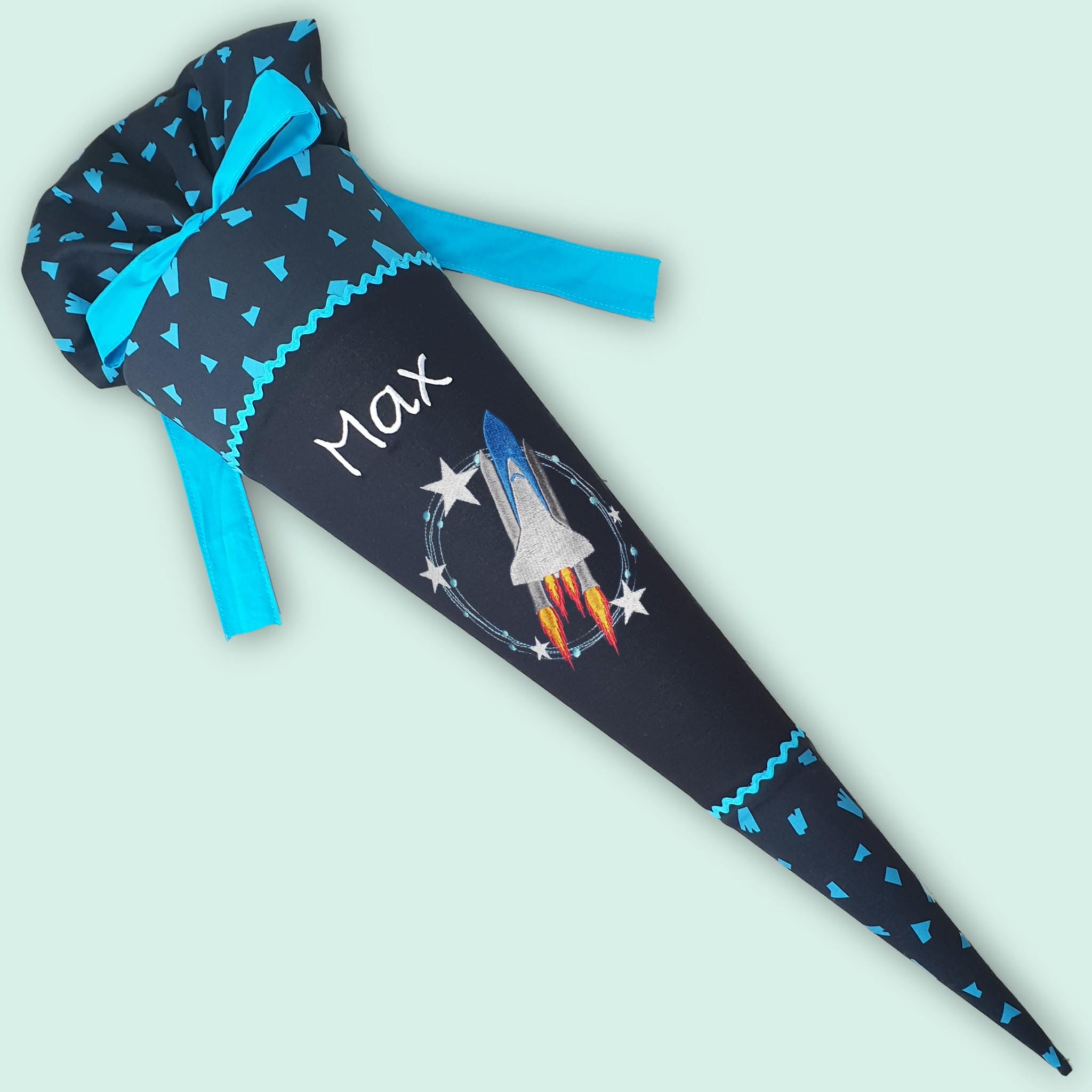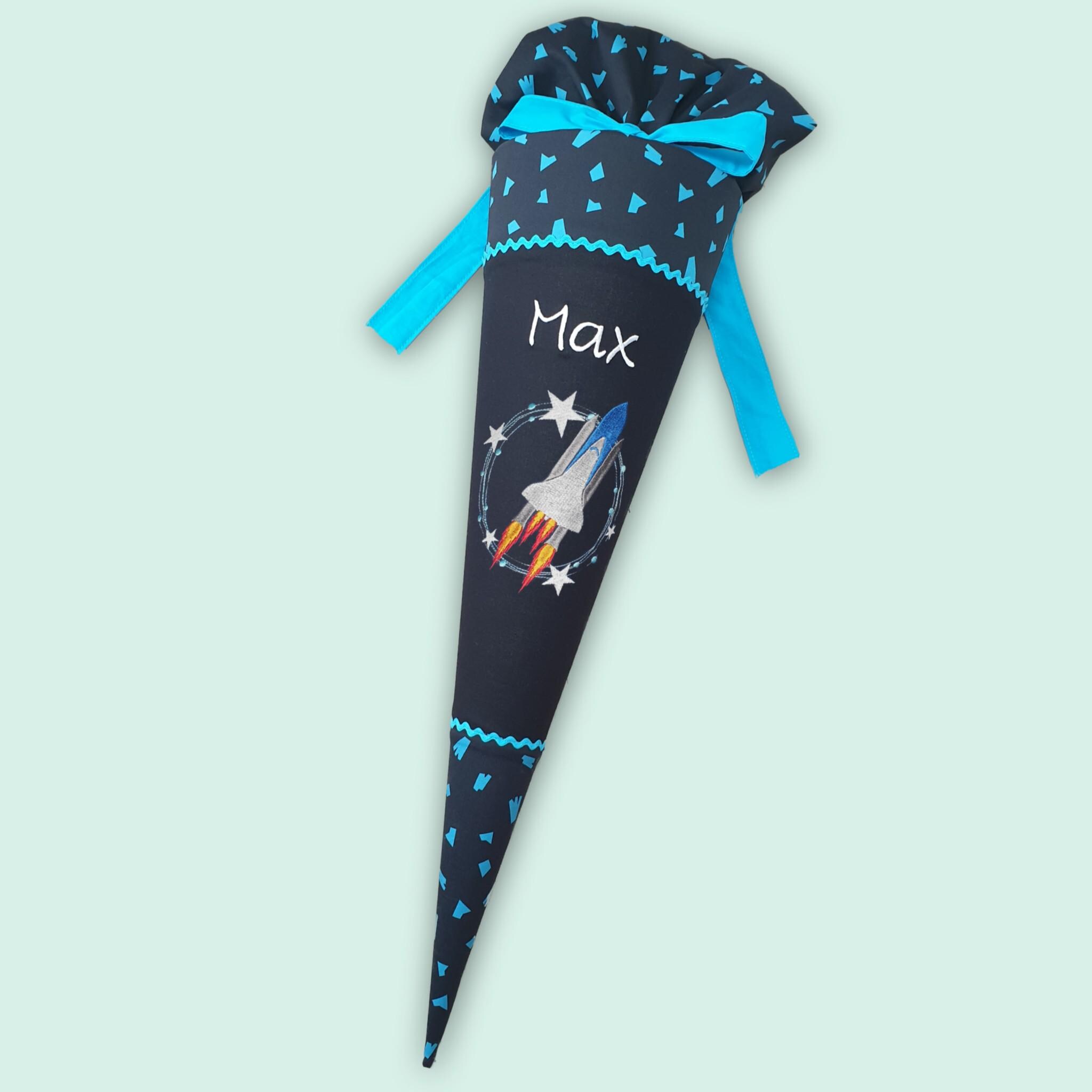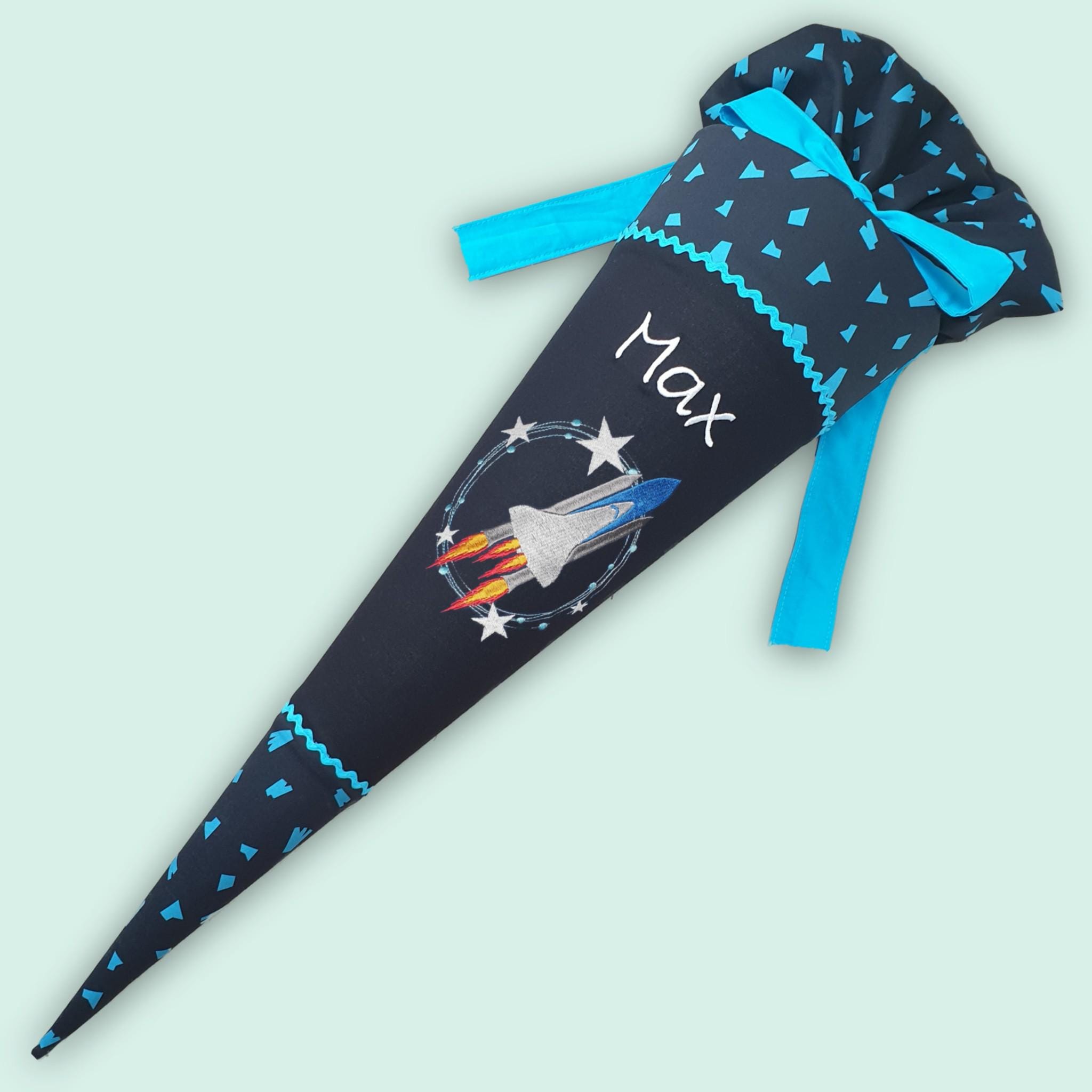 Schultüte mit Rakete und Namen farblich auf den Verfolgbärjagd Schulranzen abgestimmt.