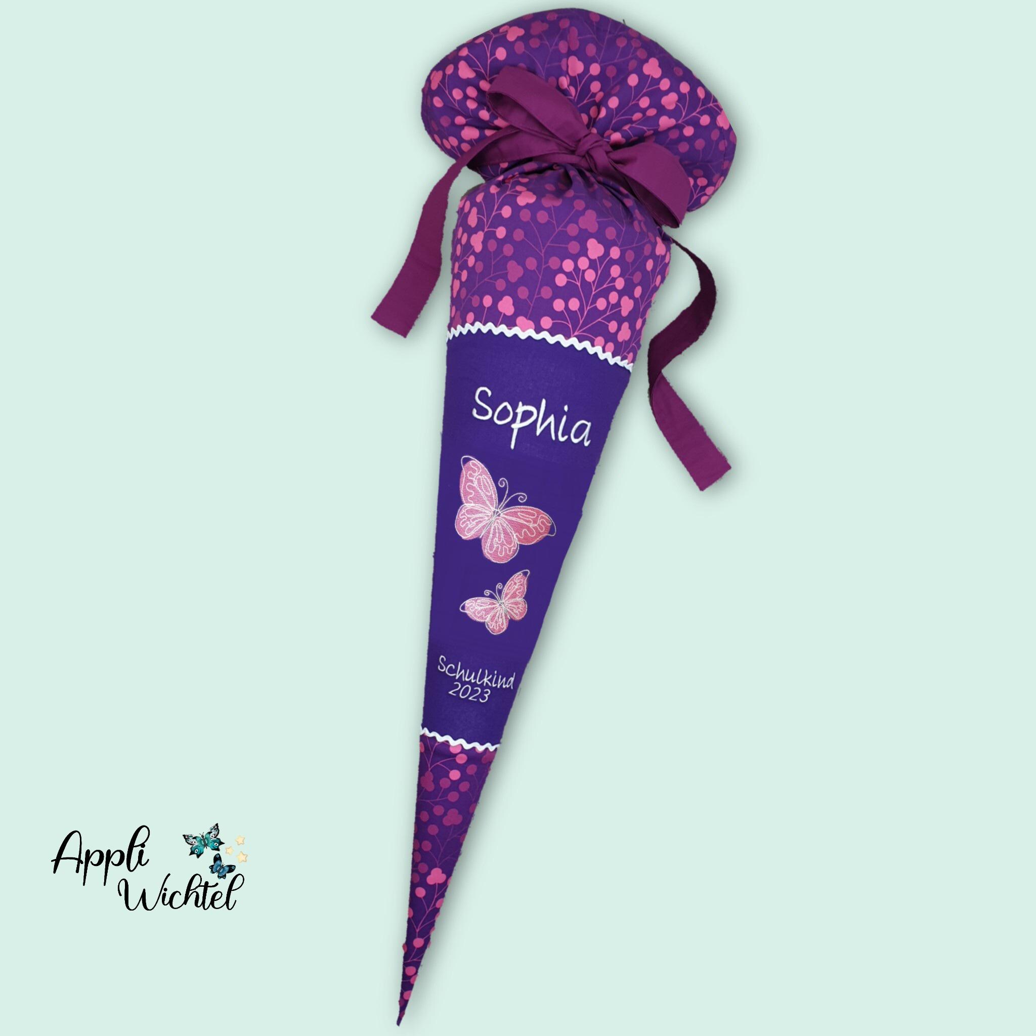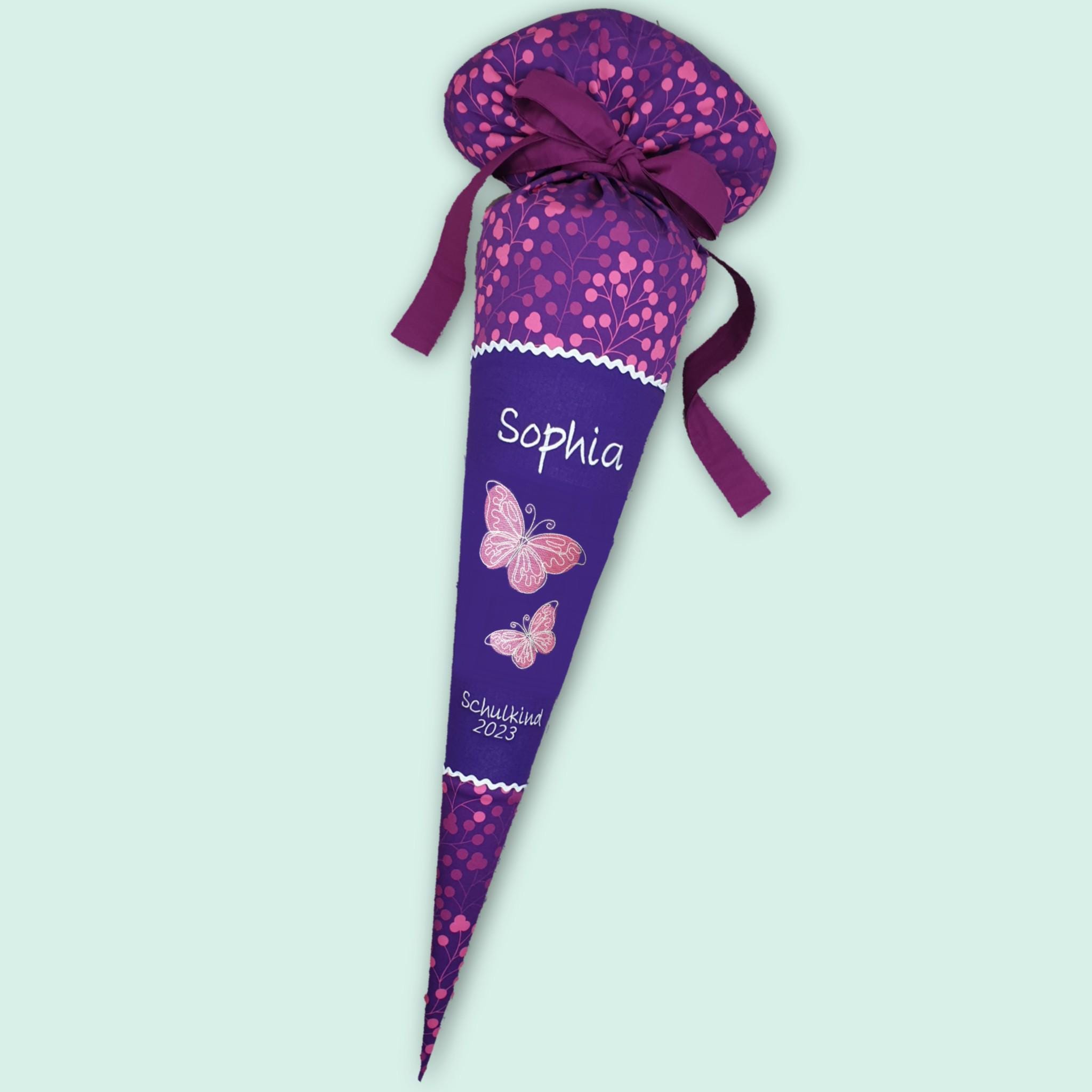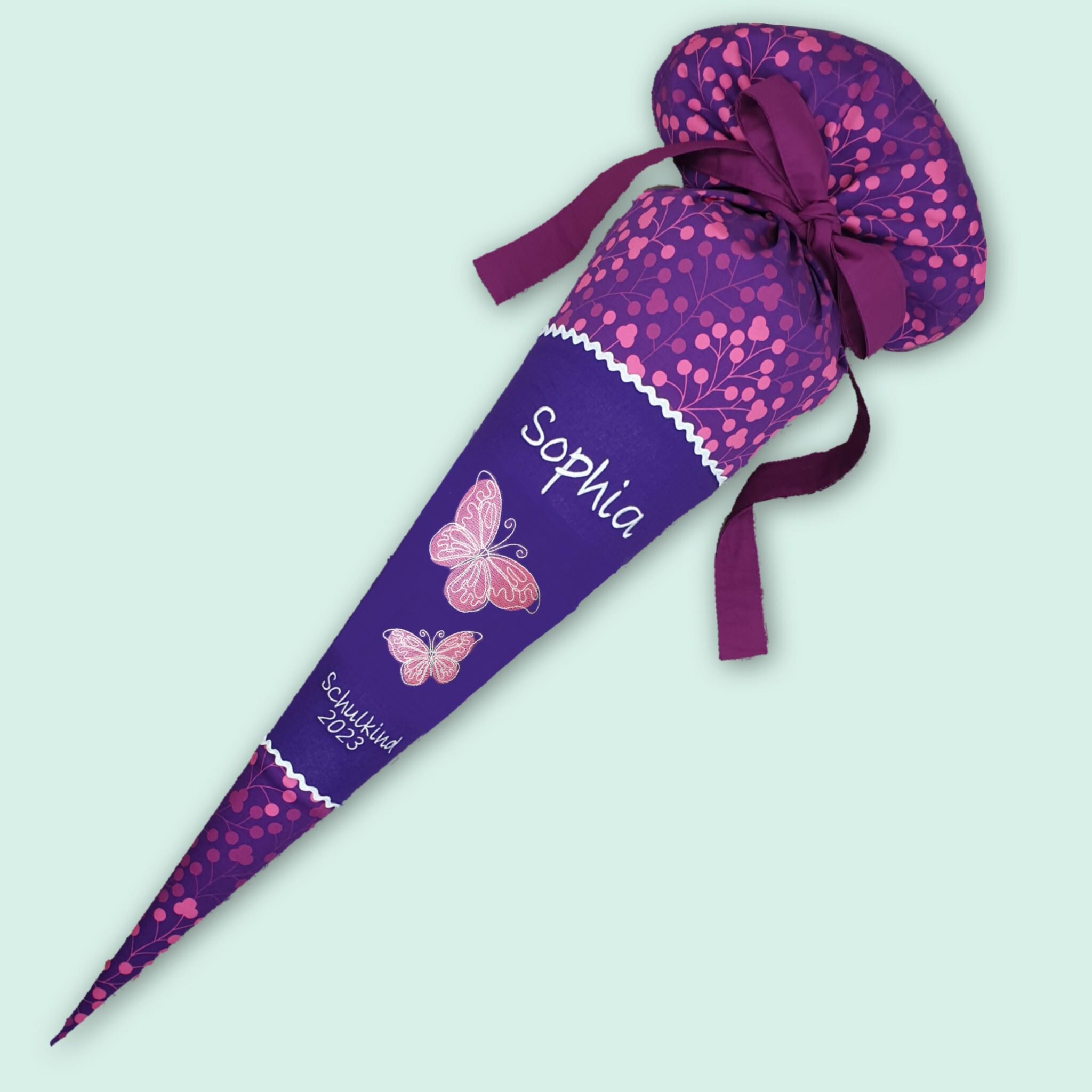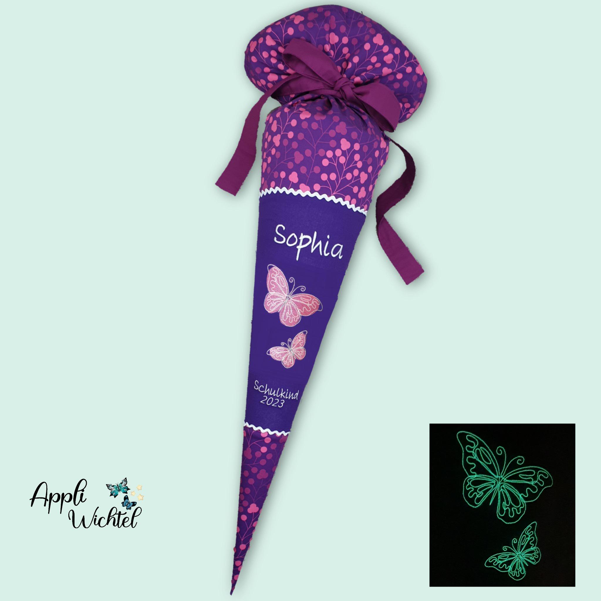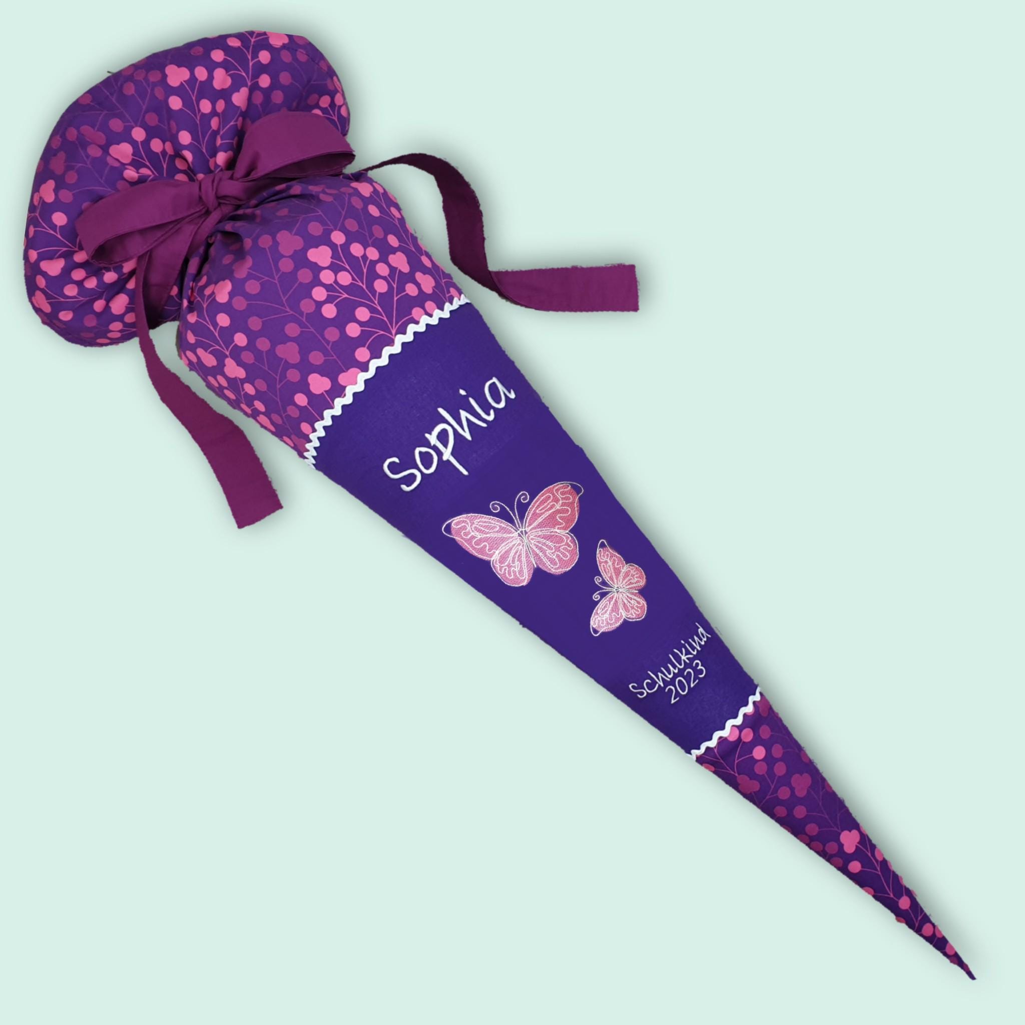 Schultüte mit Schmetterlingen und Namen farblich auf den Step by step Butterfly Night Schulranzen abgestimmt.