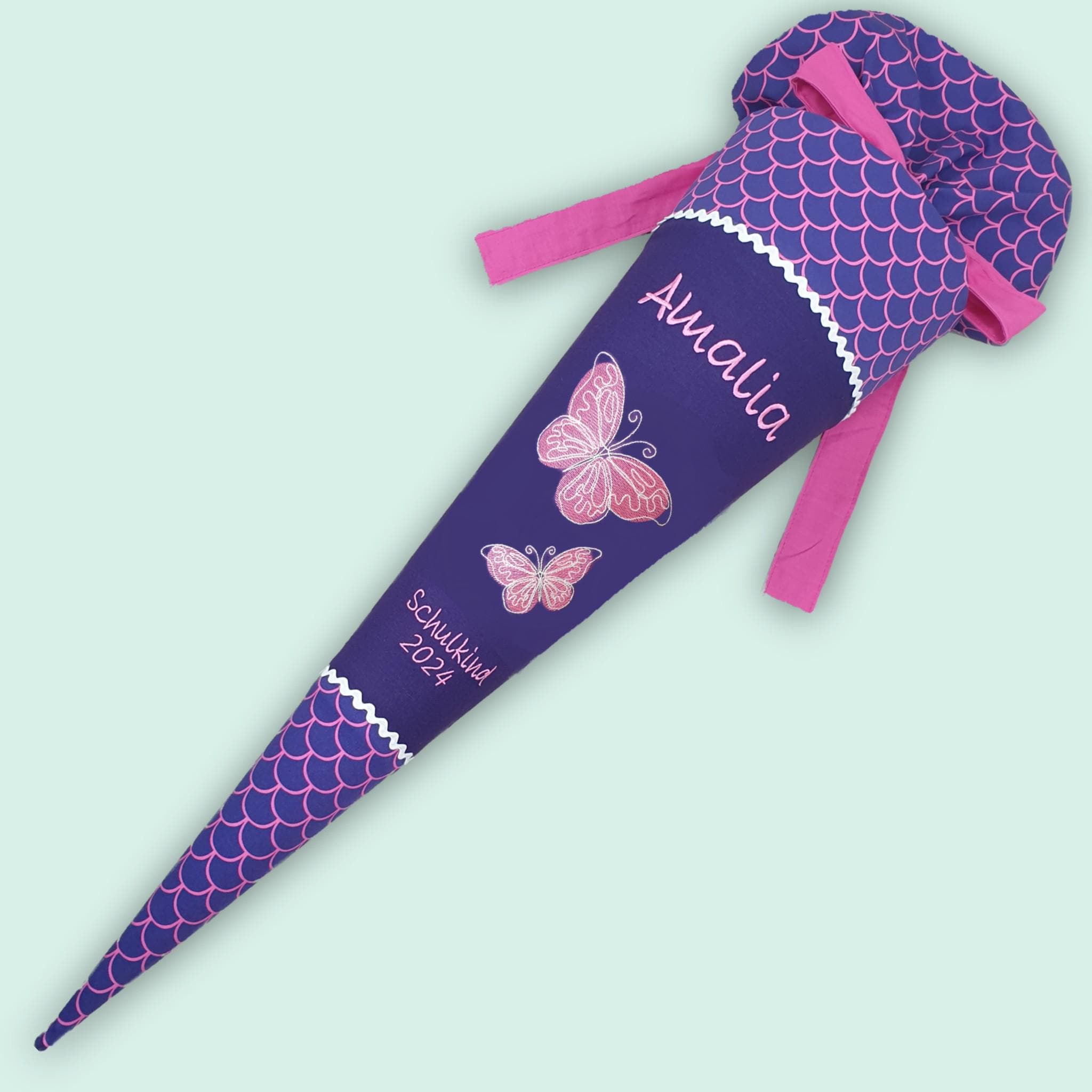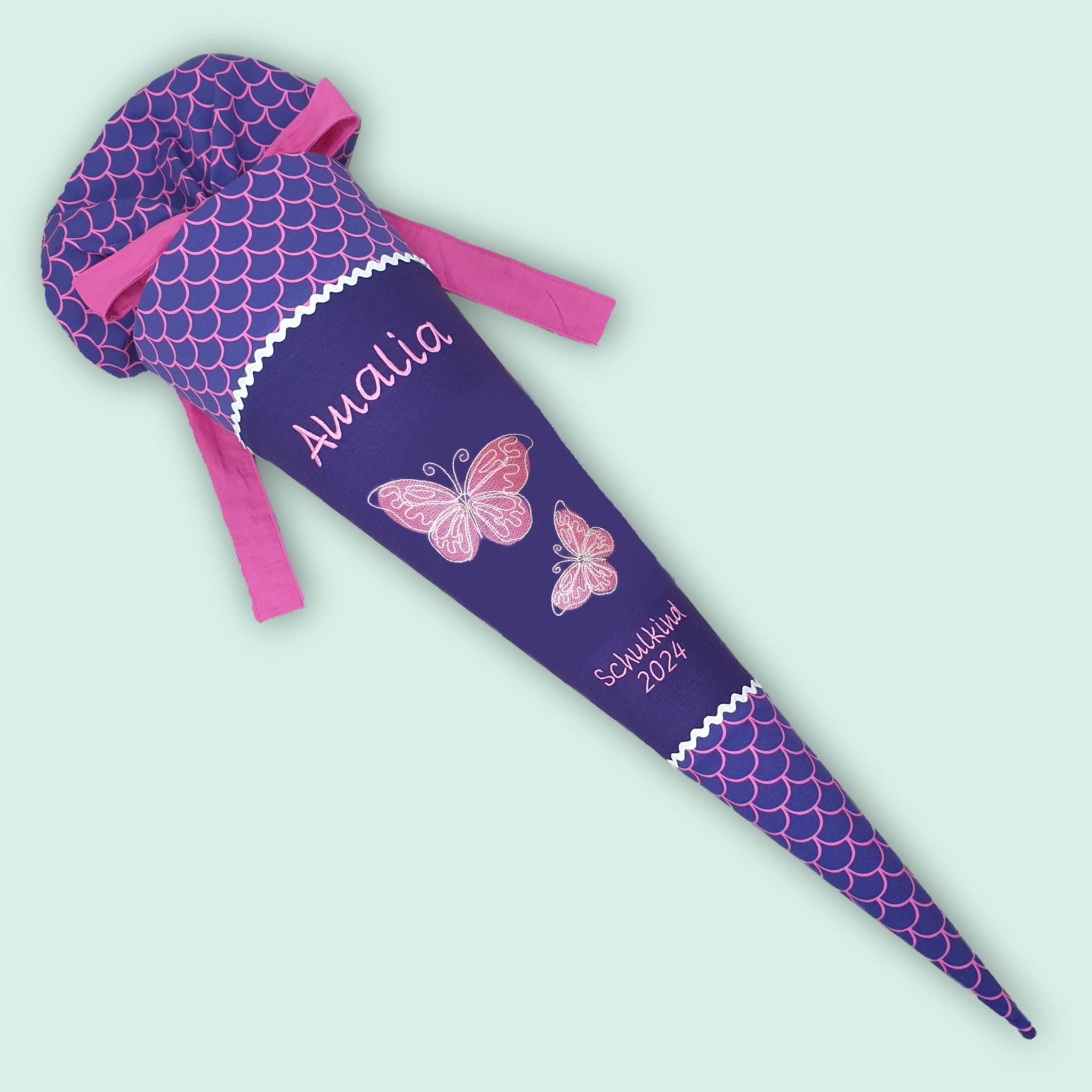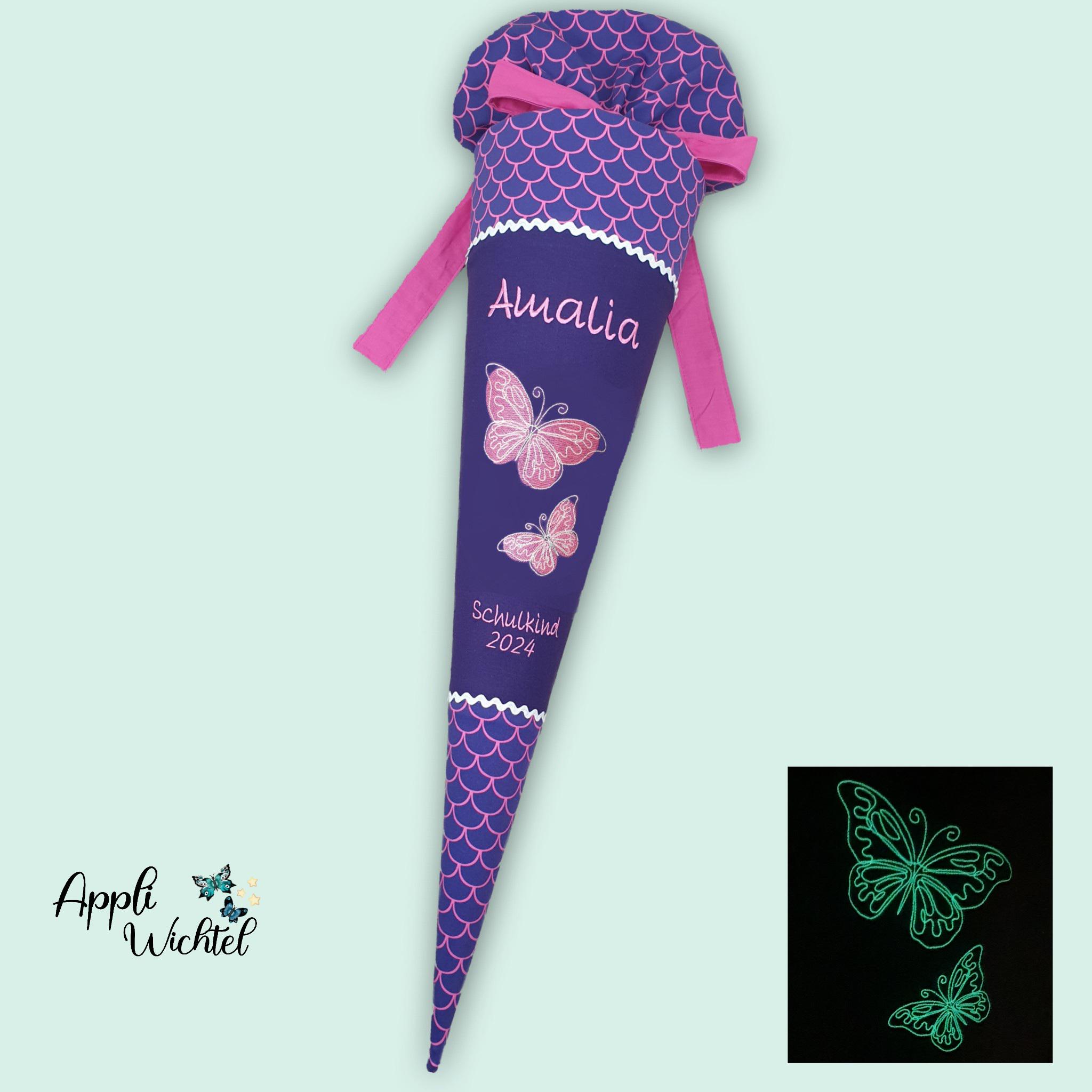 Schultüte mit Schmetterlingen (Schmetterlinge leuchten im Dunkeln) und Namen farblich auf den Ergobag Perlentauchbär Schulranzen abgestimmt.