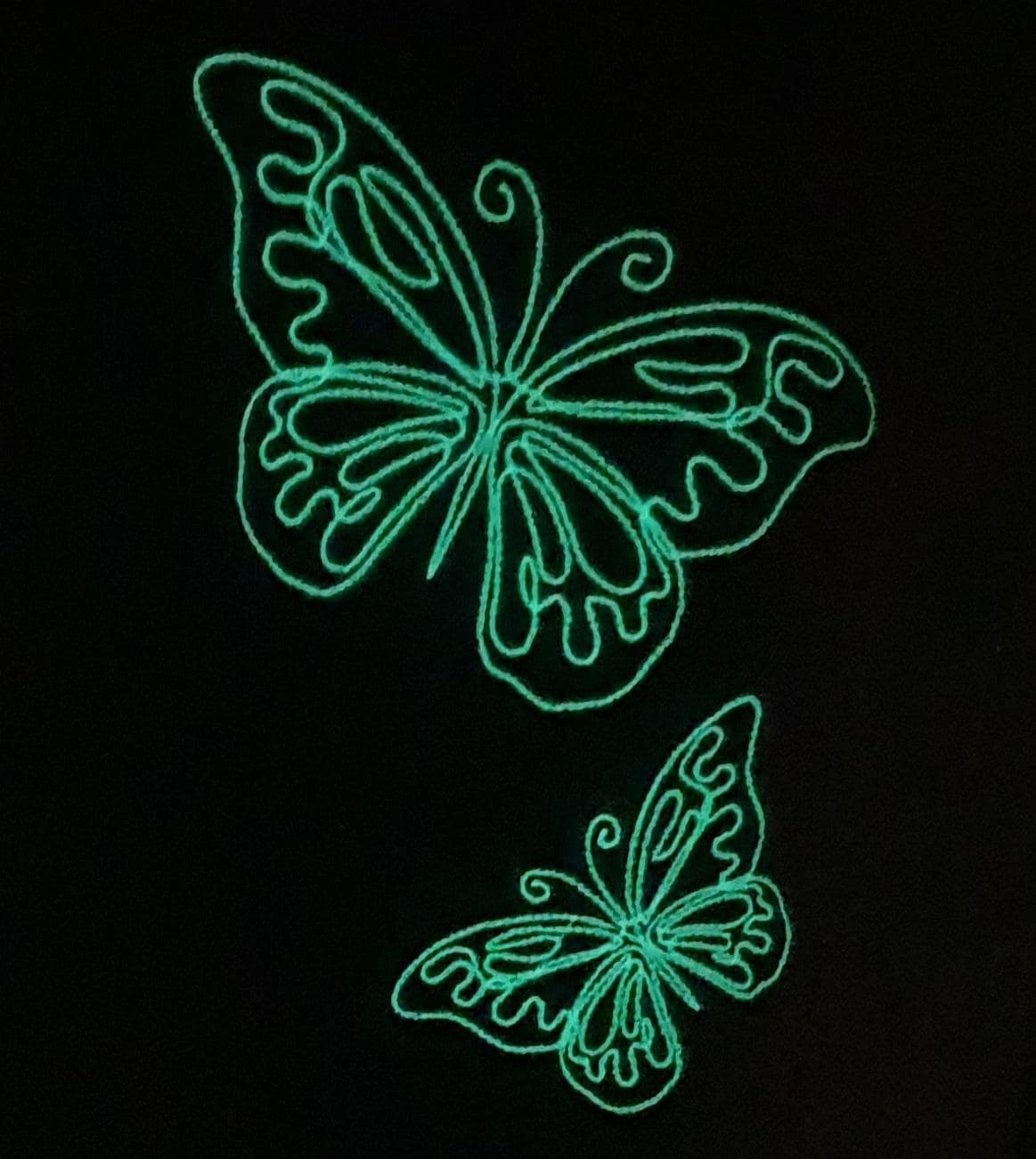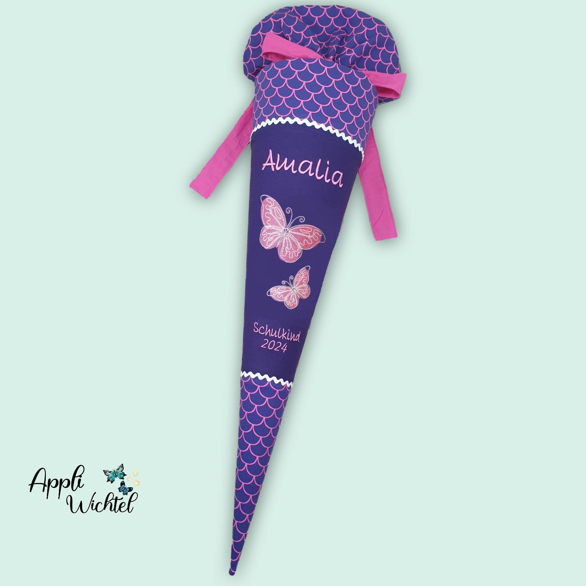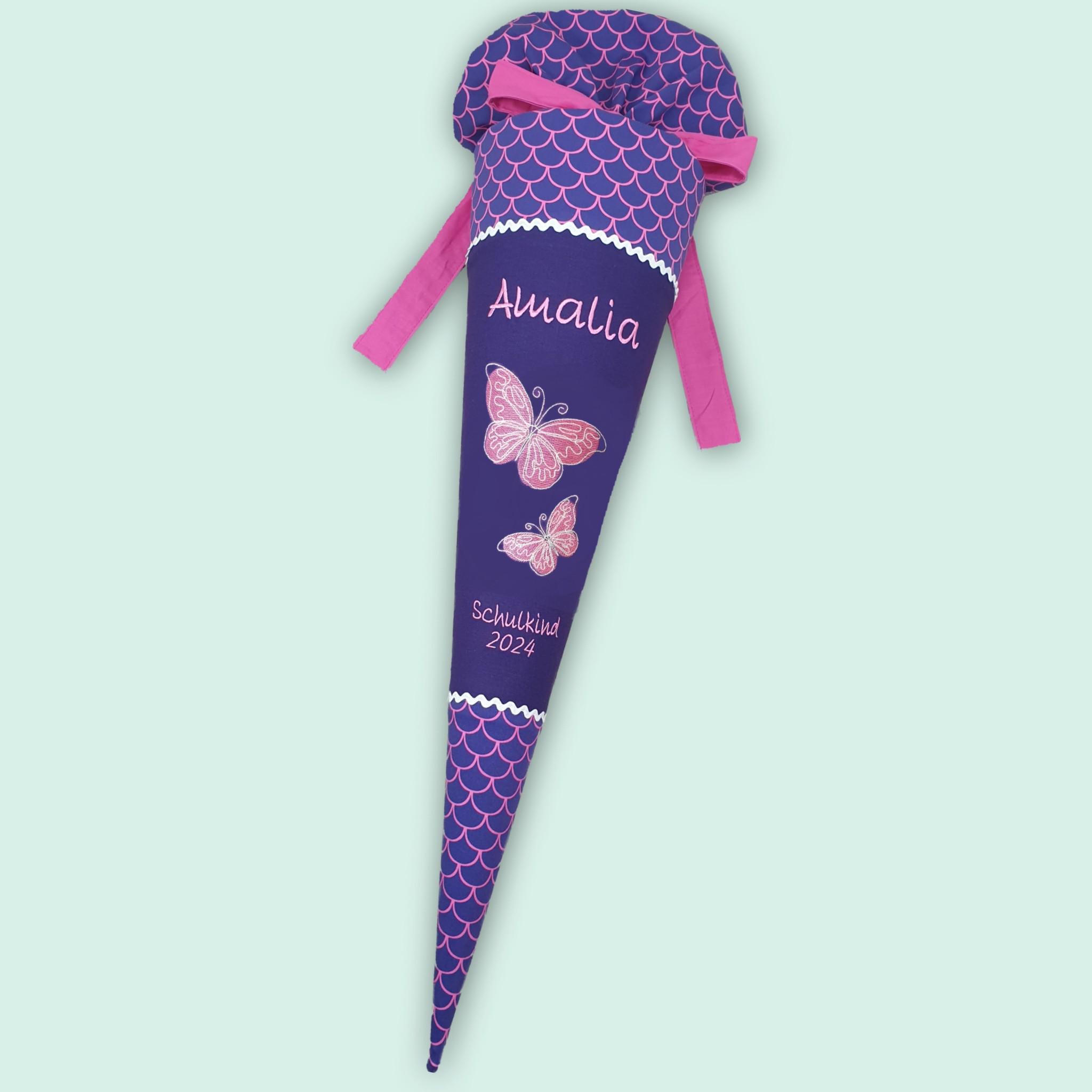 Schultüte mit Schmetterlingen (Schmetterlinge leuchten im Dunkeln) und Namen farblich auf den Ergobag Perlentauchbär Schulranzen abgestimmt.