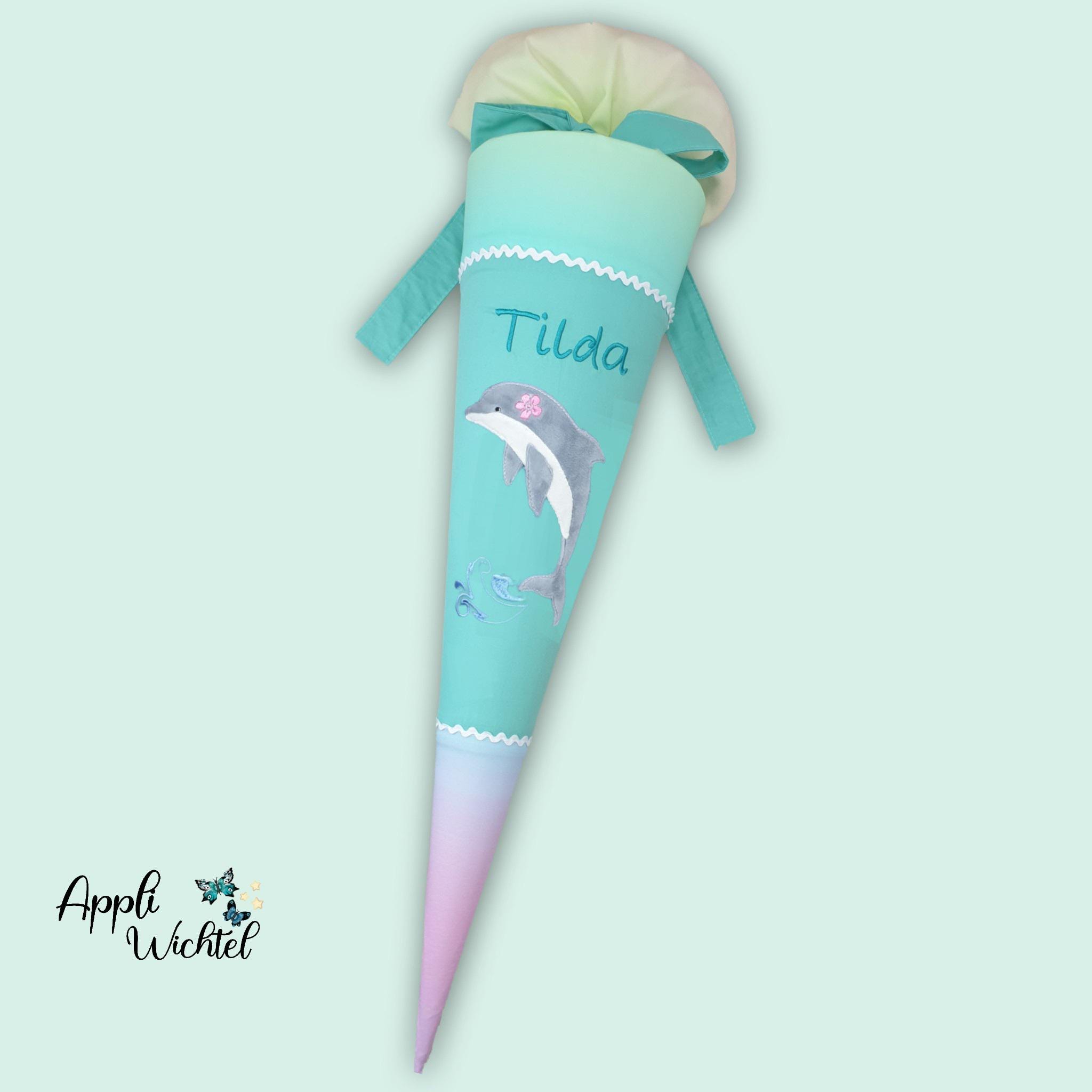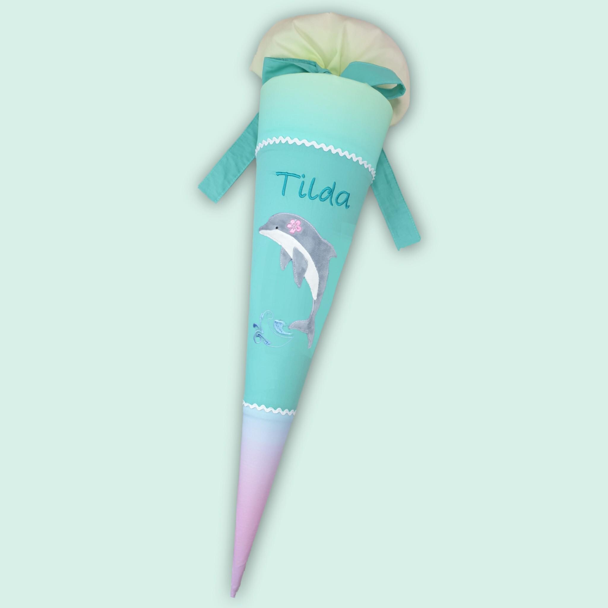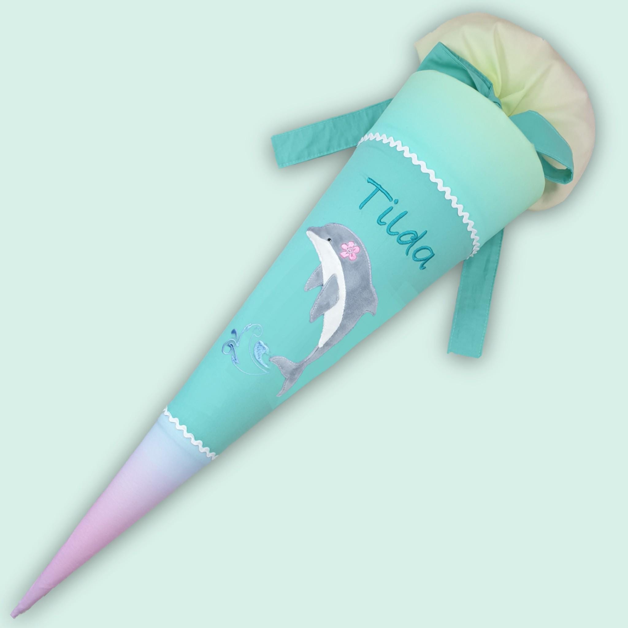 Schultüte mit Delfin und Namen farblich auf den Ergobag Zaubärwelt Schulranzen abgestimmt.