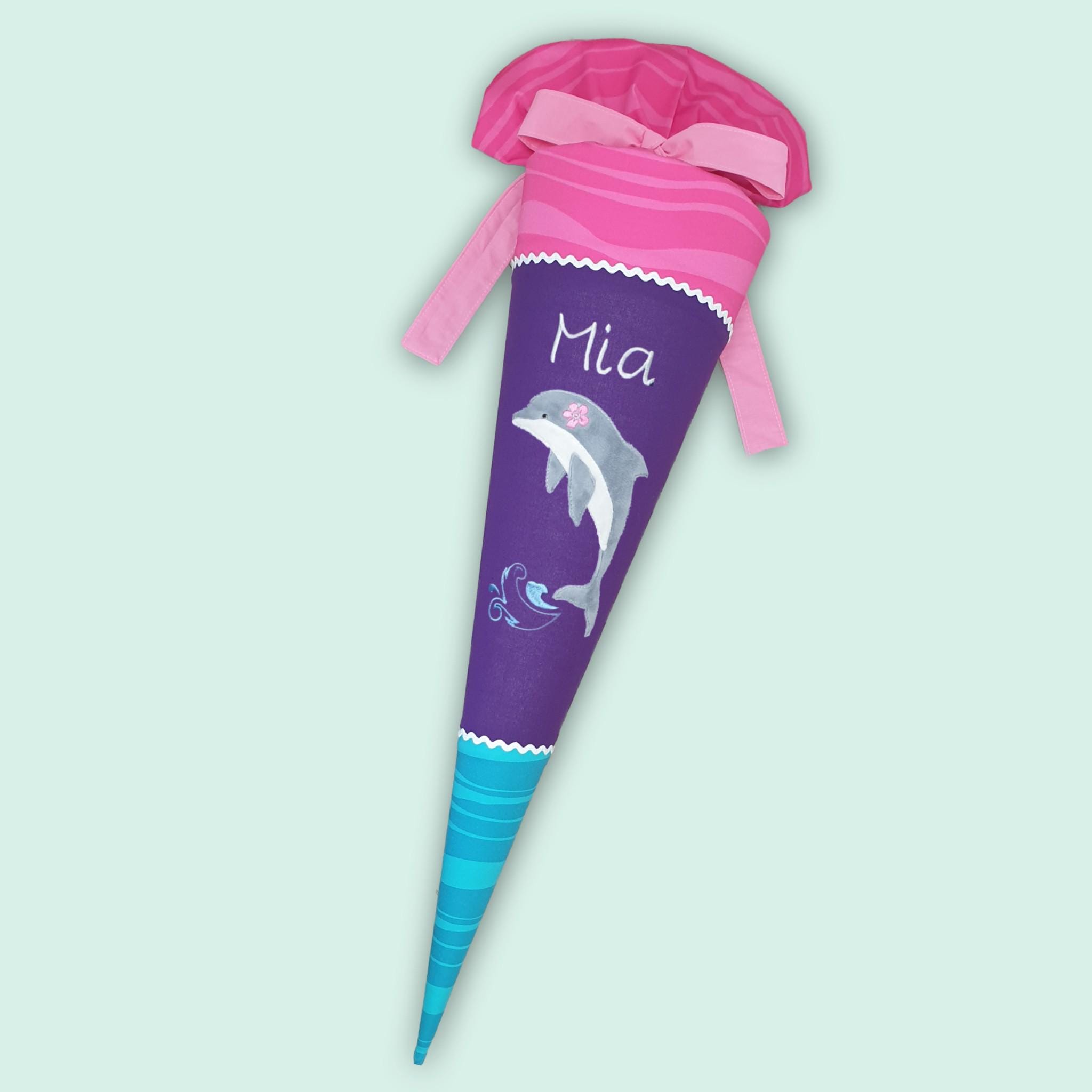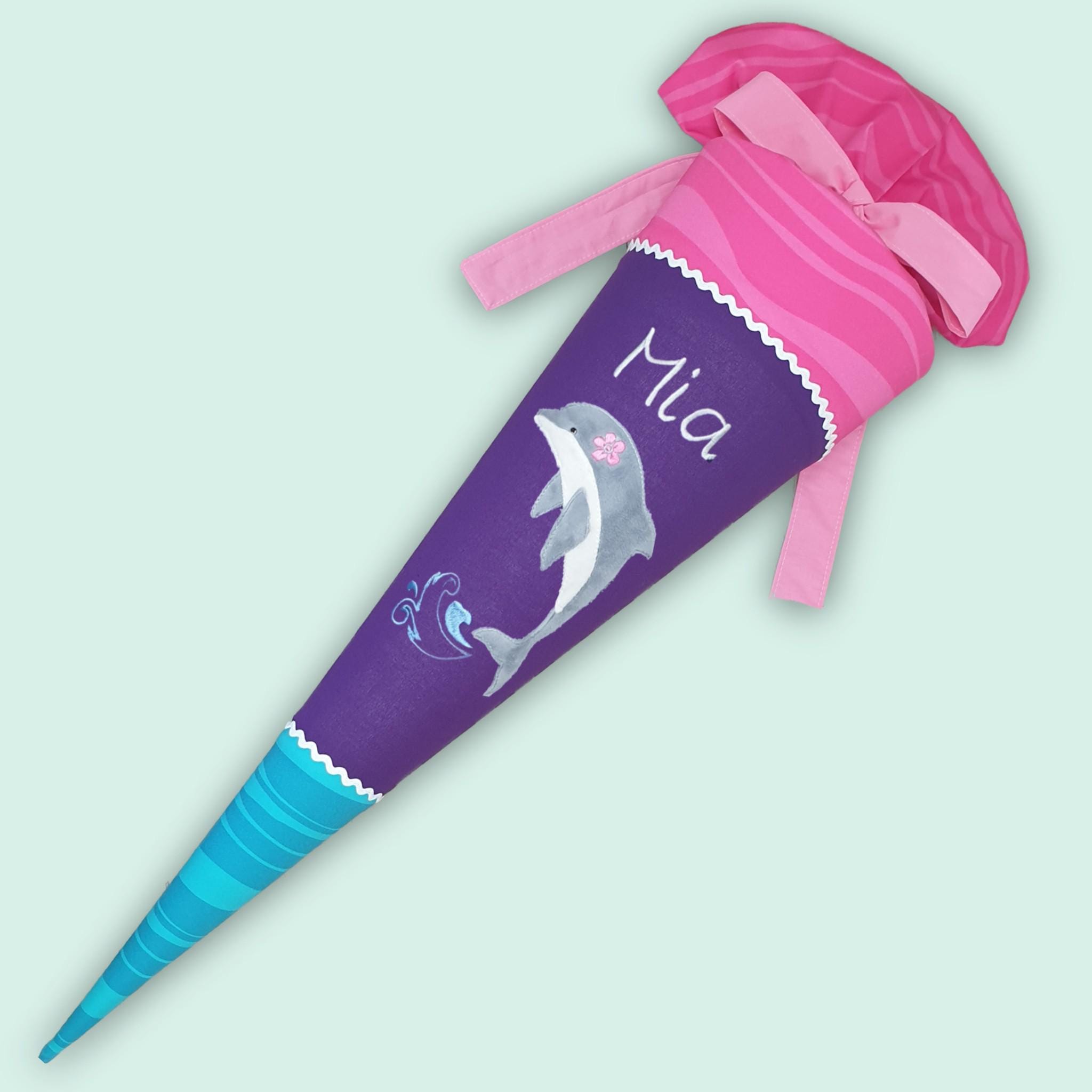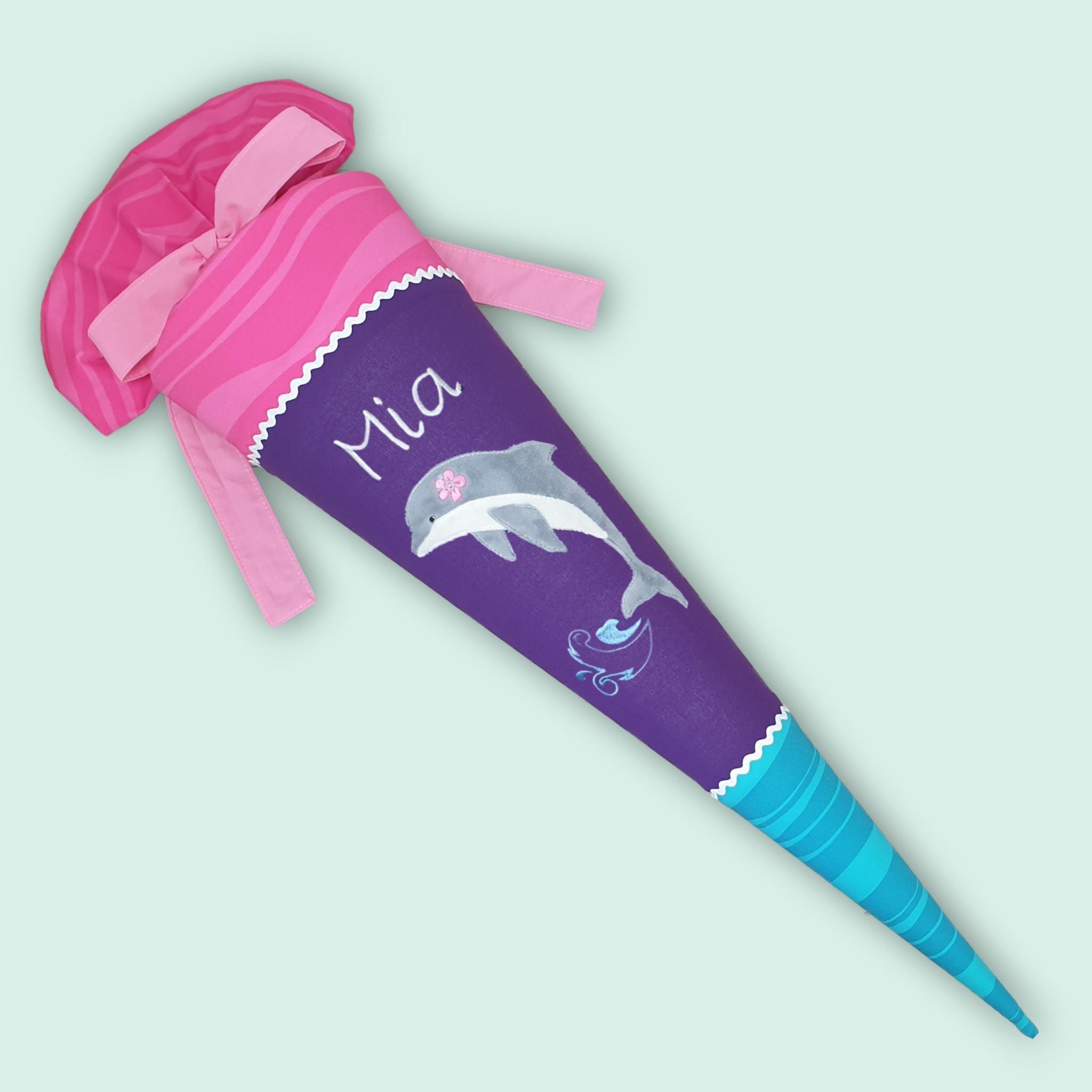 Schultüte mit Delfin und Namen farblich auf den Step by step Dolphin Lana Schulranzen abgestimmt.