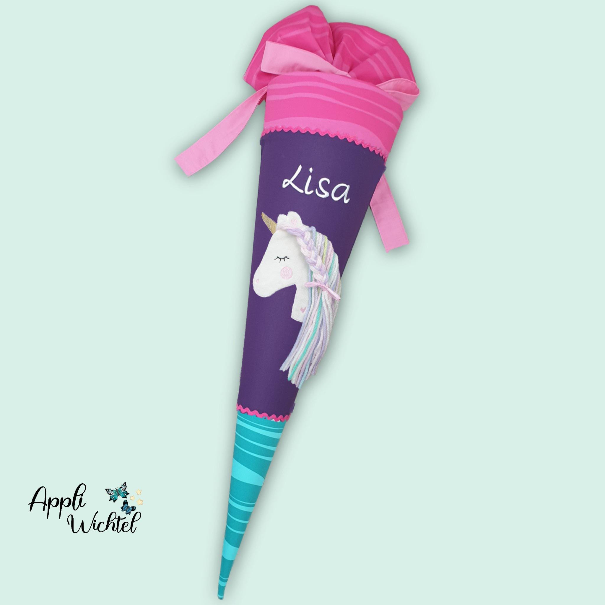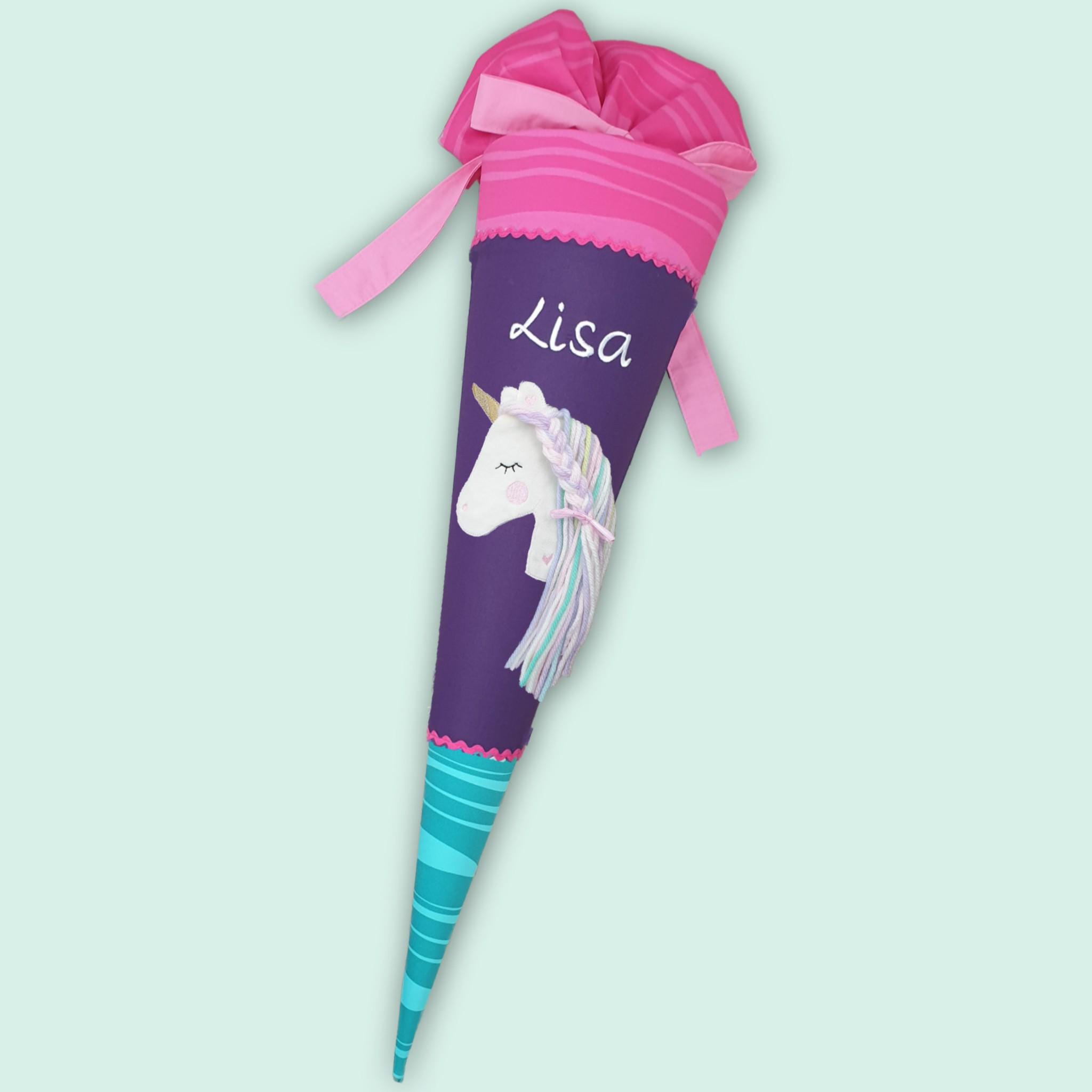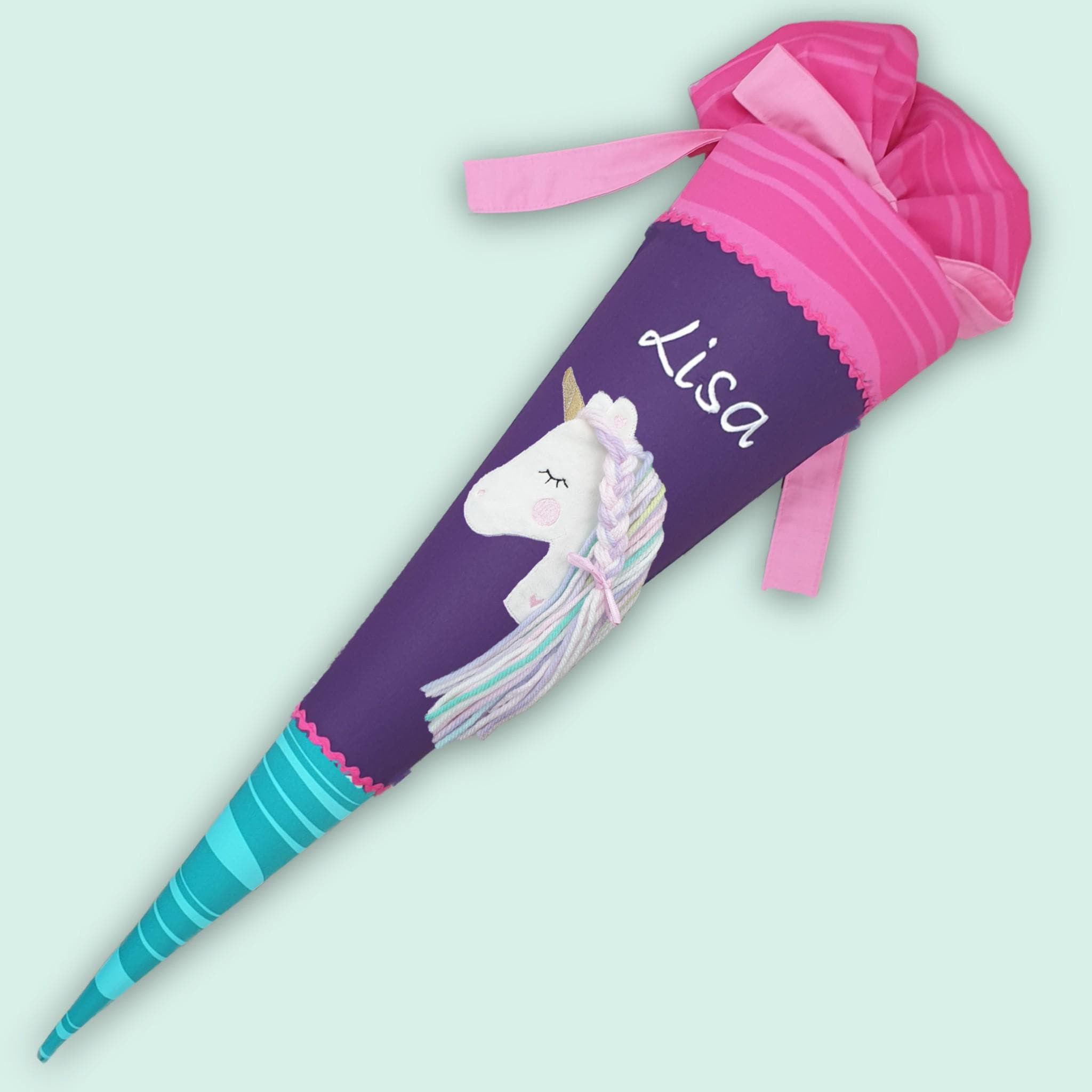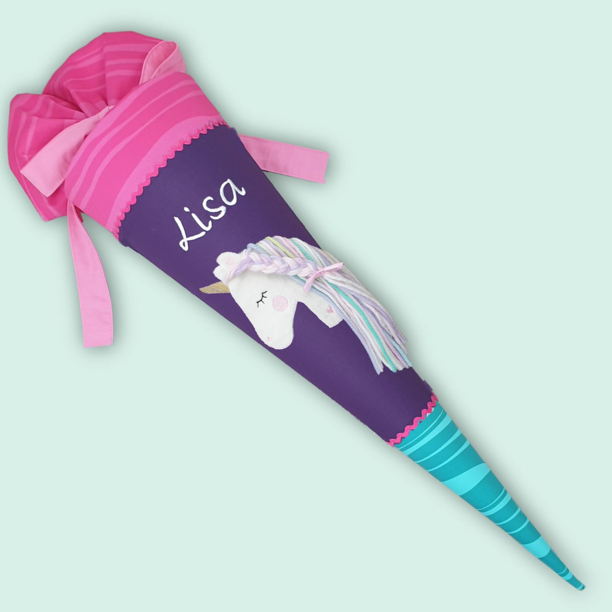 Schultüte mit Einhorn und Namen farblich auf den Step by step Dolphin Lana Schulranzen abgestimmt.