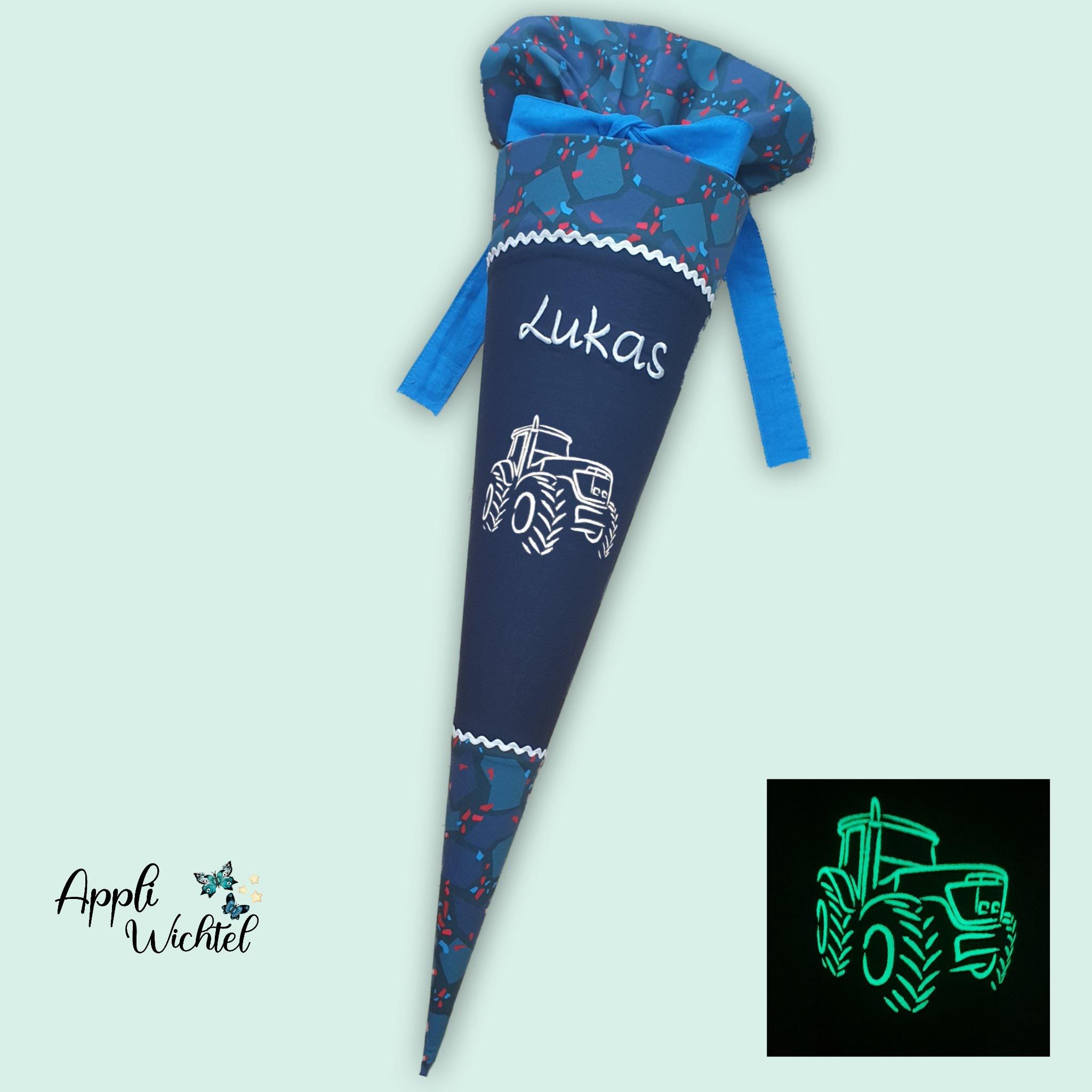 Schultüte mit Traktor (Leuchtet im Dunkeln) und Namen farblich auf den step by step Tractor Freddy Schulranzen abgestimmt.