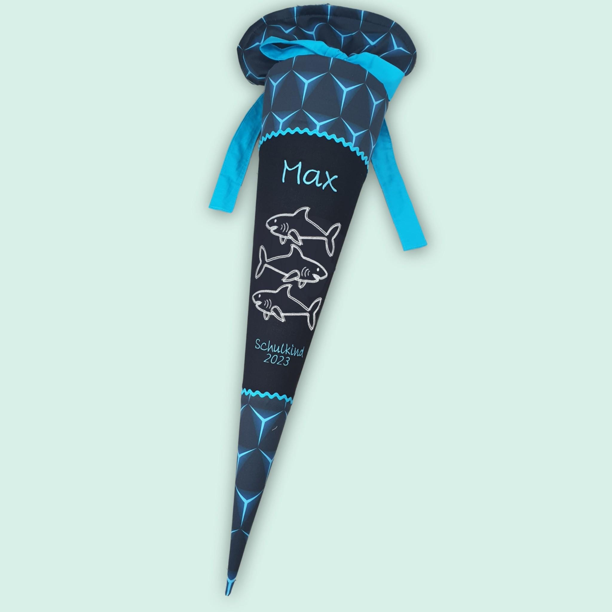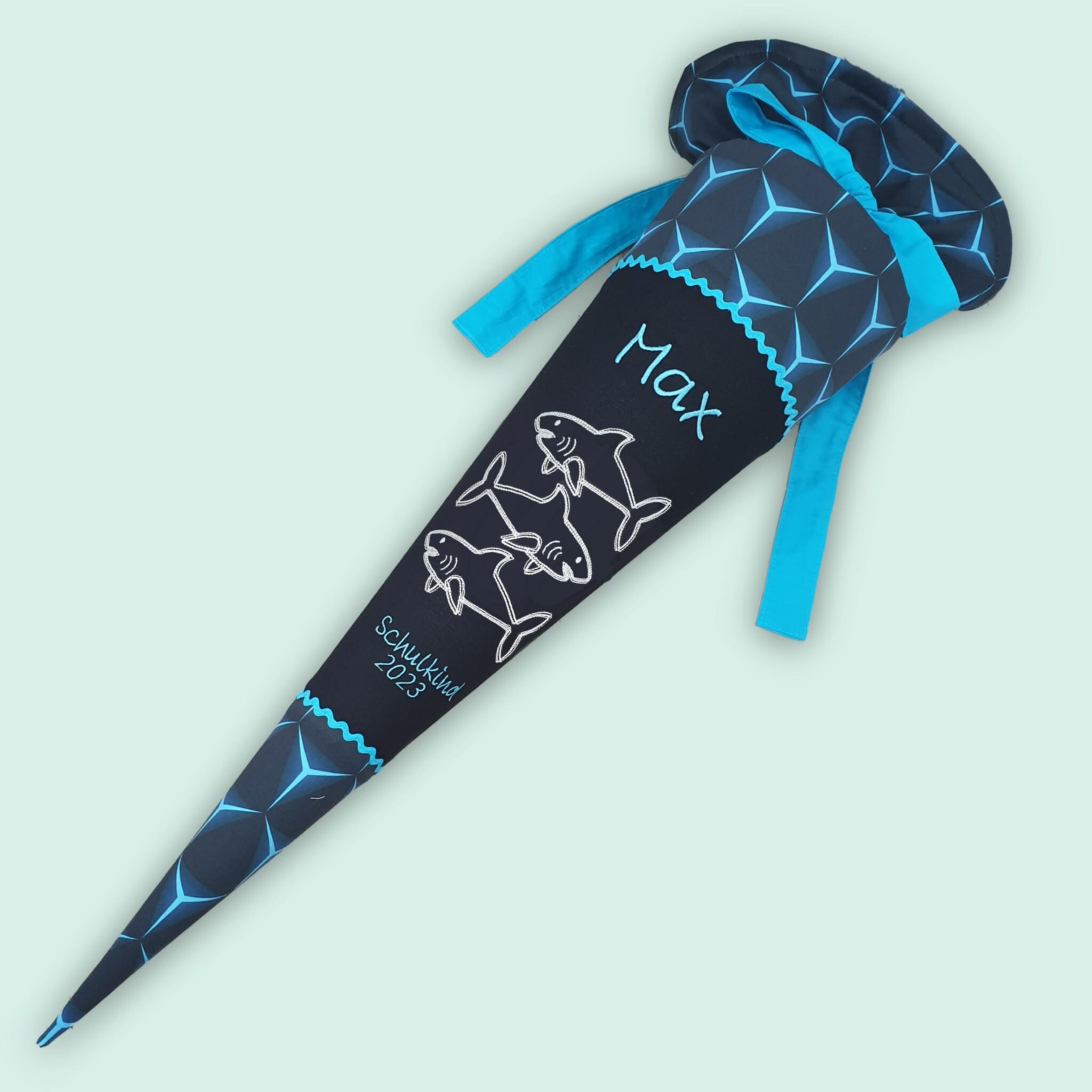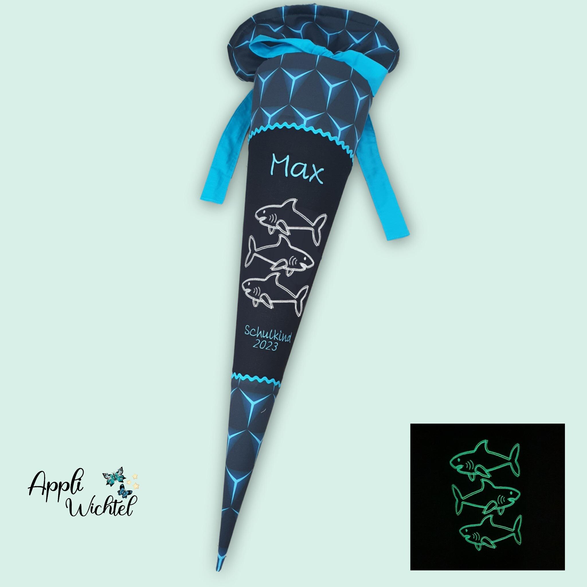 Schultüte mit Haien die im Dunkeln leuchten und Namen farblich auf den Shark Dexter Schulranzen abgestimmt.