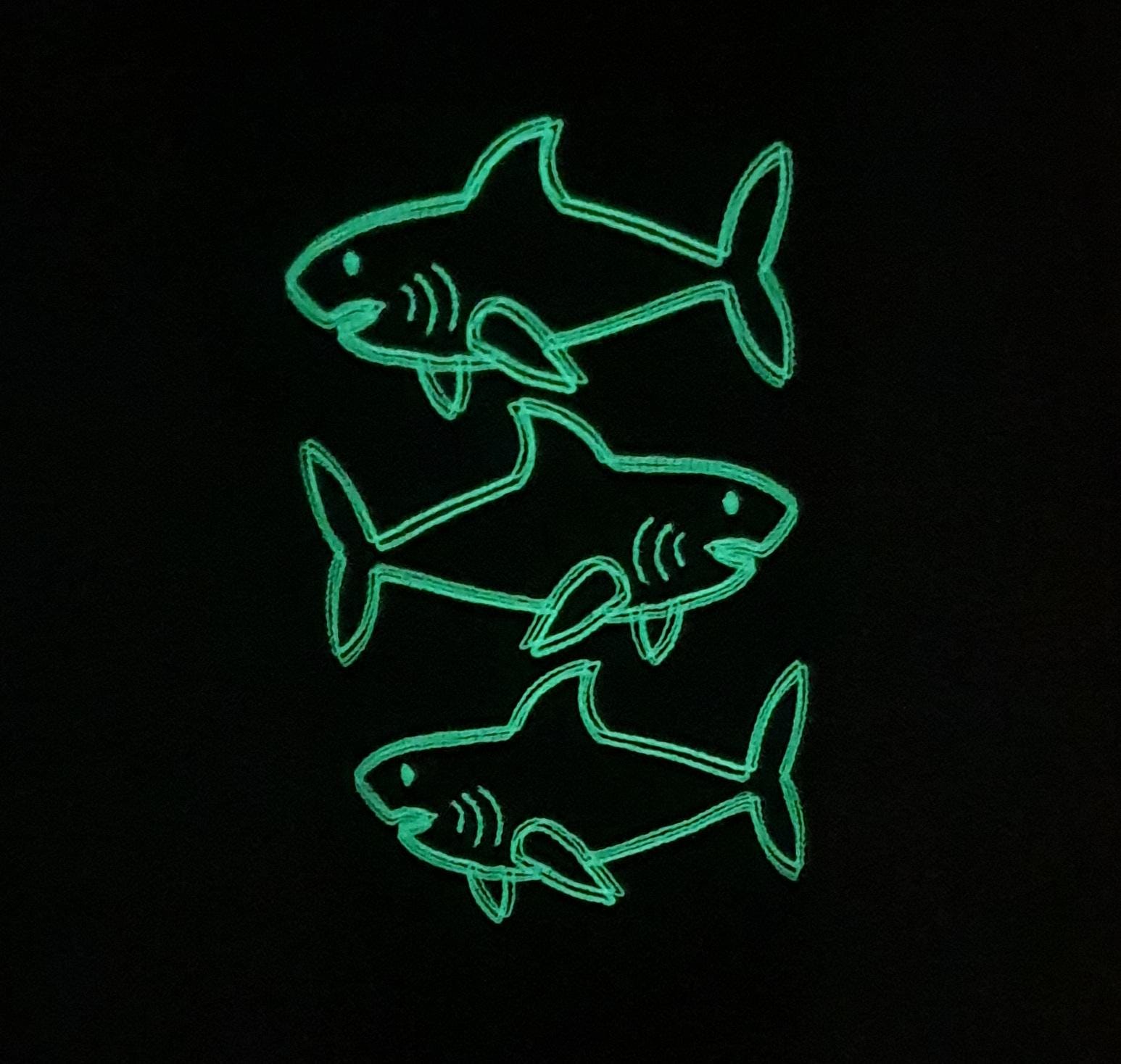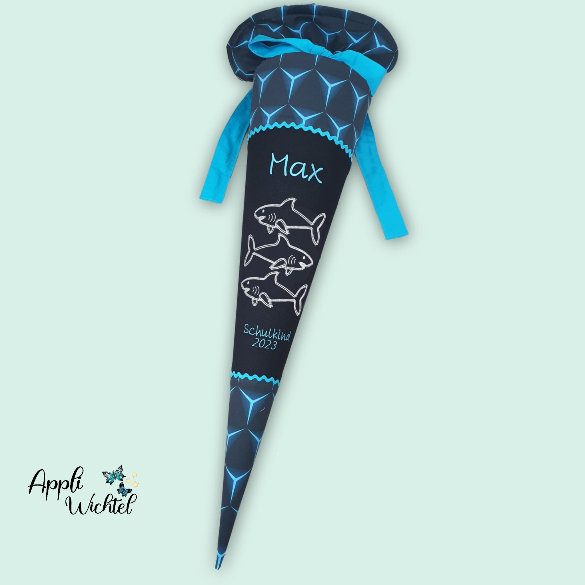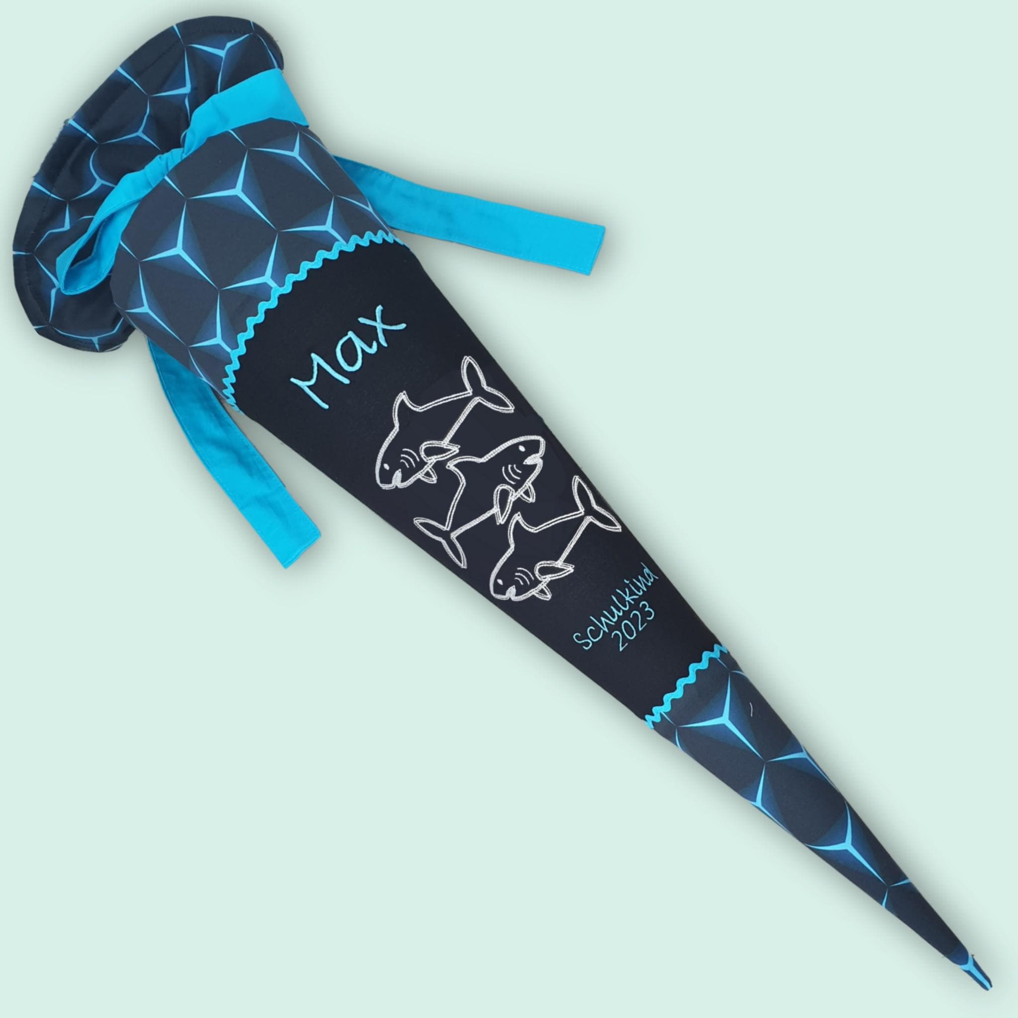 Schultüte mit Haien die im Dunkeln leuchten und Namen farblich auf den Shark Dexter Schulranzen abgestimmt.