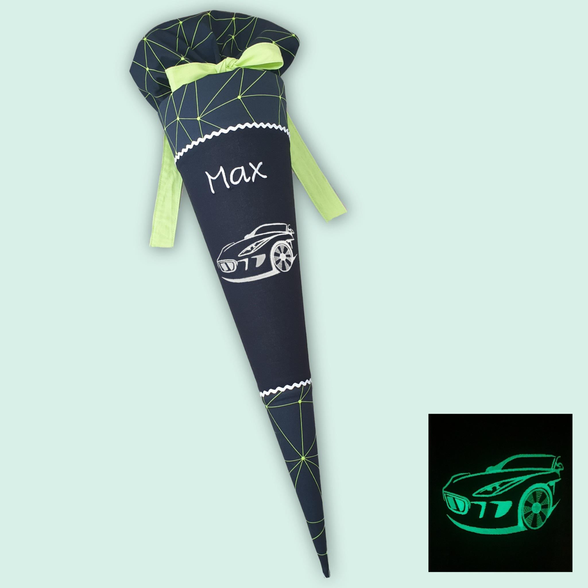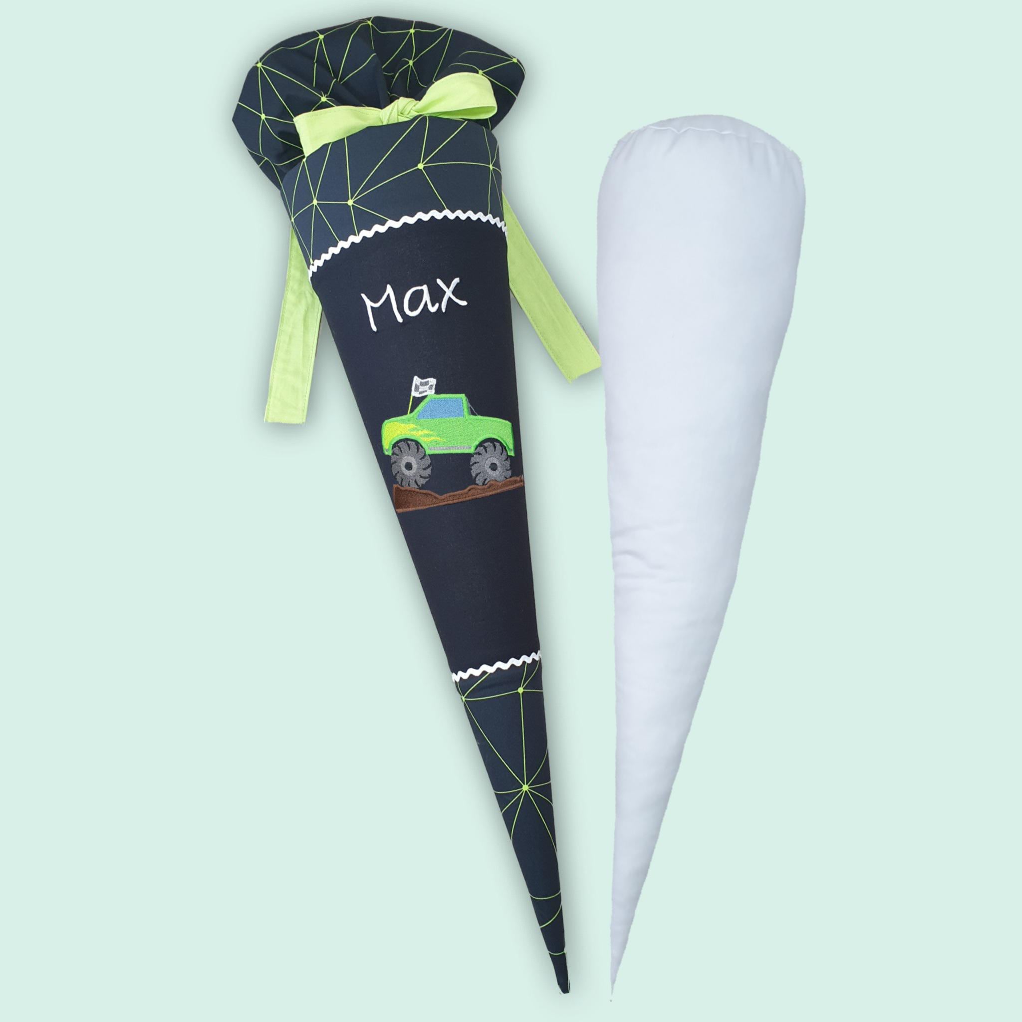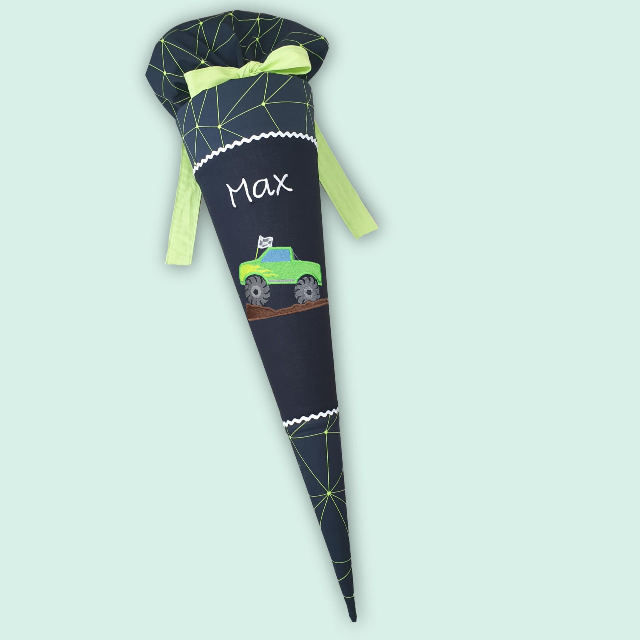 70 cm Schultüte Auto Stern Dino Monster Truck (Stern und Auto leuchten im dunklen) und Namen farblich auf den Cybär Race Schulranzen abgestimmt.
