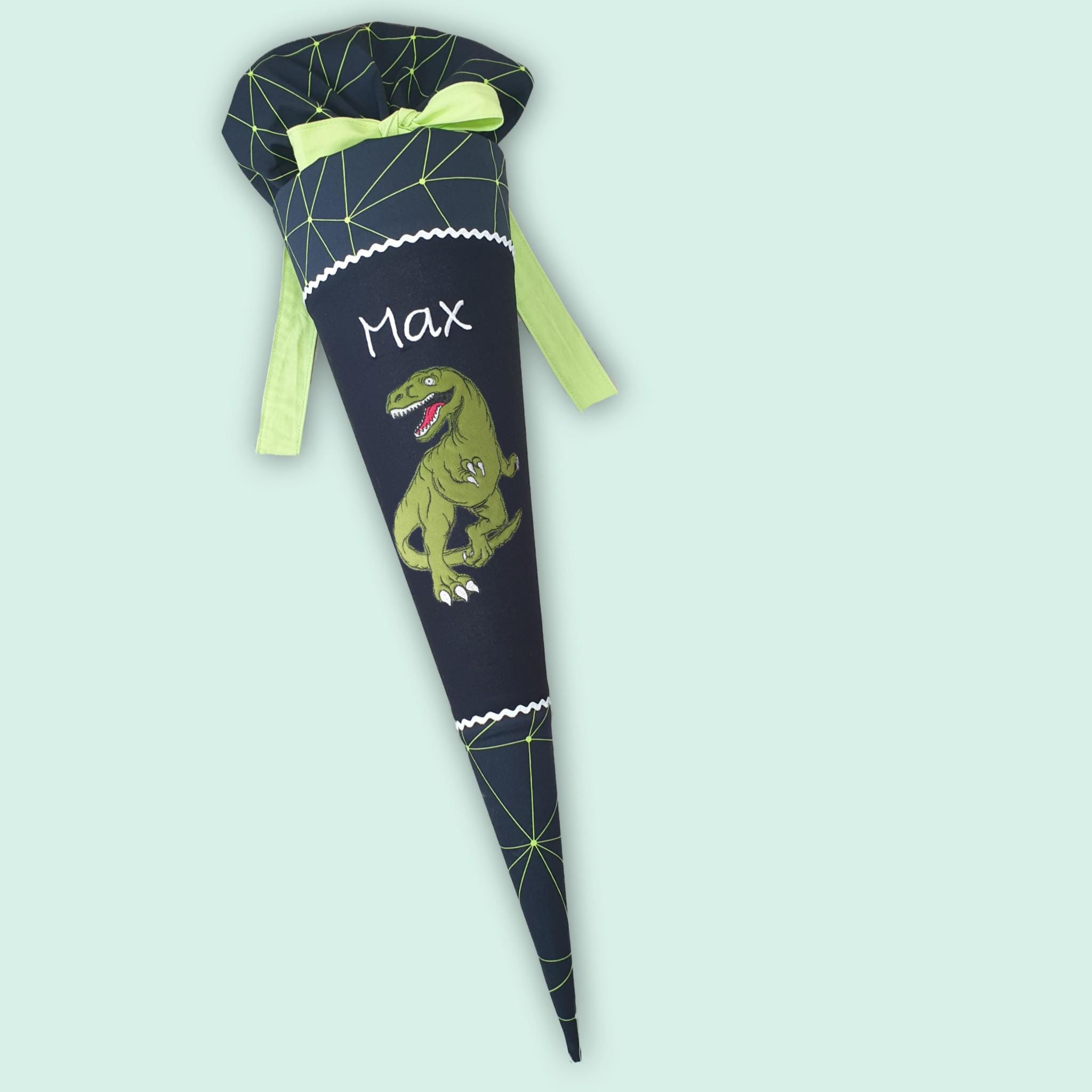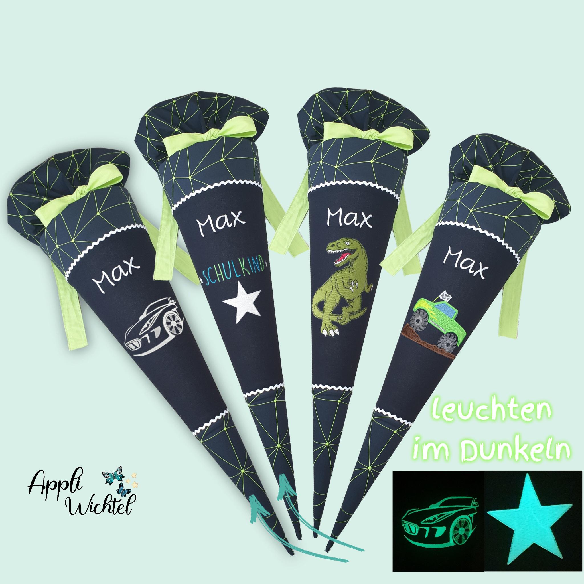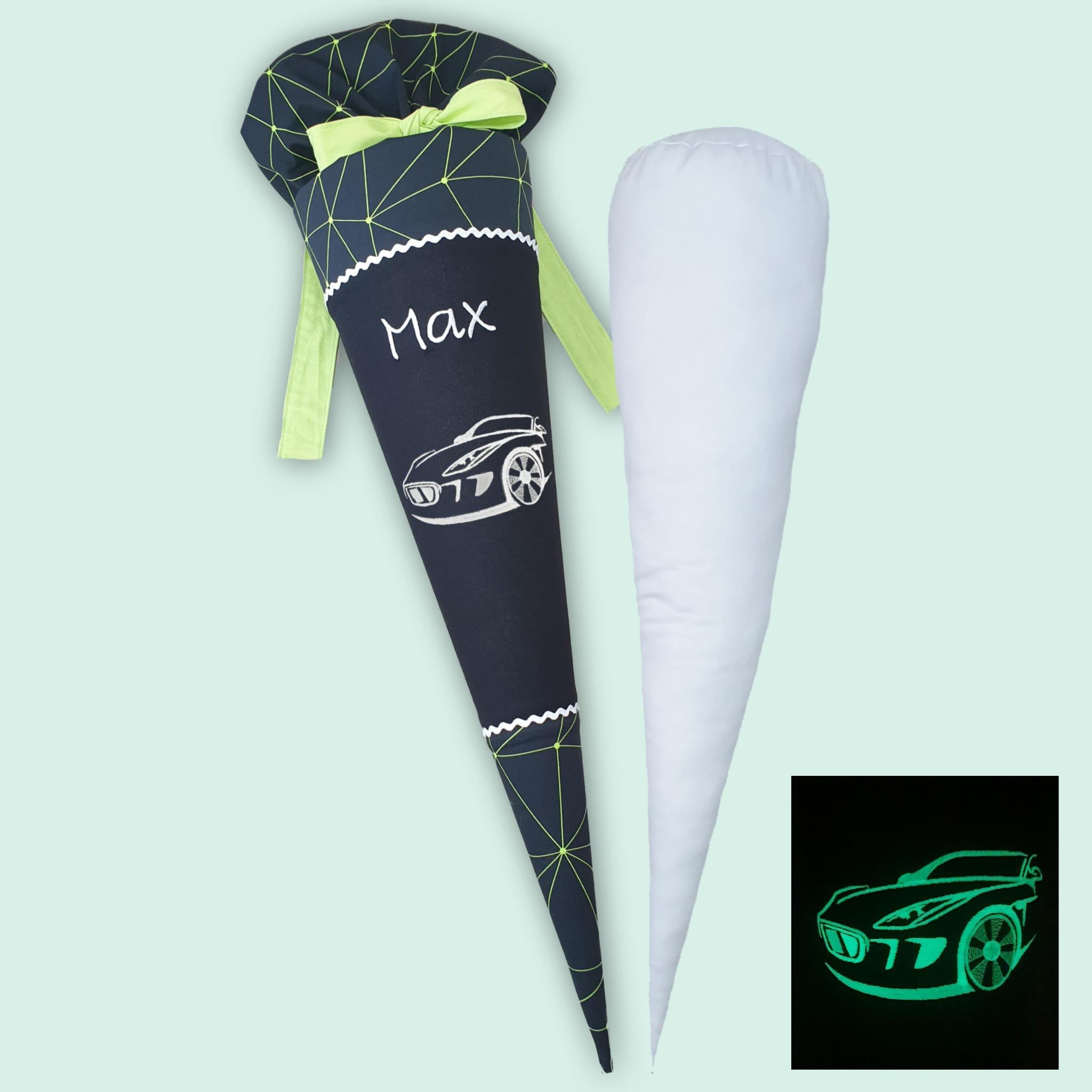 70 cm Schultüte Auto Stern Dino Monster Truck (Stern und Auto leuchten im dunklen) und Namen farblich auf den Cybär Race Schulranzen abgestimmt.