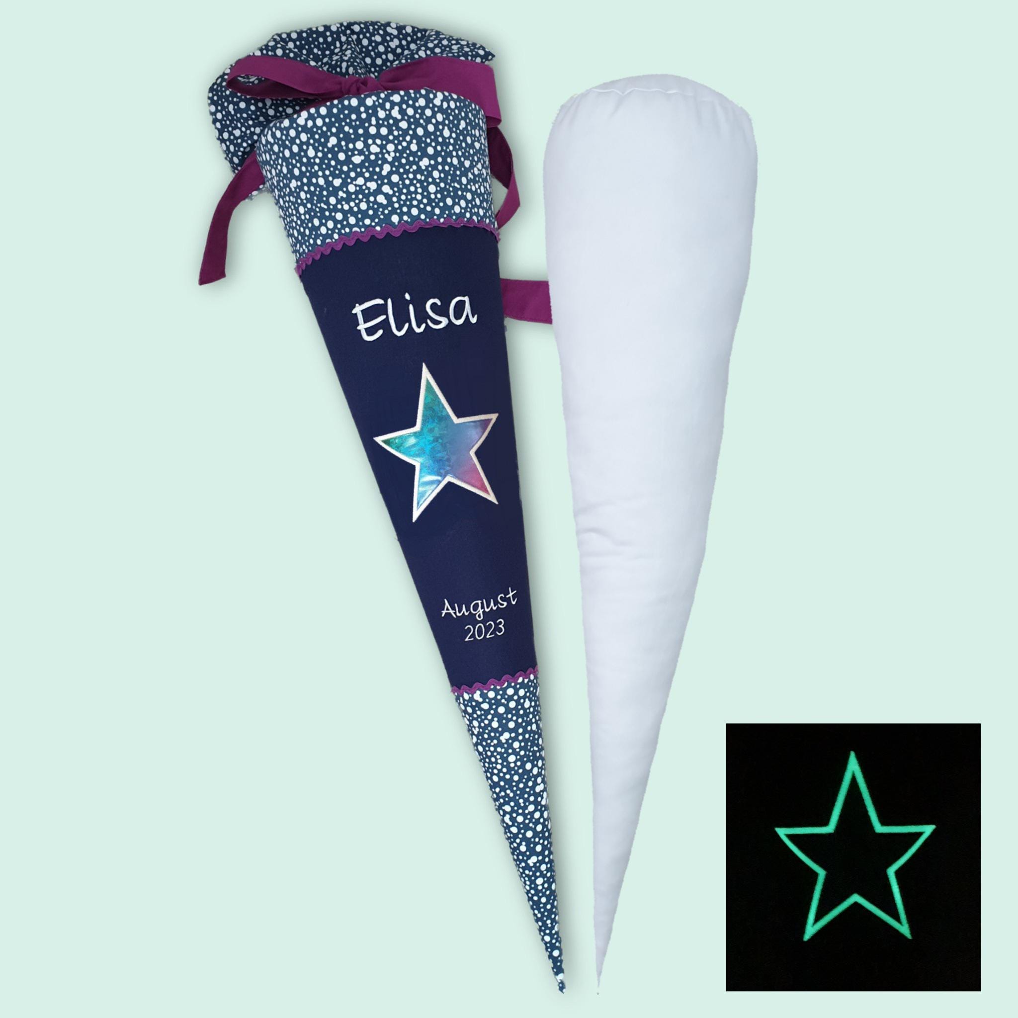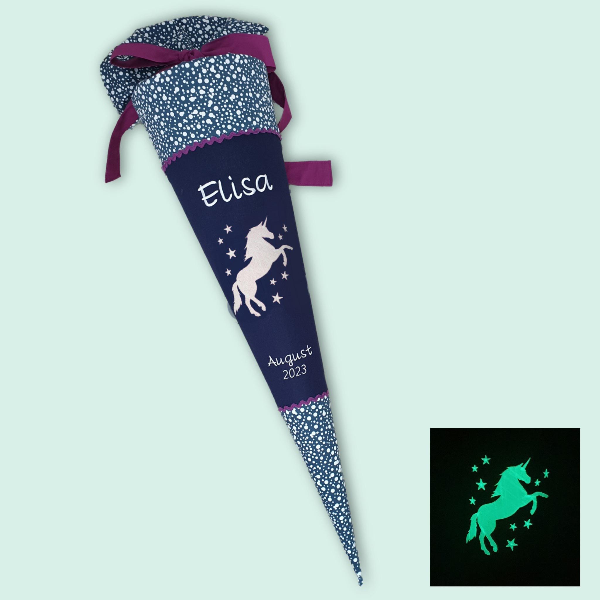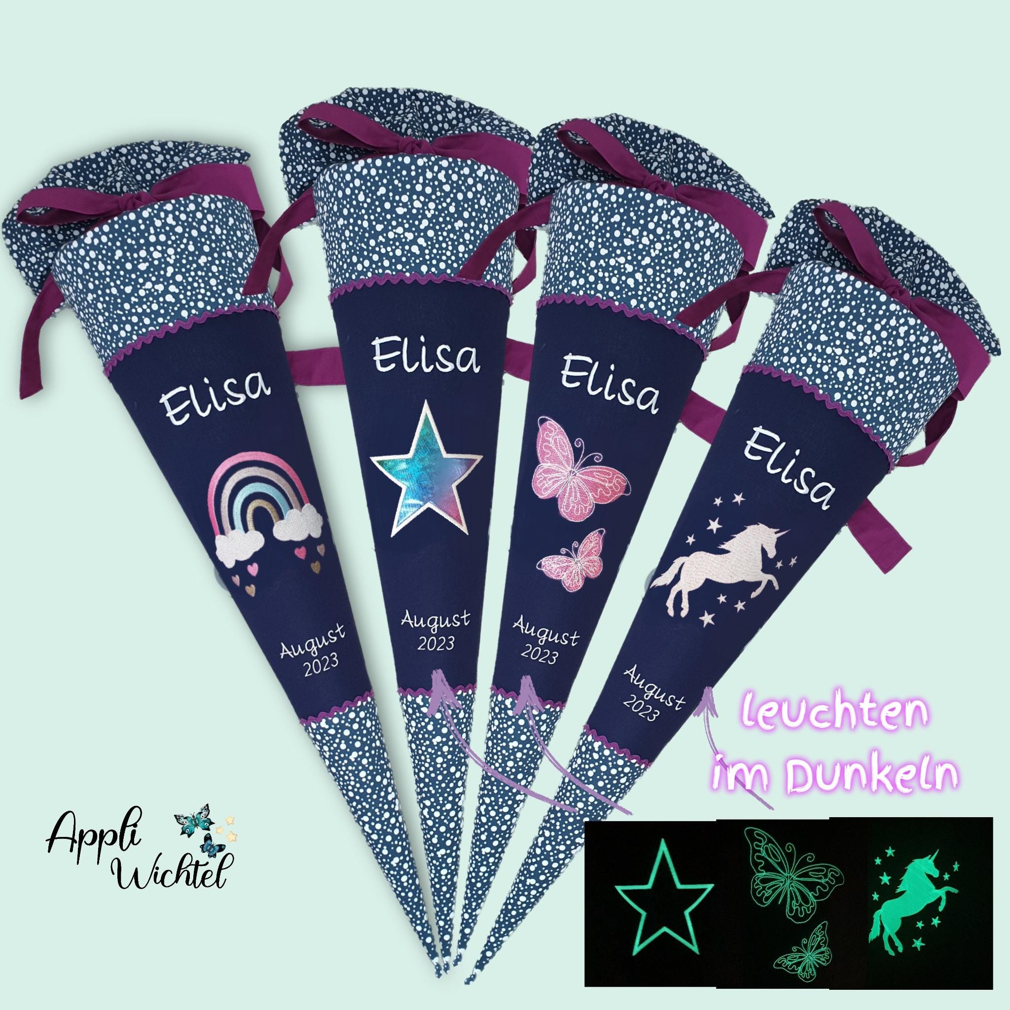 70 cm Schultüte Regenbogen Stern Schmettterling Einhorn (einige leuchten im Dunkleln) und Namen farblich auf den Ergobag Bärlaxy Schulranzen abgestimmt.