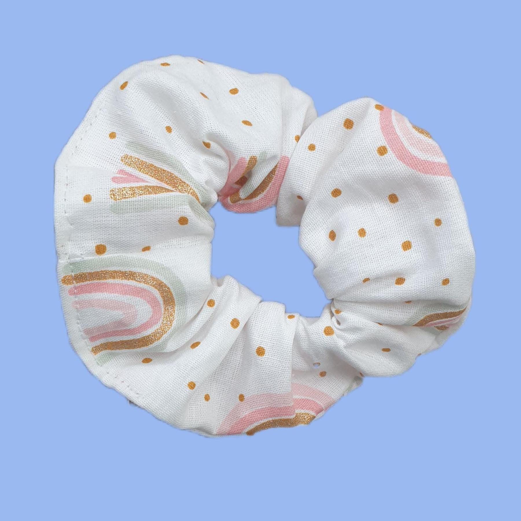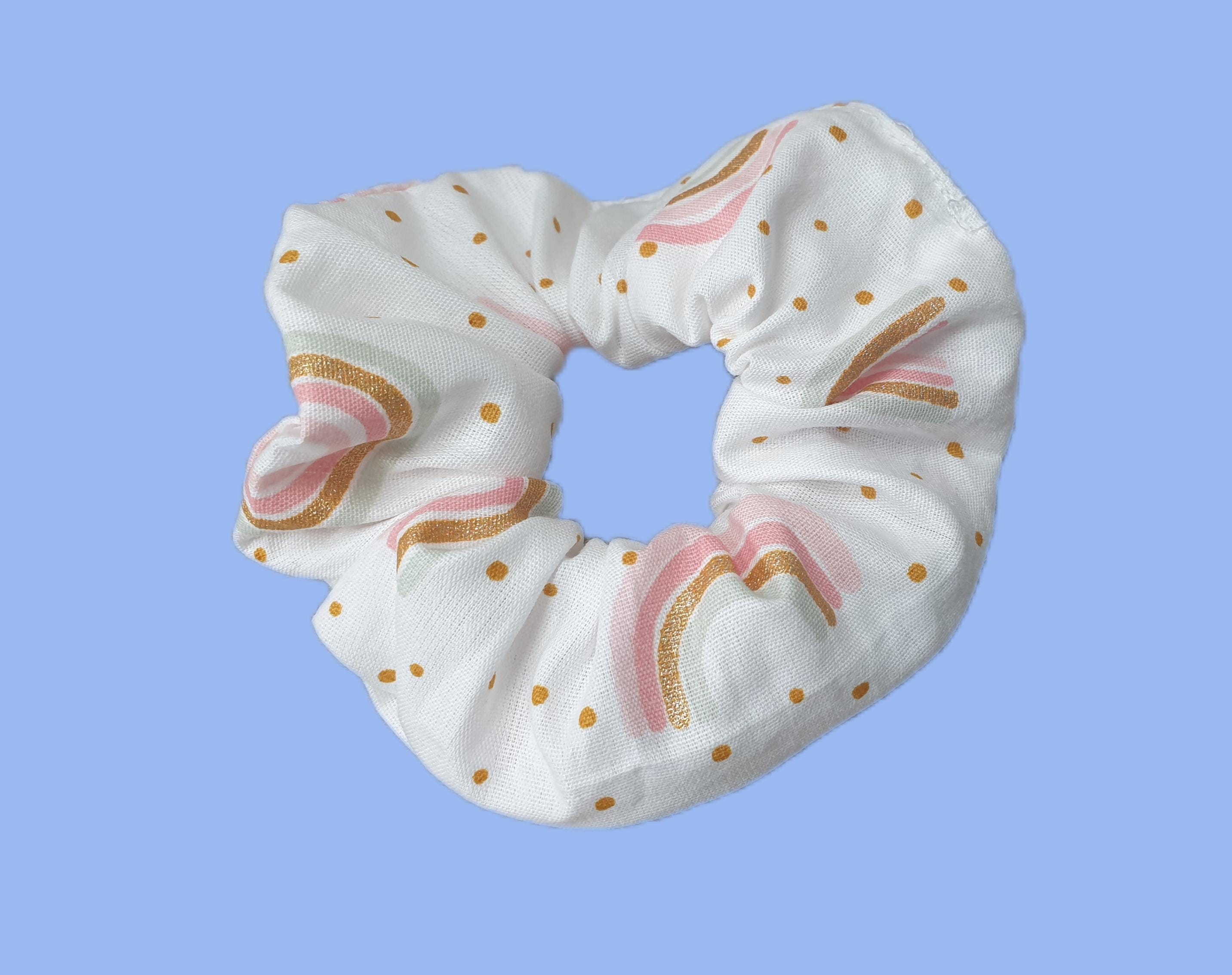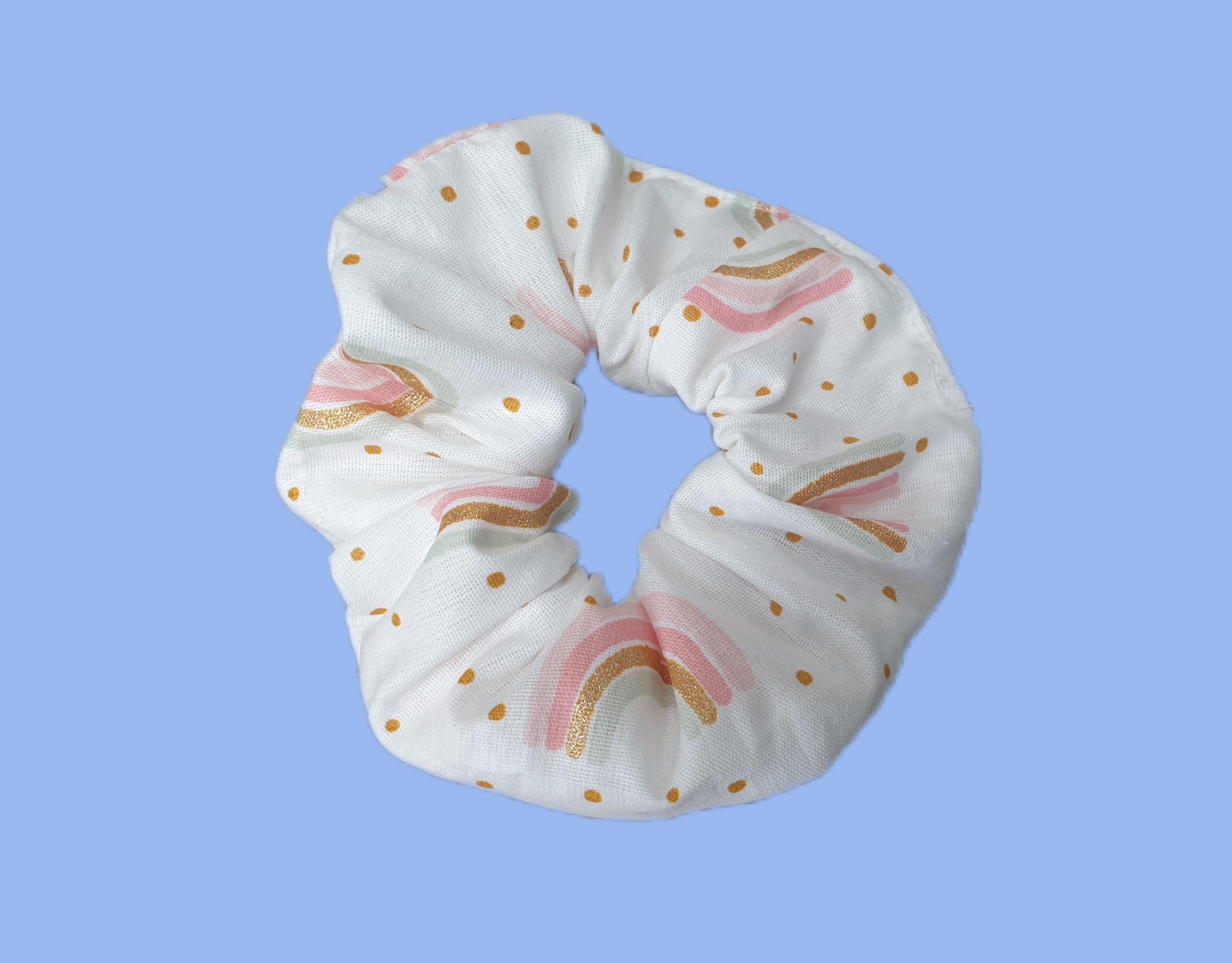 Haargummi mit kleinen Regenbogen in gold rosa weiß passend zu einigen Schultüten im Shop