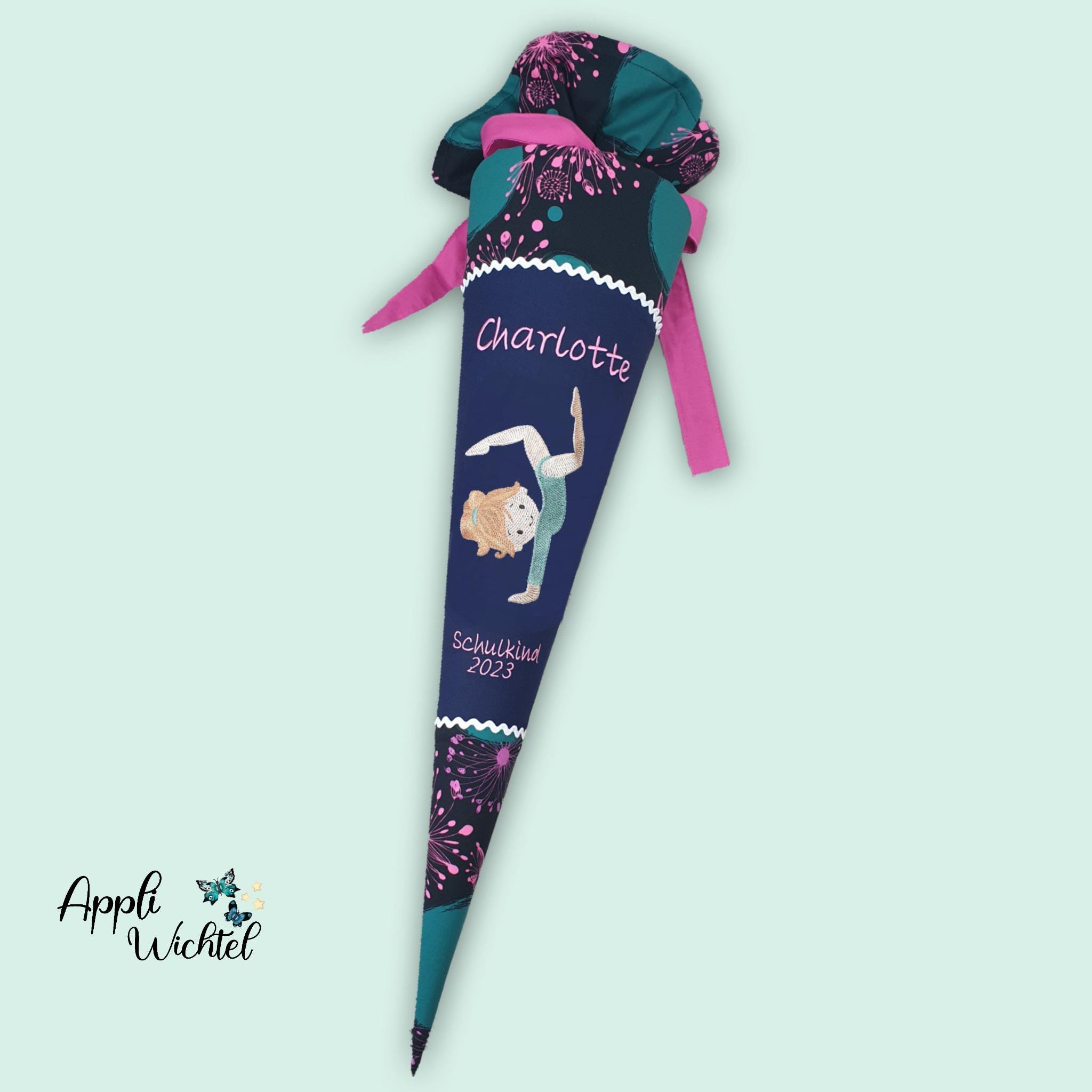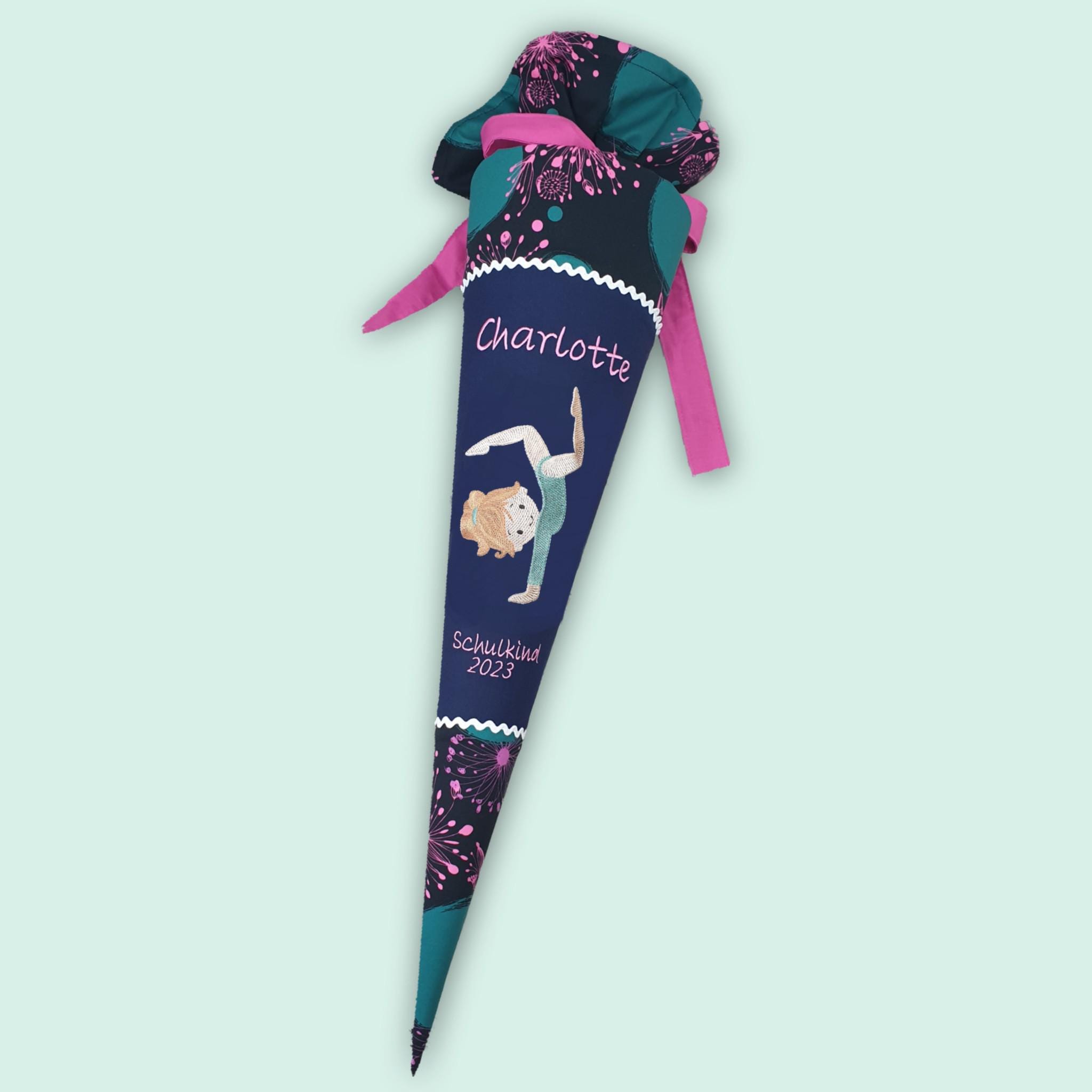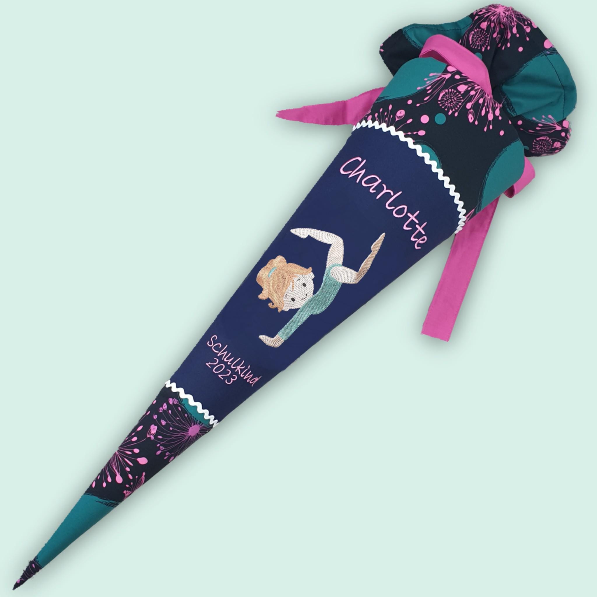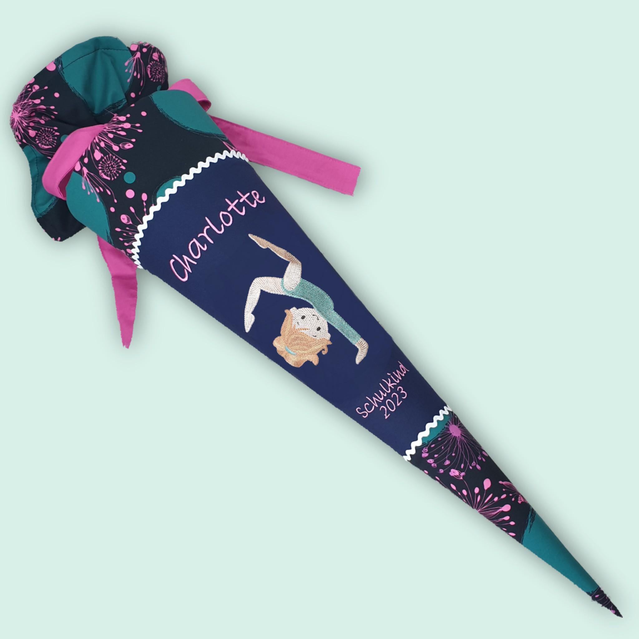 Schultüte mit Turnerin und Namen farblich auf den Korallbär Schulranzen abgestimmt.