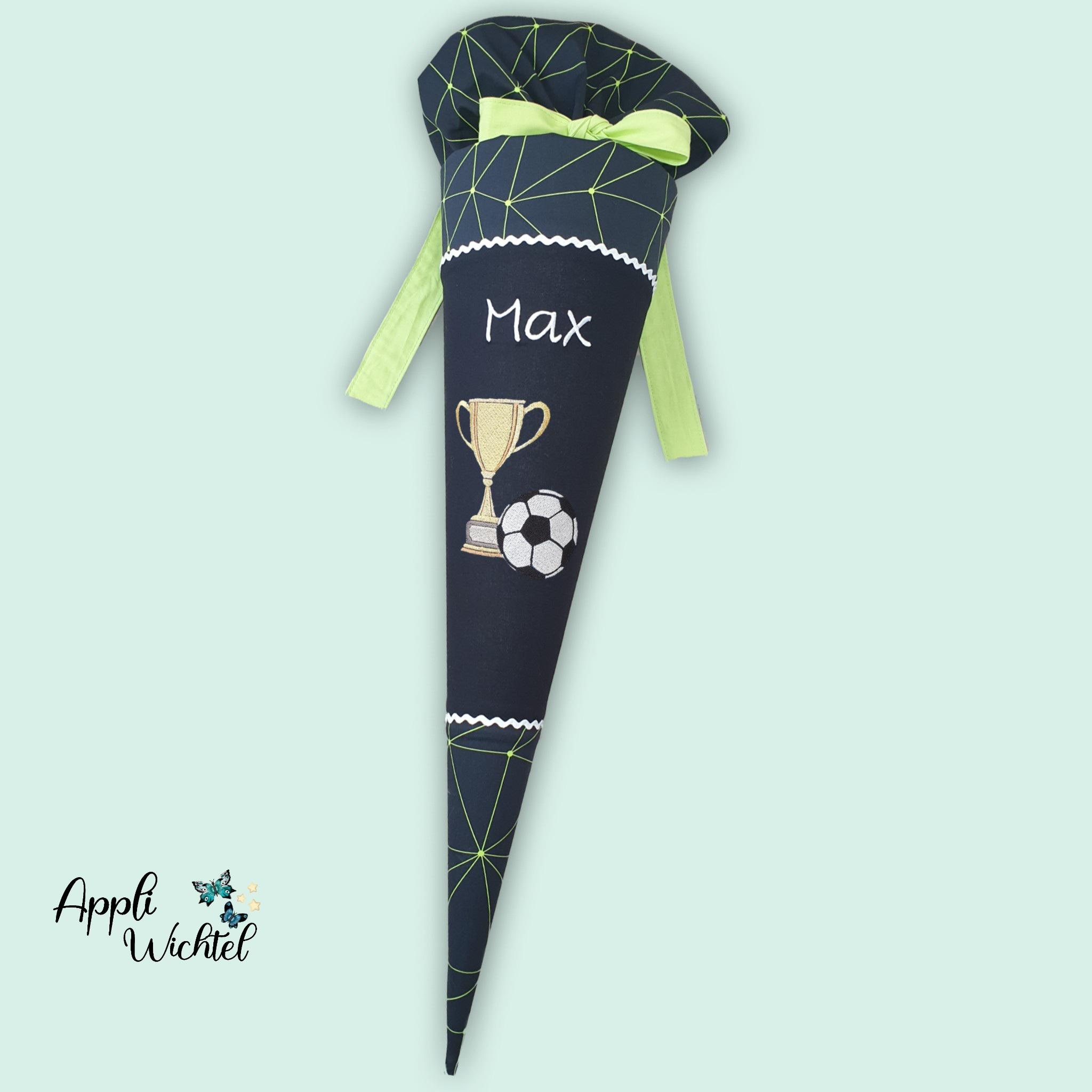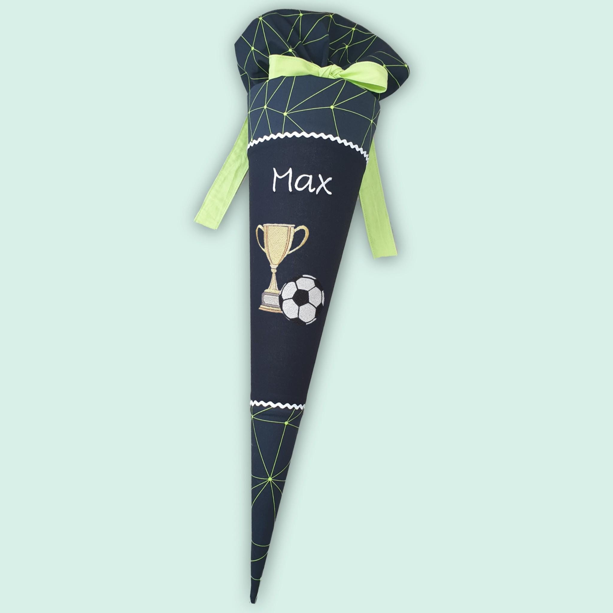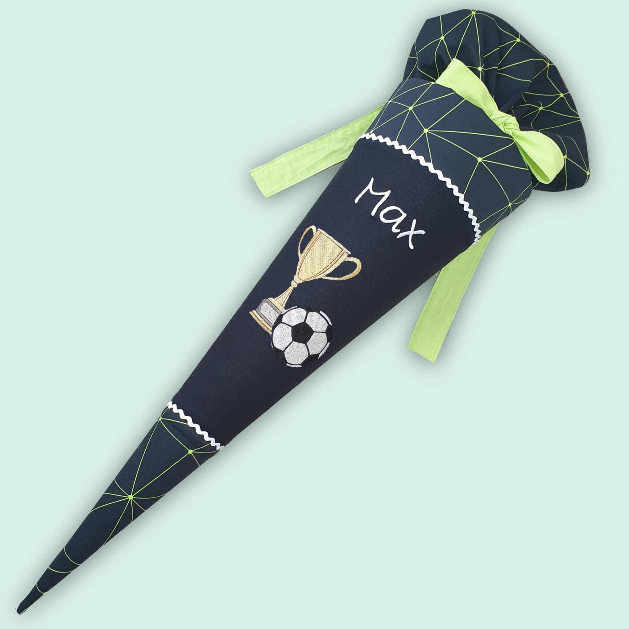 Schultüte mit Fussball Pokal und Namen farblich auf den Cybär Race Schulranzen abgestimmt.