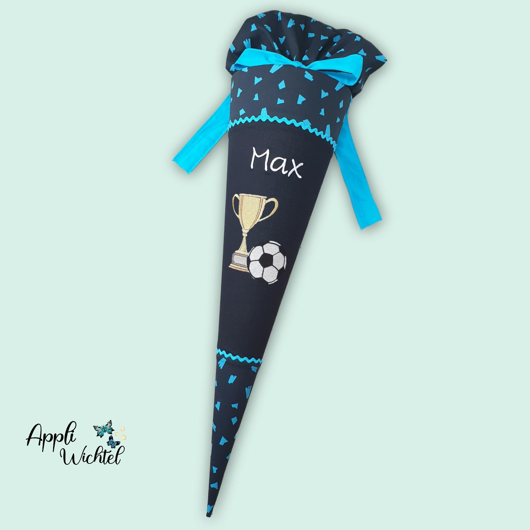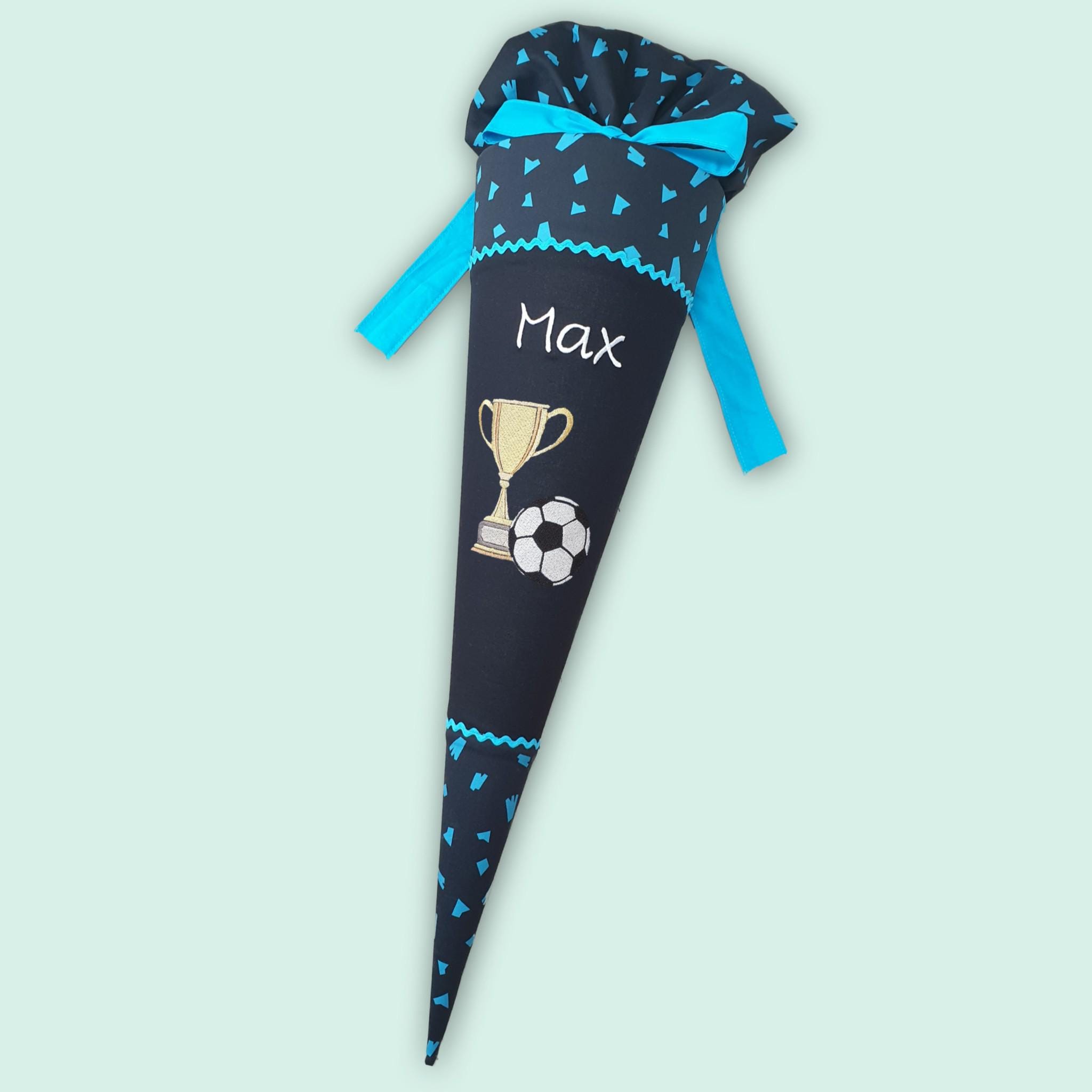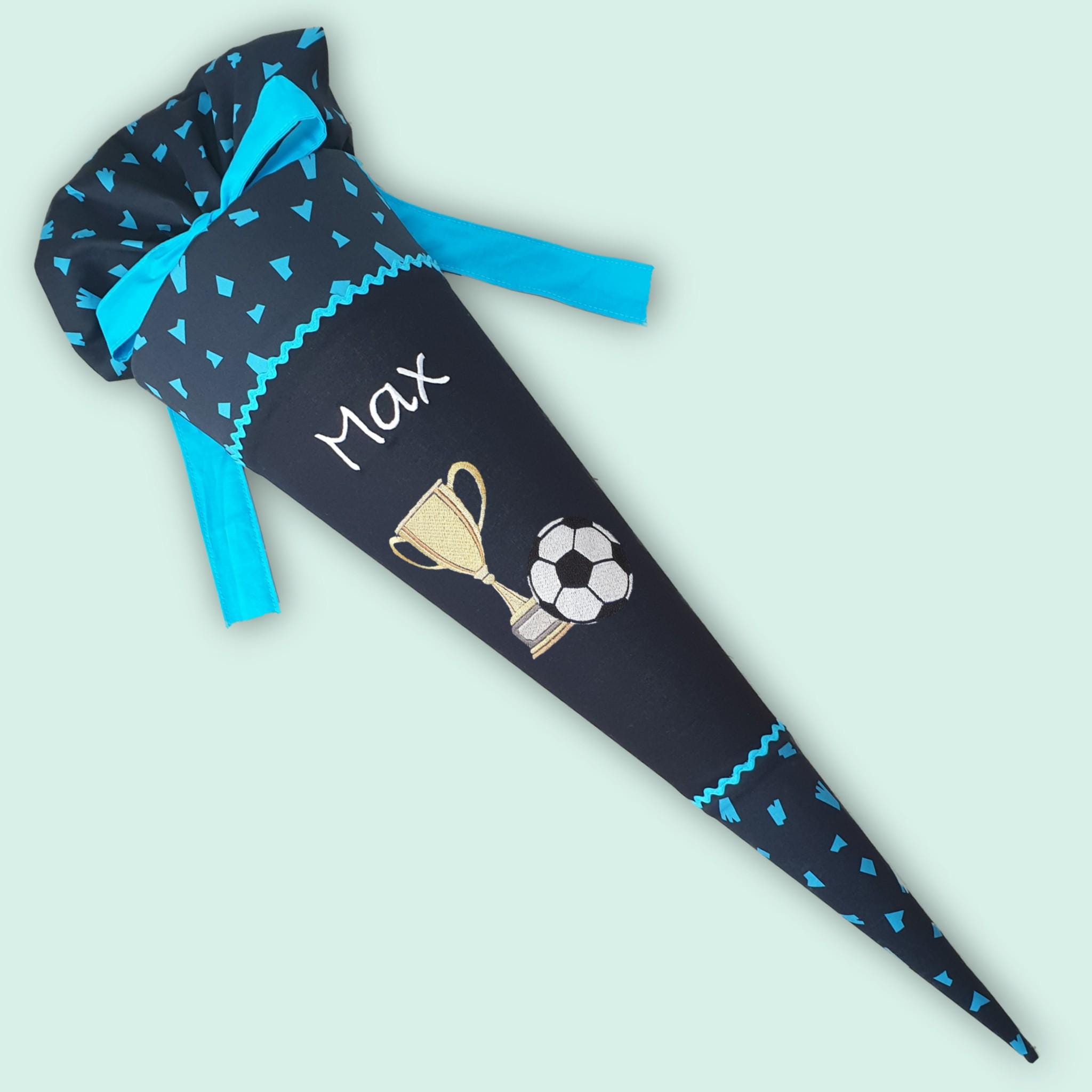Schultüte mit Fussball Pokal und Namen farblich auf den Verfolgbärjagd Schulranzen abgestimmt.