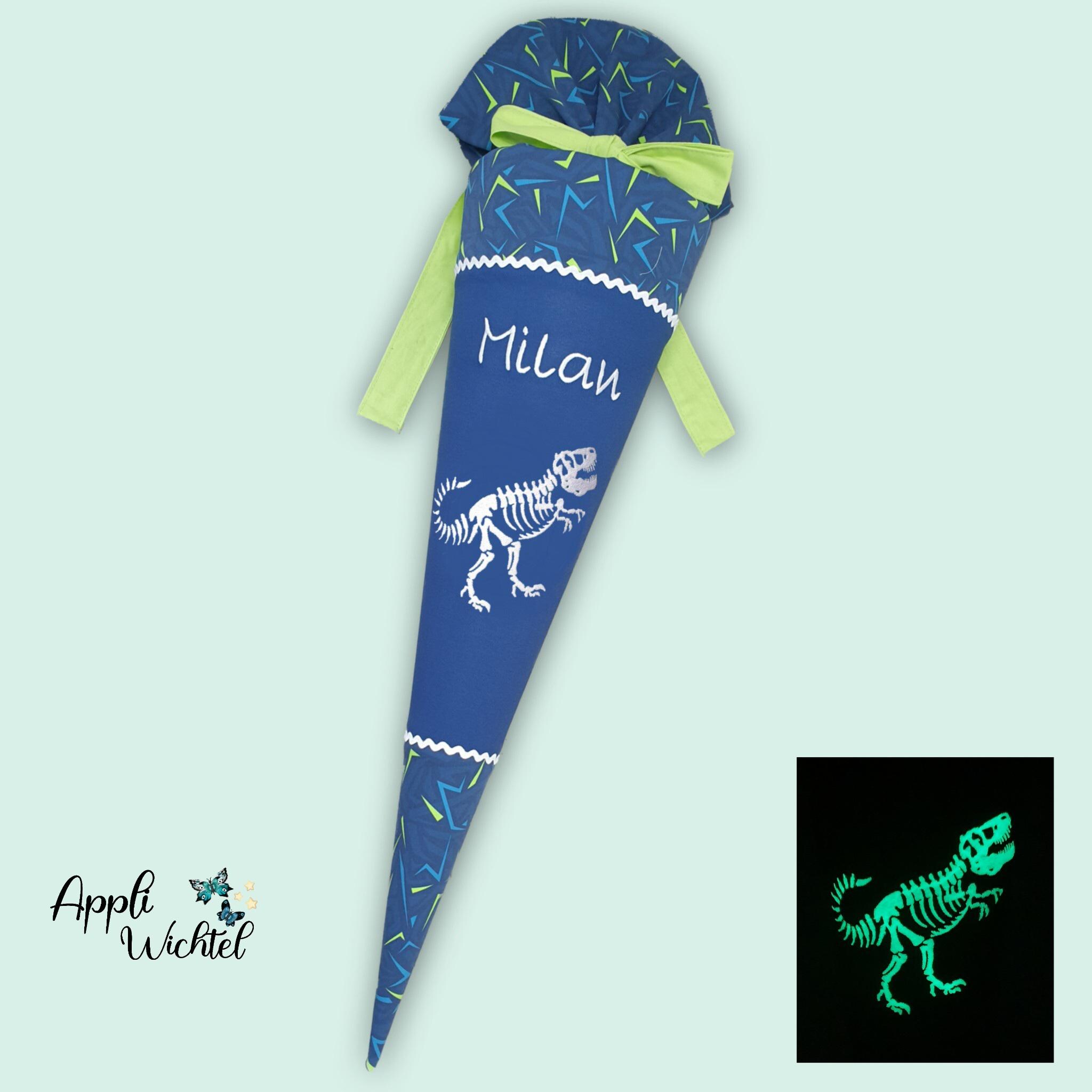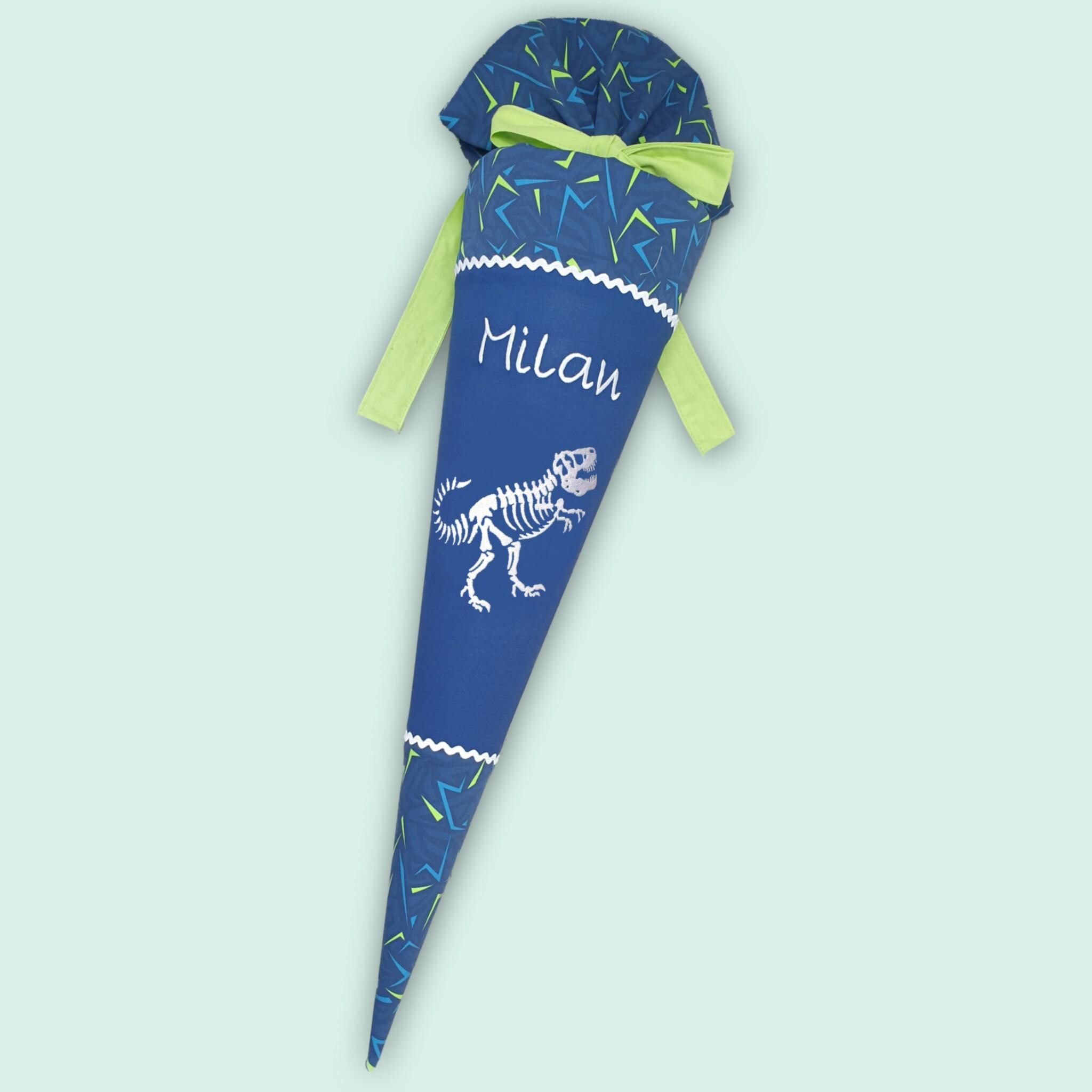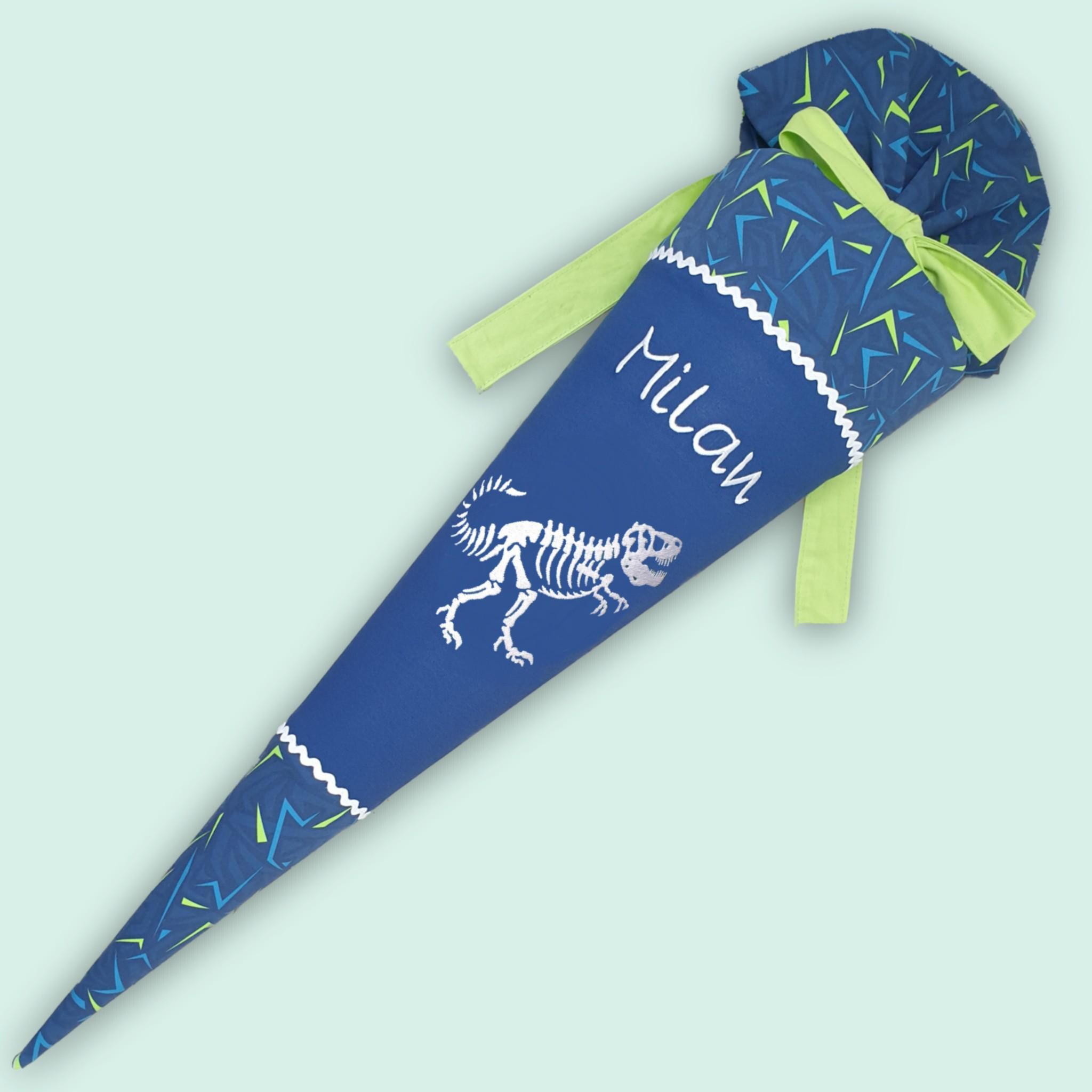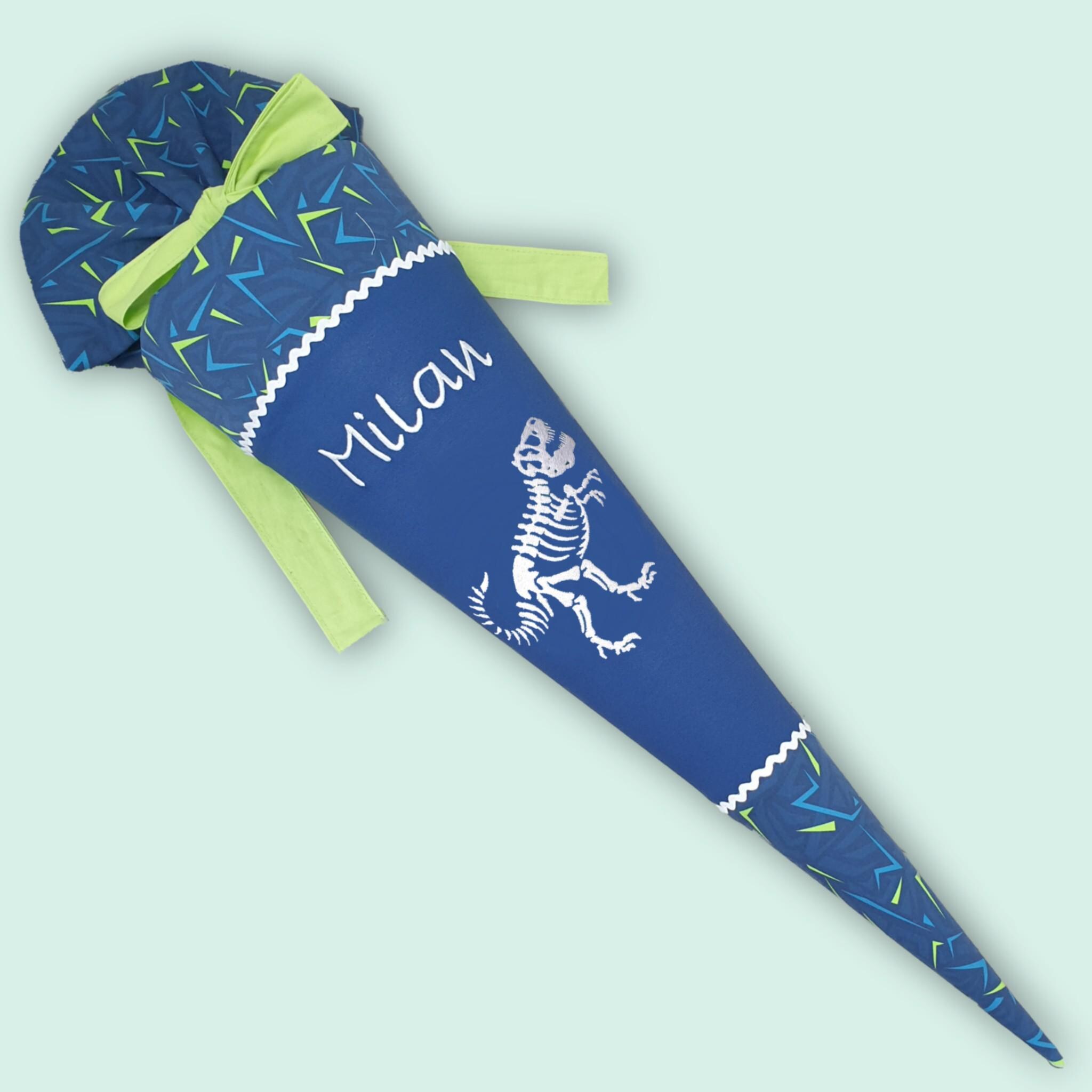 Schultüte mit Dinosaurier und Namen farblich auf den Spitzenreitbär Schulranzen abgestimmt.