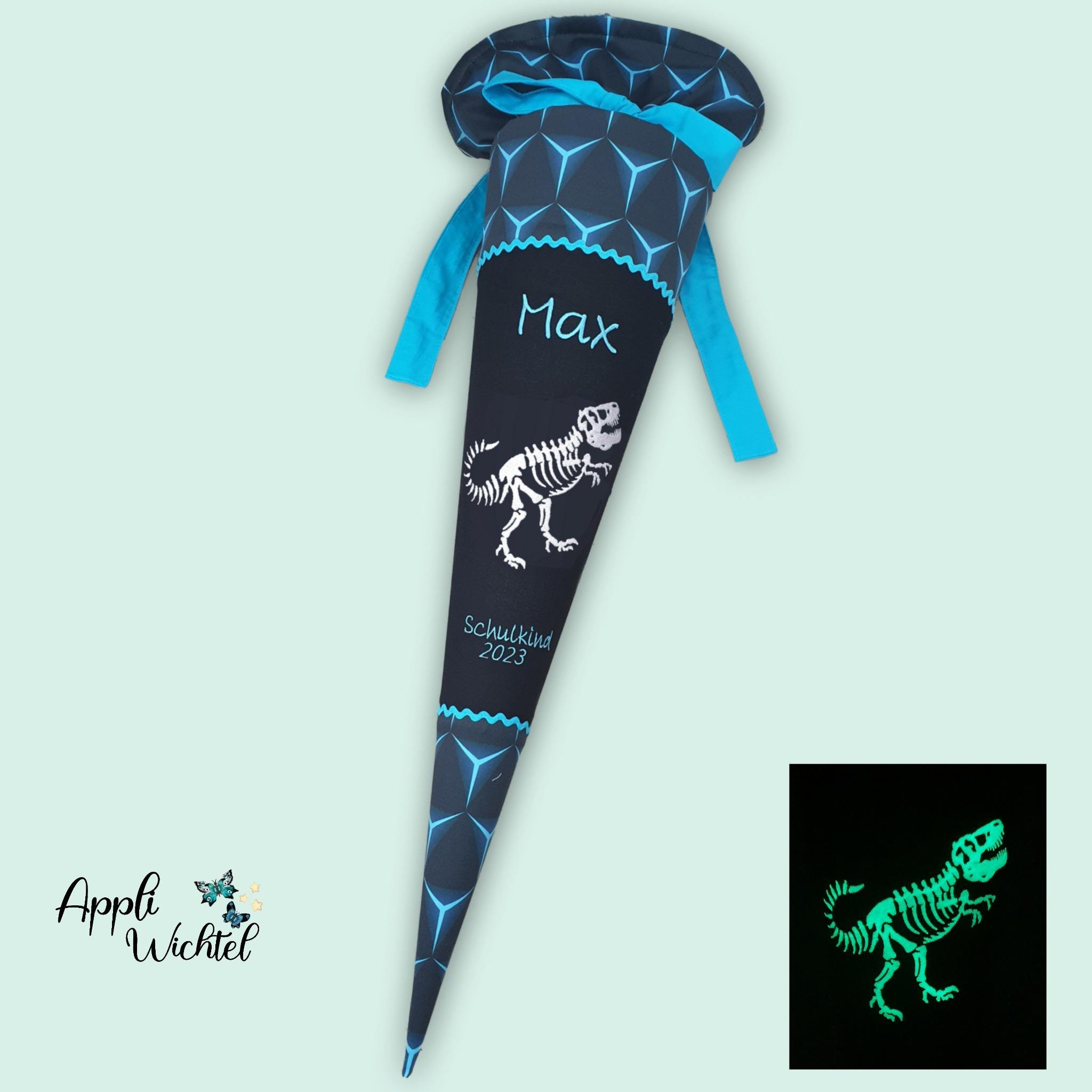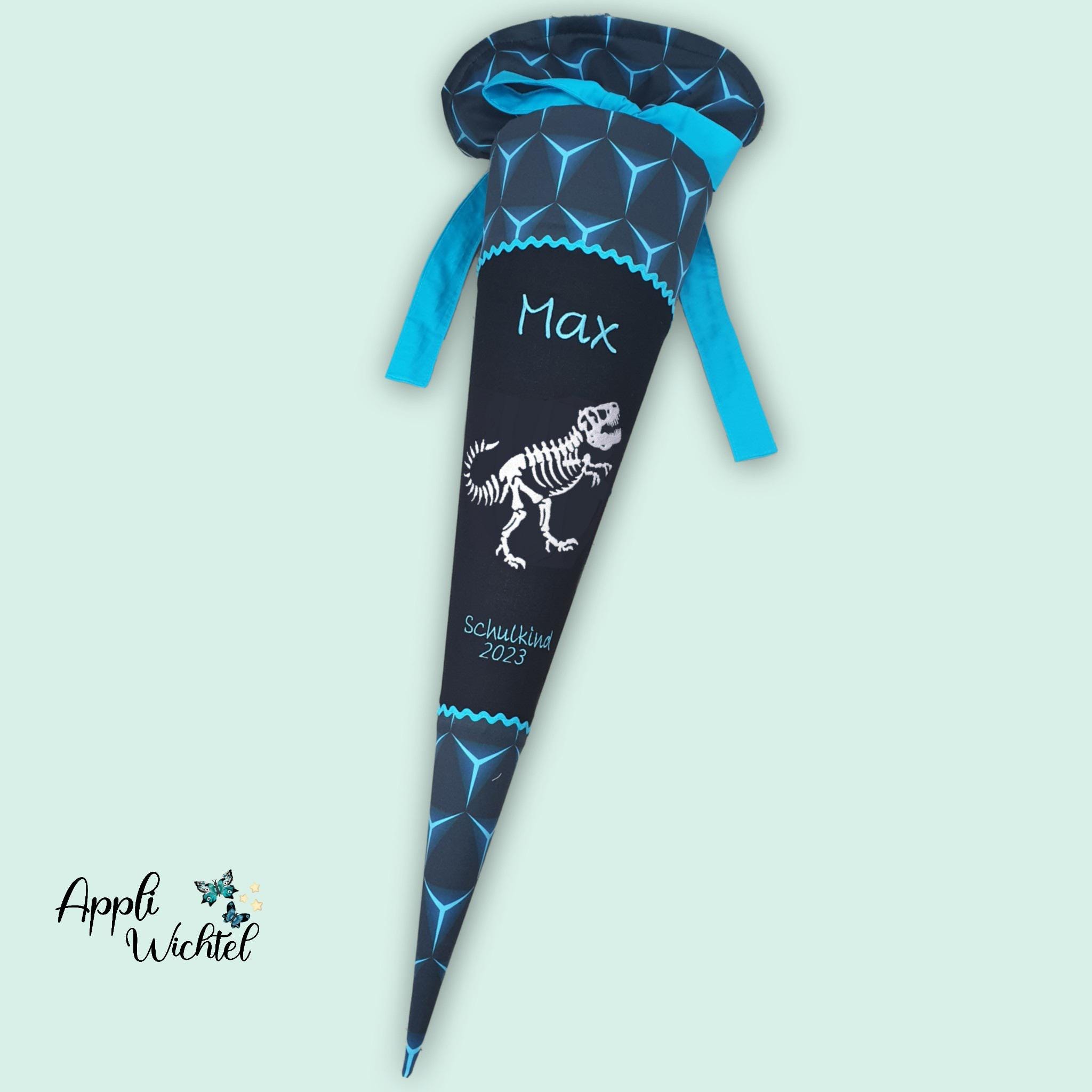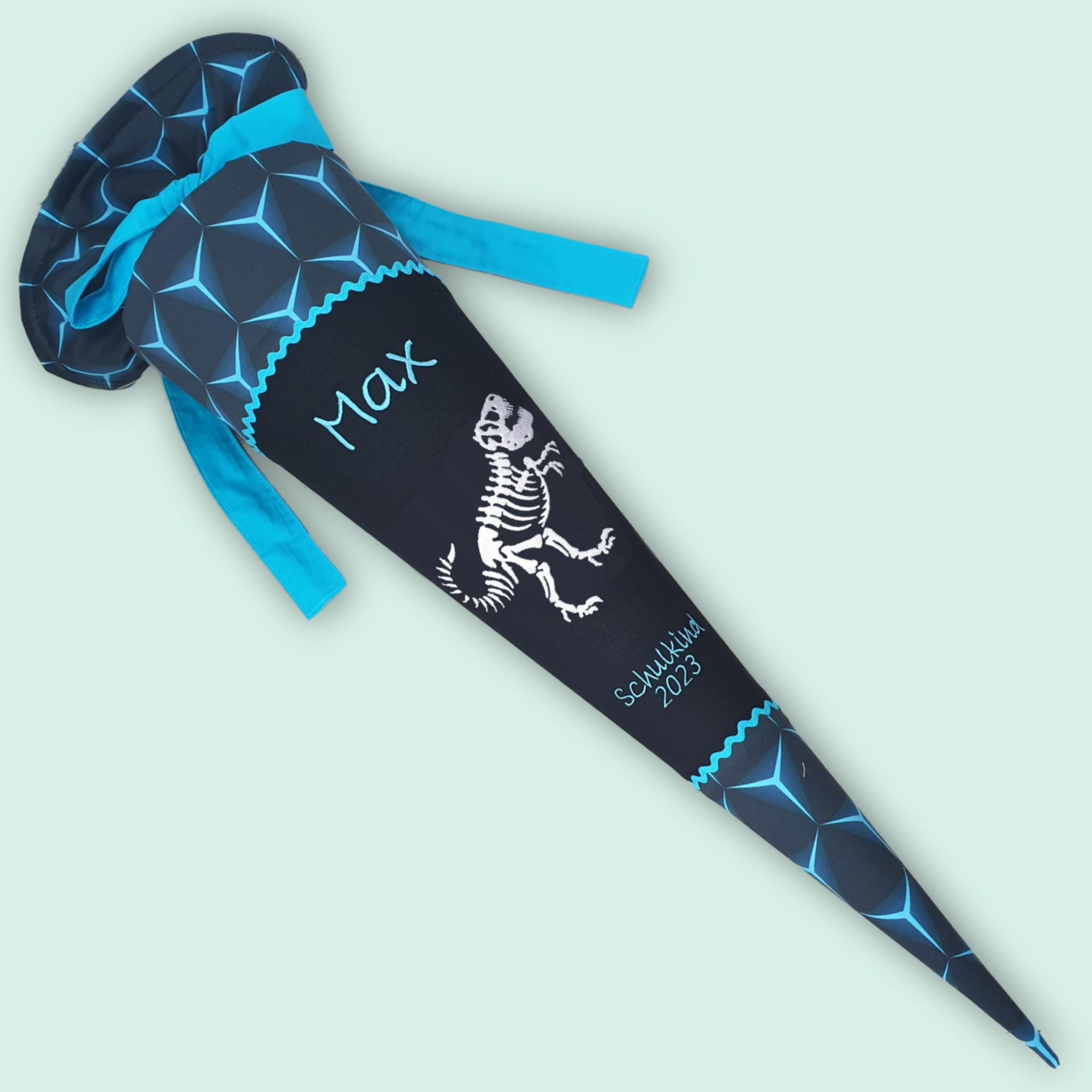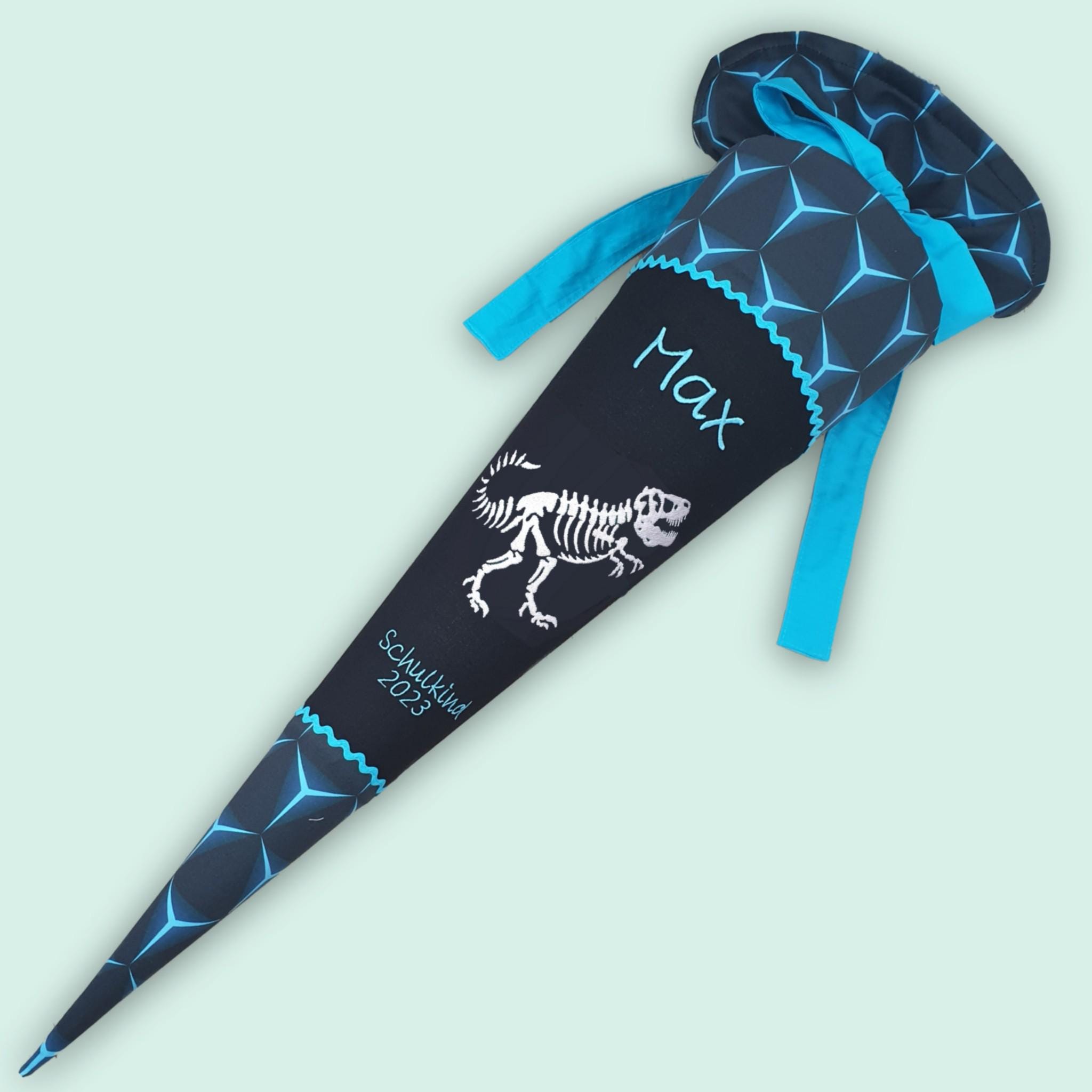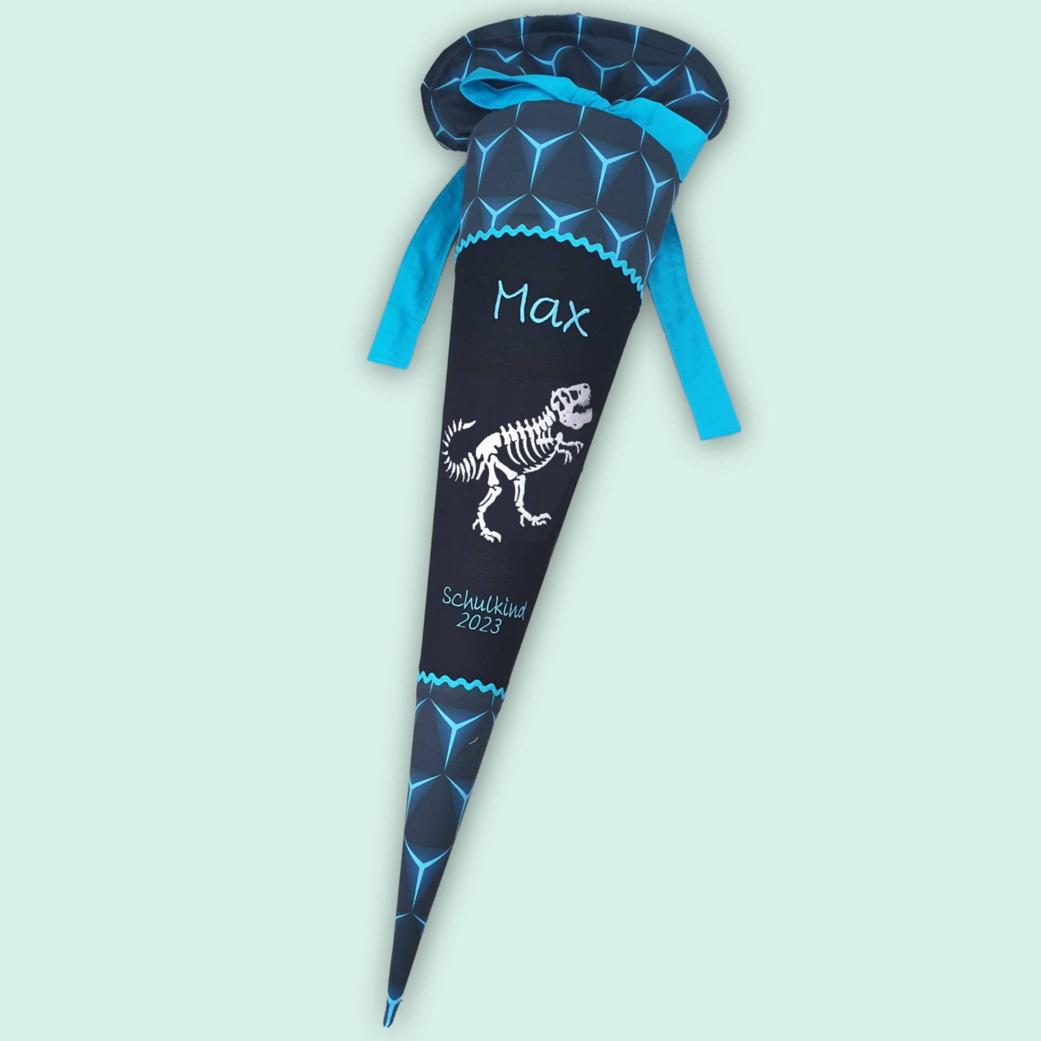 Schultüte mit Dino und Namen farblich auf den Shark Dexter Schulranzen abgestimmt.