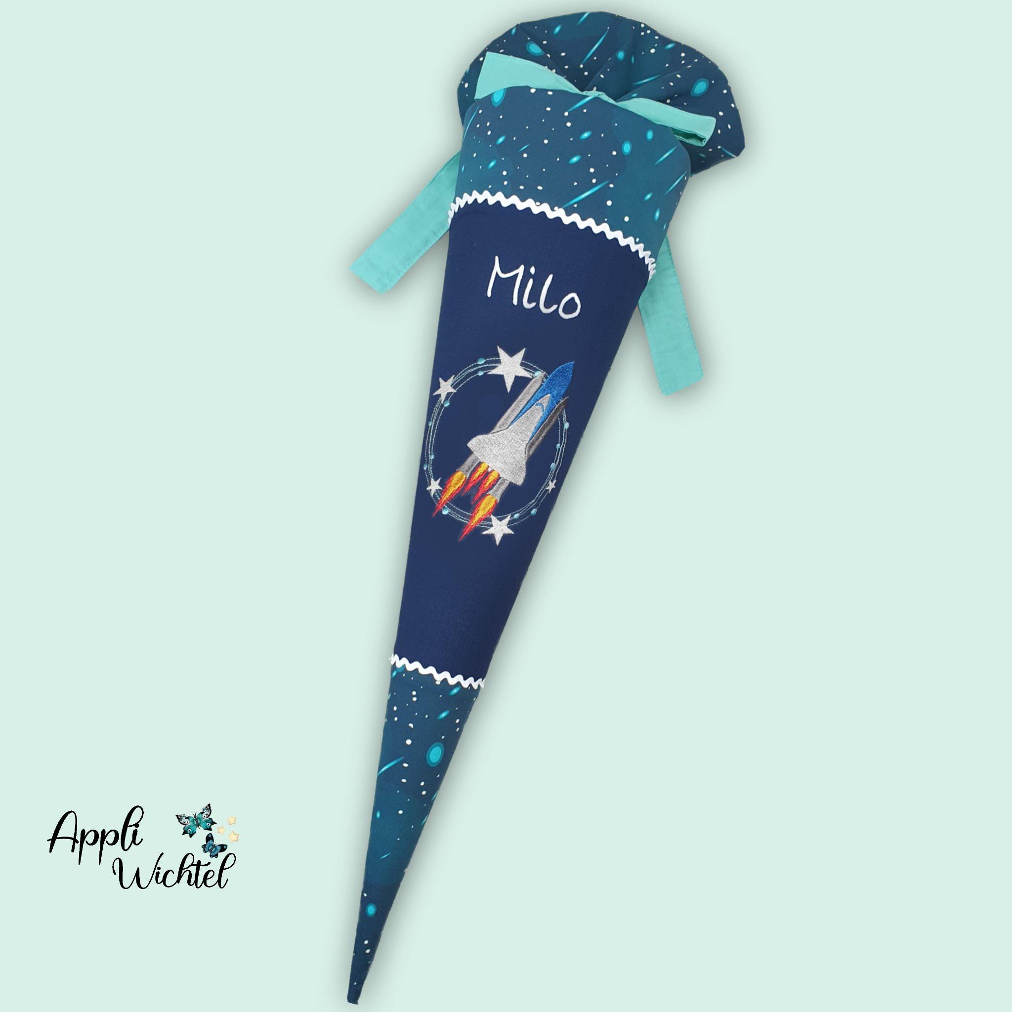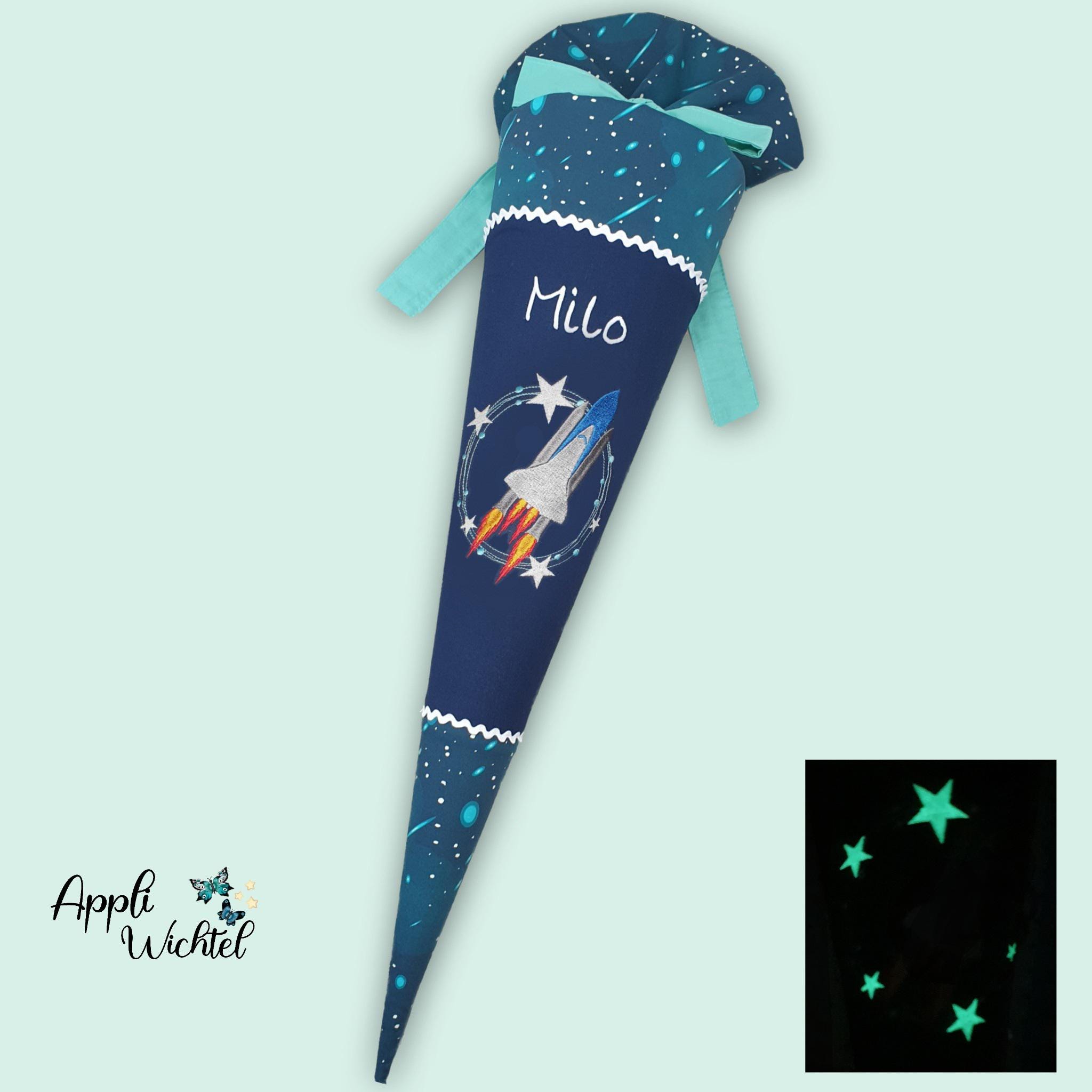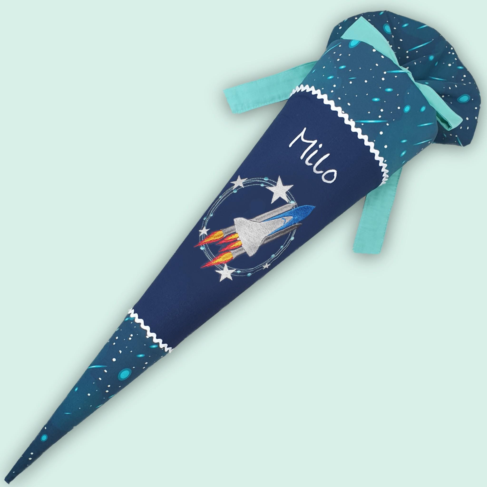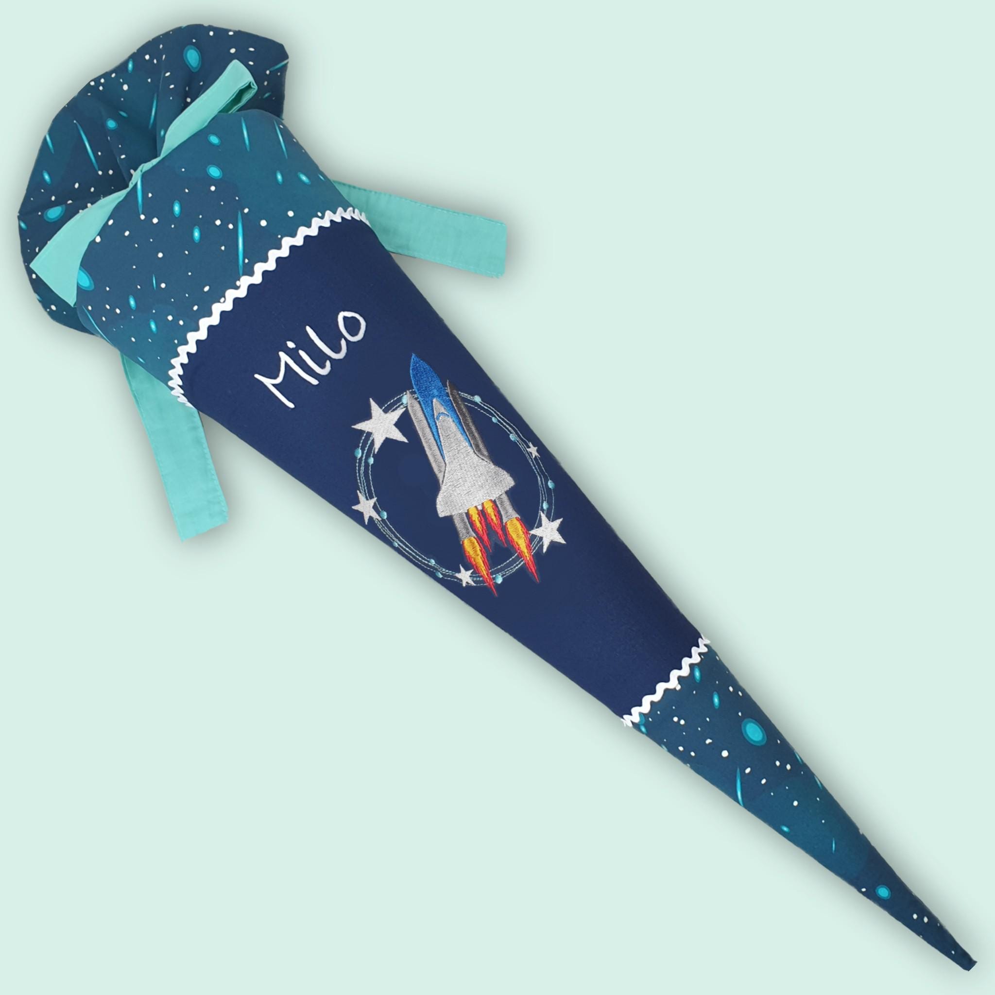 Schultüte mit einer Rakete und Namen farblich auf den Ergobag RaumfahrBär Schulranzen abgestimmt.