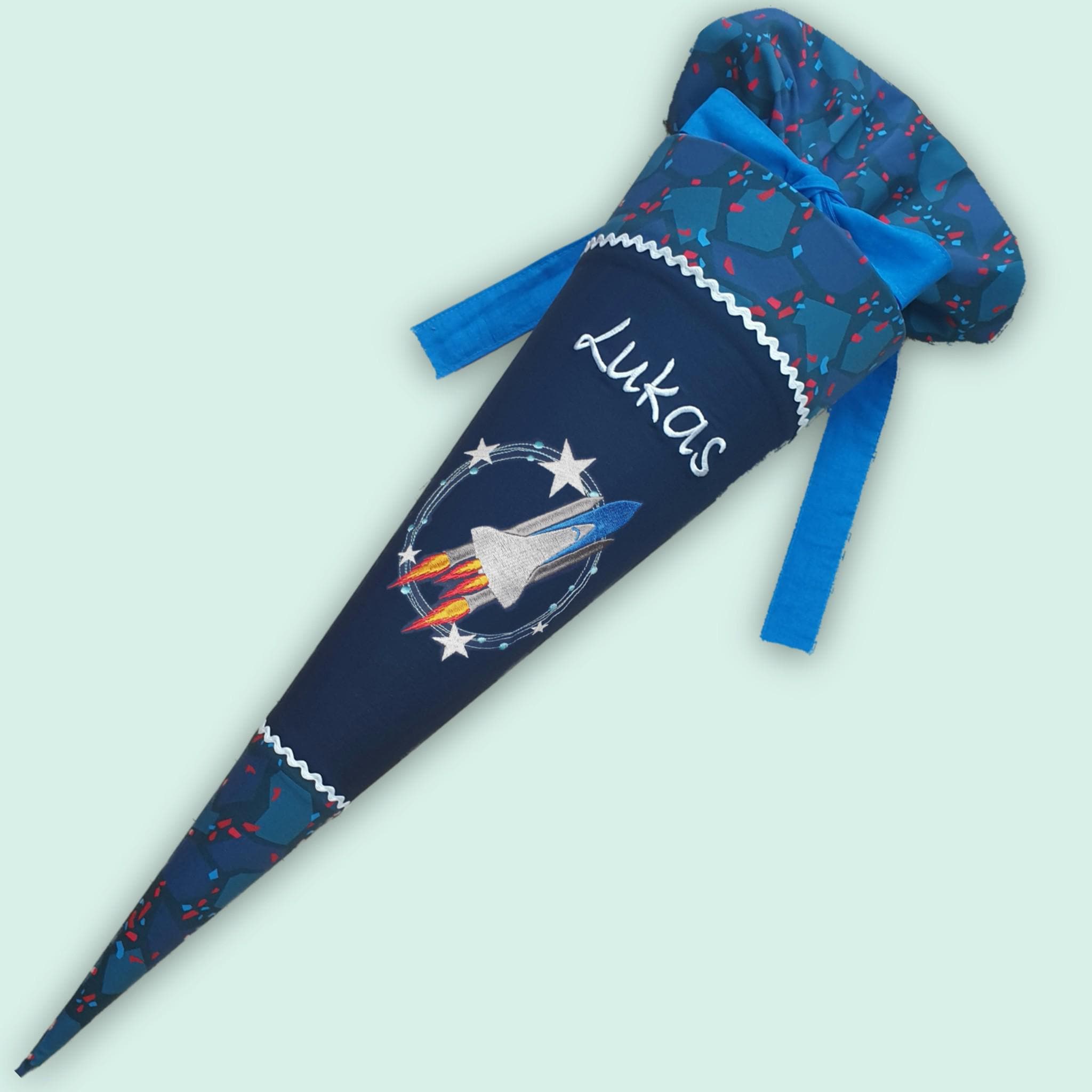 Schultüte mit Raumschiff und Namen farblich auf den step by step Tractor Freddy Schulranzen abgestimmt.