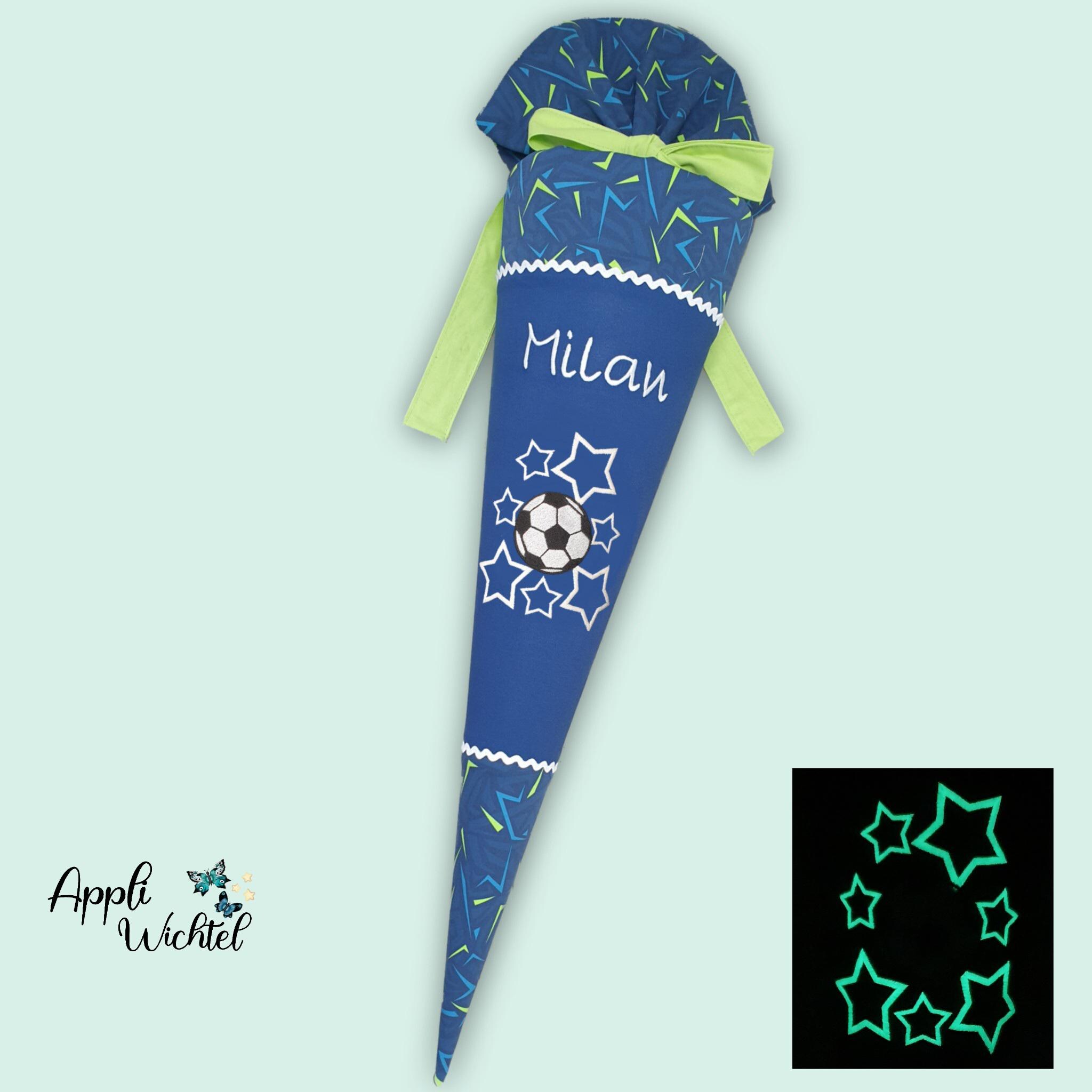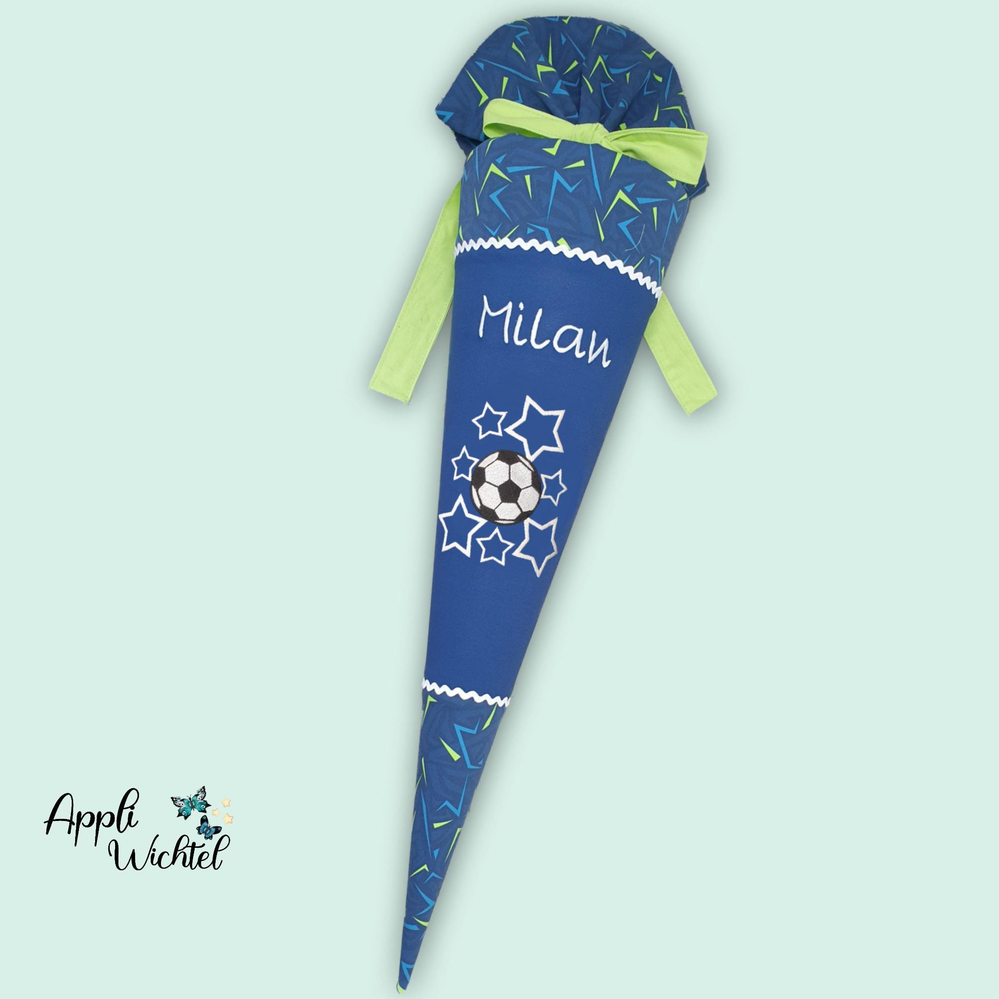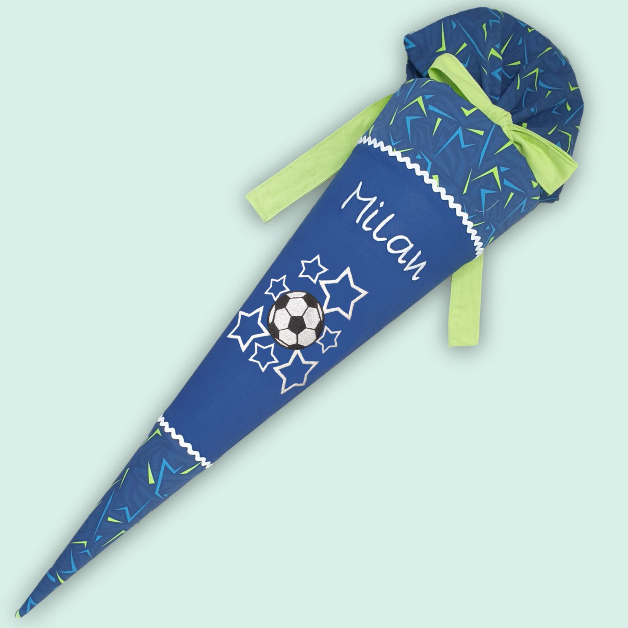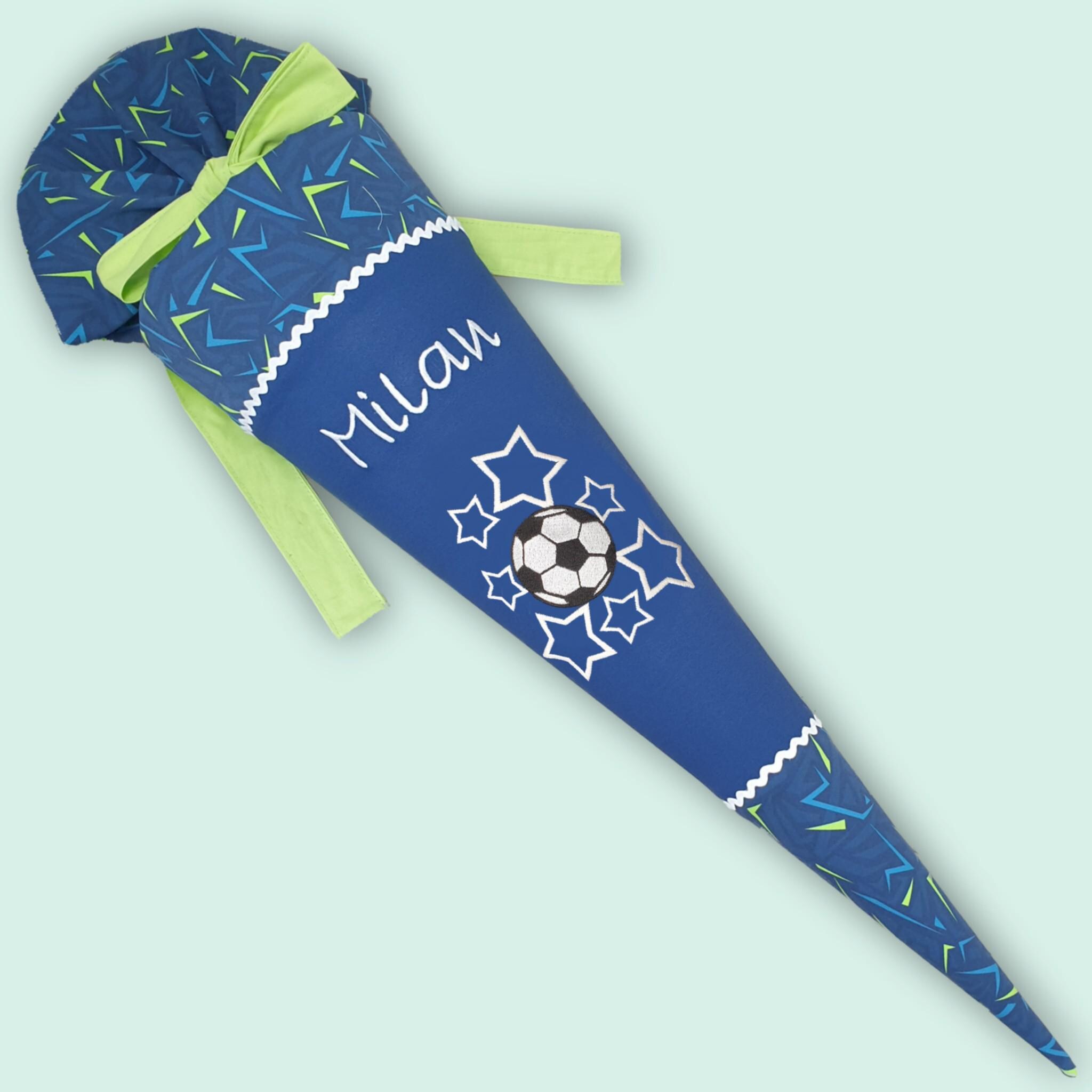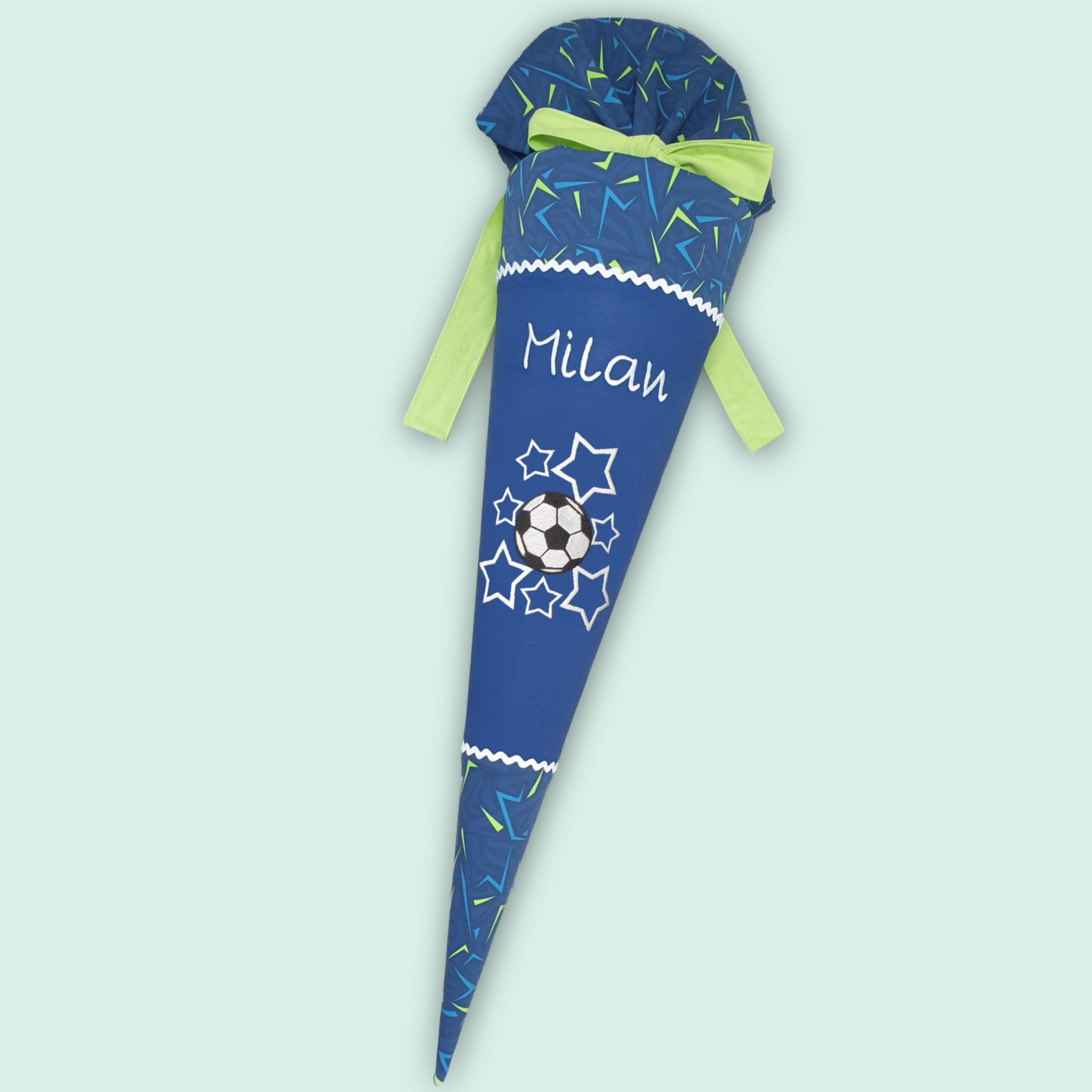 Schultüte mit Fussball und Namen farblich auf den Spitzenreitbär Schulranzen abgestimmt.