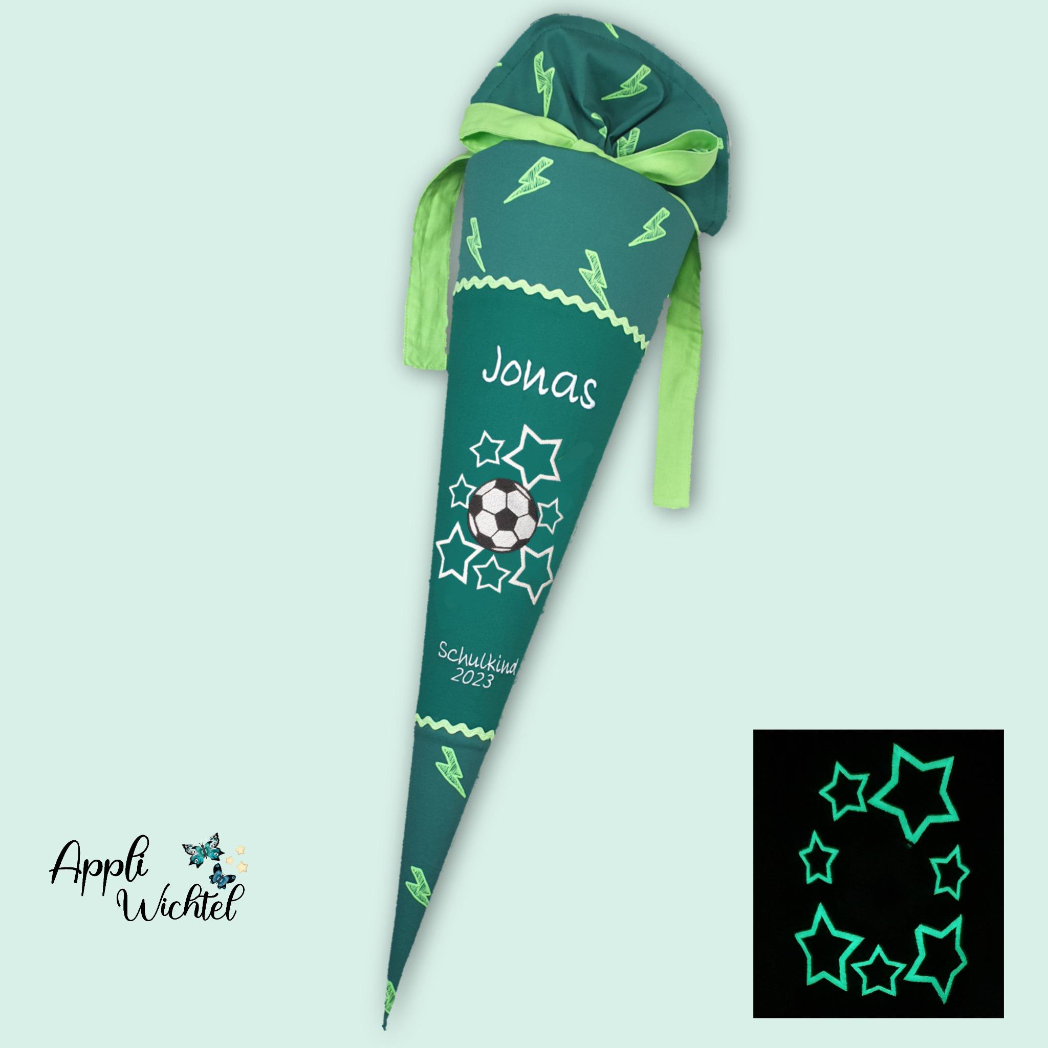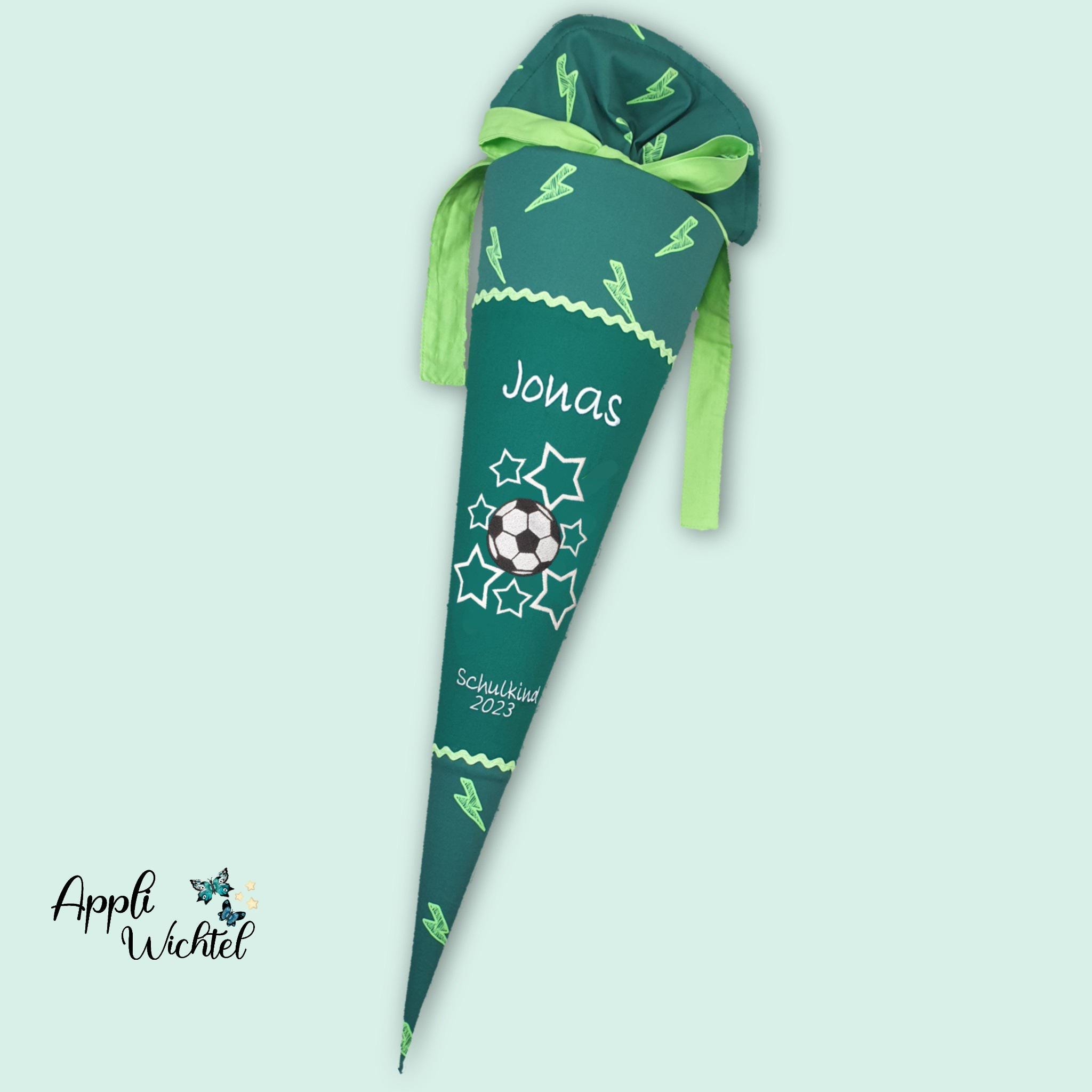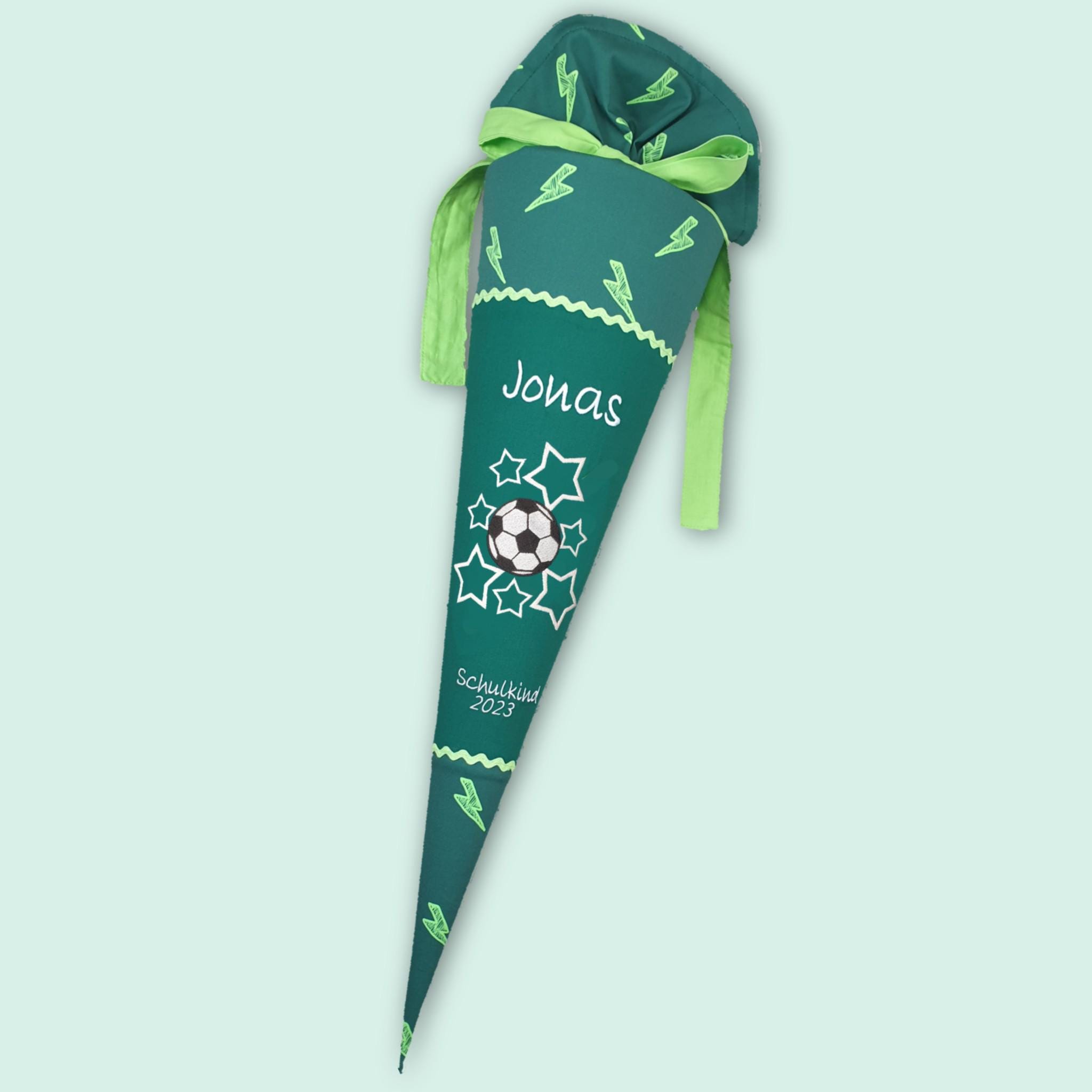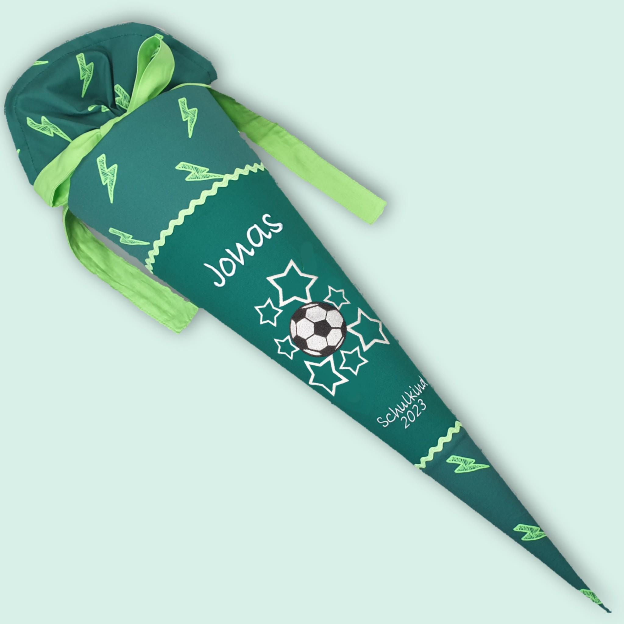 Schultüte mit Fusball und Namen farblich auf den Ergobag Bärtastisch Schulranzen abgestimmt.