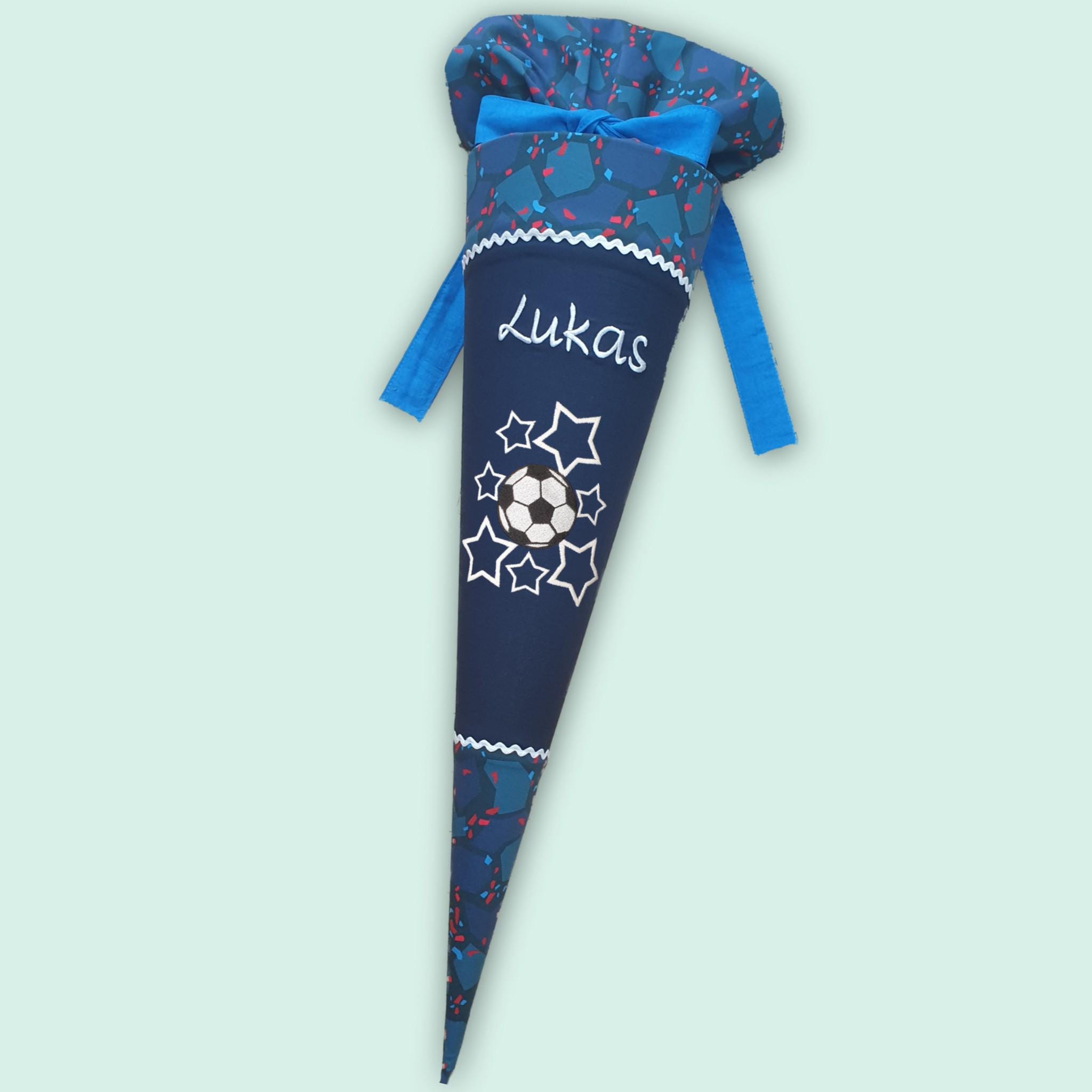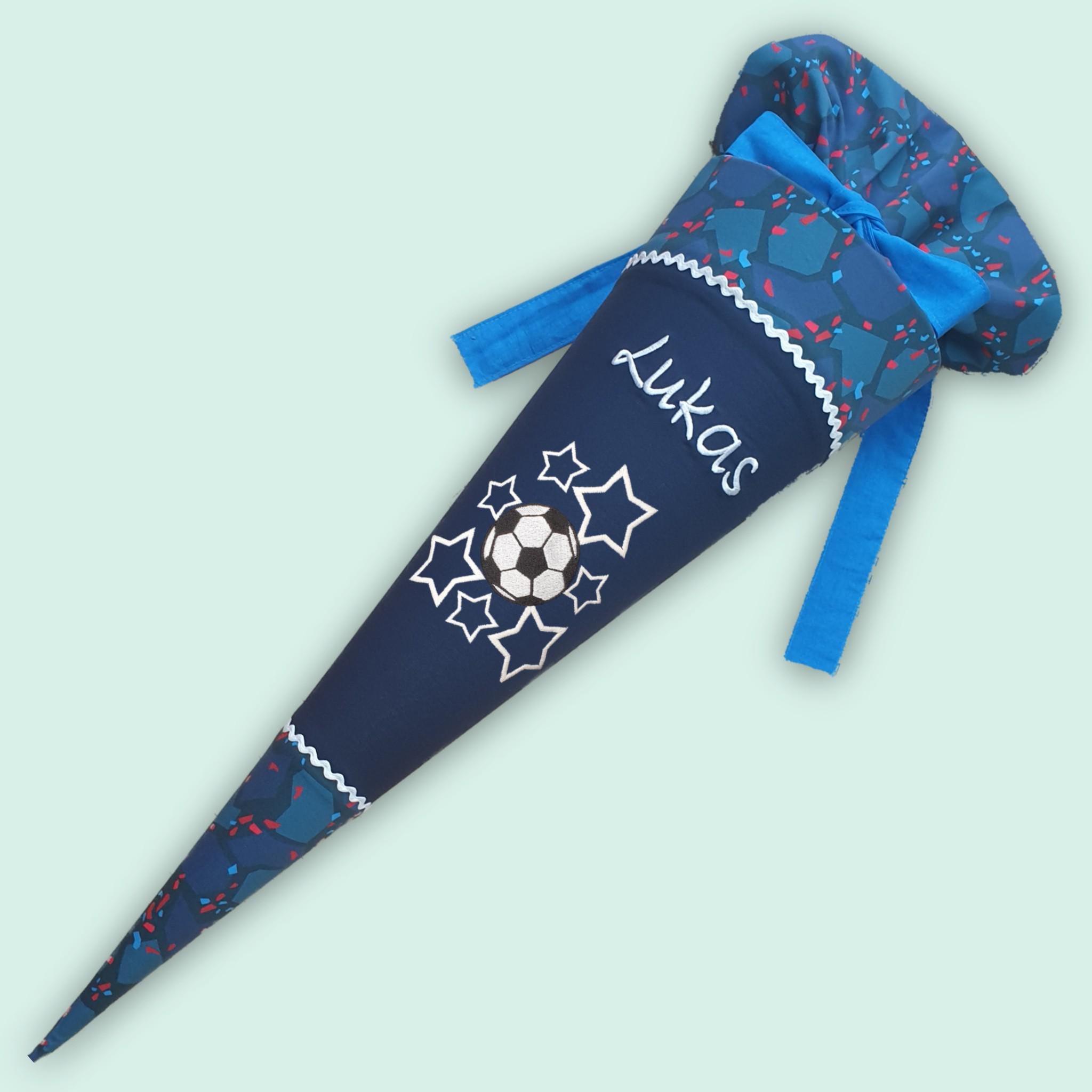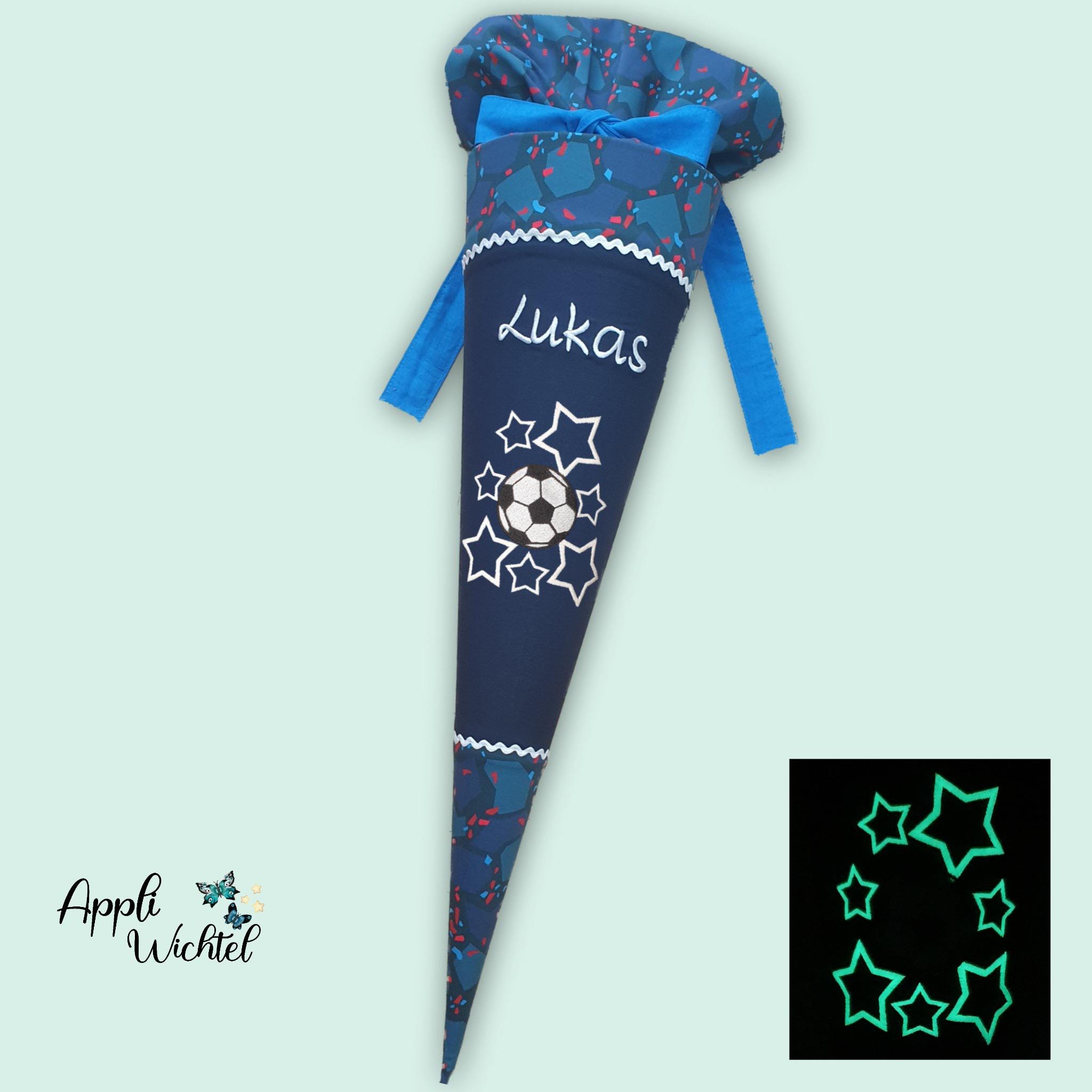 Schultüte mit Fussball (Sterne leuchten im Dunkeln) und Namen farblich auf den step by step Tractor Freddy Schulranzen abgestimmt.