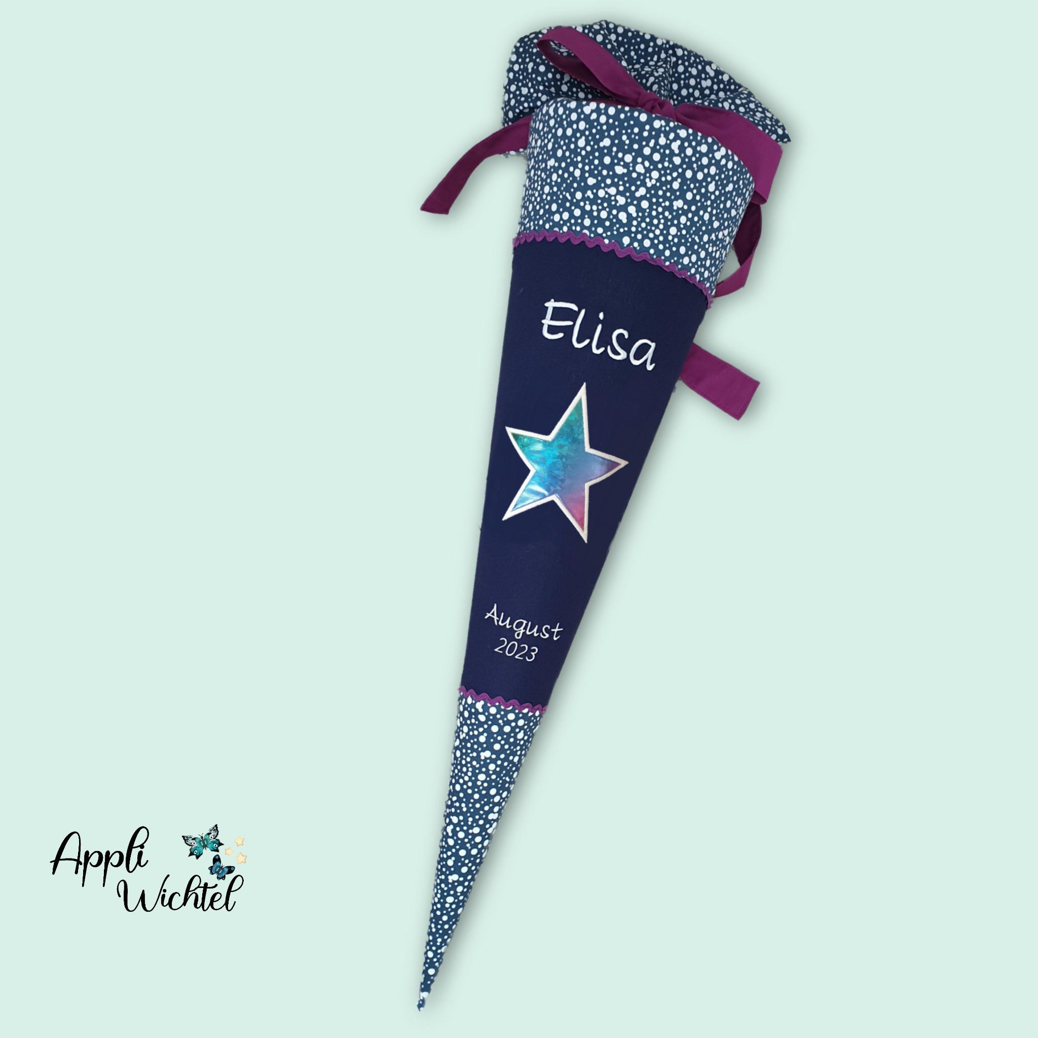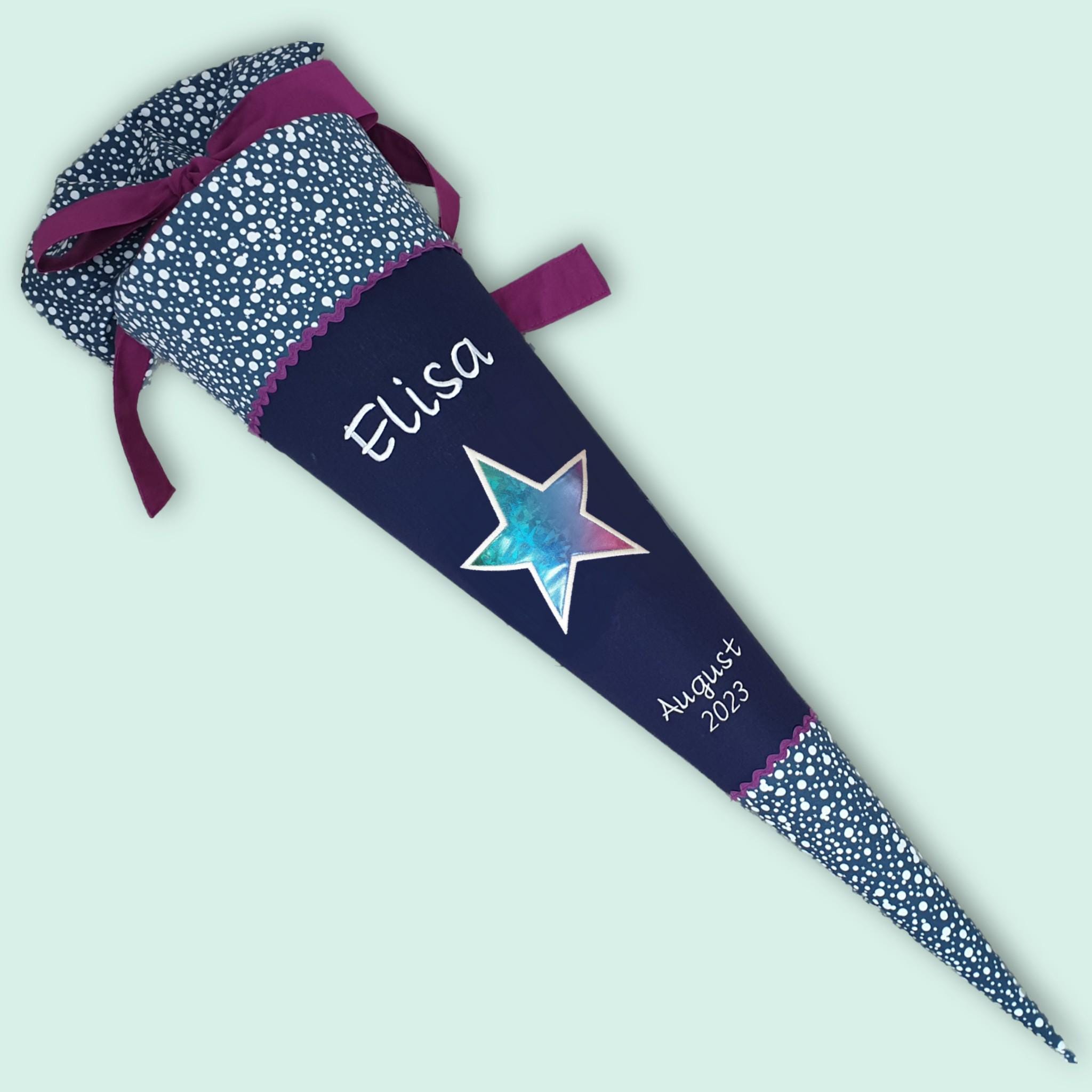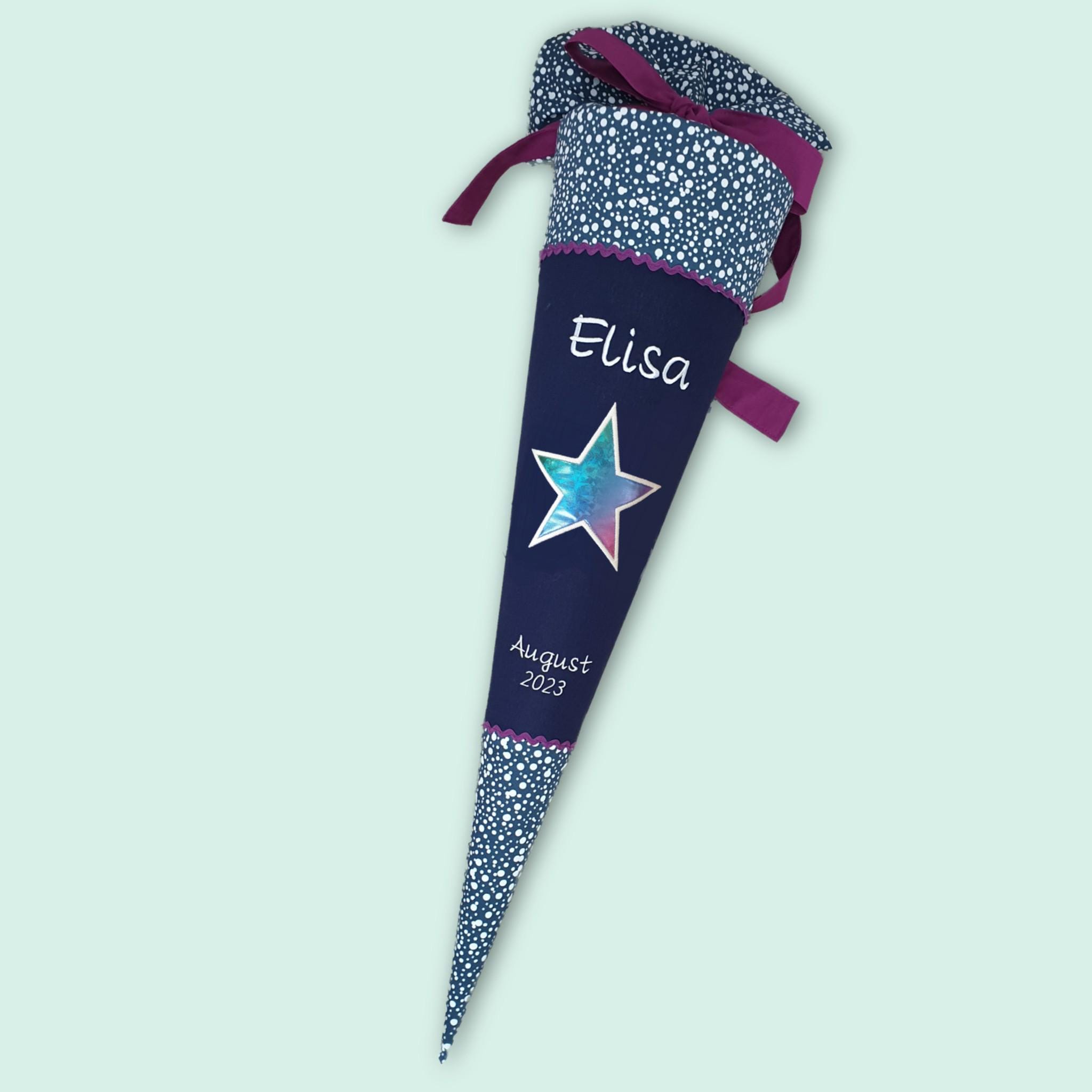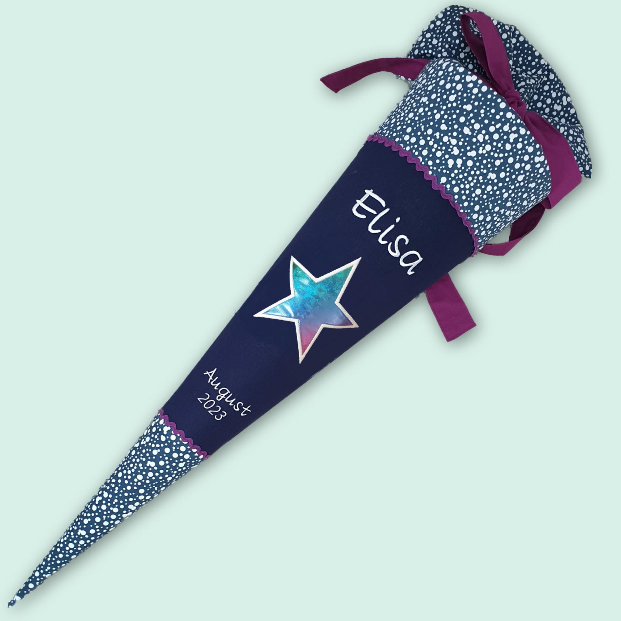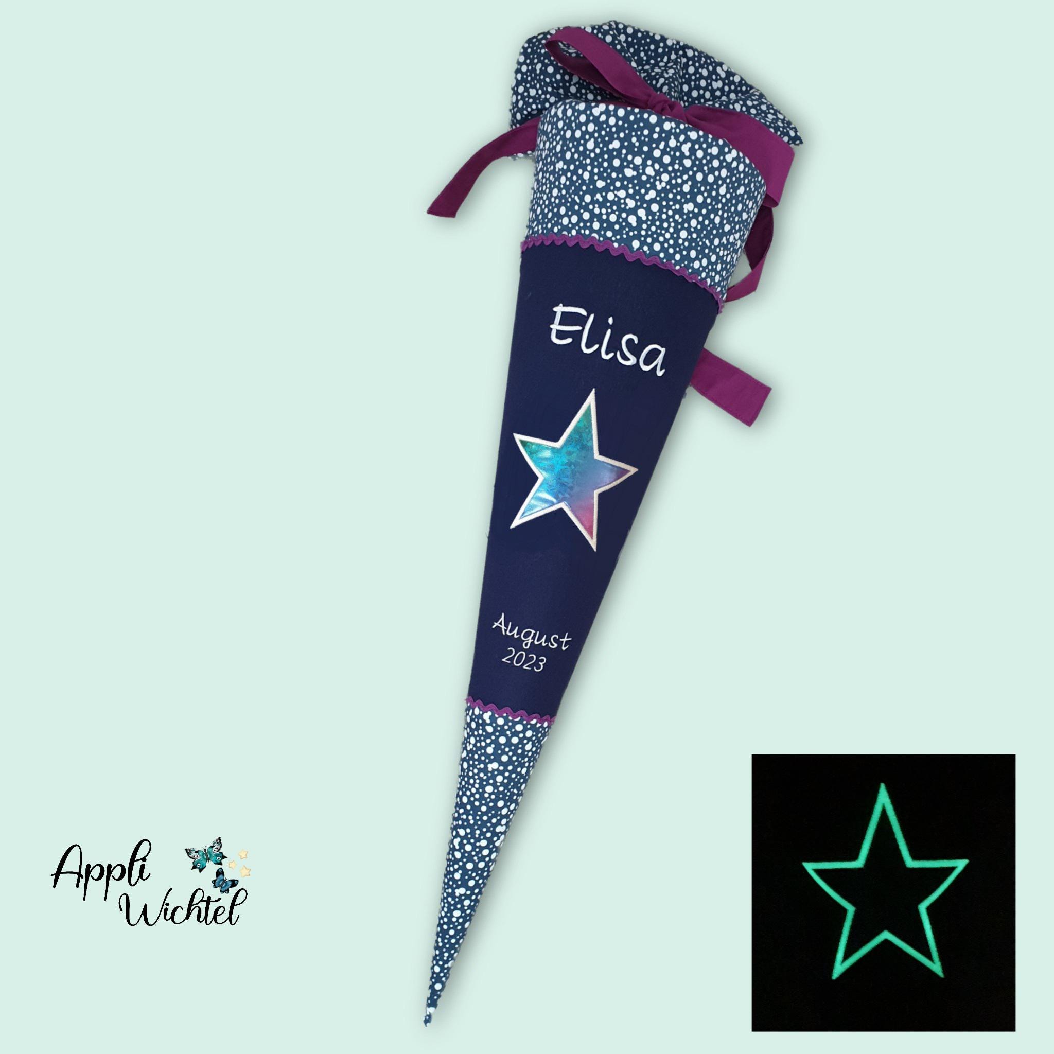 Schultüte mit glitzer Stern (Stern leuchtet im Dunkeln) und Namen farblich auf den Ergobag Bärlaxy Schulranzen abgestimmt.