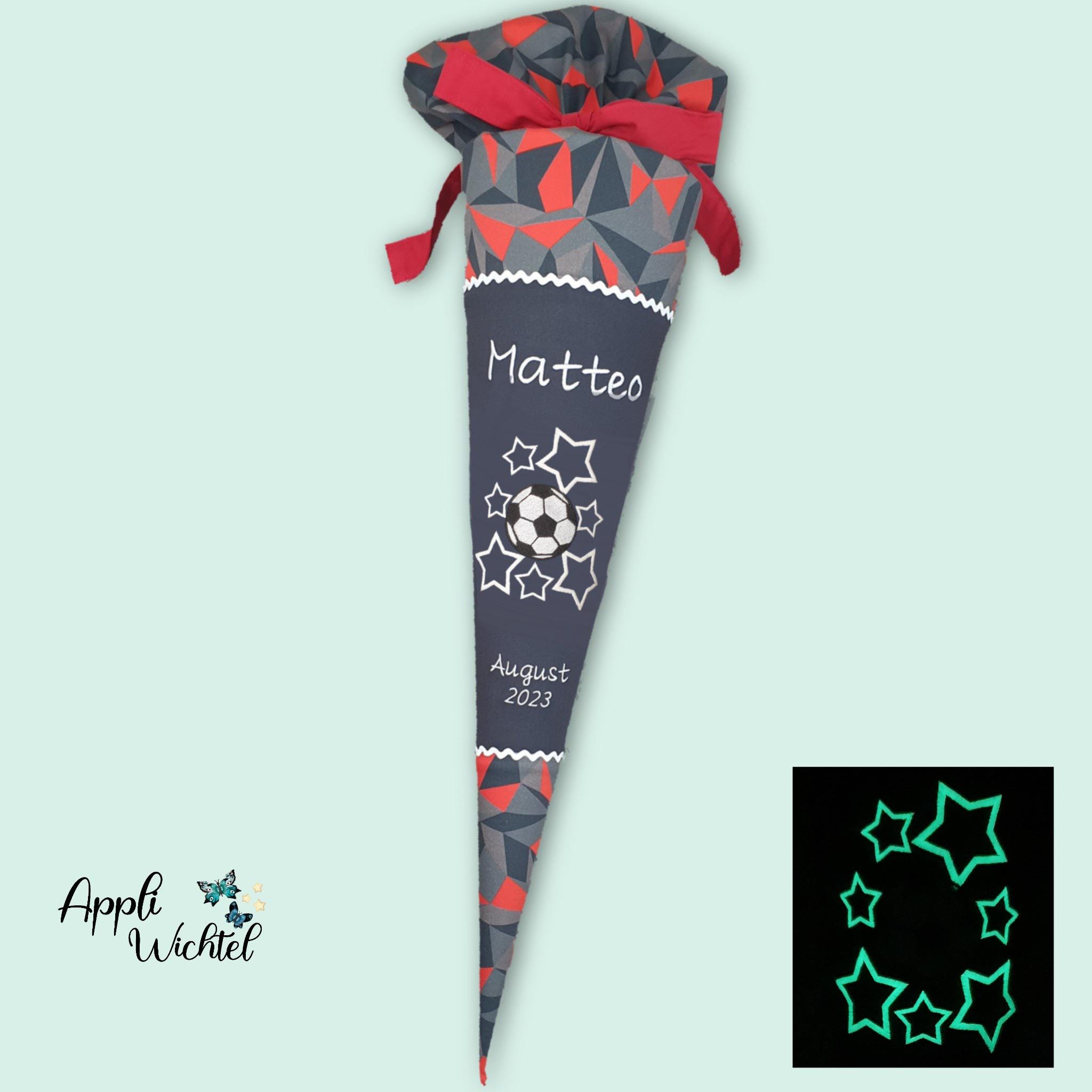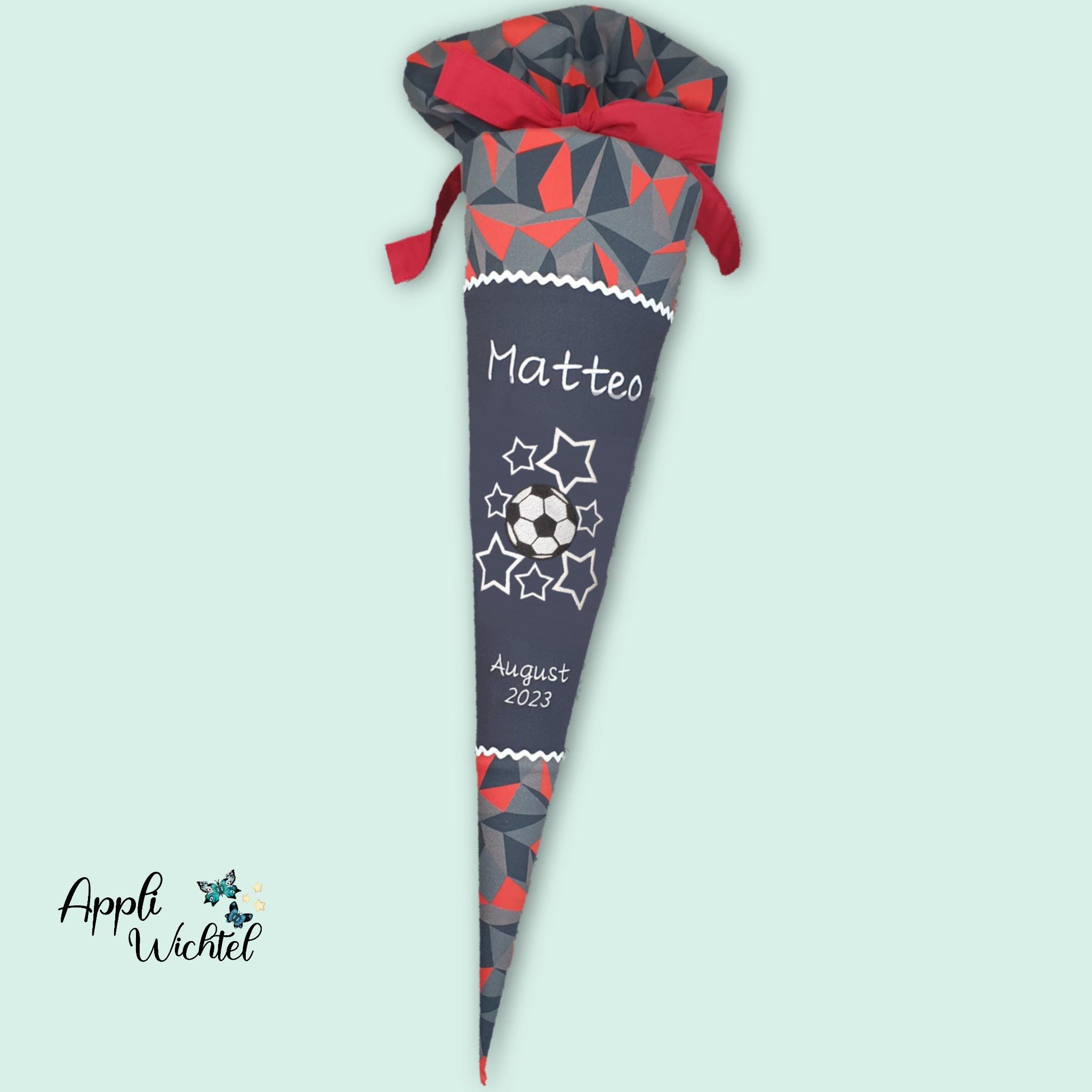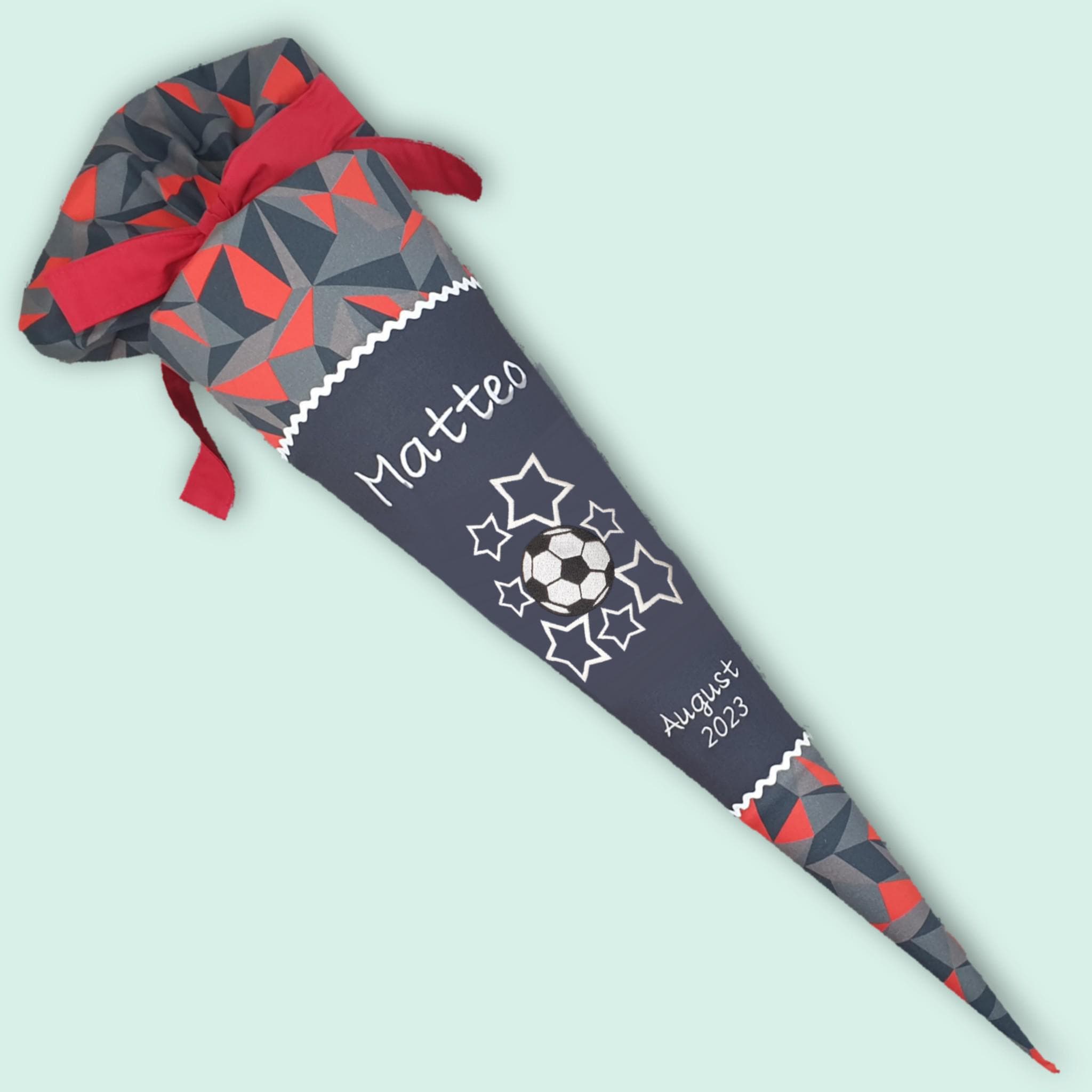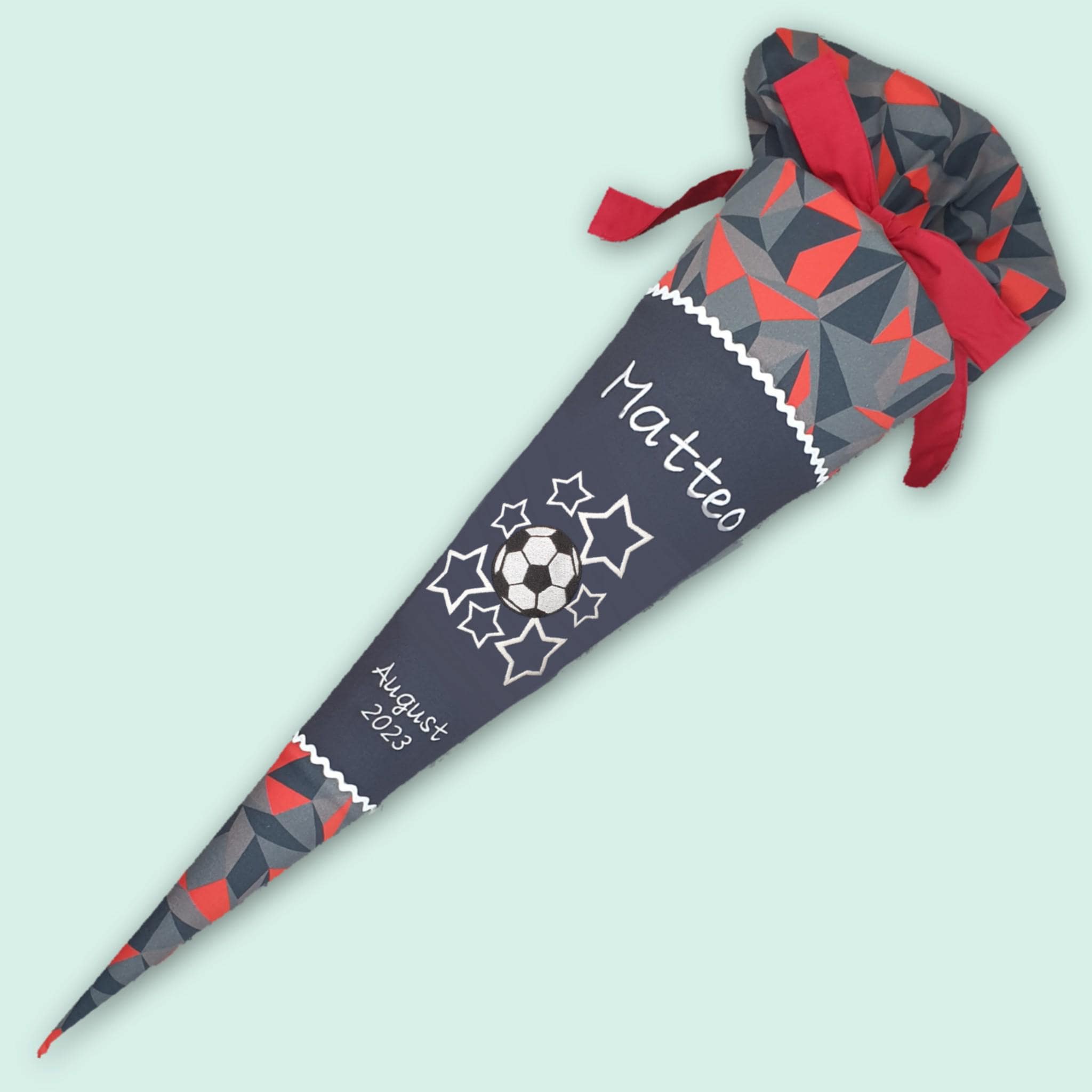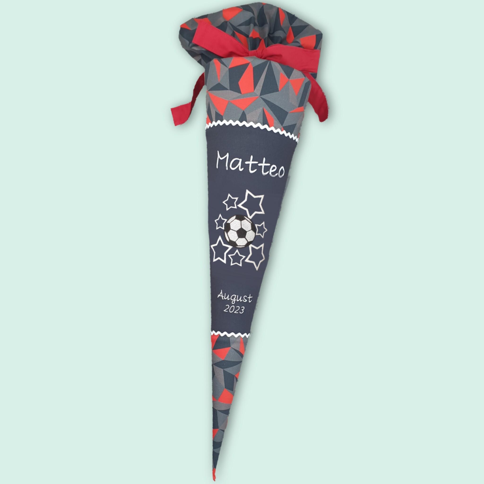 Schultüte mit Fussball und Namen farblich auf den Ergobag TaekBärdo Schulranzen abgestimmt.