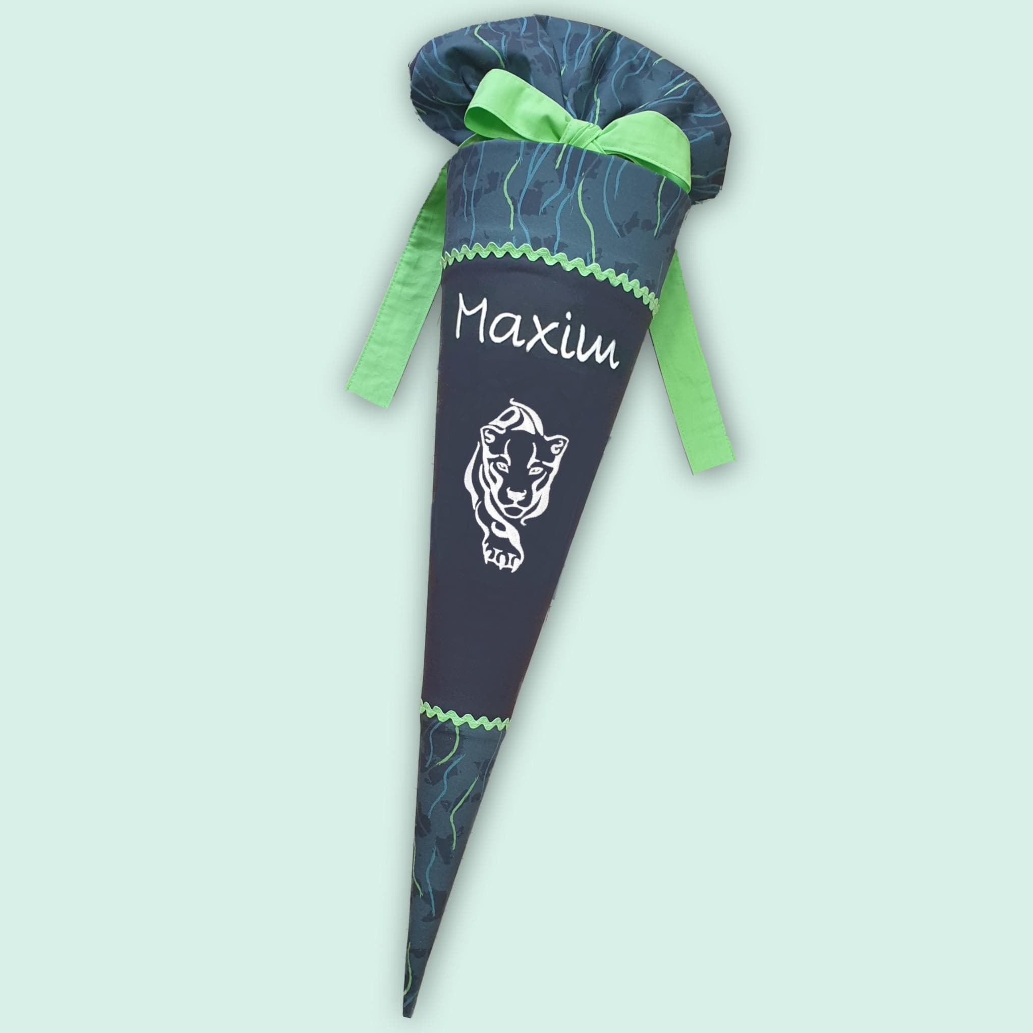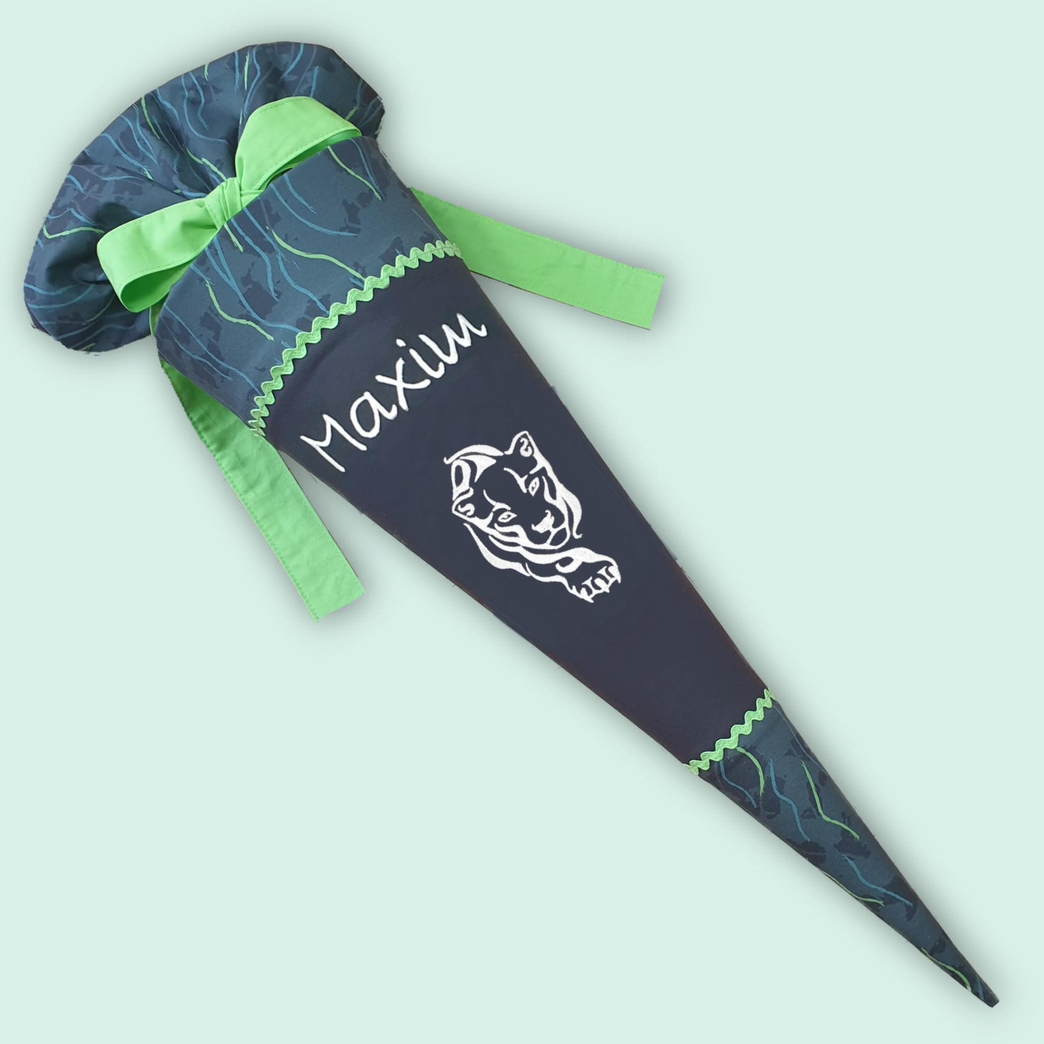 Jede Schultüte wird mit einem gestickten Motiv und dem Namen deines Kindes individuell gestaltet. Auf Wunsch fügen wir auch das Datum des ersten Schultages hinzu.