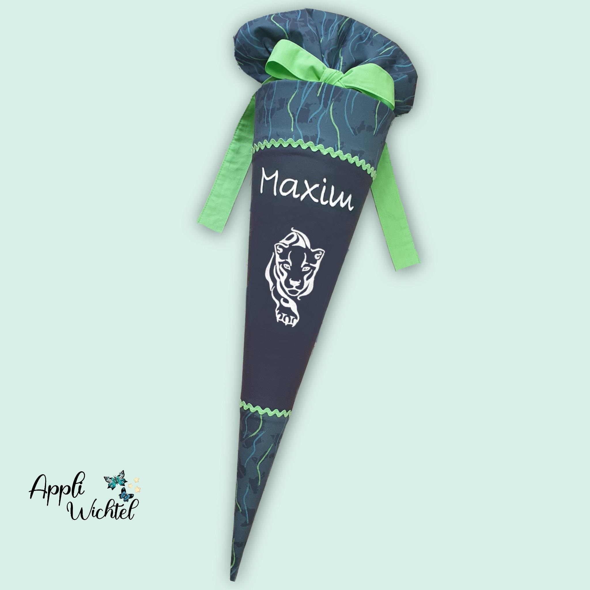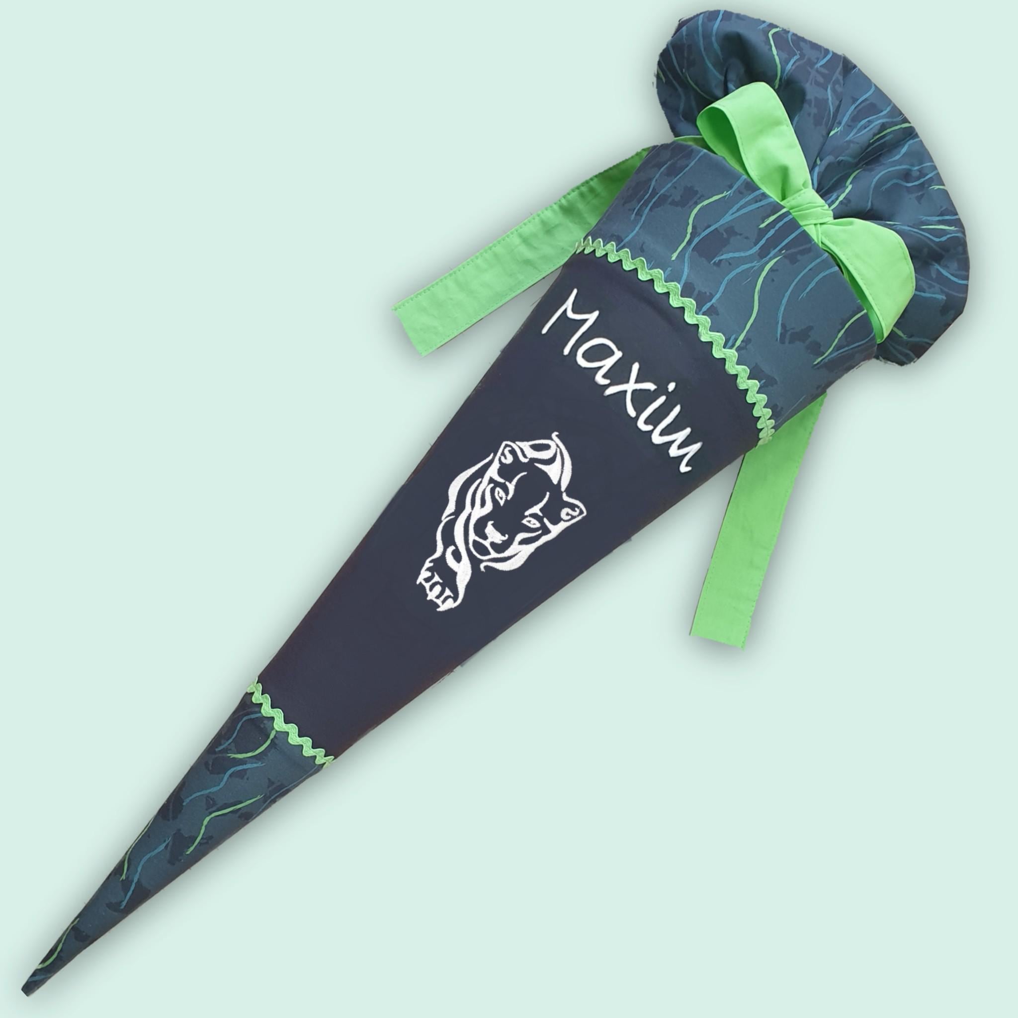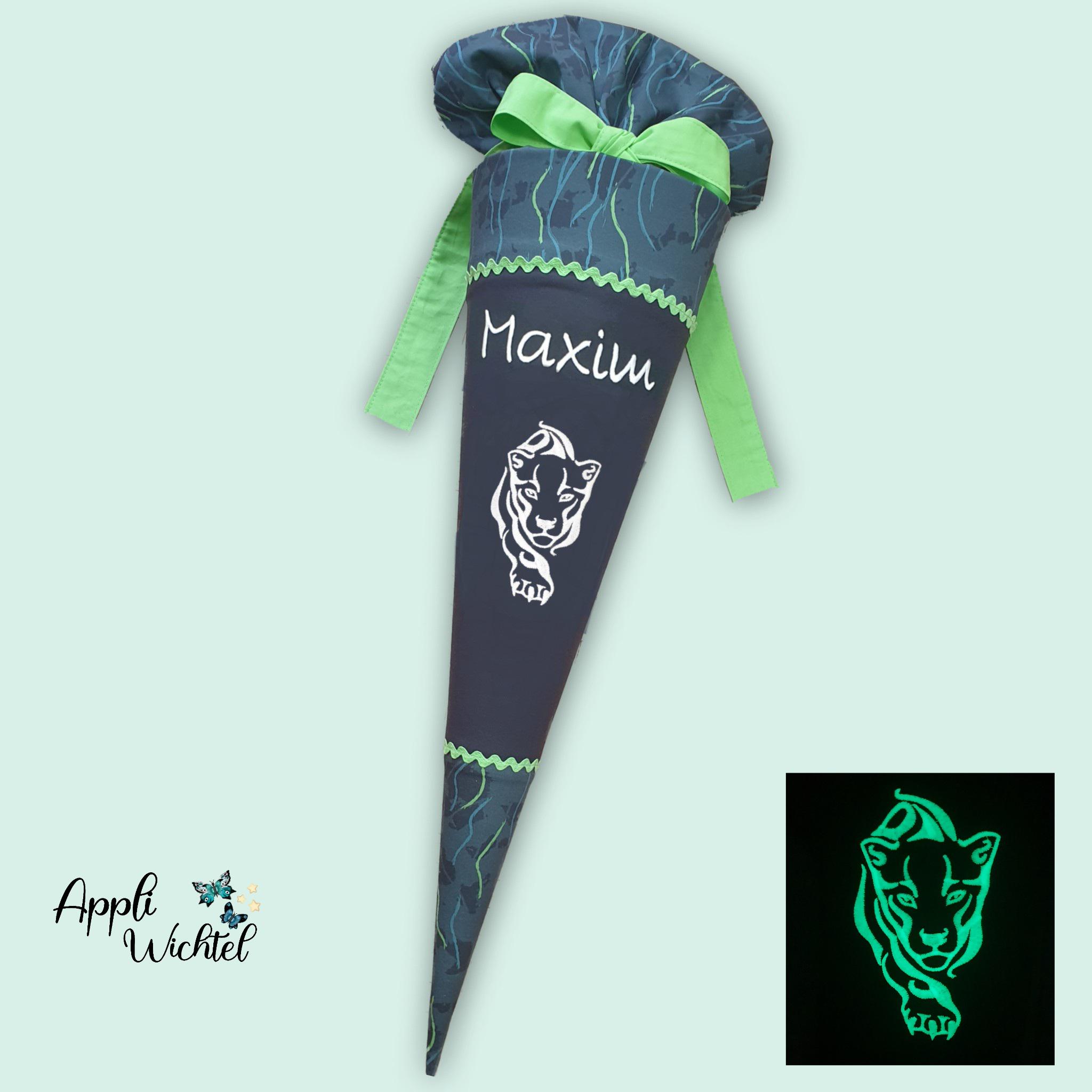 Schultüte mit Panther (leuchtet im Dunkeln) und Namen farblich auf den Step by Step Danger Cat Chiko Schulranzen abgestimmt.