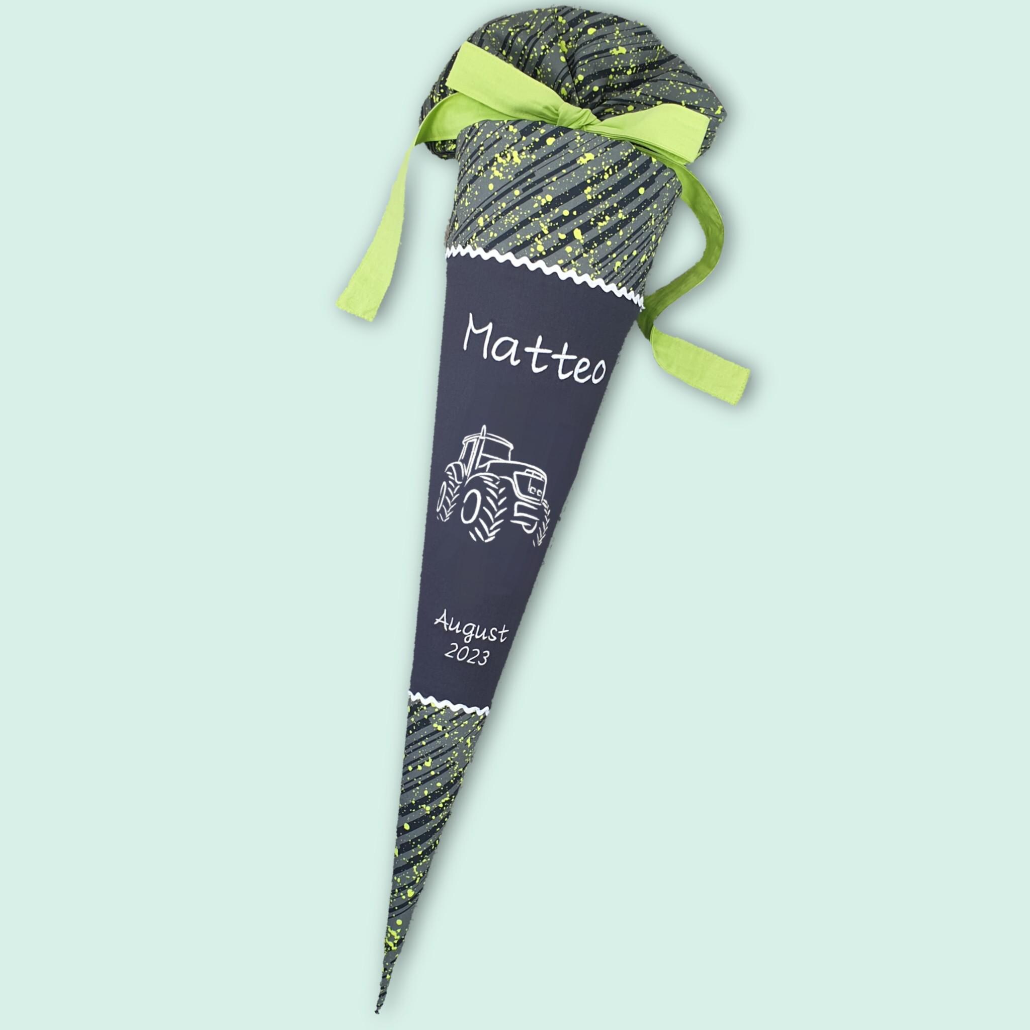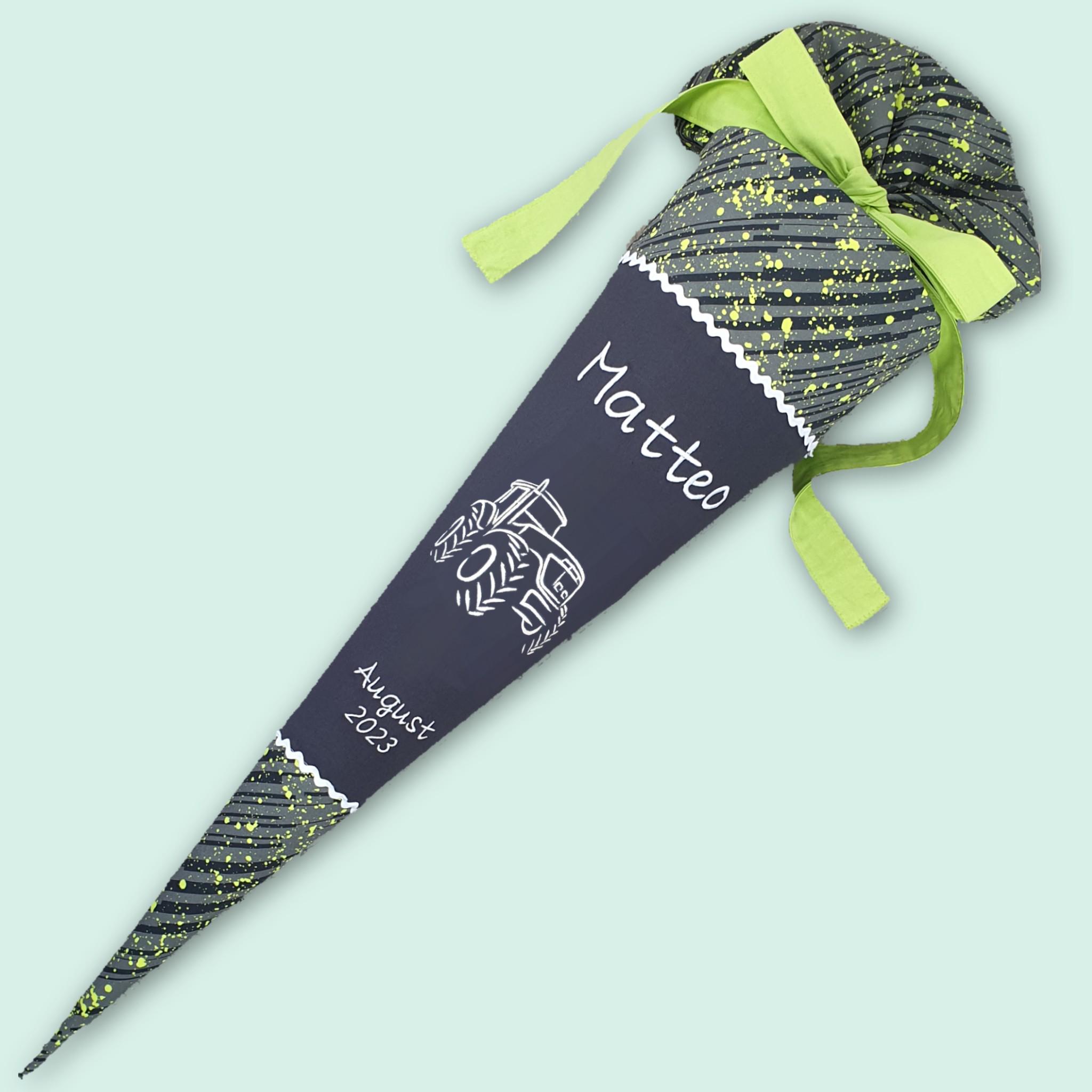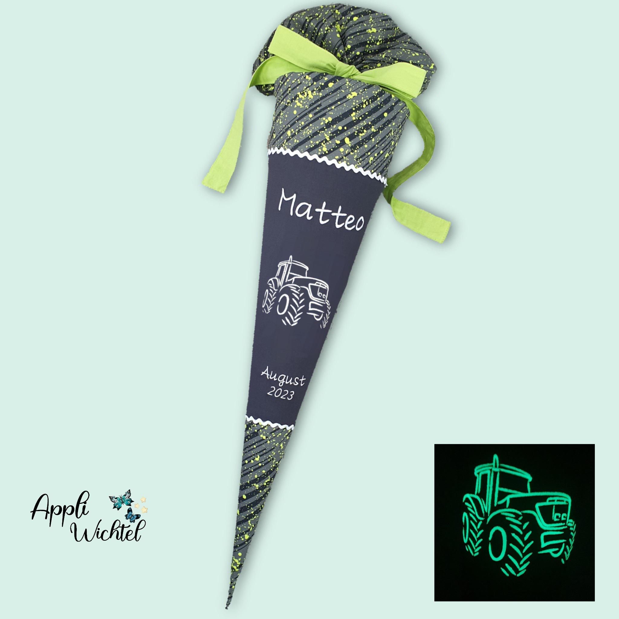 Schultüte mit Traktor (leuchtet im Dunkeln) und Namen farblich auf den Ergobag Mähdreschbär Schulranzen abgestimmt.