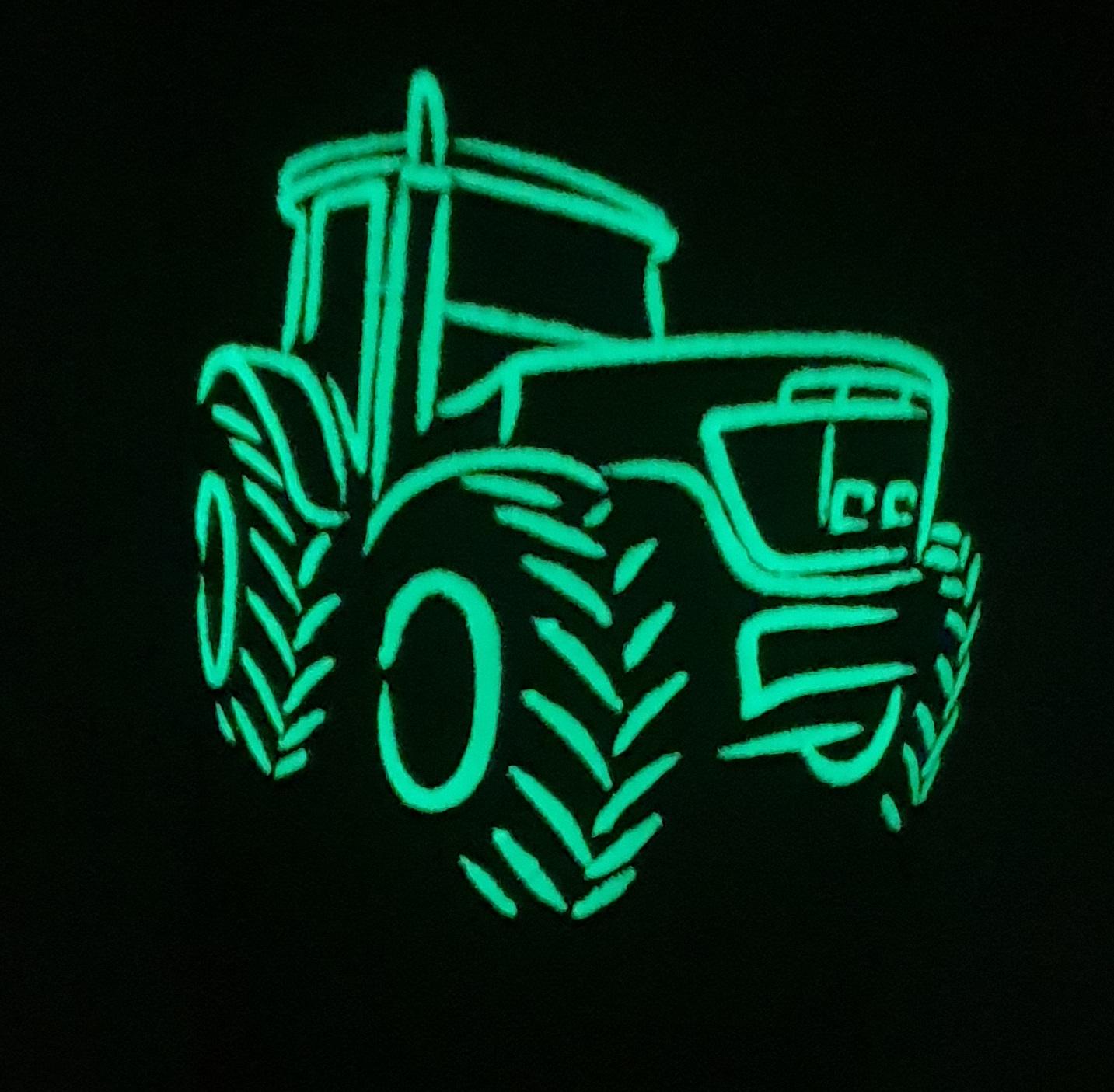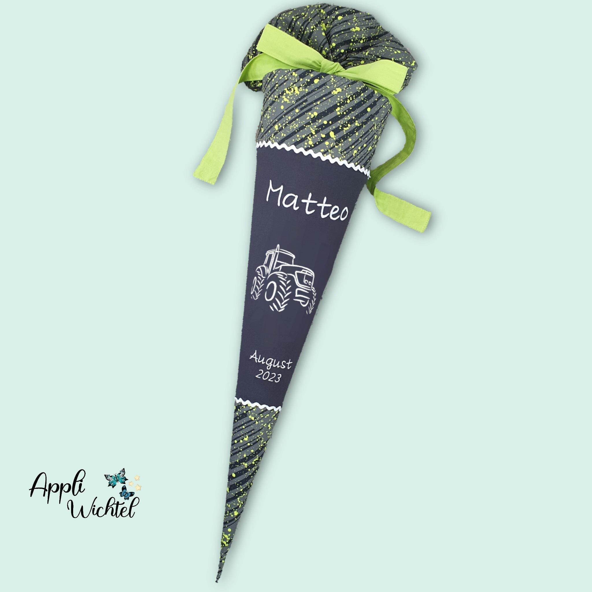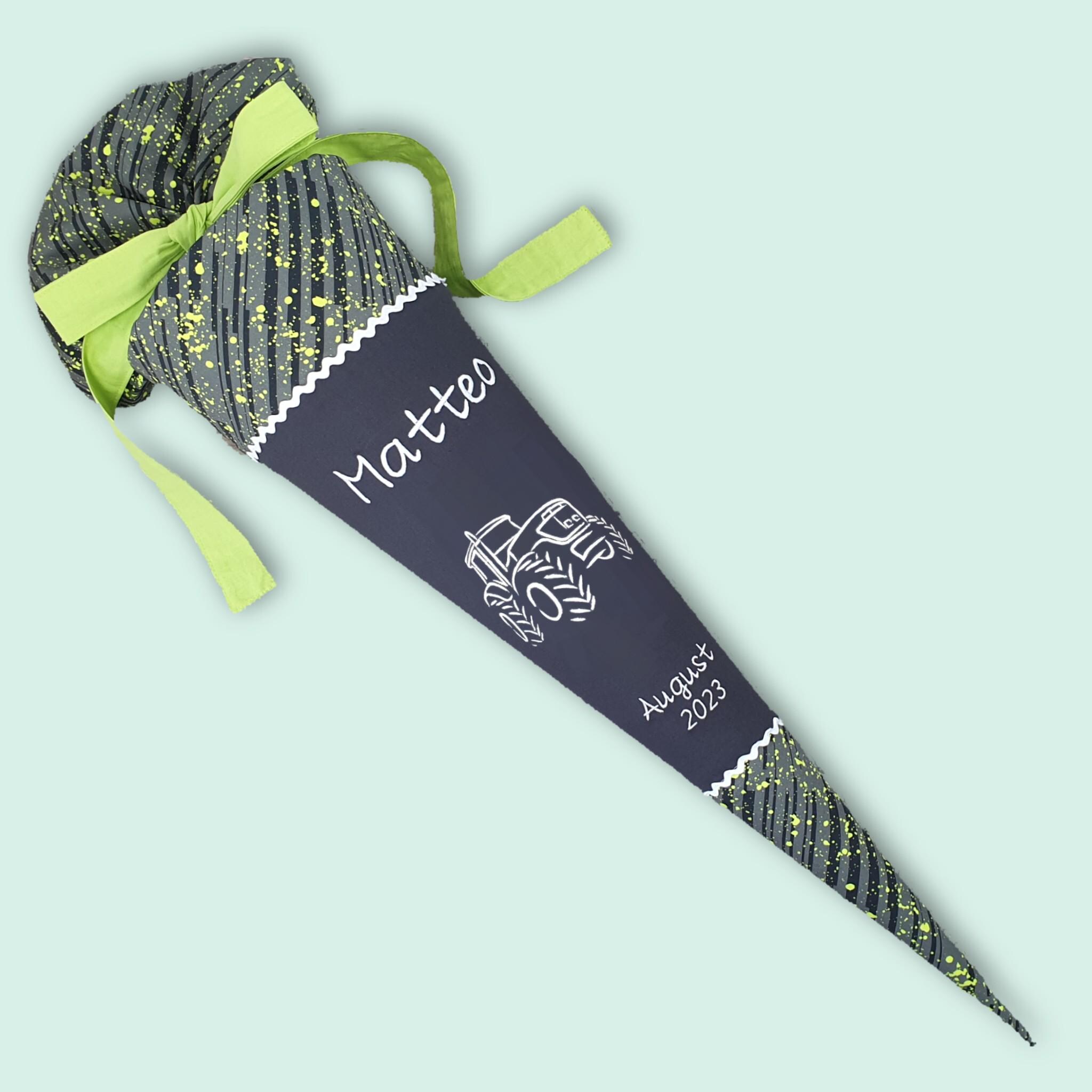 Schultüte mit Traktor (leuchtet im Dunkeln) und Namen farblich auf den Ergobag Mähdreschbär Schulranzen abgestimmt.