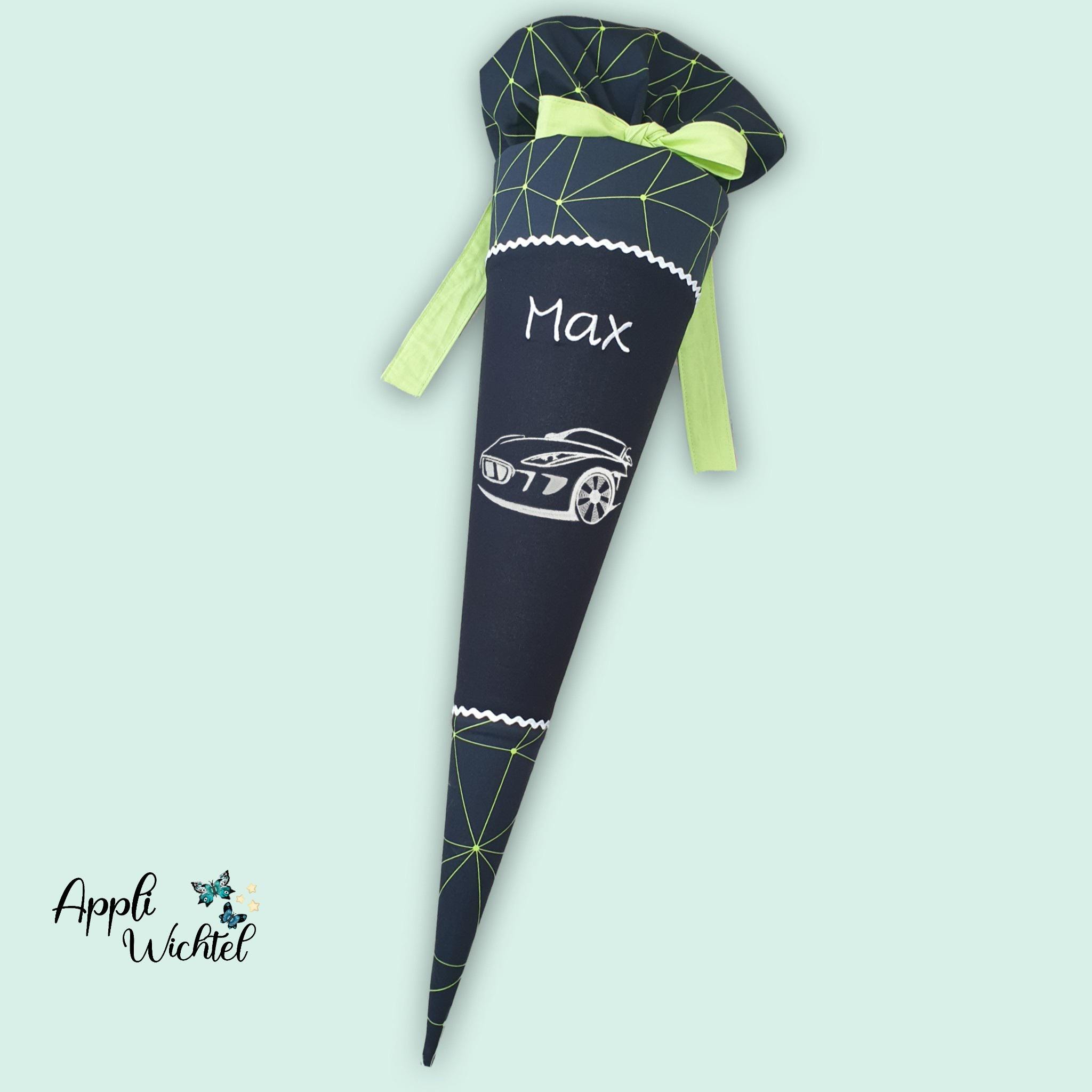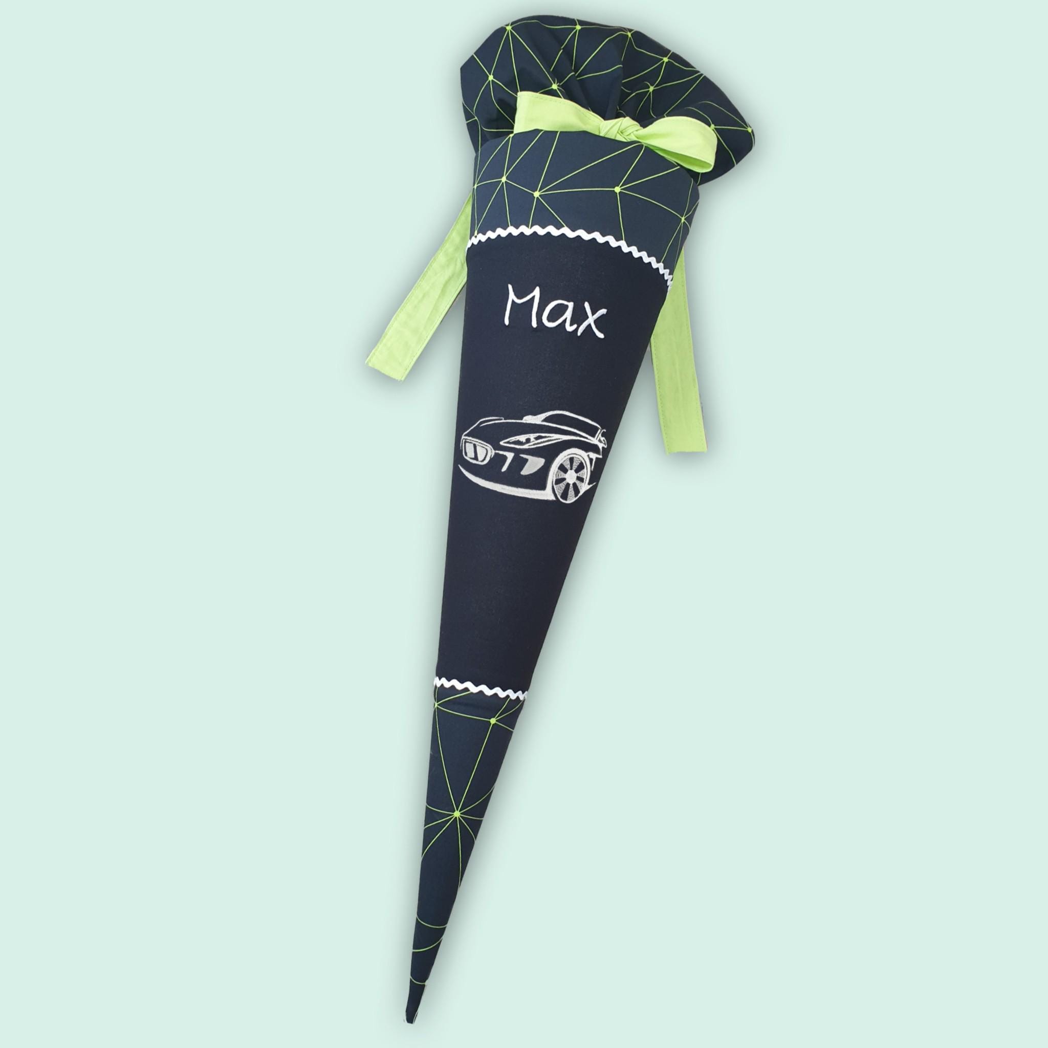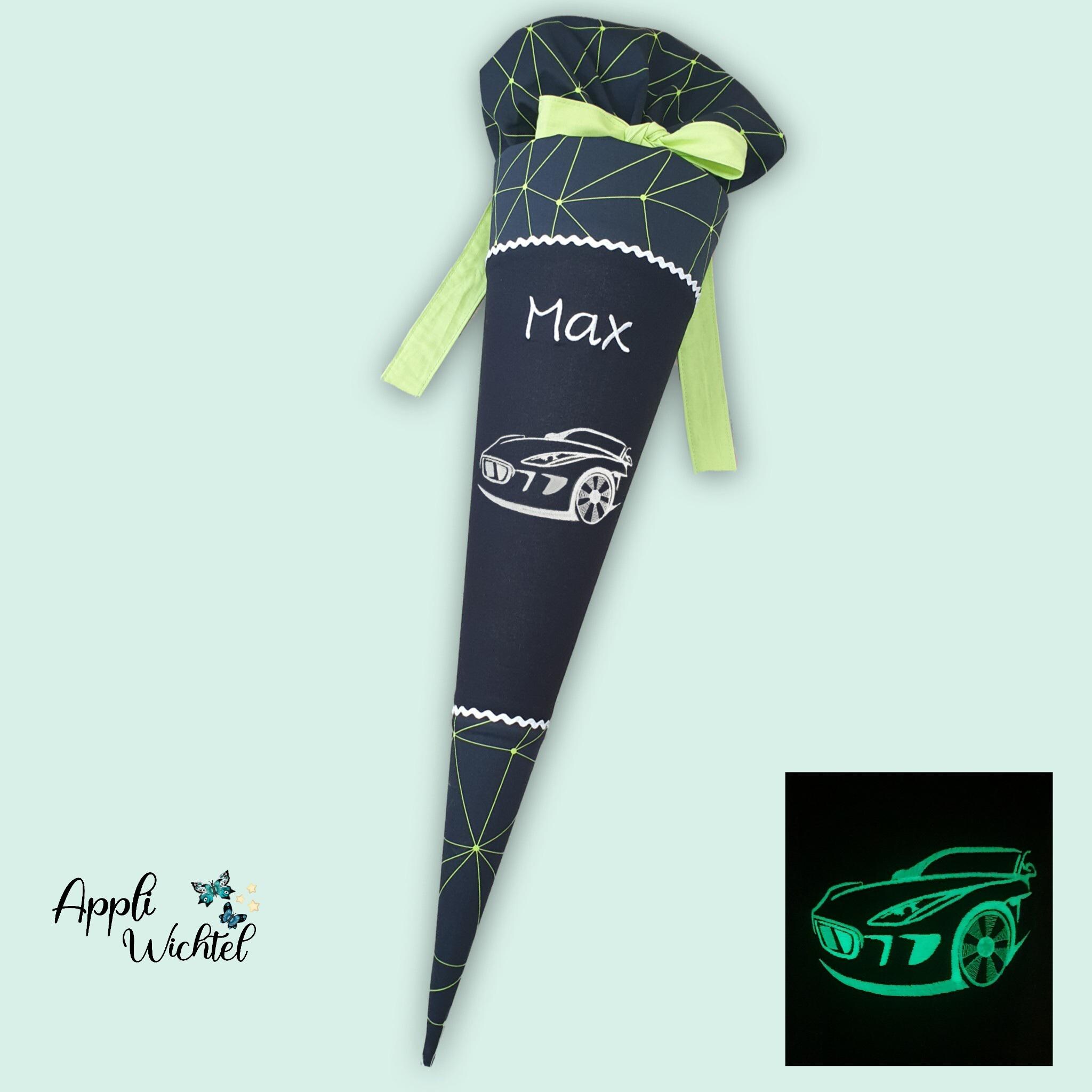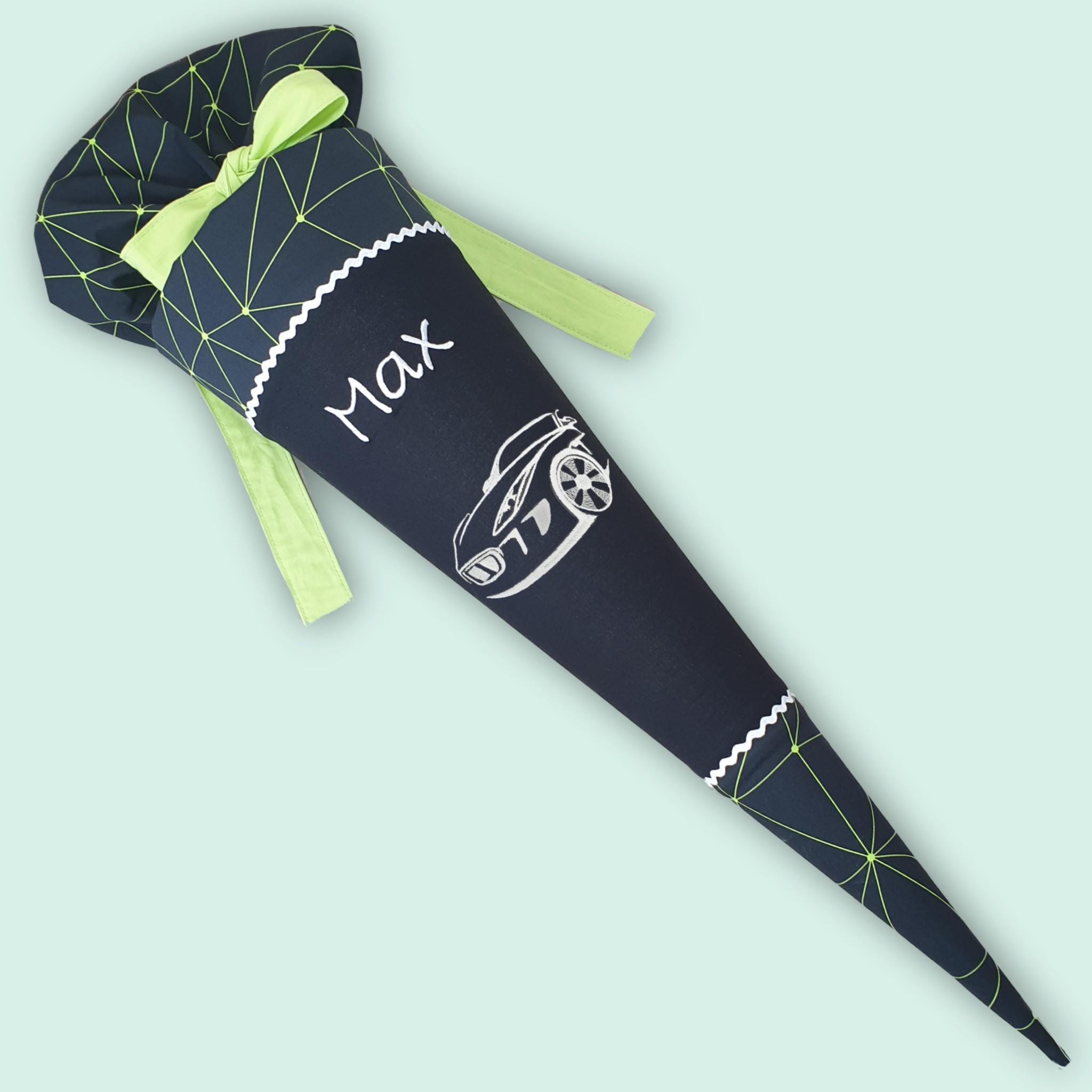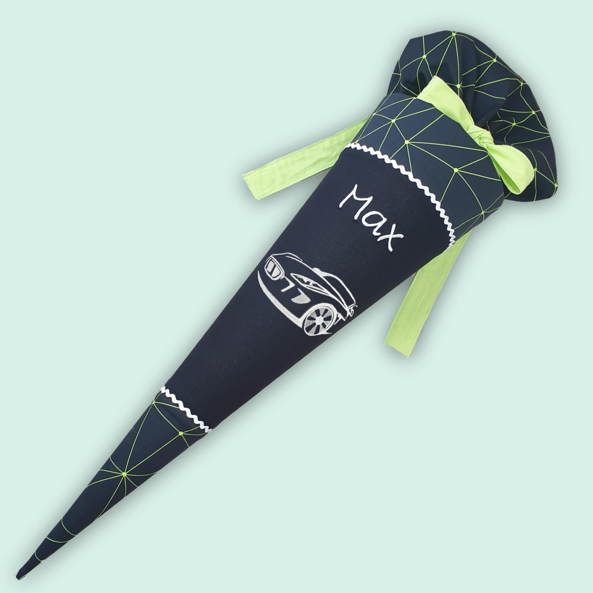 Schultüte mit Auto Sportwagen Rennauto (Leuchtet im Dunklen) und Namen farblich auf den Cybär Race Schulranzen abgestimmt.