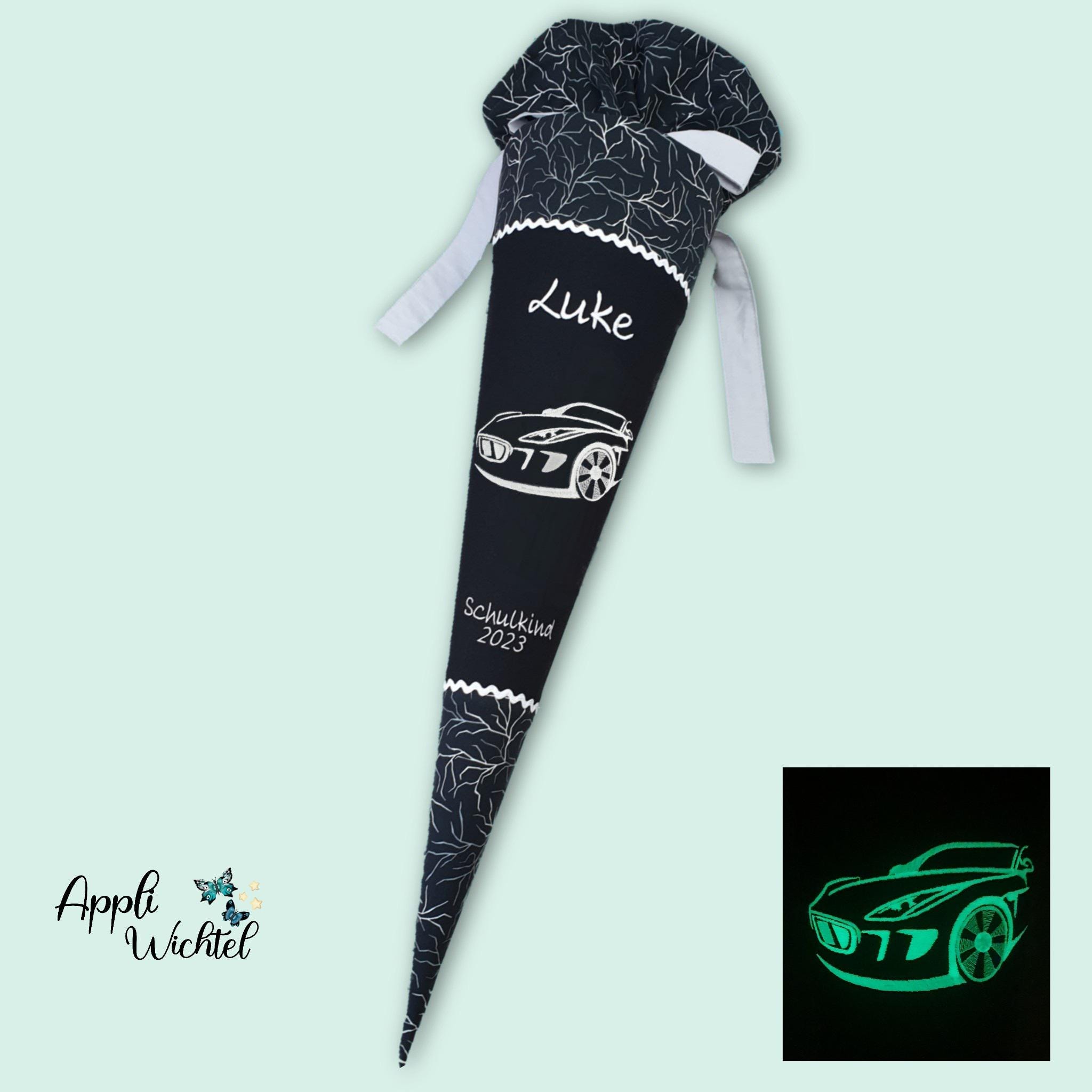 Schultüte mit Auto Sportwagen Rennauto (Leuchtet im Dunklen) und Namen farblich auf den Ergobag Super ReflektBär Glow Schulranzen abgestimmt.
