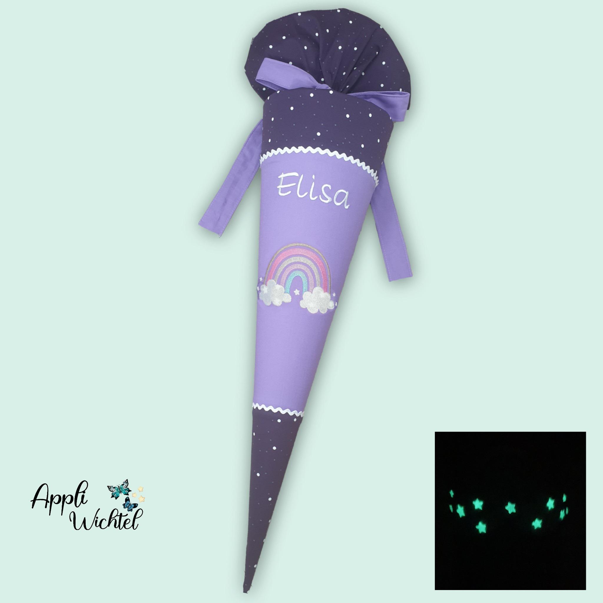 Schultüte mit glitzer Regenbogen (Sterne leuchten im Dunkeln) und Namen farblich auf den Sternguckbär Schulranzen abgestimmt.