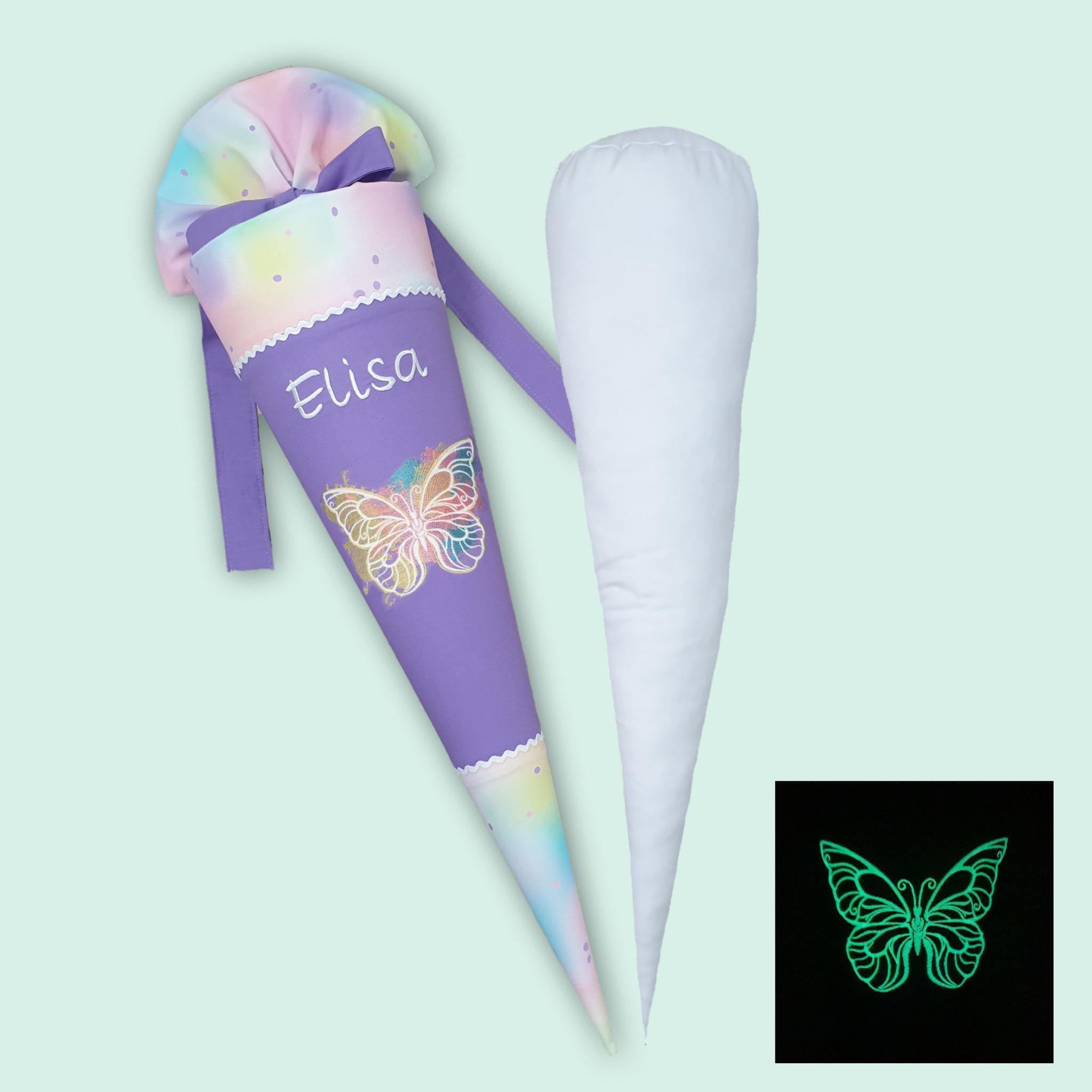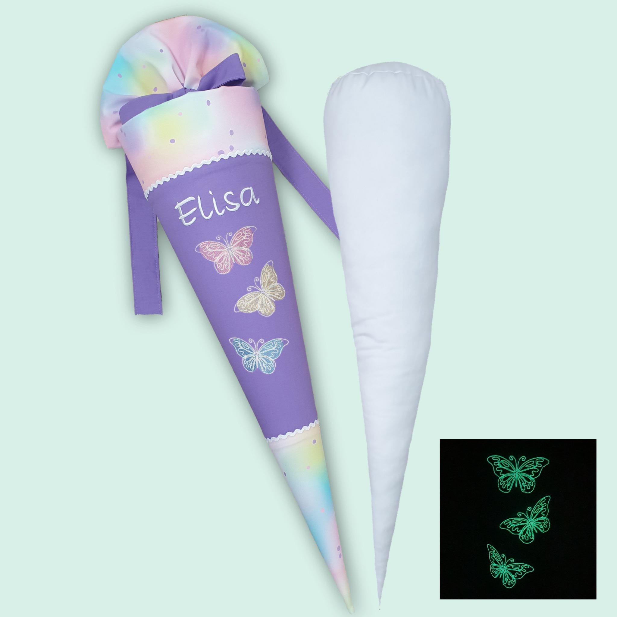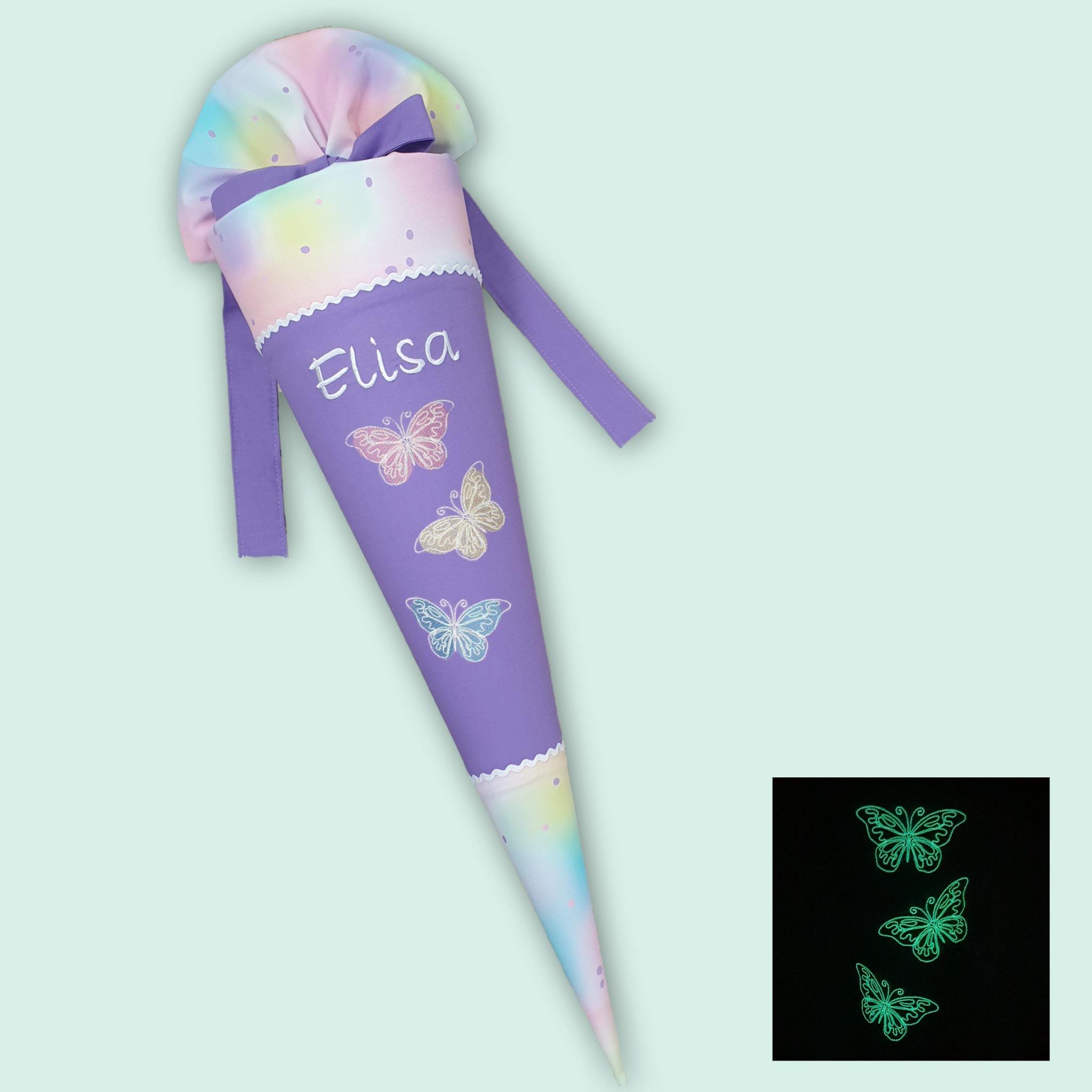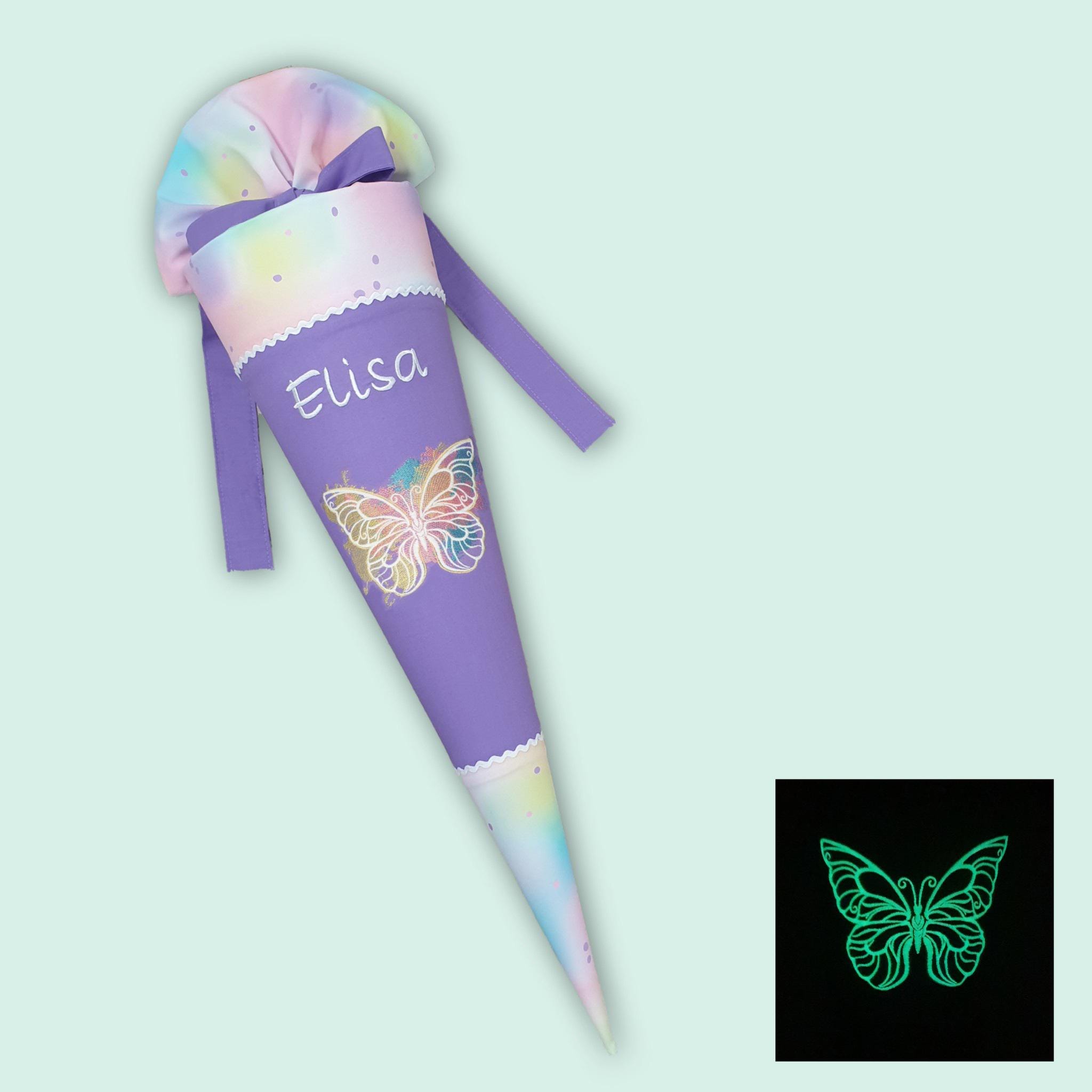 Schultüte mit Wunschmotiv (einige leuchten im Dunkeln) und Namen farblich auf den Step by step Butterfly Luna abgestimmt.