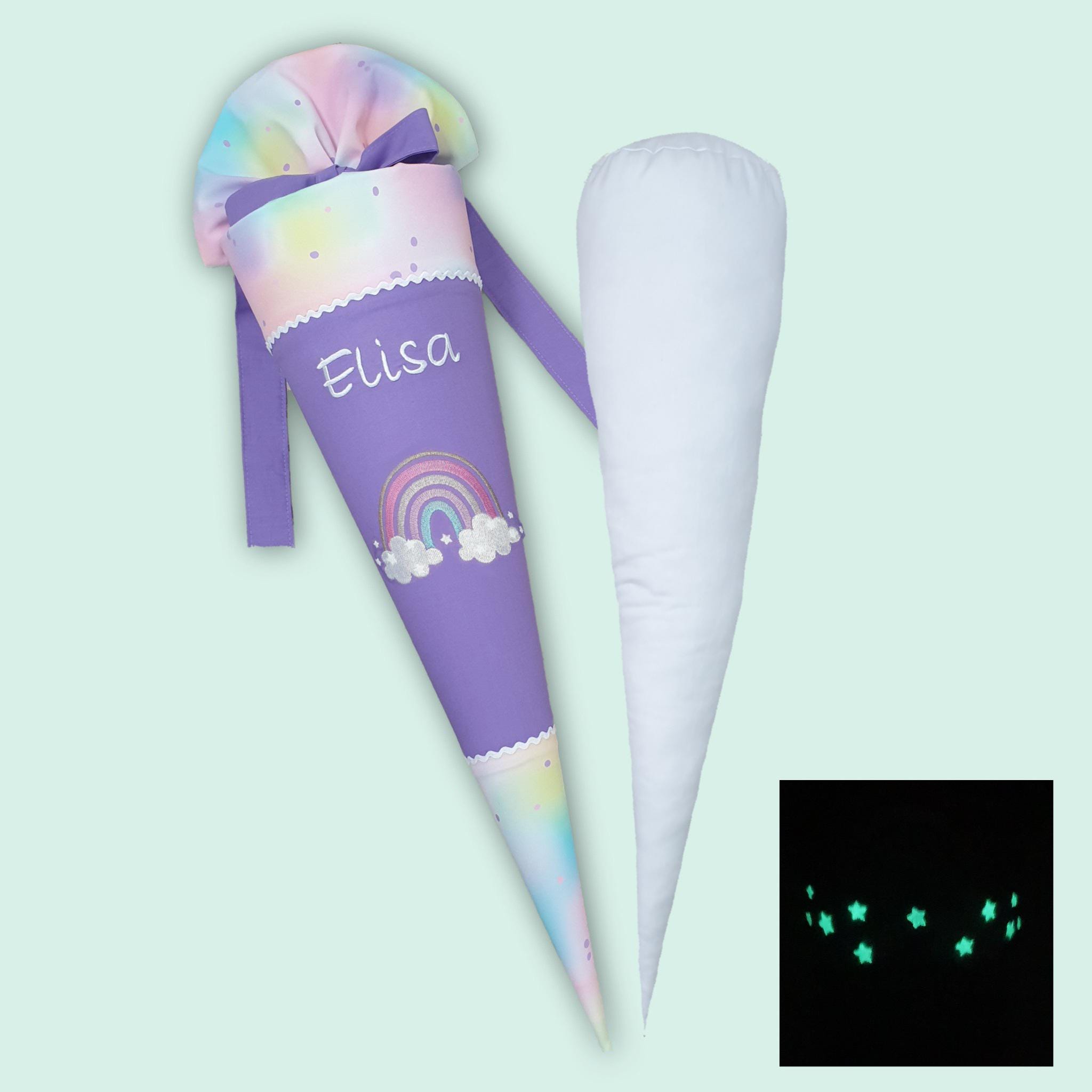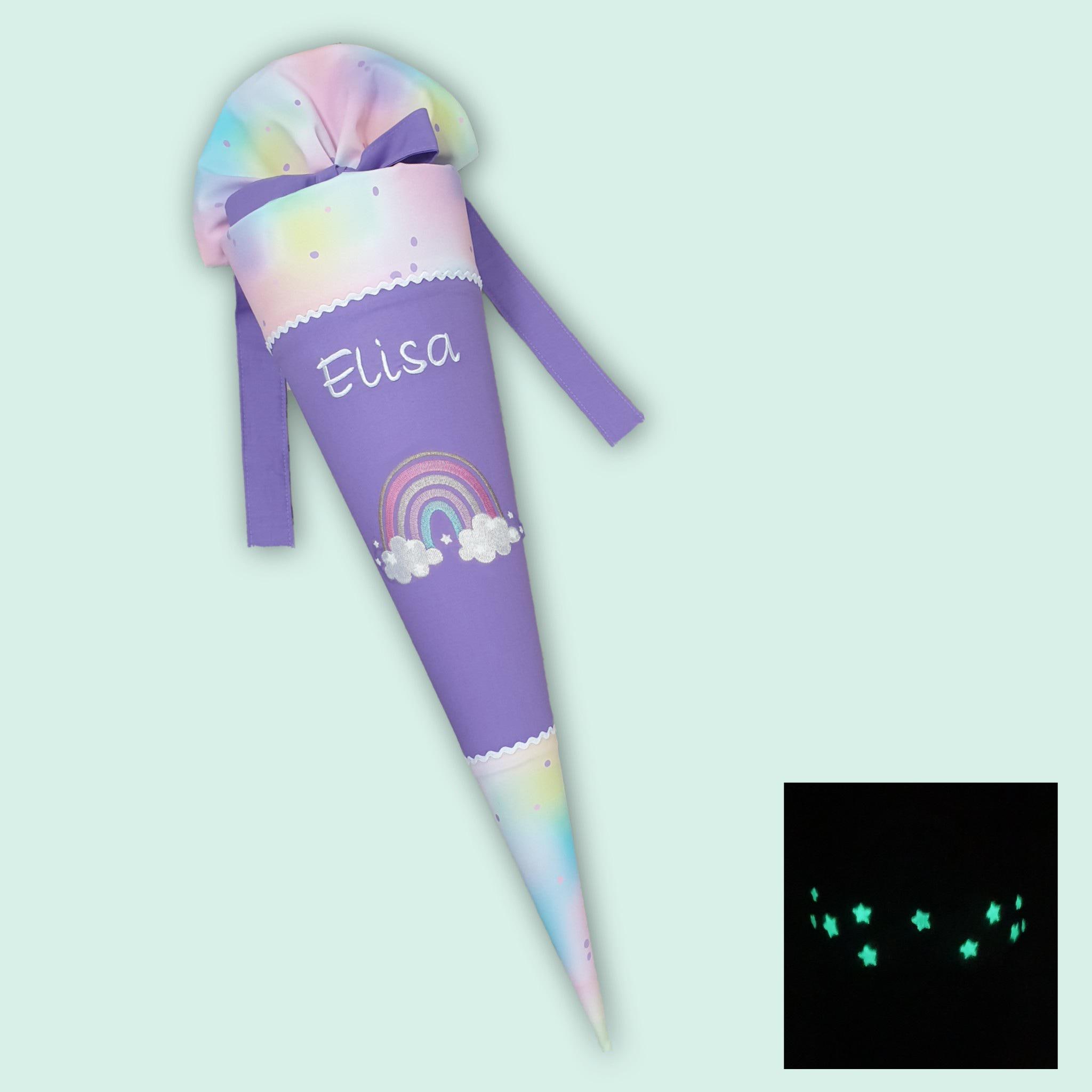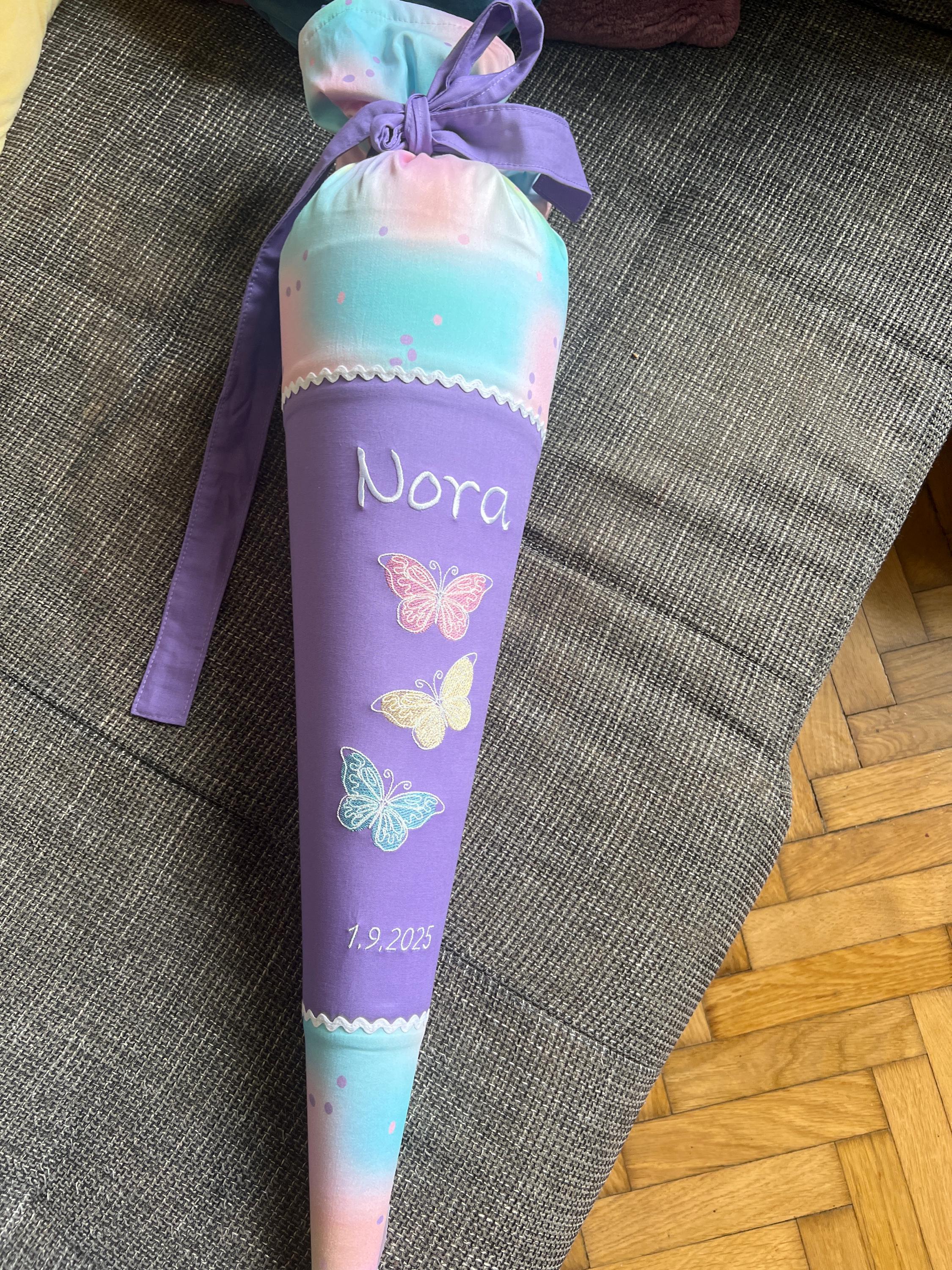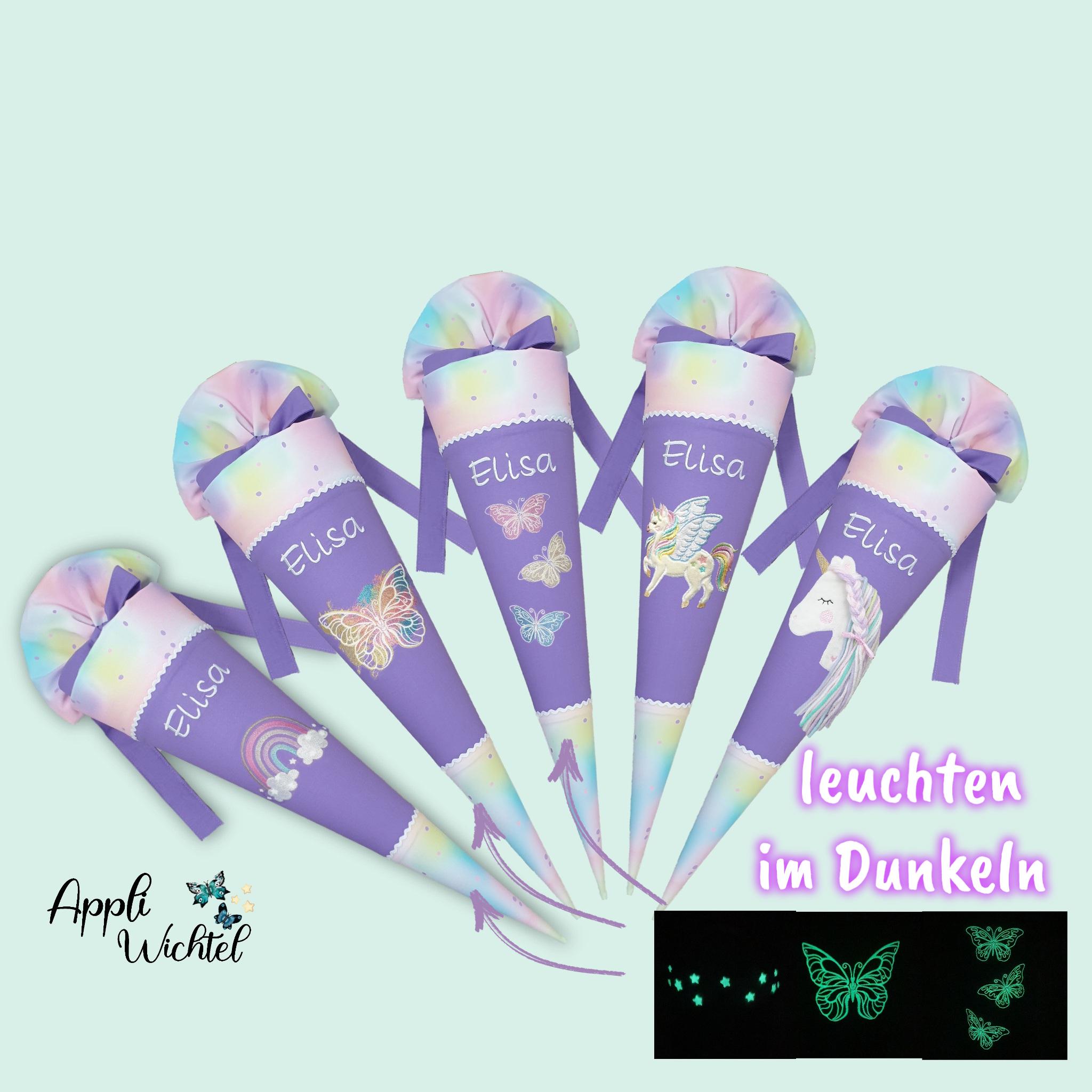Schultüte mit Wunschmotiv (einige leuchten im Dunkeln) und Namen farblich auf den Step by step Butterfly Luna abgestimmt.