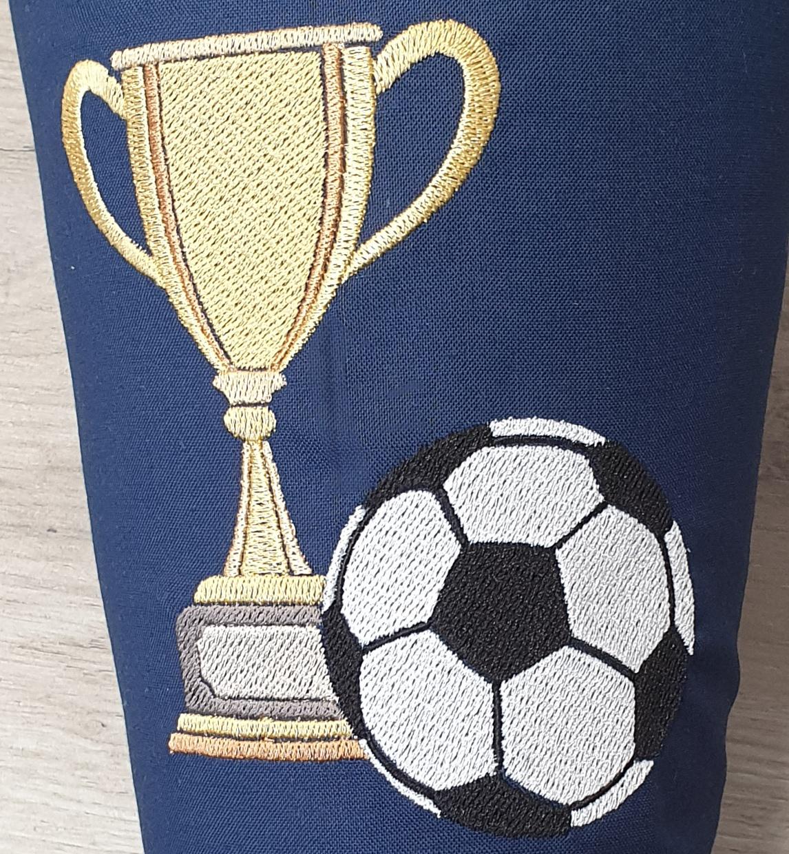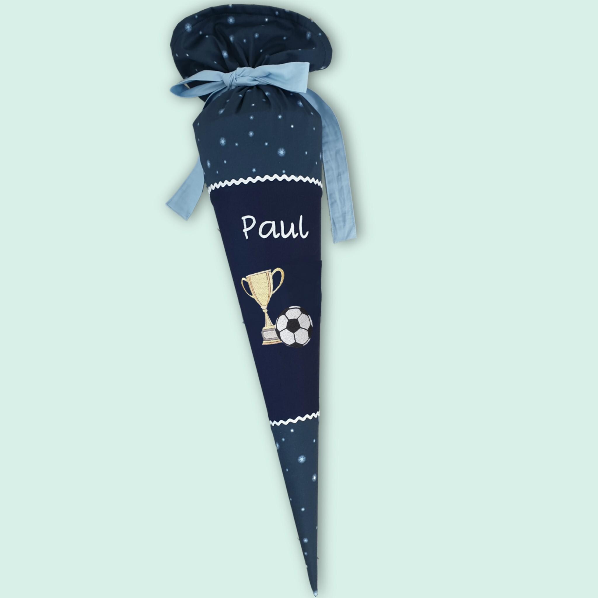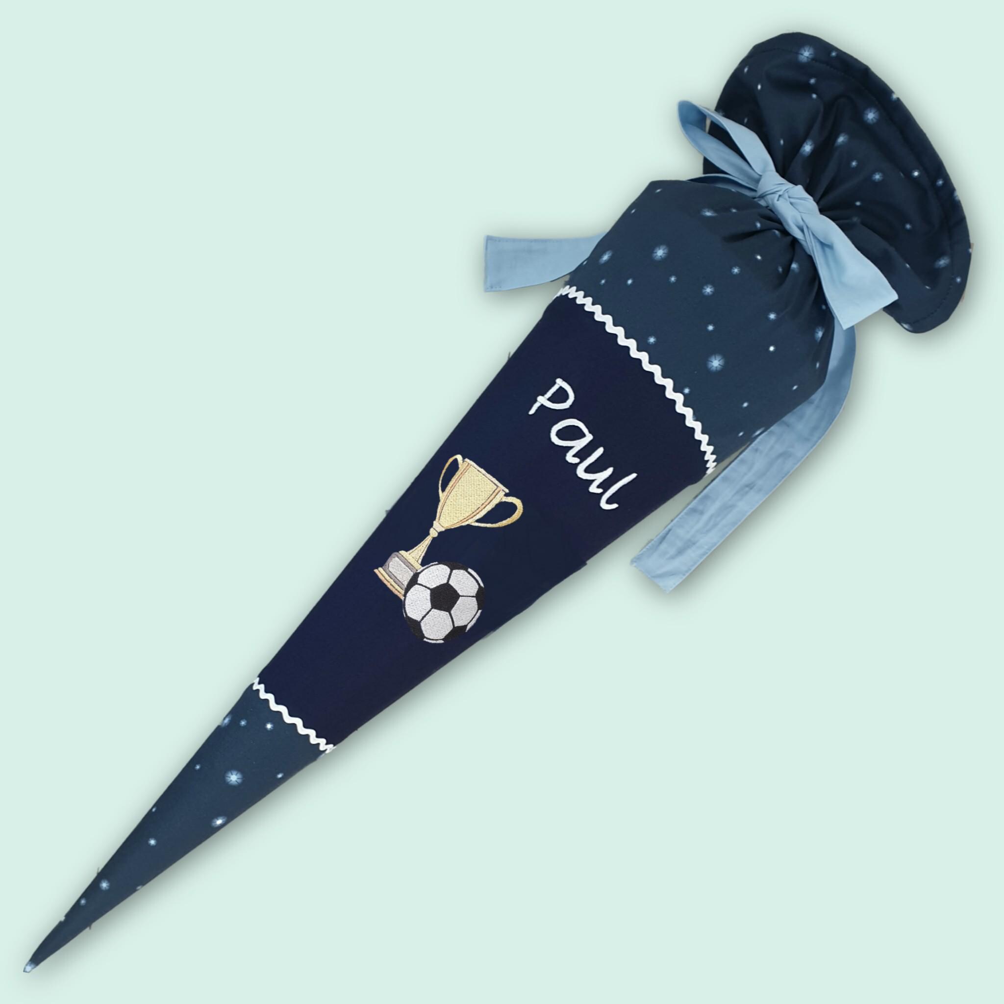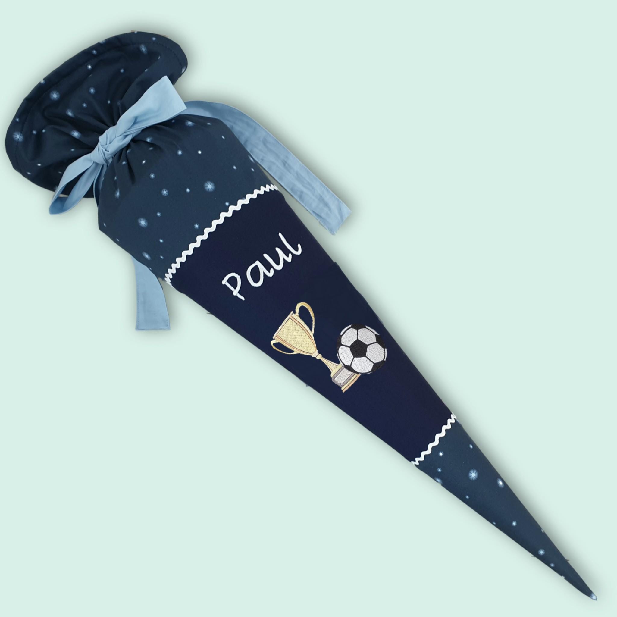 Schultüte mit Pokal, Fussball und Namen farblich auf den Ergobag KoBärnikus Schulranzen abgestimmt.