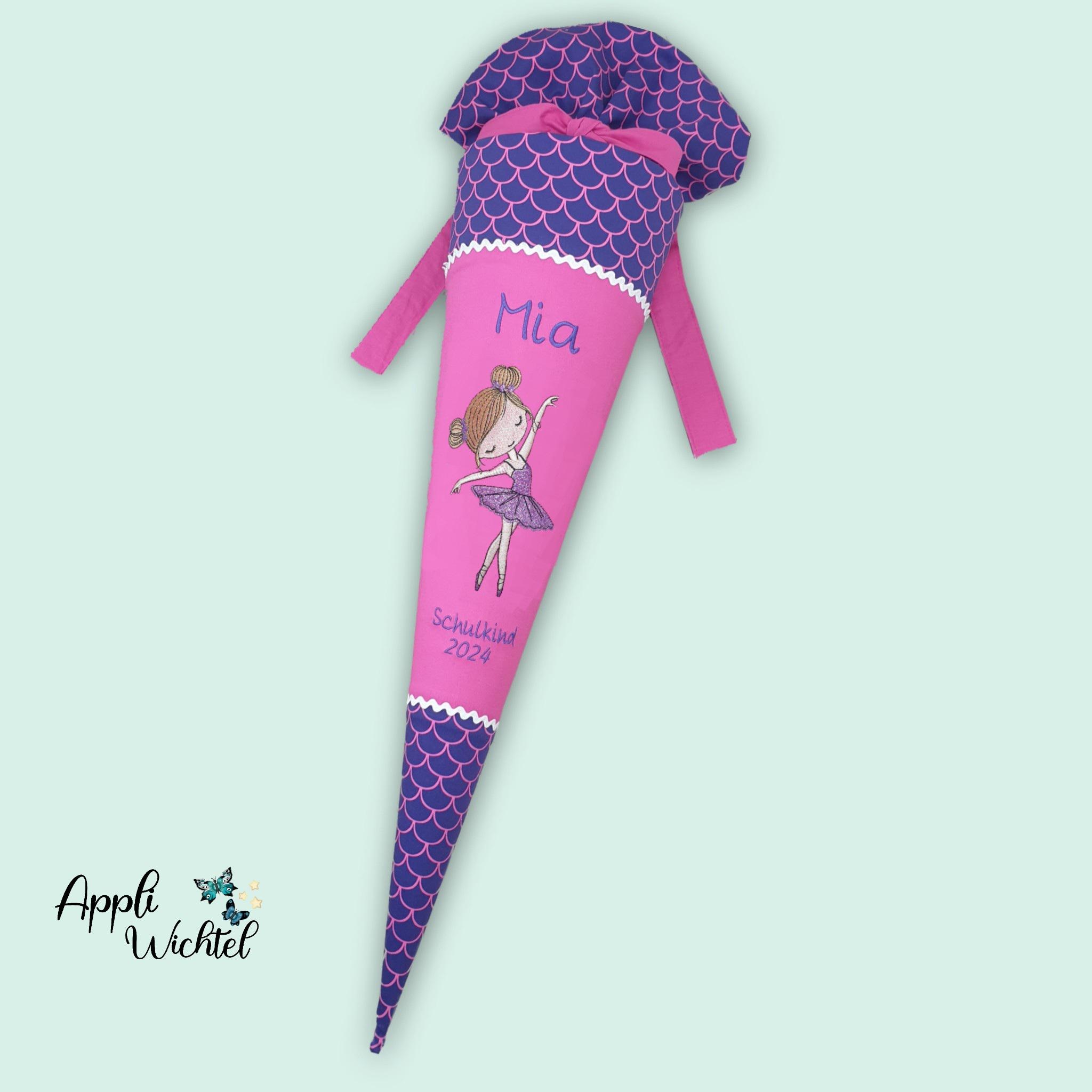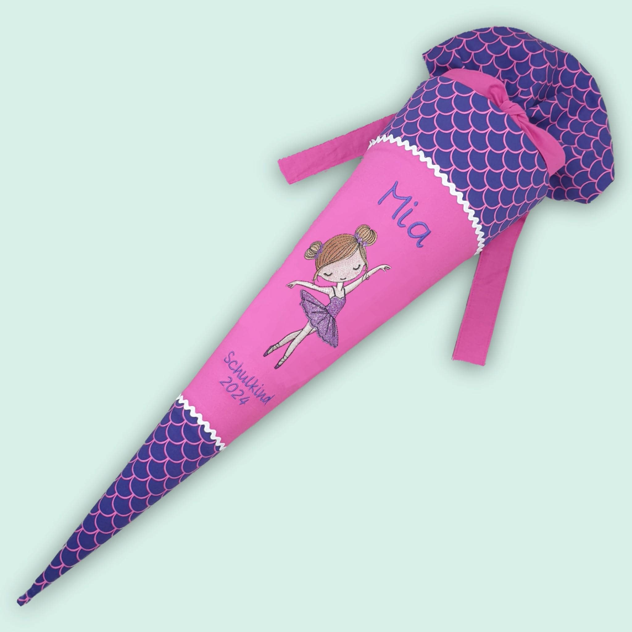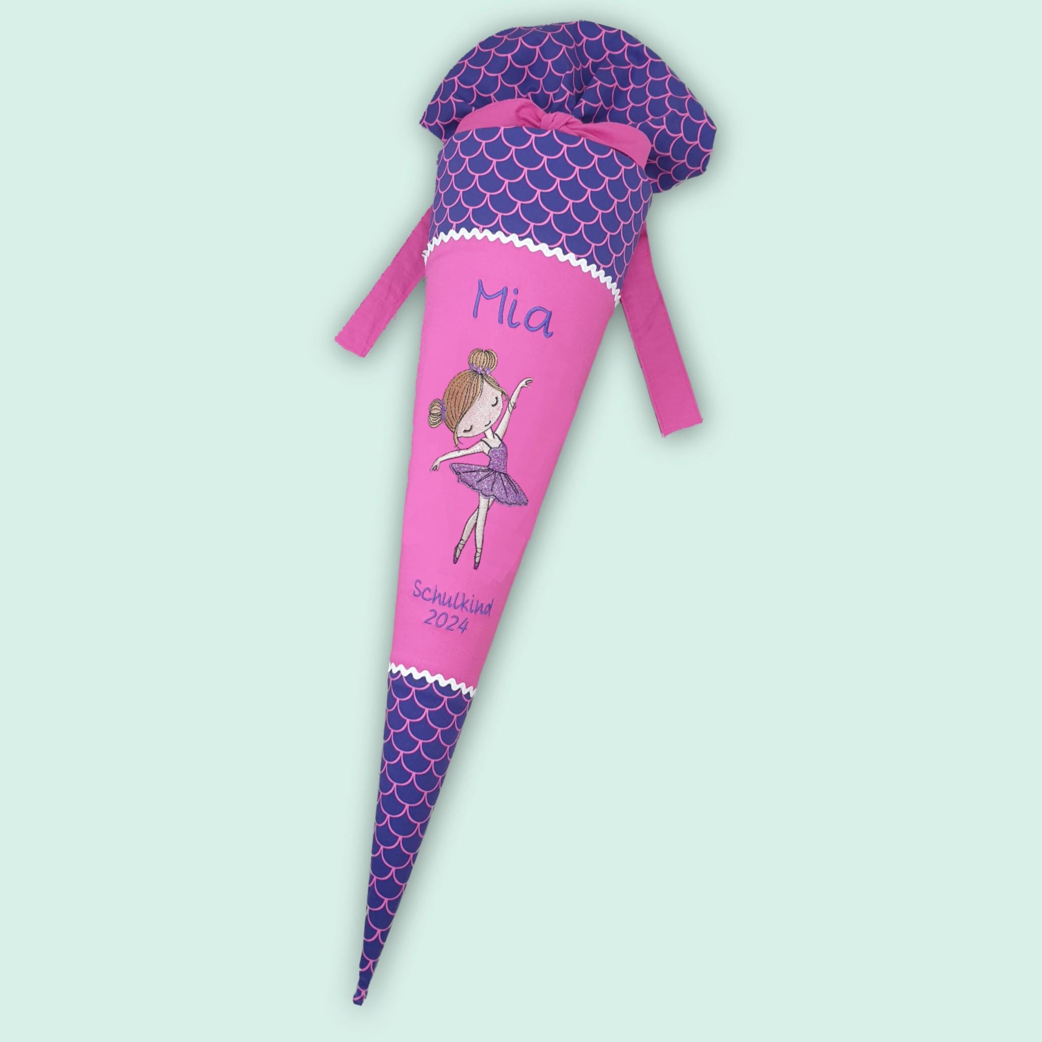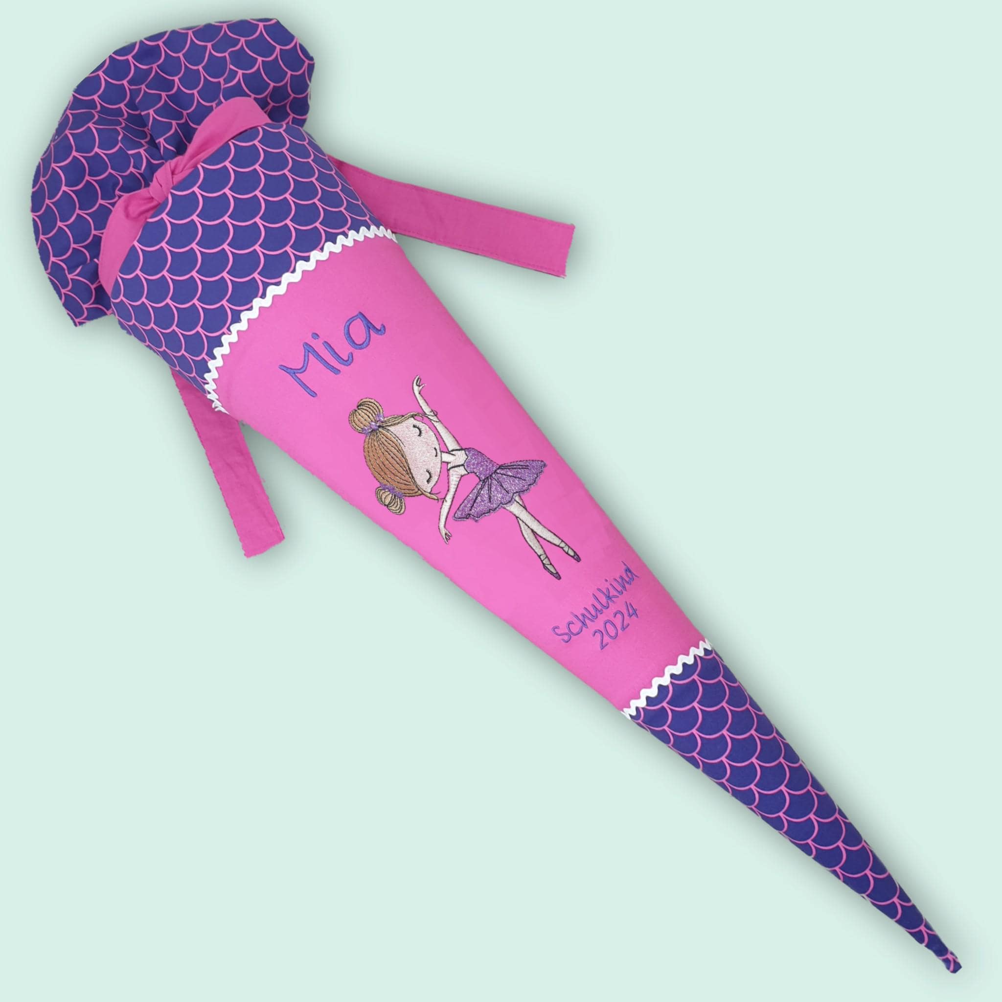 Schultüte mit glitzer Ballerina Tänzerin und Namen farblich auf den Ergobag Perlentauchbär Schulranzen abgestimmt.