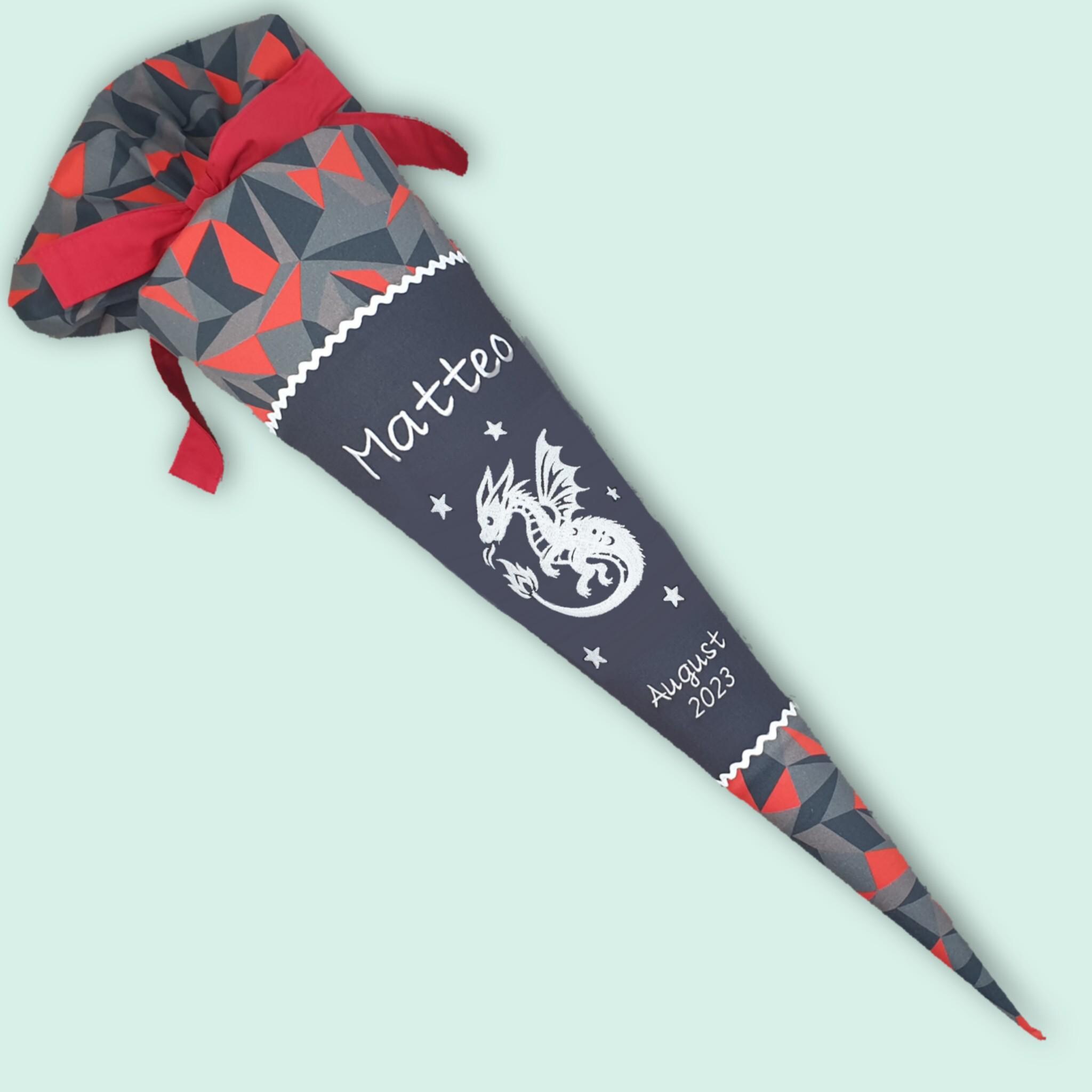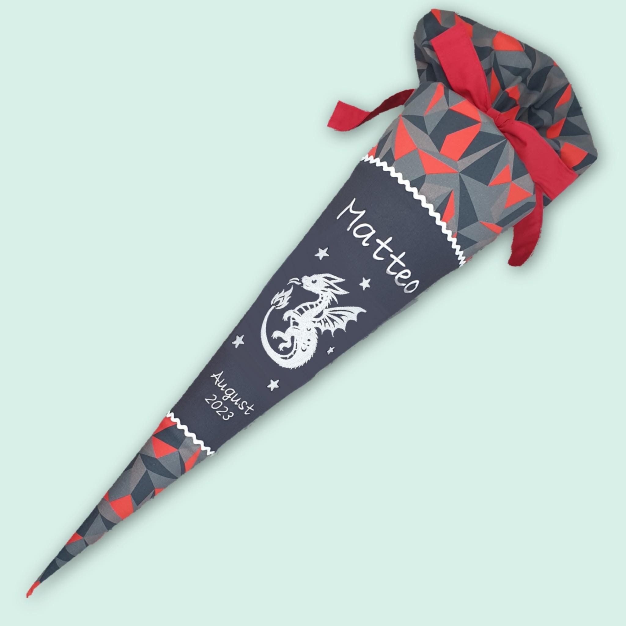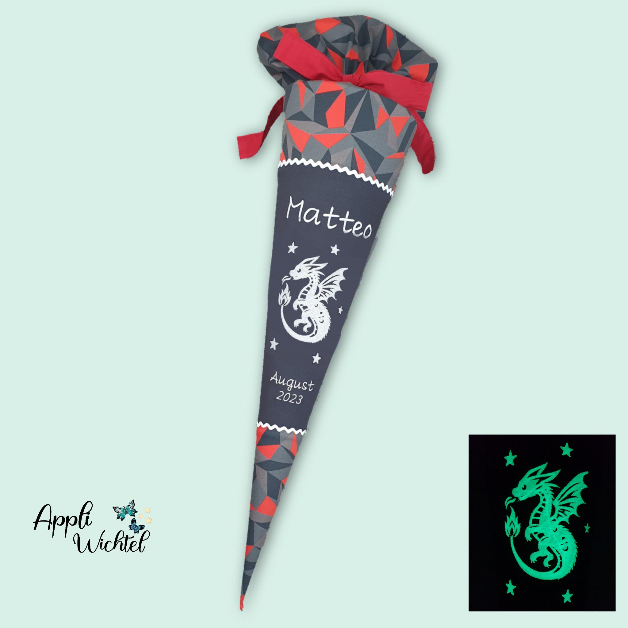 Schultüte mit Drache (Leuchtet im Dunklen) und Namen farblich auf den Ergobag TaekBärdo Schulranzen abgestimmt.