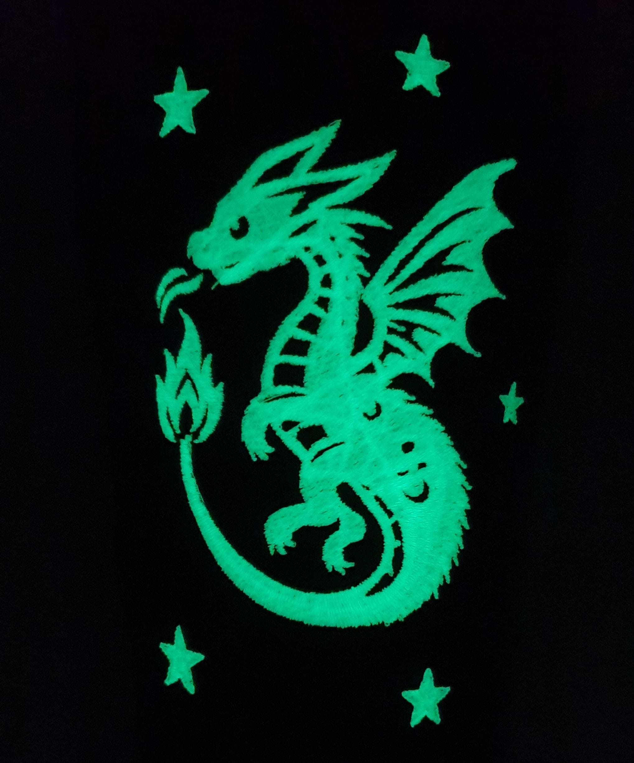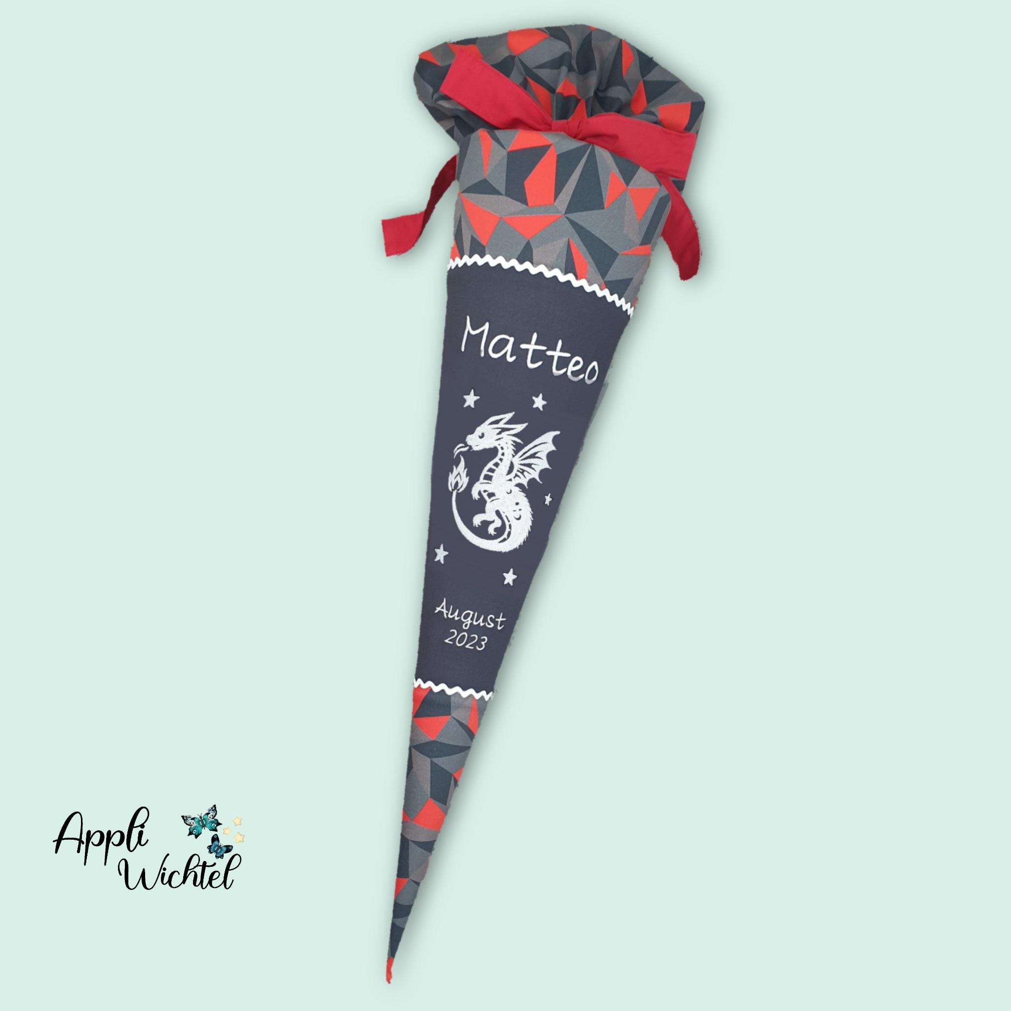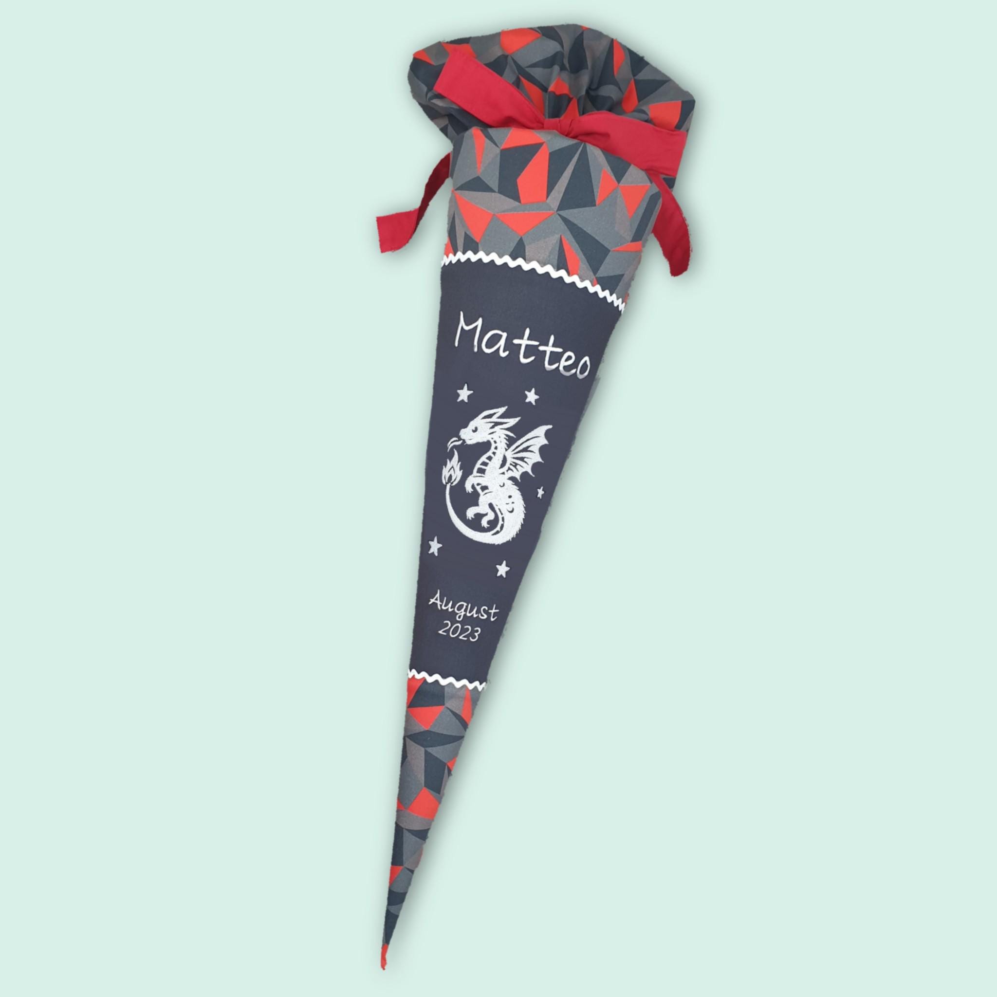 Schultüte mit Drache (Leuchtet im Dunklen) und Namen farblich auf den Ergobag TaekBärdo Schulranzen abgestimmt.