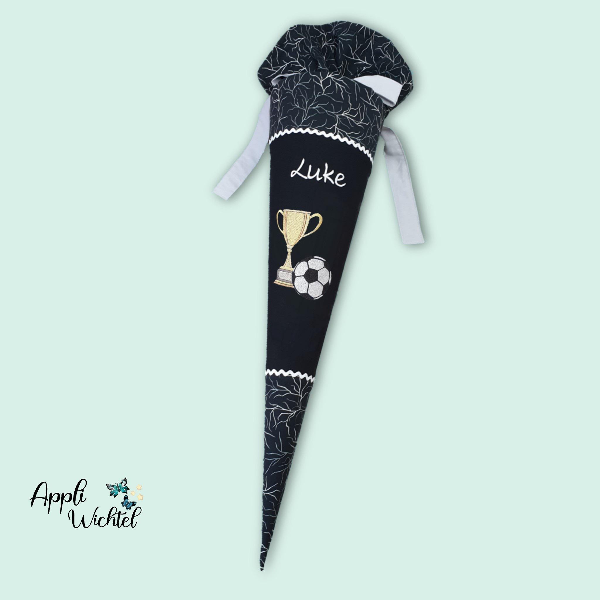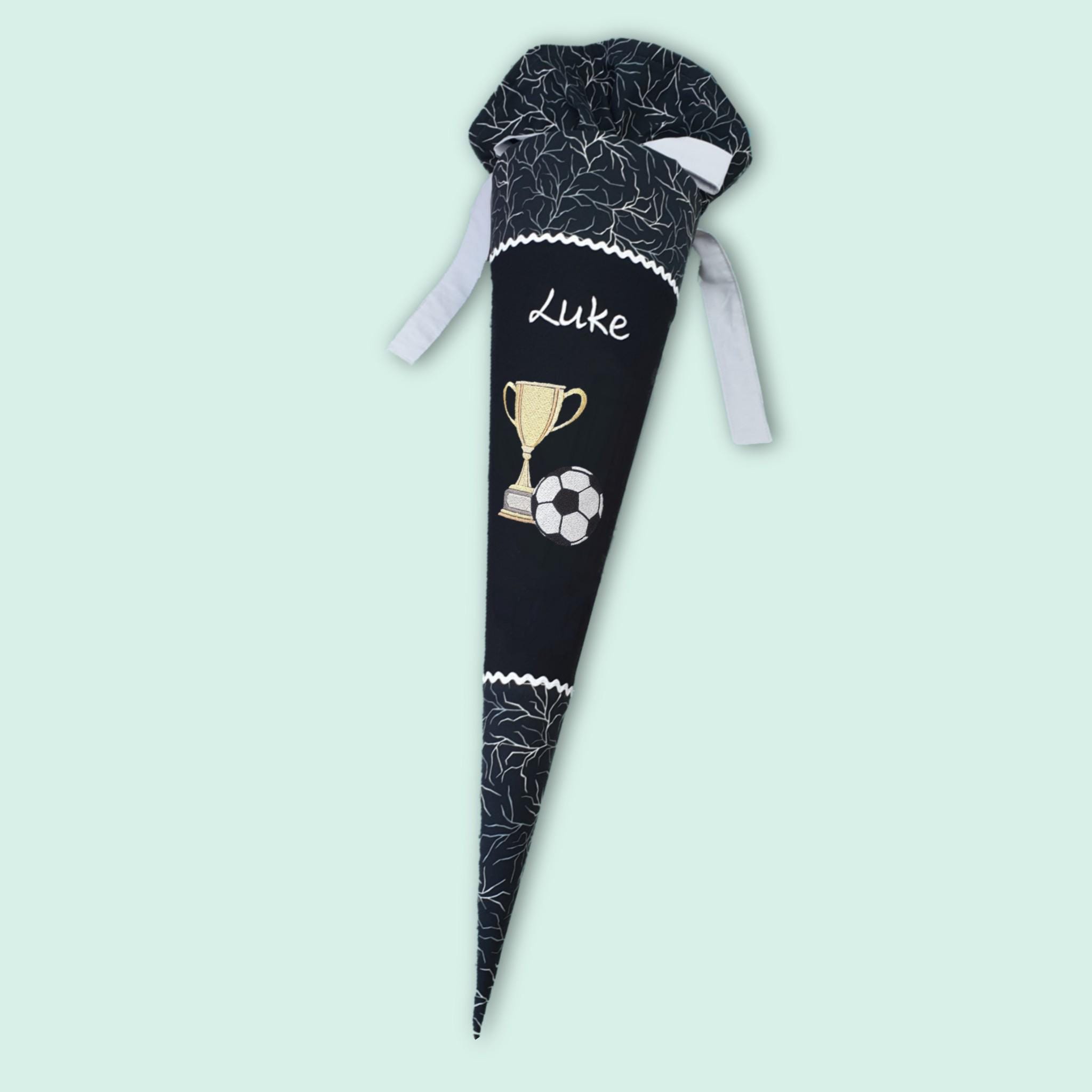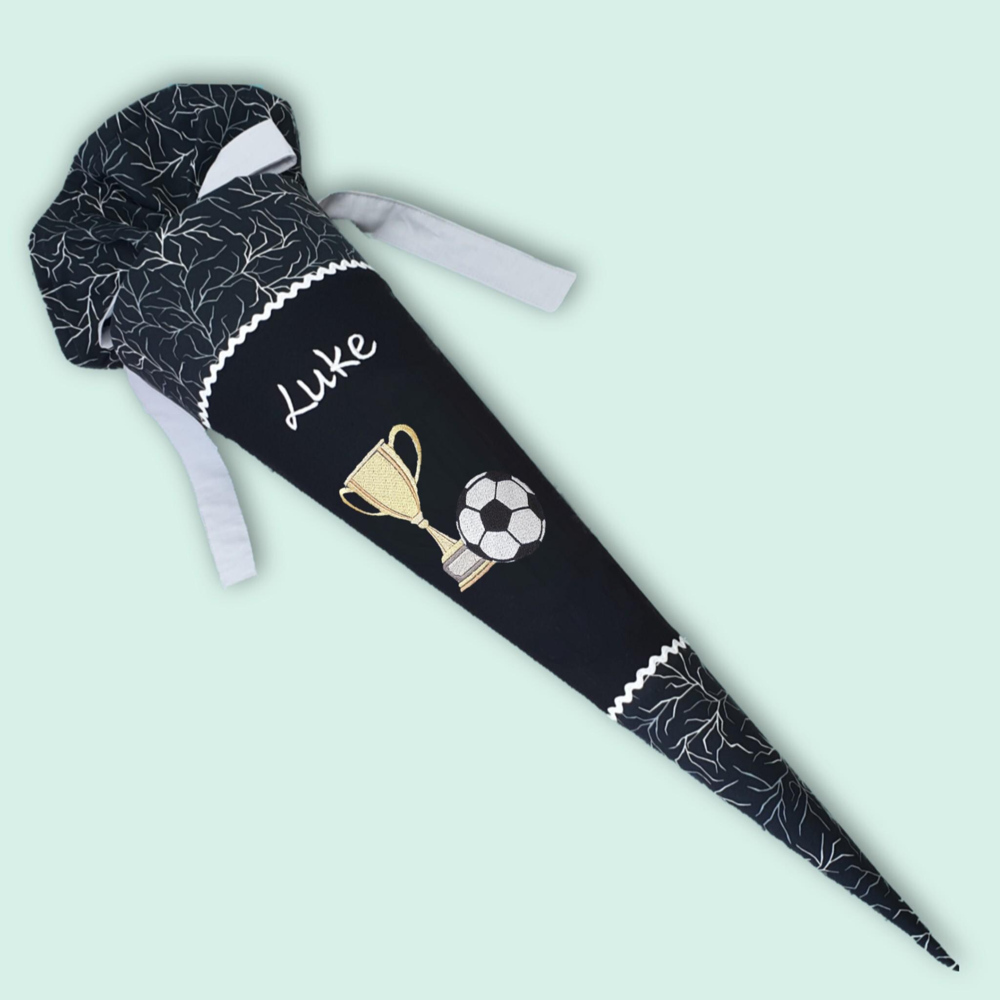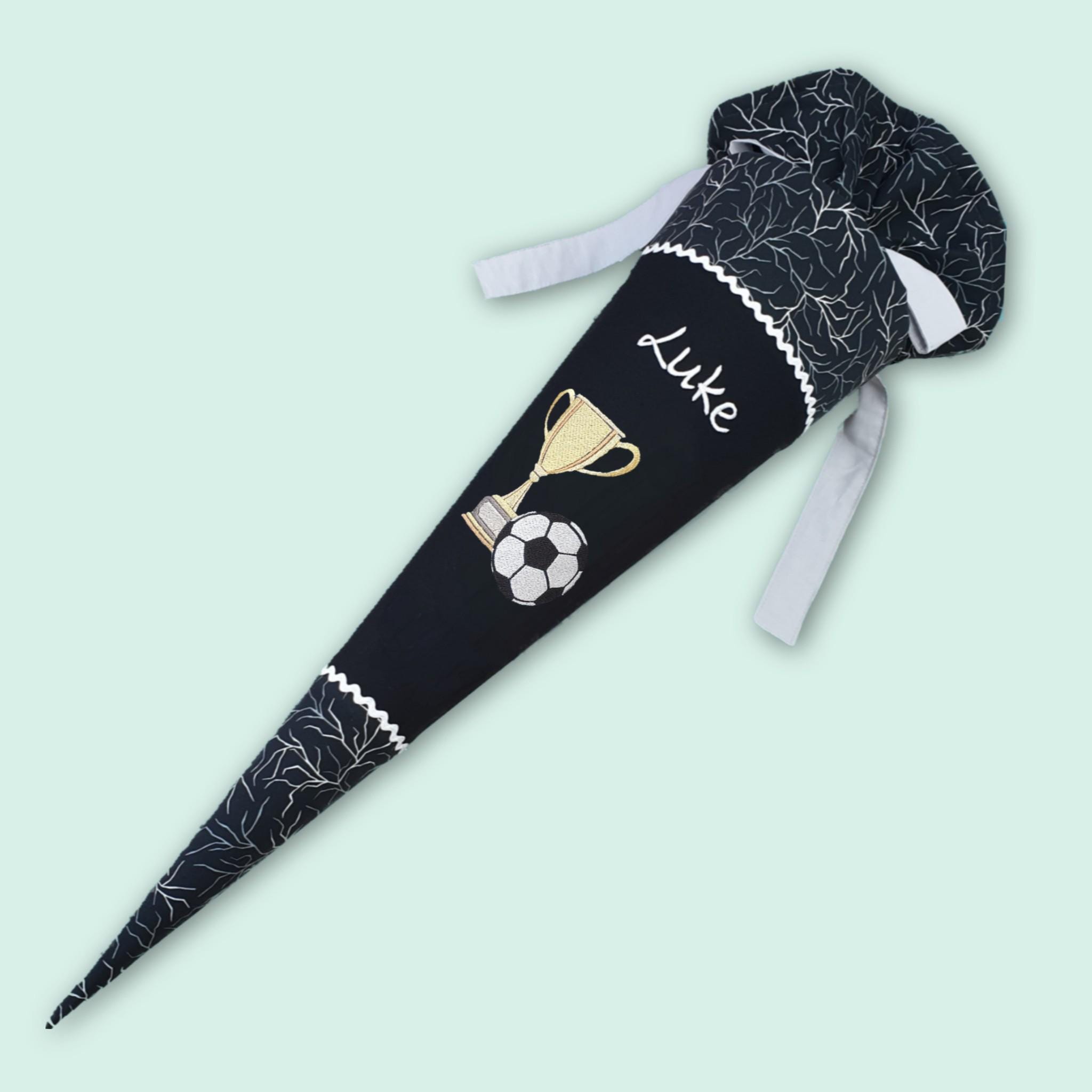 Schultüte mit Fussball Pokal und Namen farblich auf den Ergobag Super ReflektBär Glow Schulranzen abgestimmt.