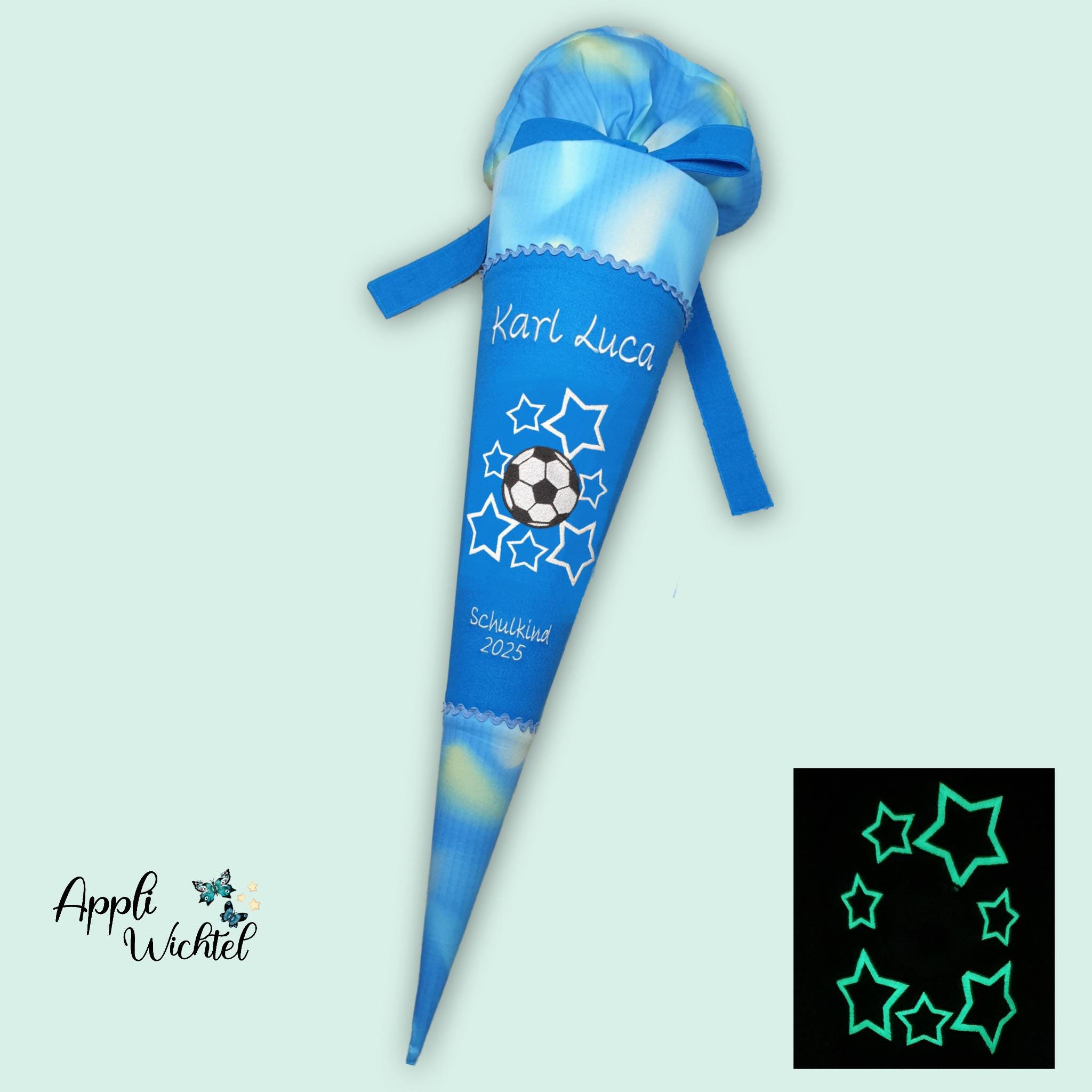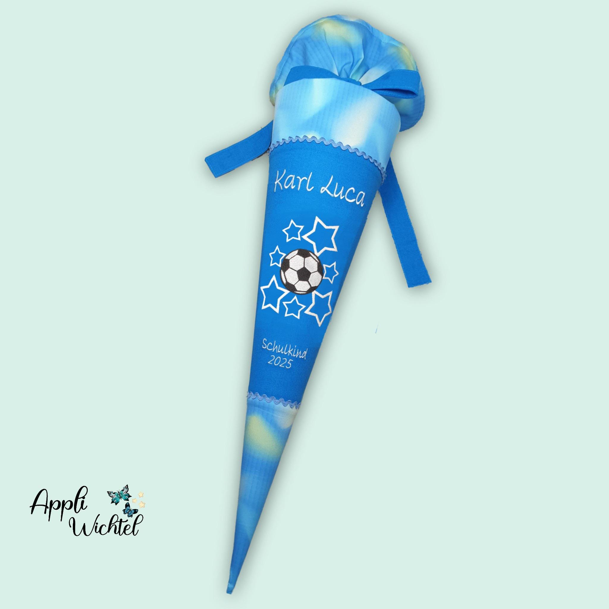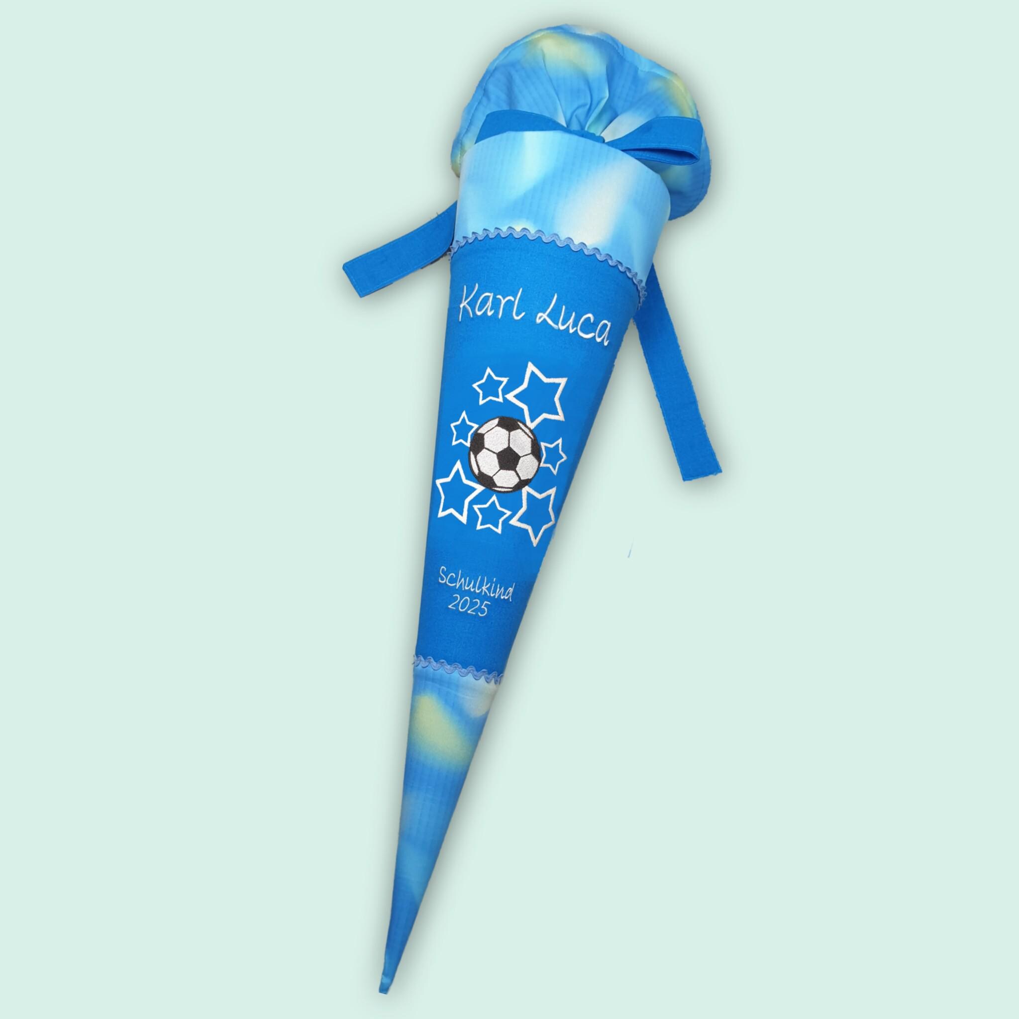Schultüte mit Fussball und Namen farblich auf den Ninja Zazu Schulranzen abgestimmt.