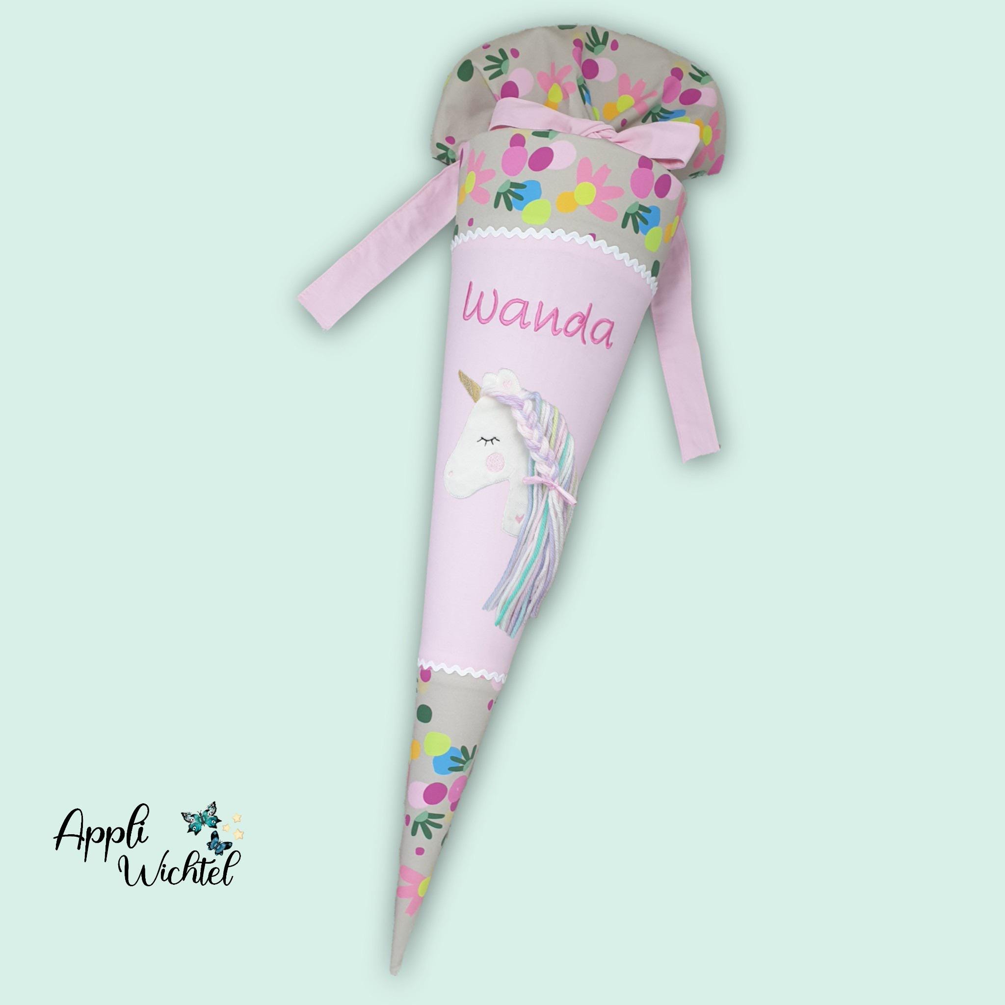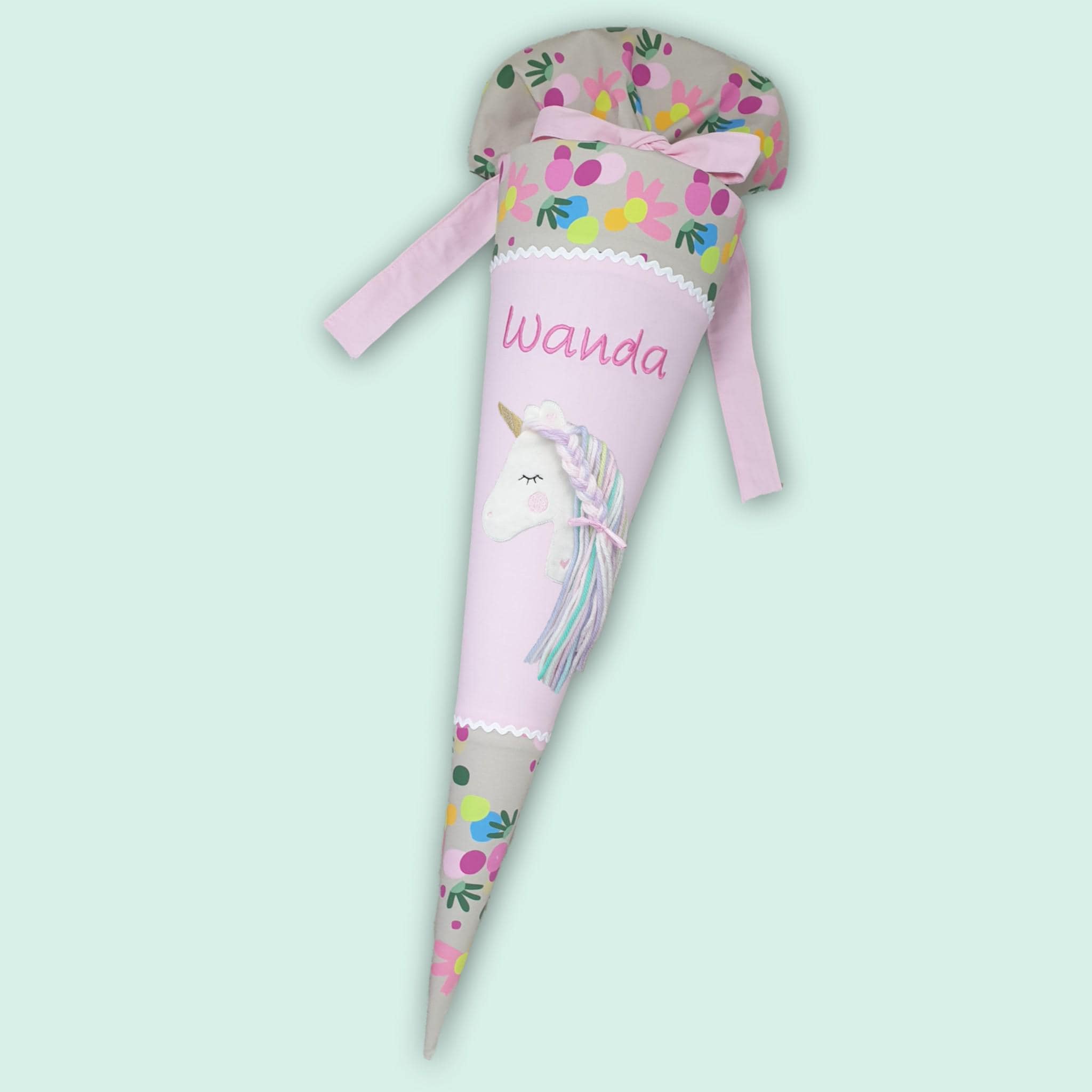 Schultüte mit Einhorn und Namen farblich auf den Flower Powbär Schulranzen abgestimmt.