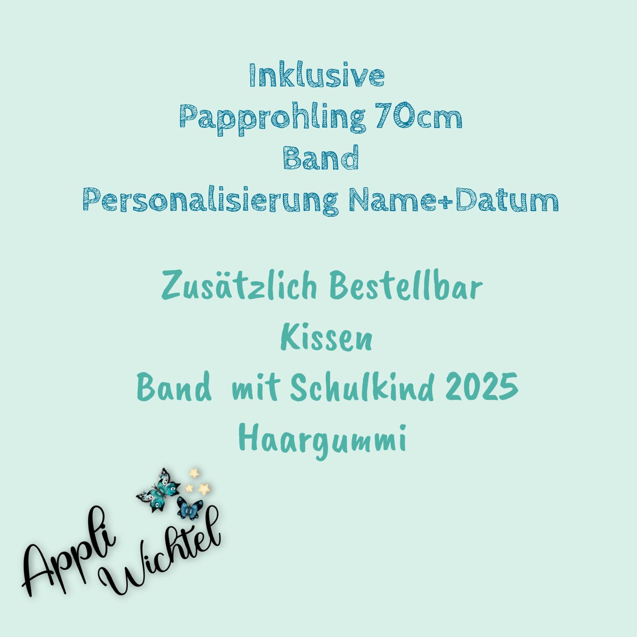 Der Name Ihres Kindes. Falls gewünscht, können zusätzlich 'Schulkind 2025' oder das Datum des ersten Schultages hinzugefügt werden.
