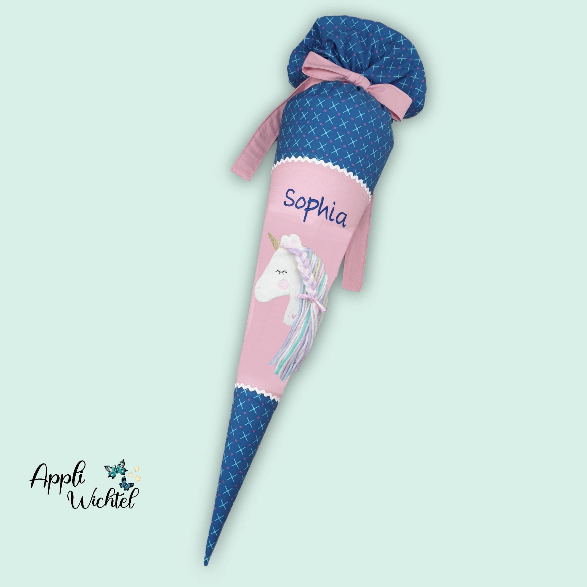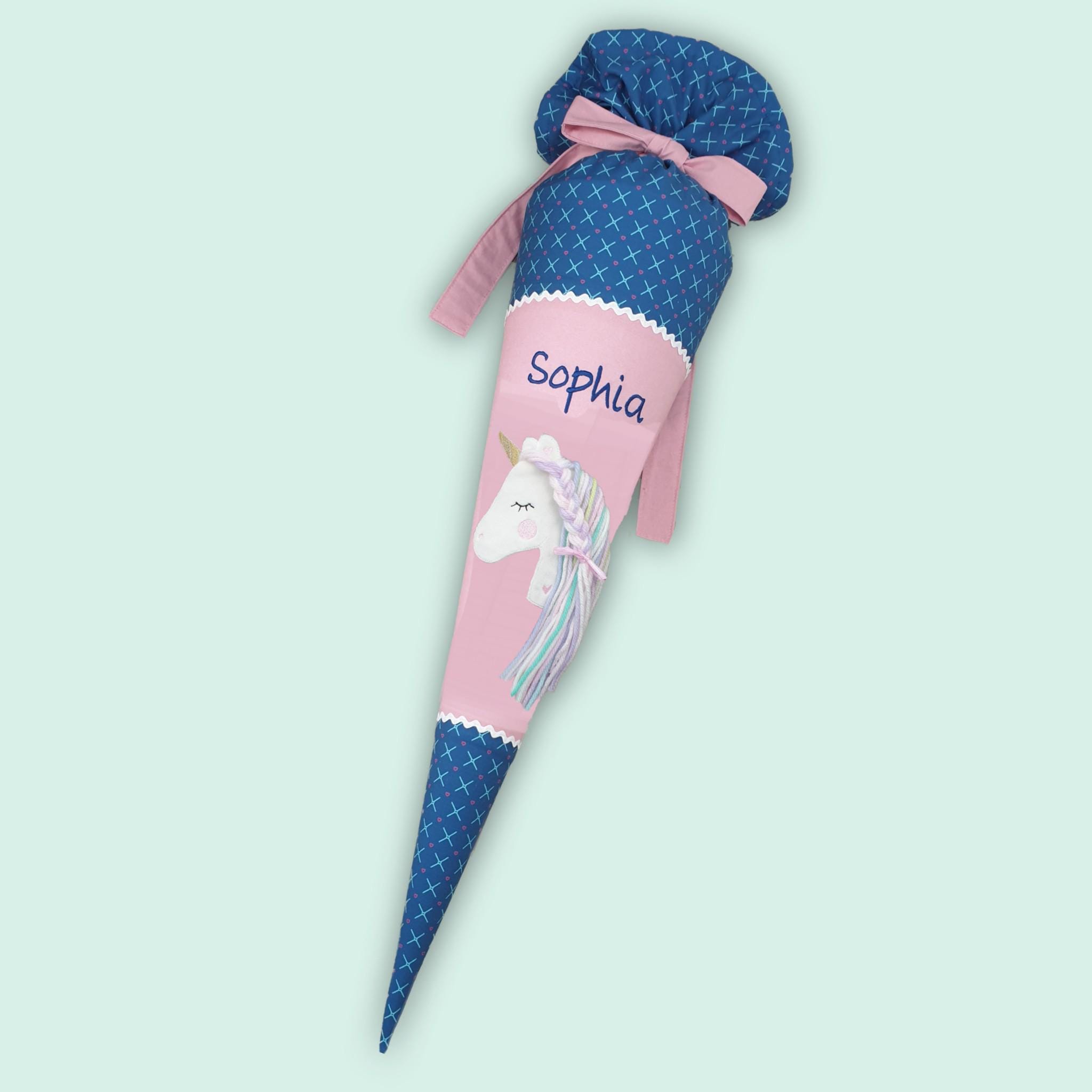 Schultüte mit Einhorn und Namen farblich auf den Mila Schulranzen abgestimmt.