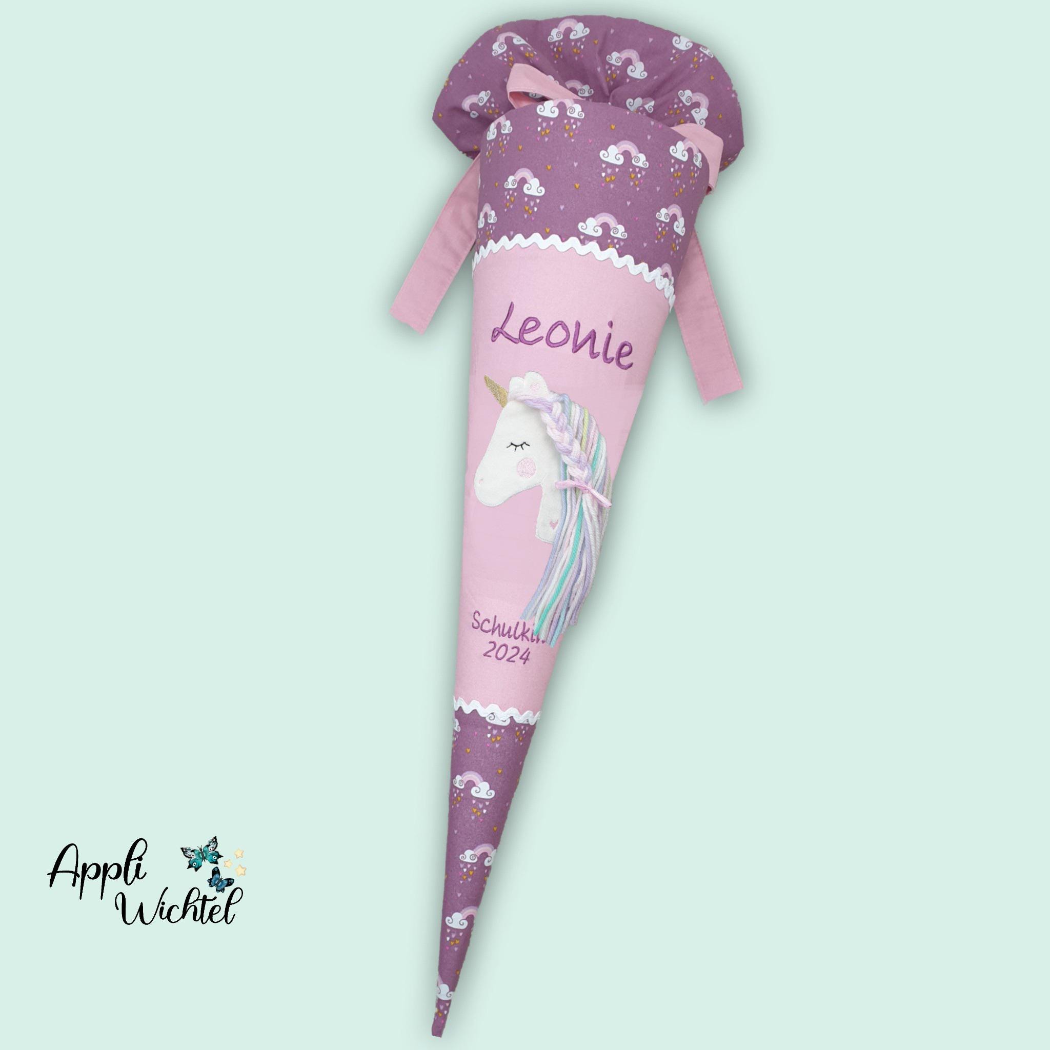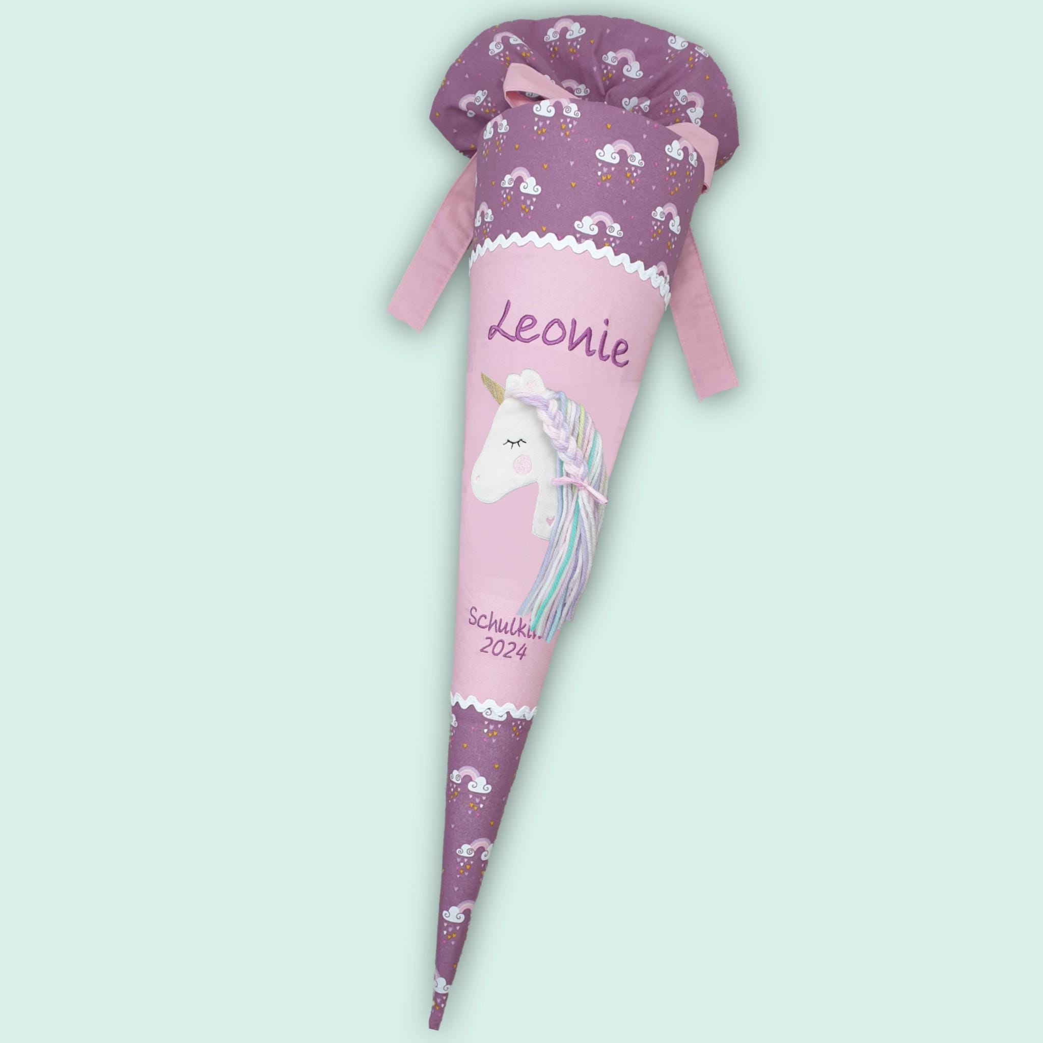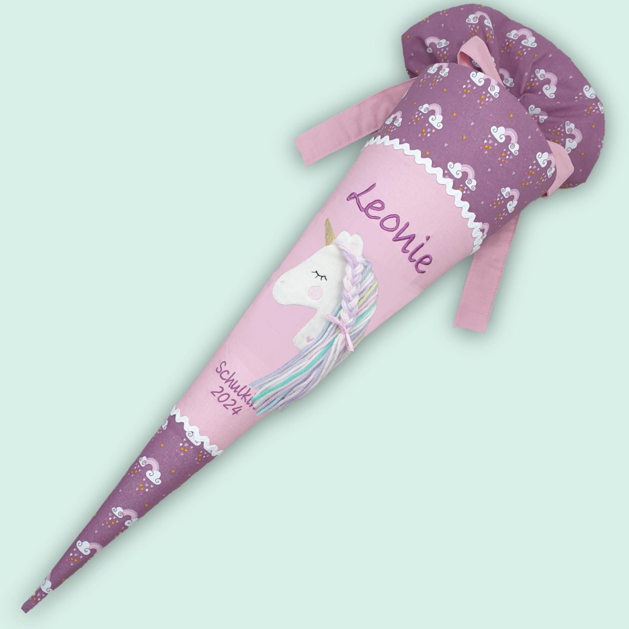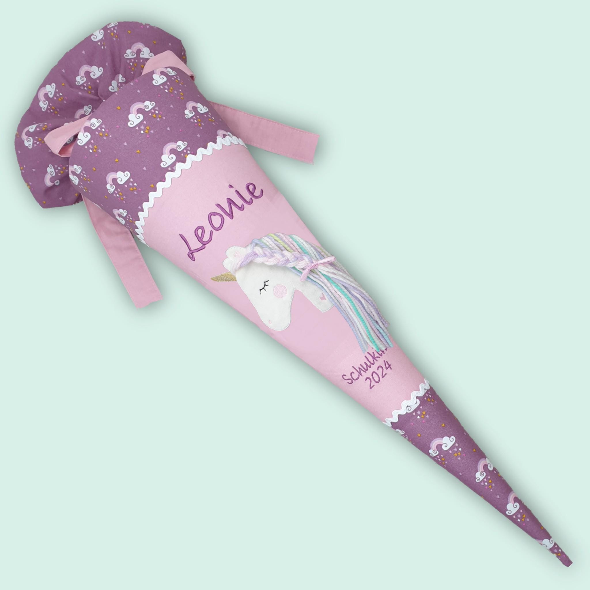 Schultüte mit Einhorn und Namen in Regenbogenfarben