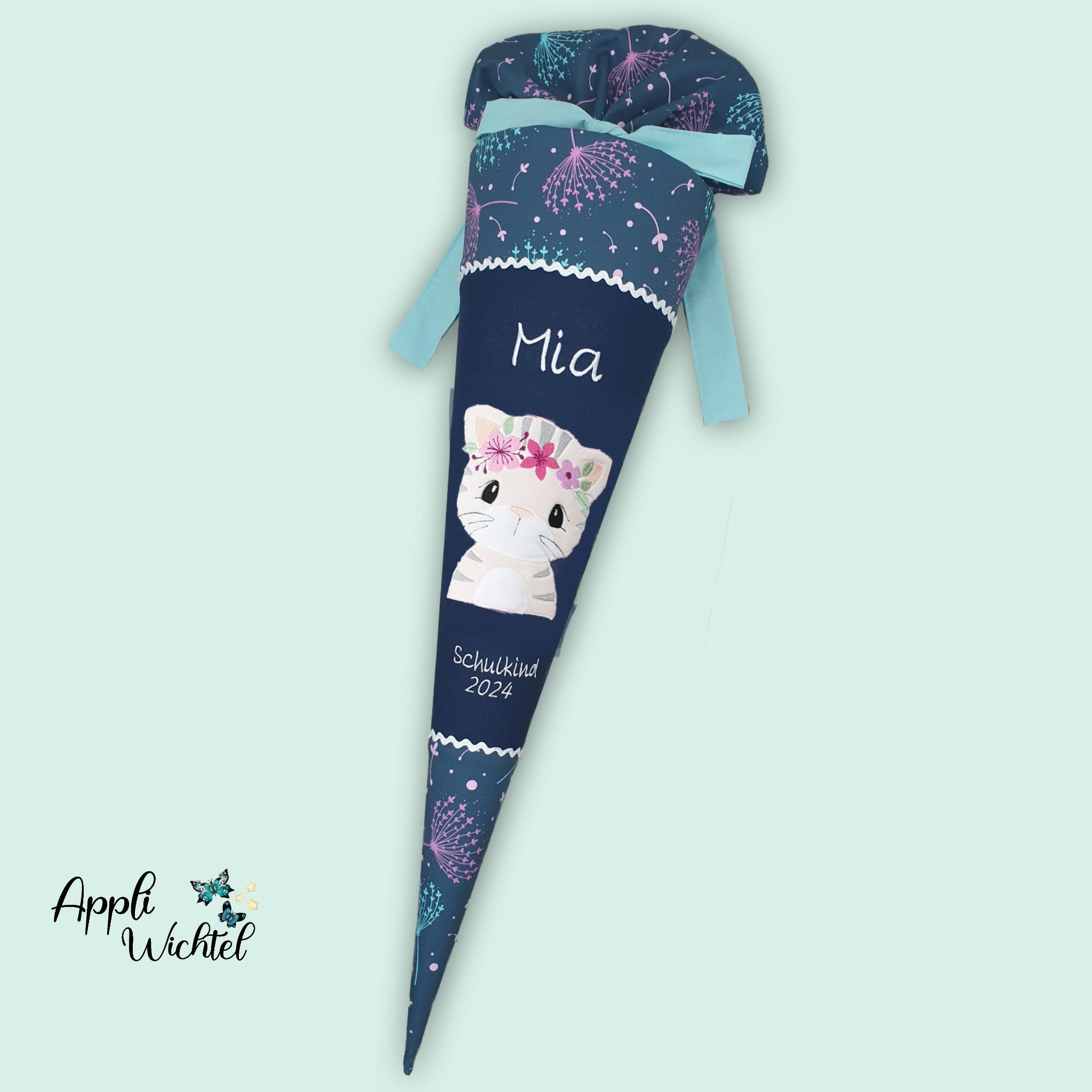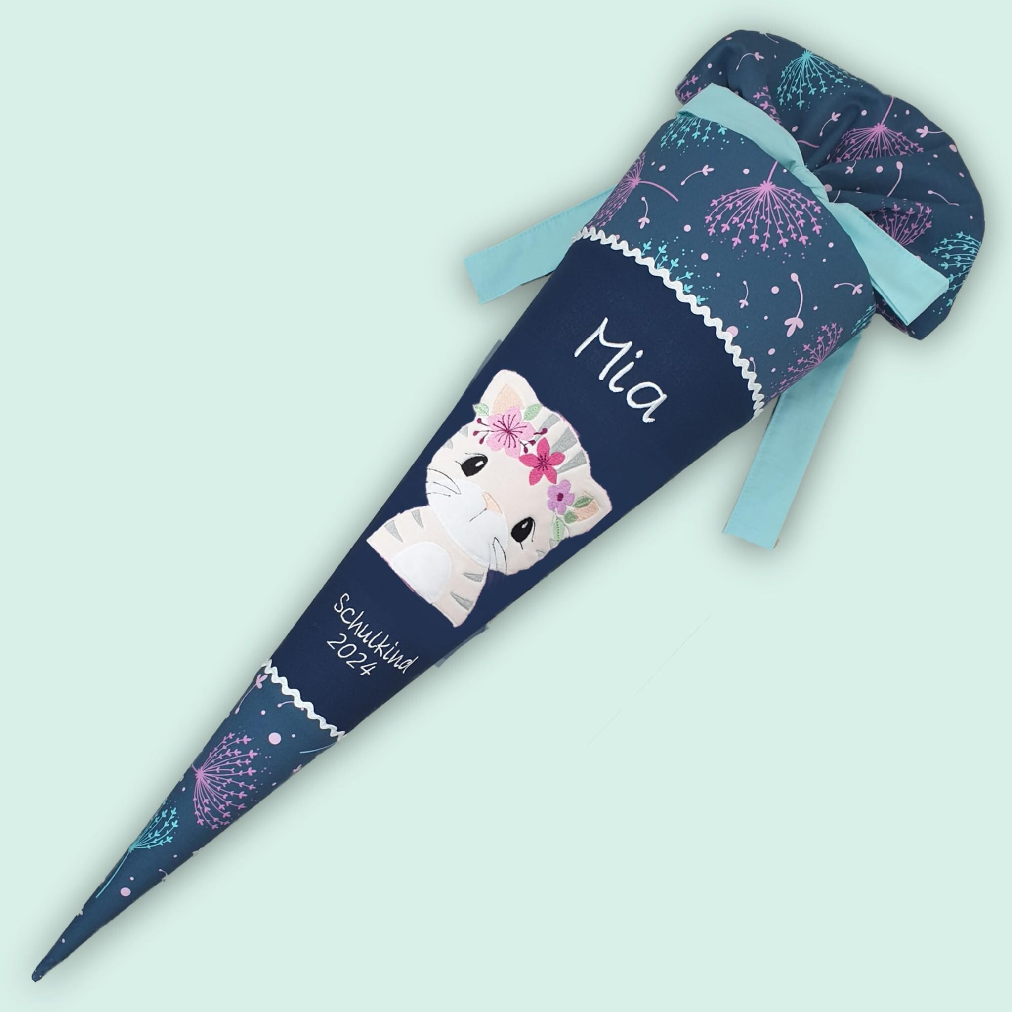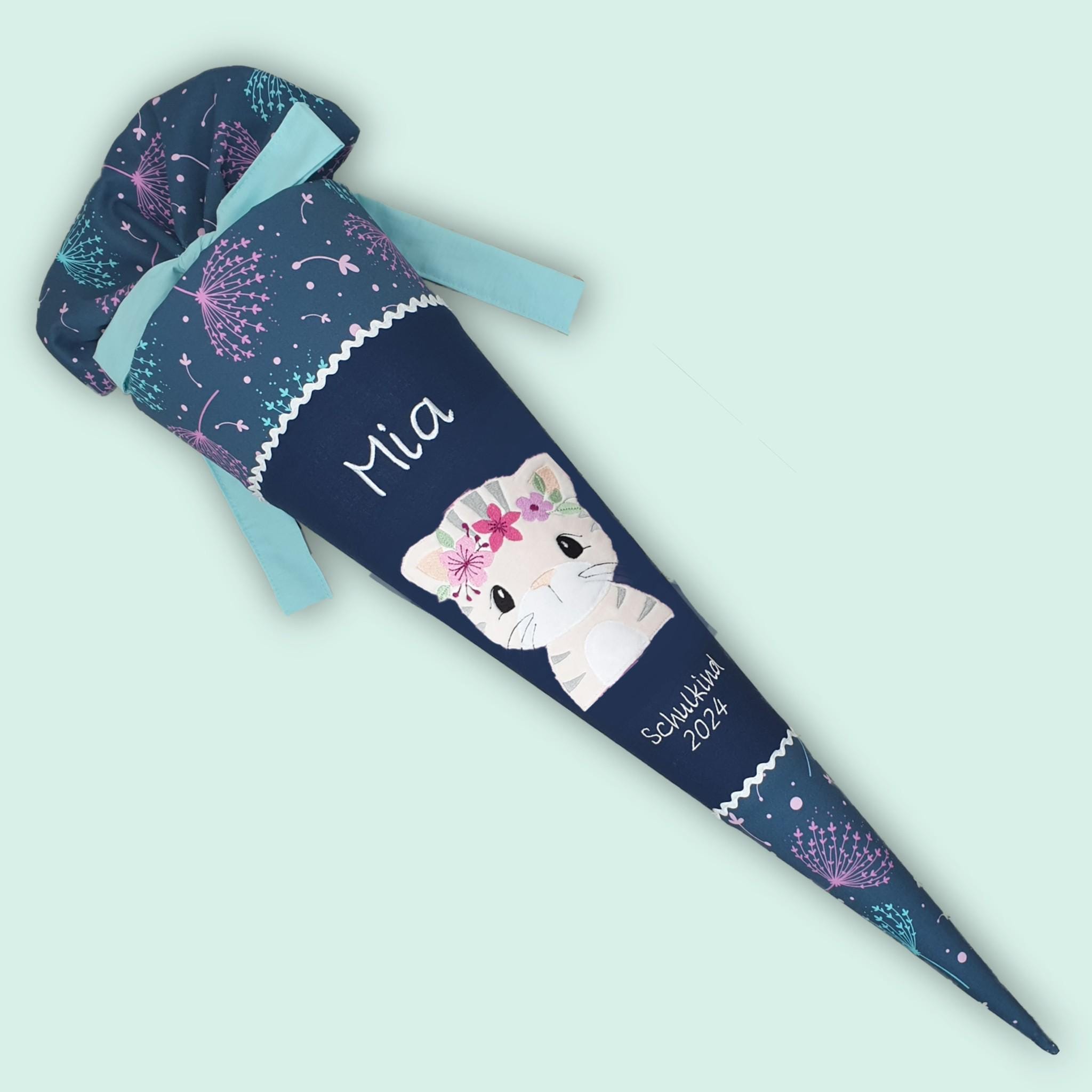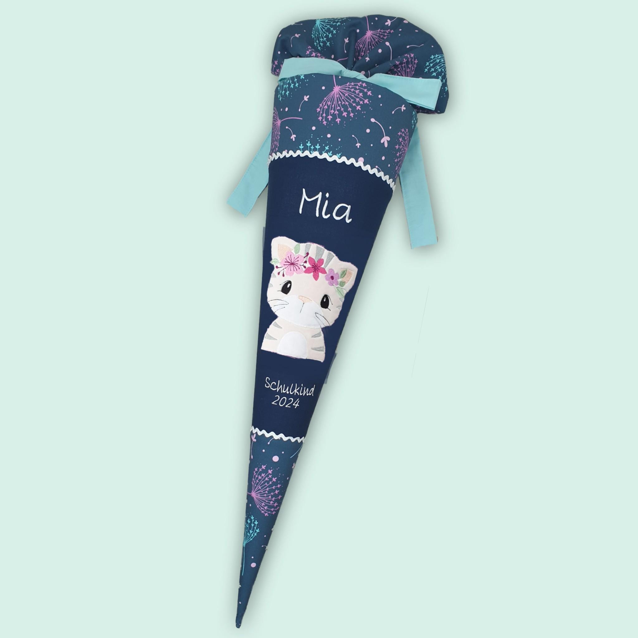 Schultüte mit Katze und Namen farblich auf den school mood Lina Schulranzen abgestimmt.