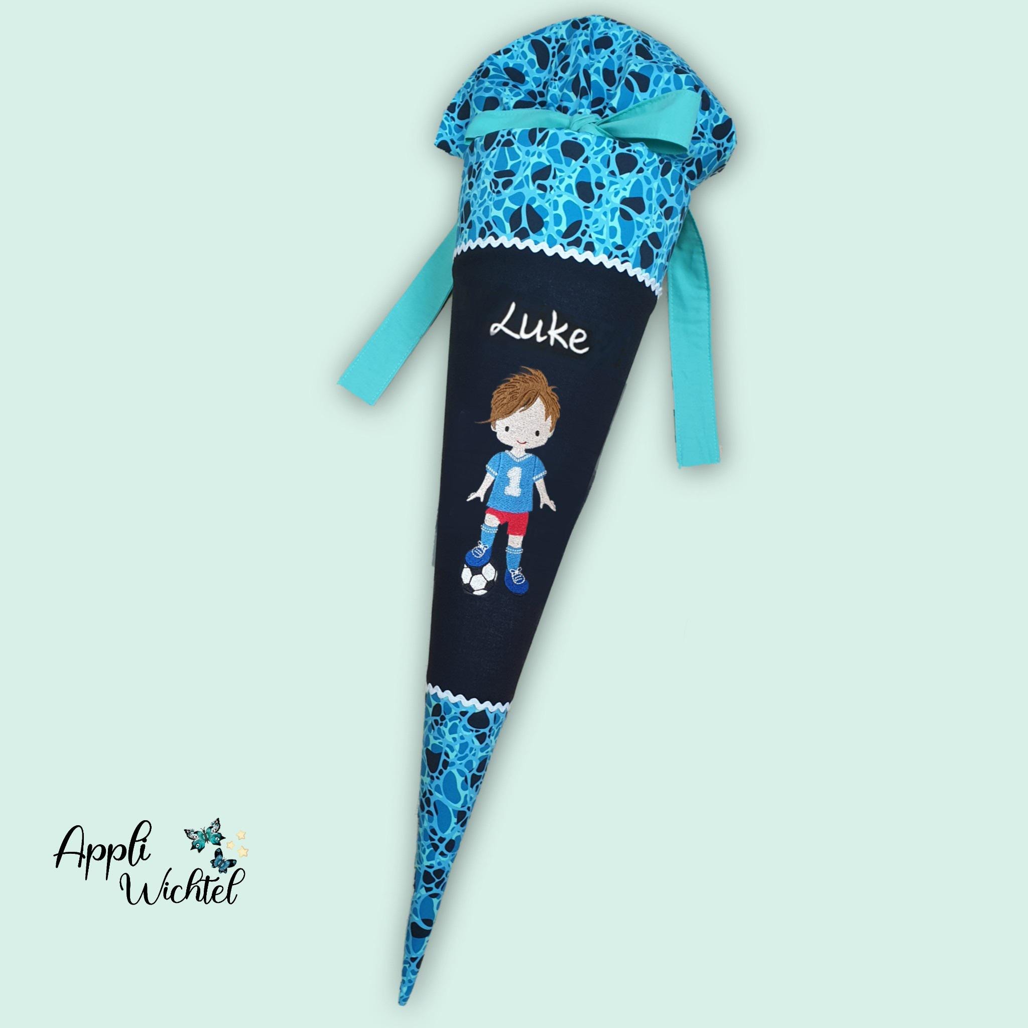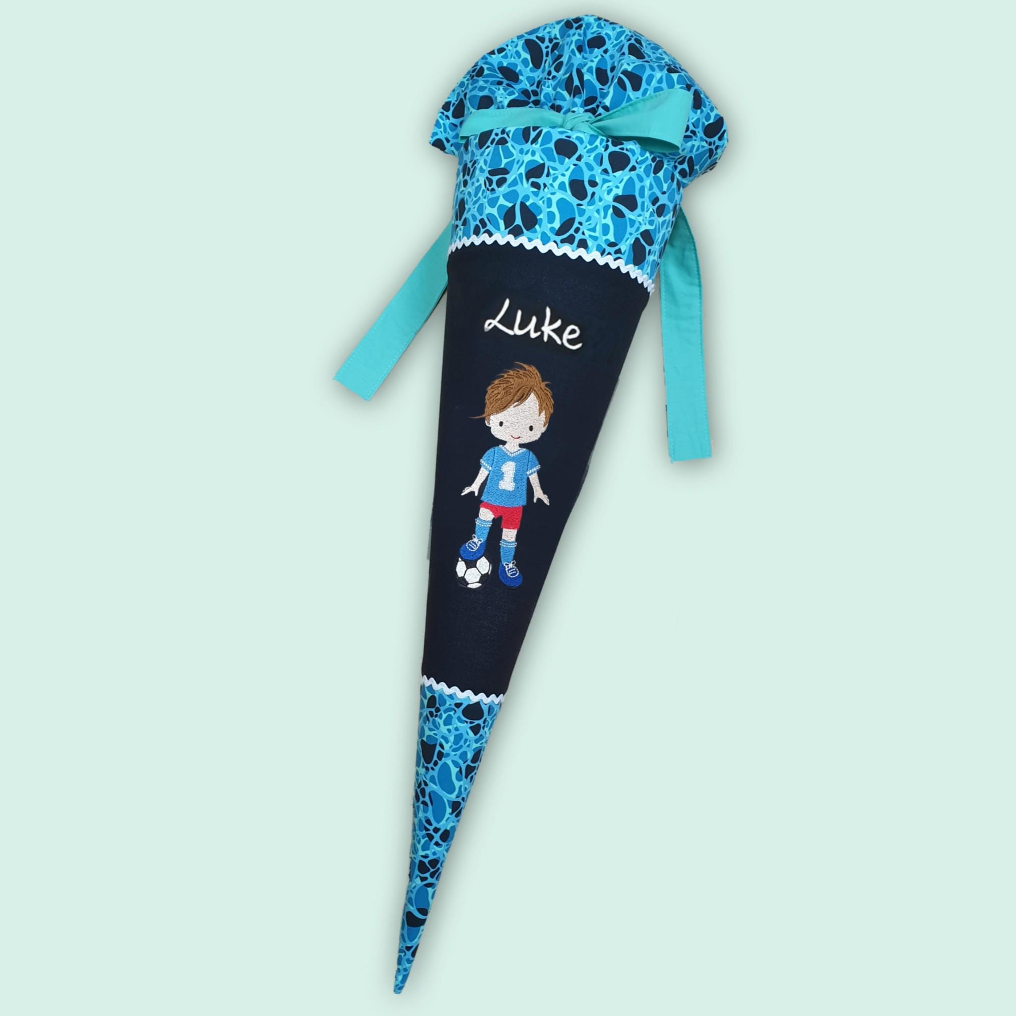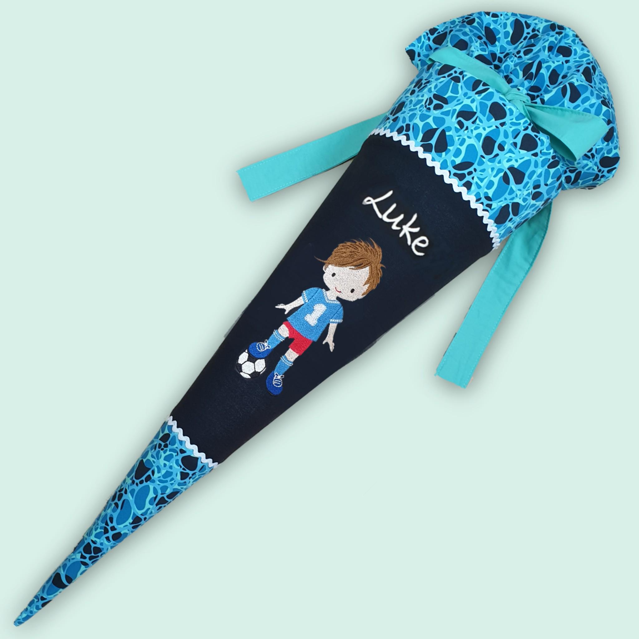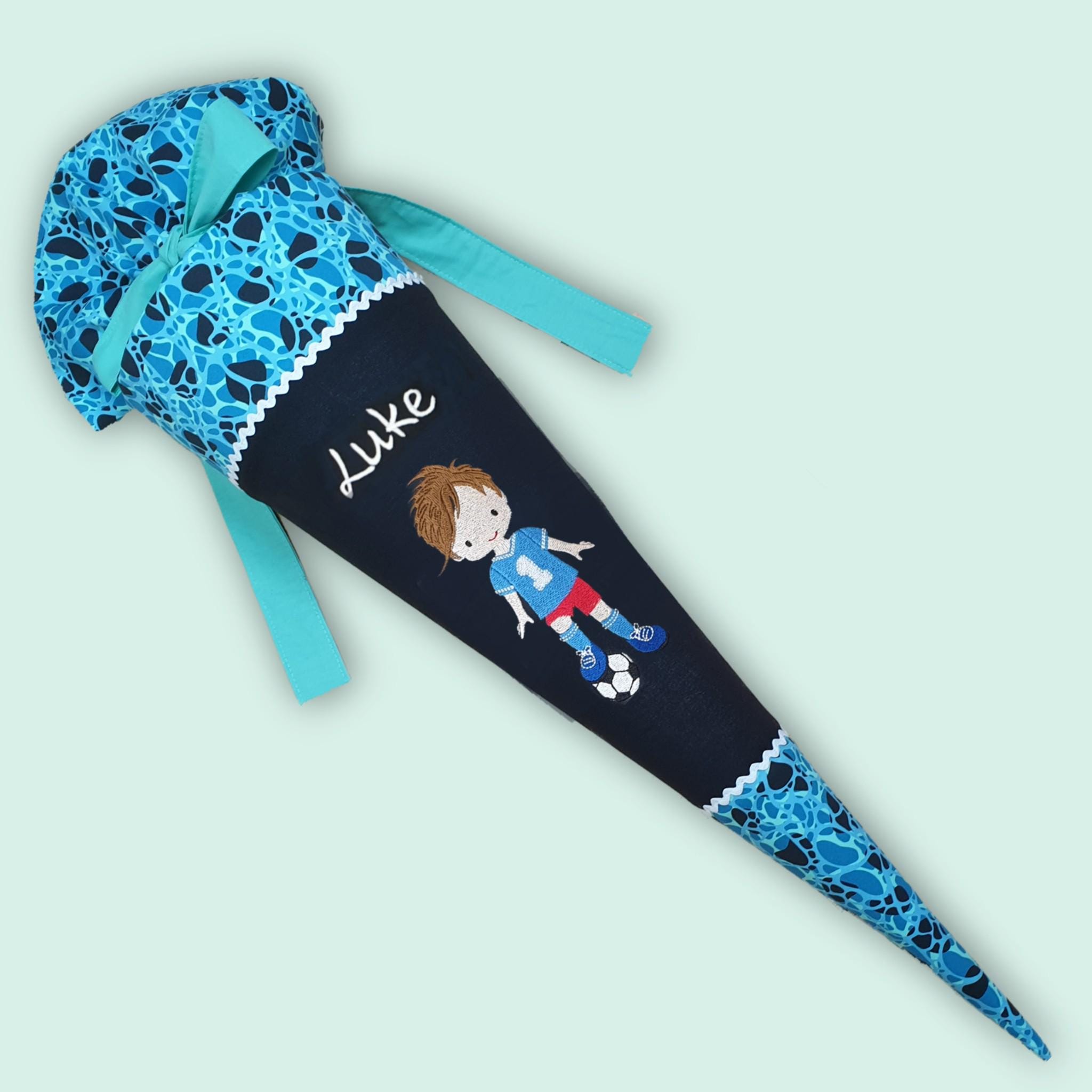 Schultüte mit Fussballer und Namen farblich auf den Abtauchbär Schulranzen abgestimmt.
