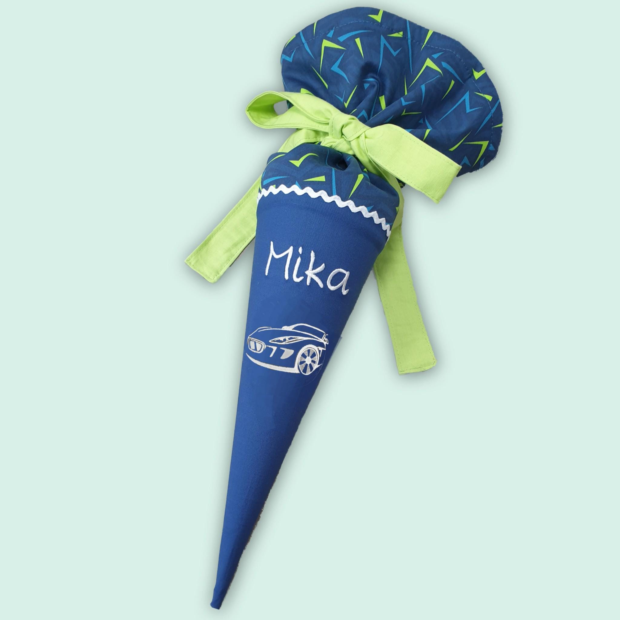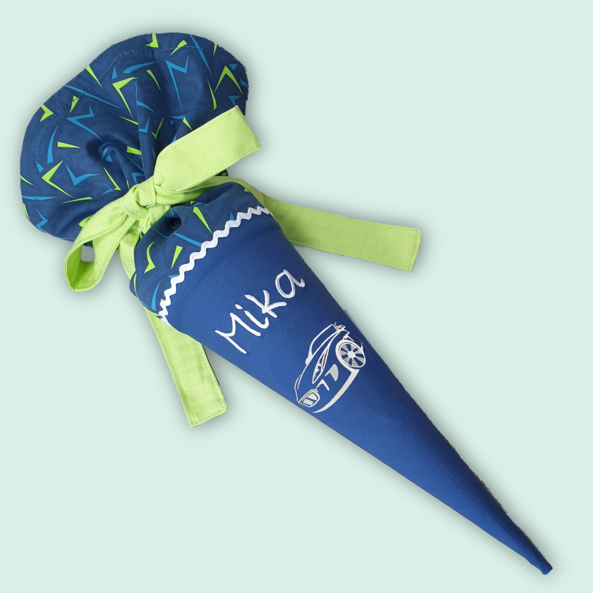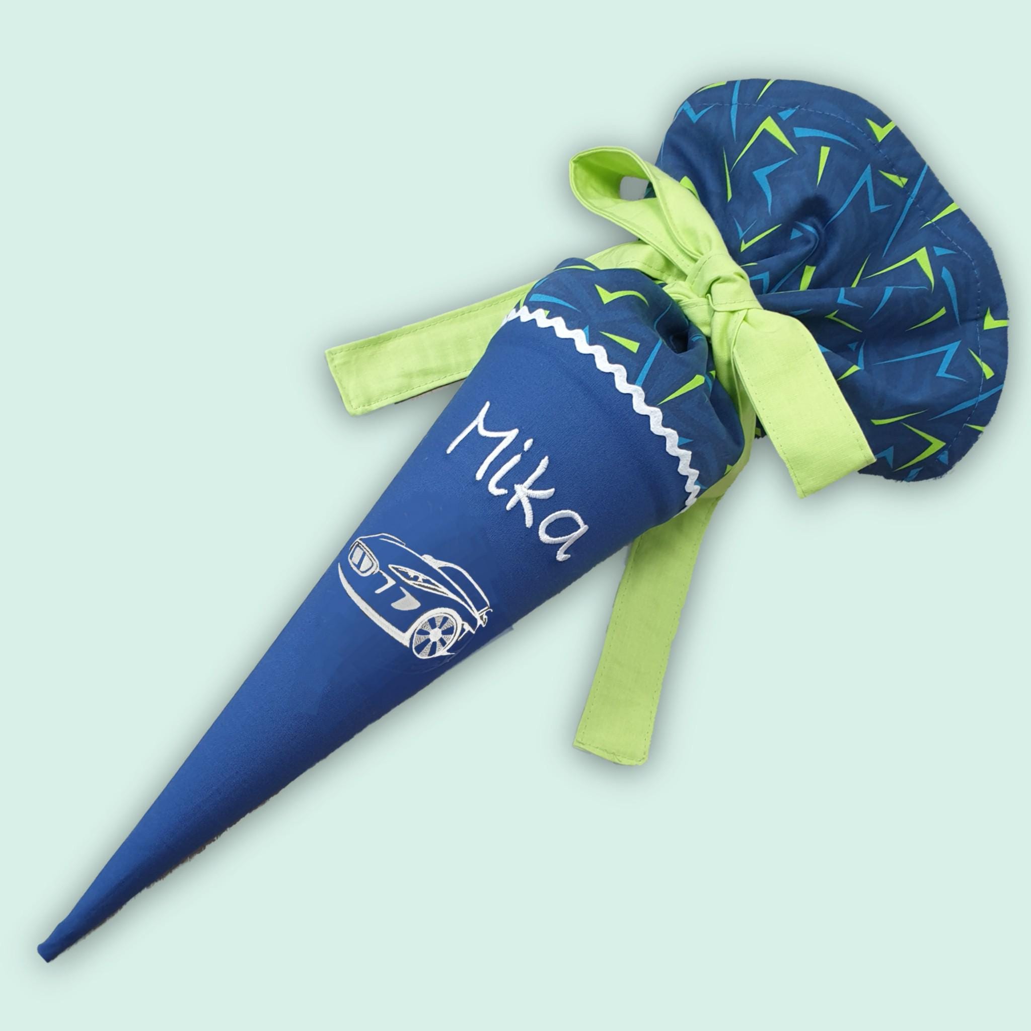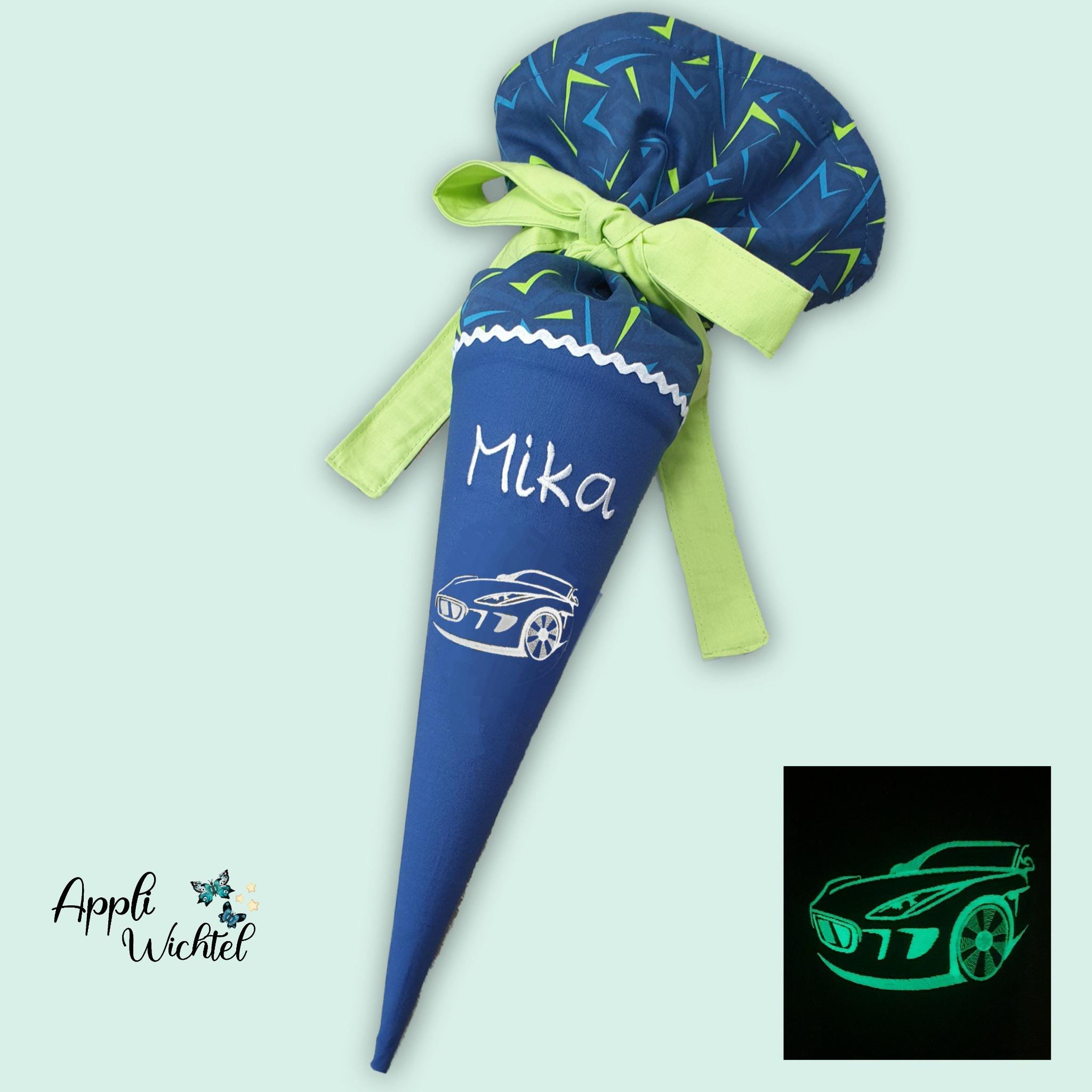 35 cm Geschwistertüte Auto Sportwagen Rennauto (leuchtet im Dunkeln) und Namen farblich auf den Spitzenreitbär Schulranzen abgestimmt.