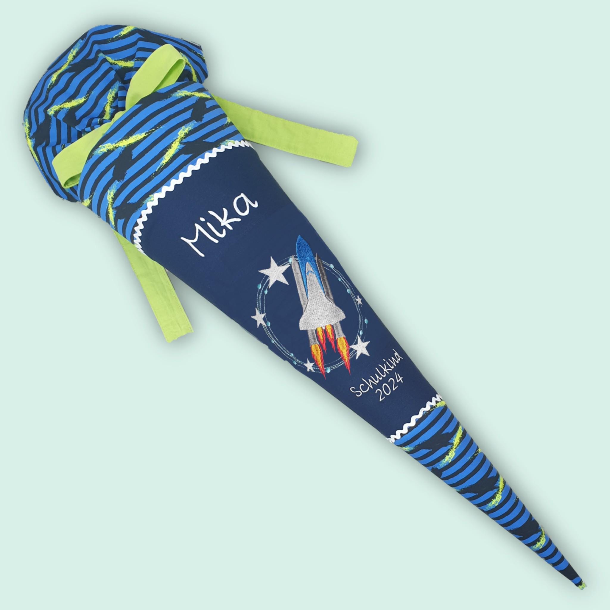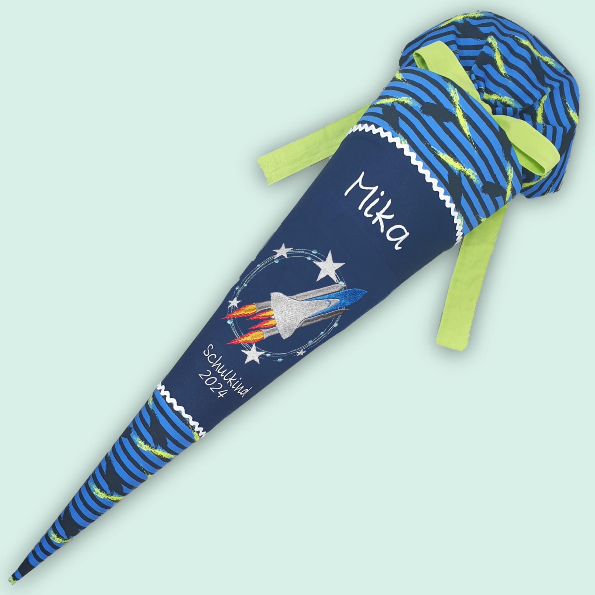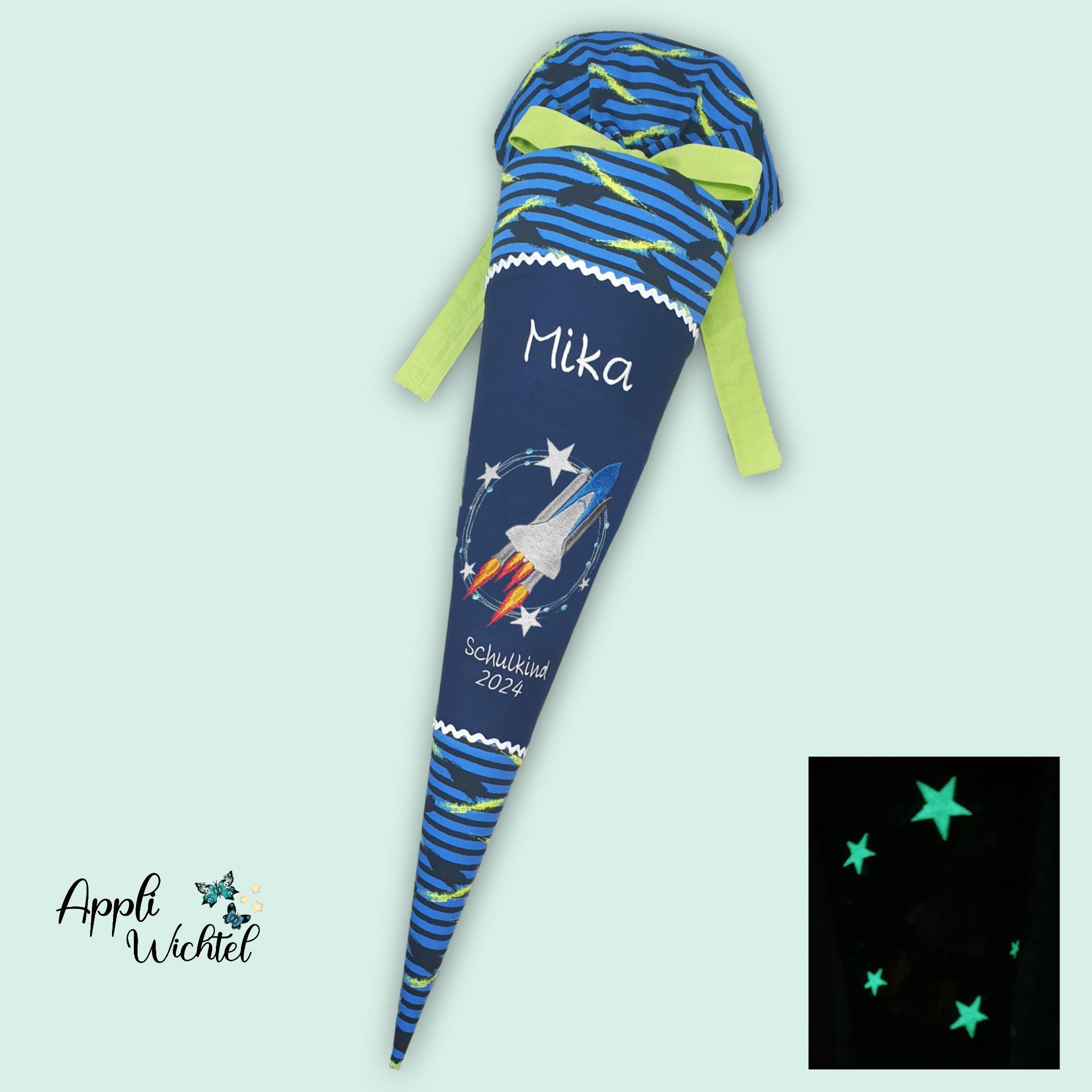 Schultüte mit Raumschiff Rakete Weltall (Sternchen leuchten im Dunkeln) und Namen farblich auf den Step by Step Police Car Cody Schulranzen abgestimmt.